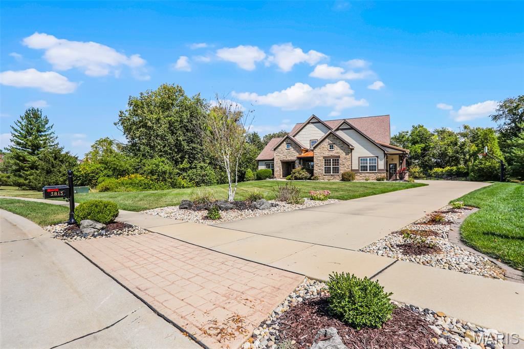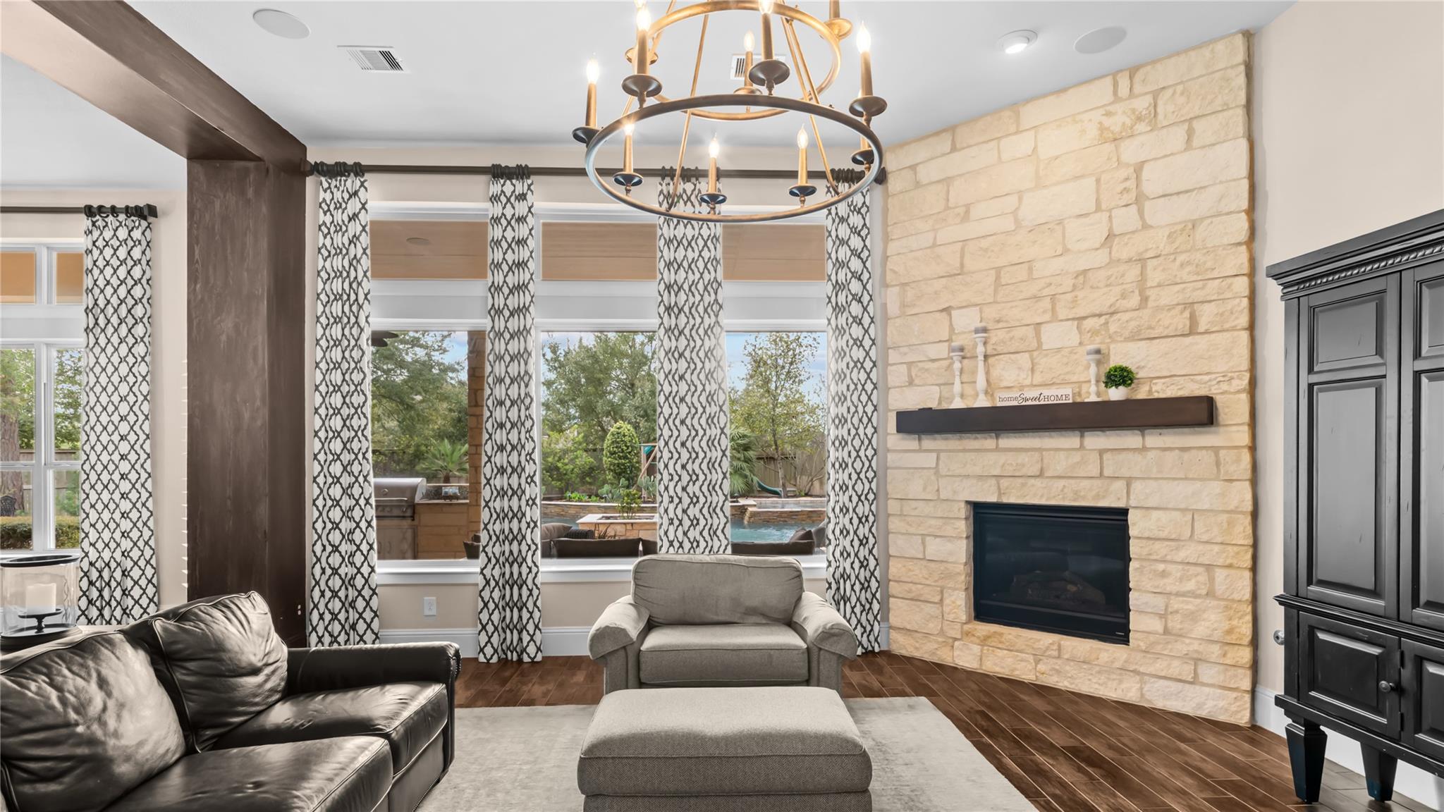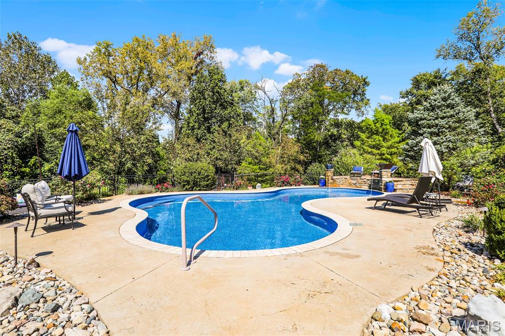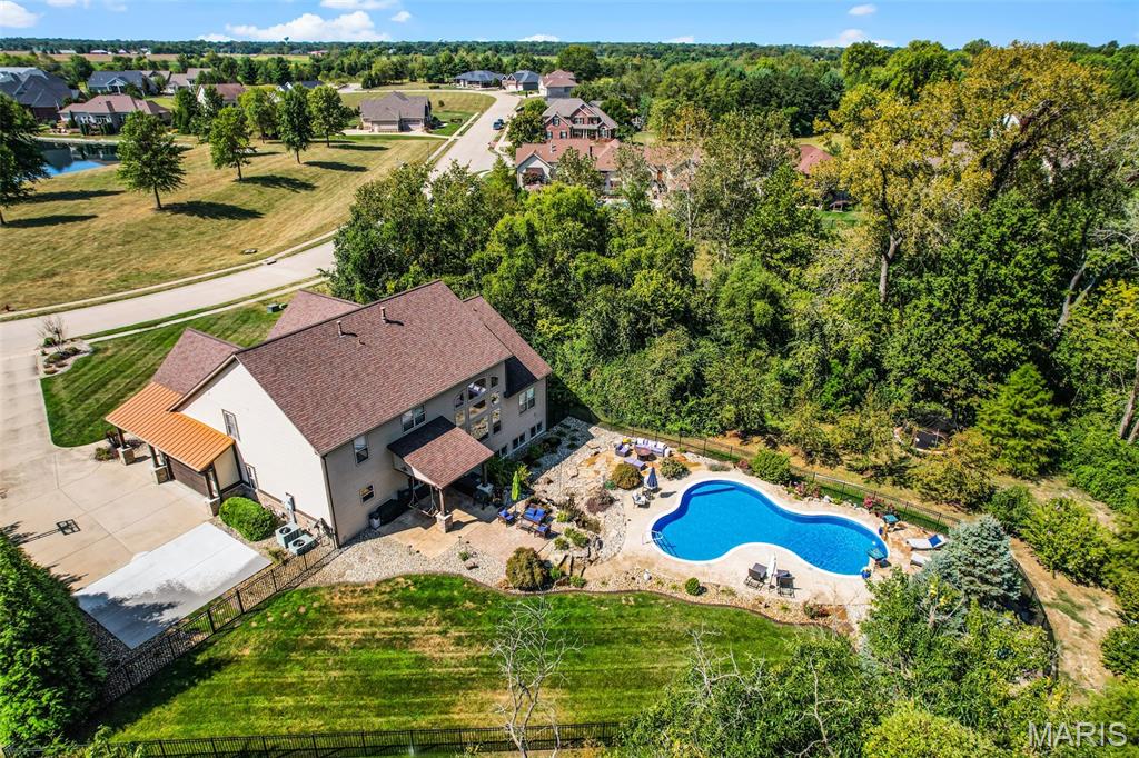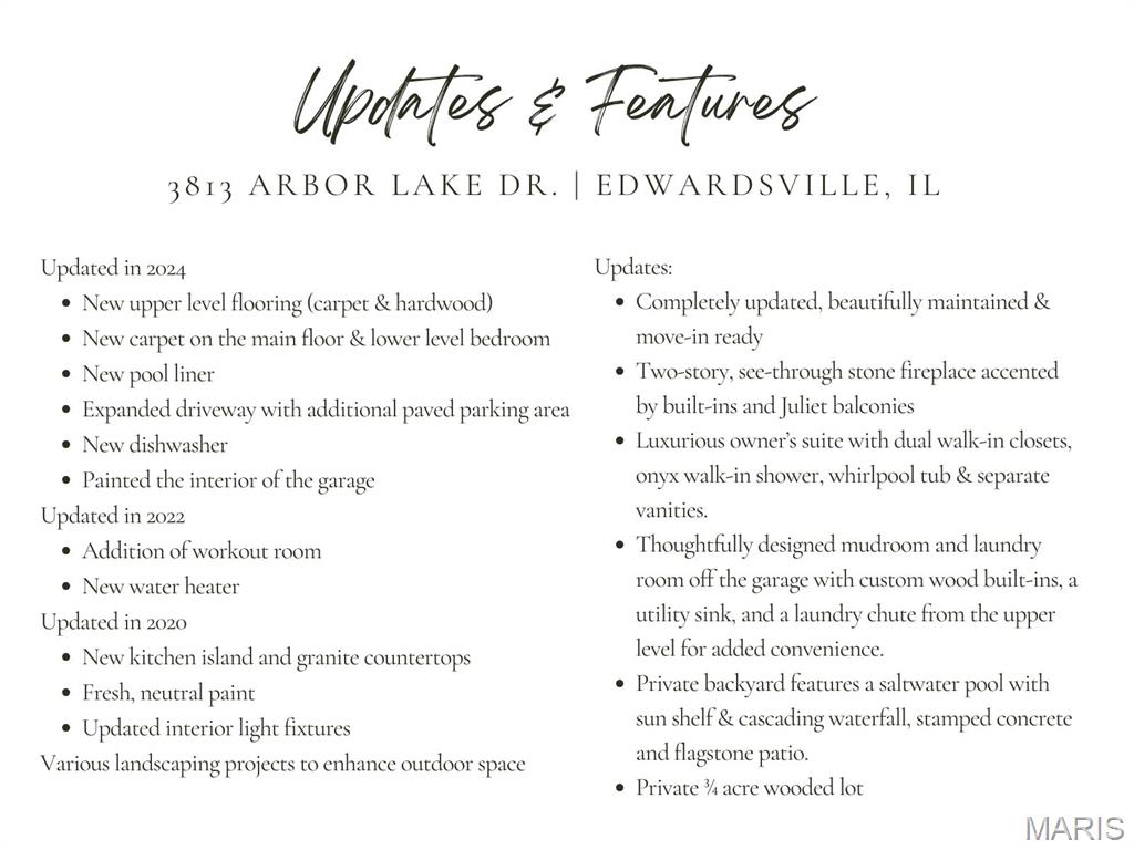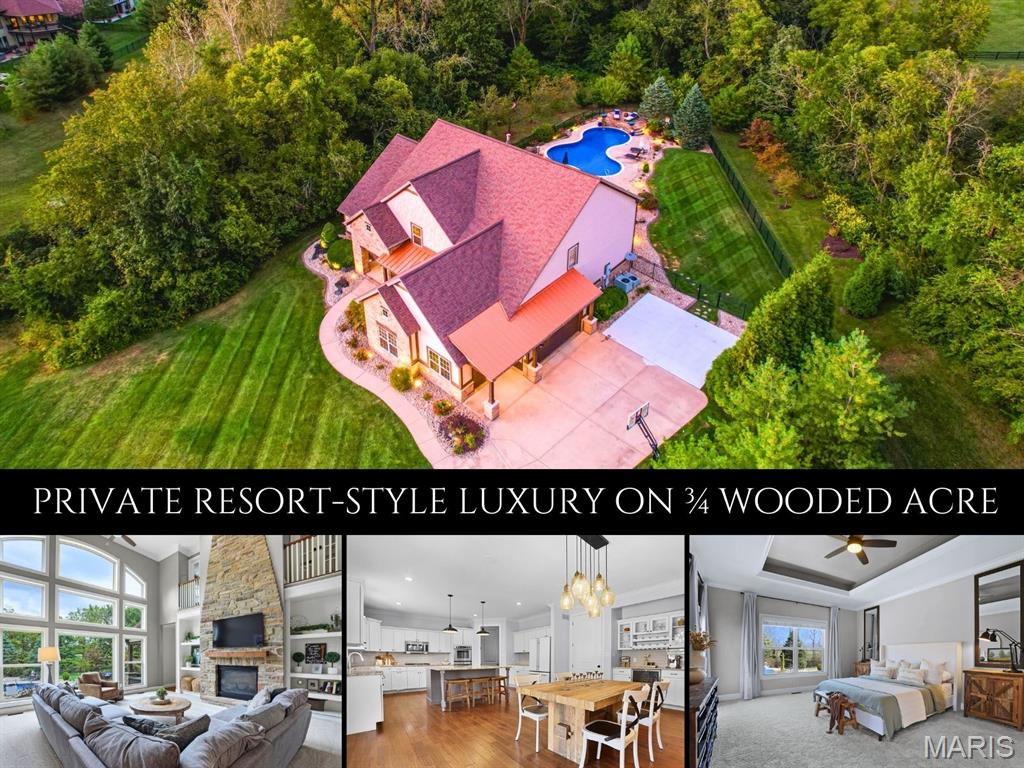Welcome to an extraordinary residence where architectural elegance meets refined luxury. Striking stone & rich wood accents, soaring ceilings & 8 interior doors throughout create an impressive sense of scale & sophistication. Set on a picturesque 3/4-acre wooded lot, the backyard is a private resort featuring a spectacular saltwater pool w/ sun shelf & cascading waterfall, surrounded by mature trees & lush landscaping for ultimate privacy. Inside, the dramatic great room captivates w/ an arched wall of windows, open staircase & stunning see-through stone fireplace that creates warmth & grandeur. Just off the foyer, French doors open to a private office, thoughtfully designed w/ reclaimed wood doors that conceal shelving & supplies while adding distinctive character. The chefs kitchen impresses w/ premium appliances, granite counters, an expansive island, beverage bar, butlers pantry & a dining area perfectly positioned beside the fireplace. A well-appointed mudroom w/ custom built-in storage keeps daily life organized, while the laundry room features a convenient chute from the upper-level. The luxurious main-level owners suite offers dual walk-in closets & a spa-inspired bath w/ a custom onyx shower, whirlpool tub & separate vanities. Upstairs, 3 bedrooms each feature private ensuites & a bonus room w/ Juliet balconies. The light-filled lower level is ideal for entertaining w/ a family room, kitchenette, gym, 5th bedroom & full bath. Luxury, comfort & timeless design.