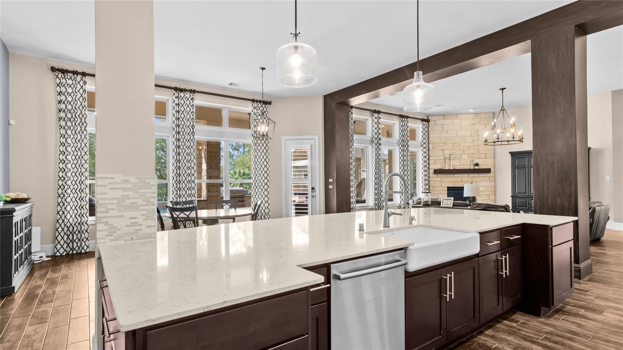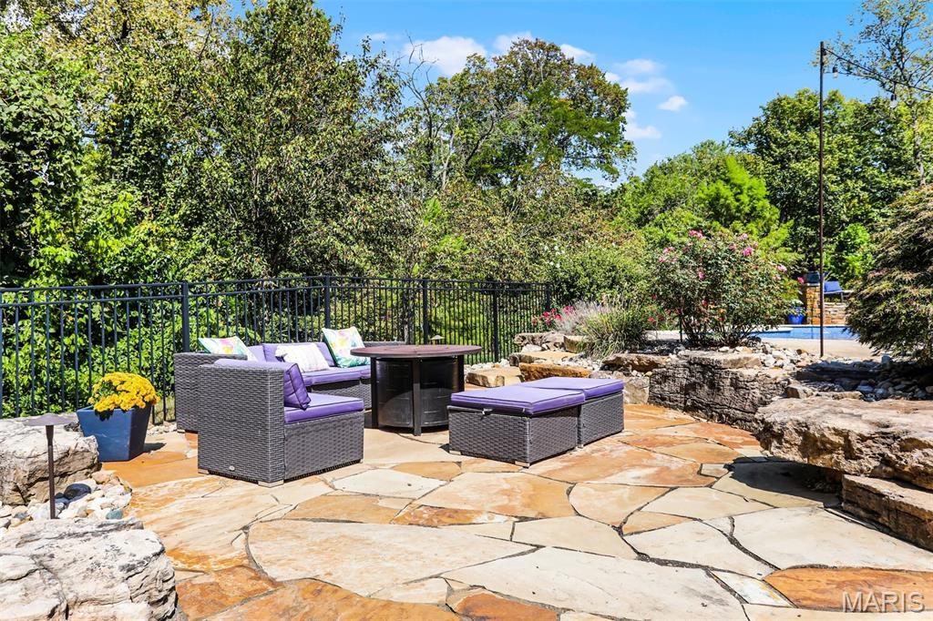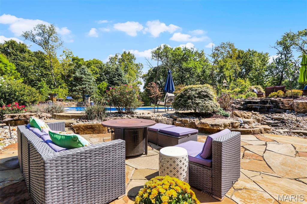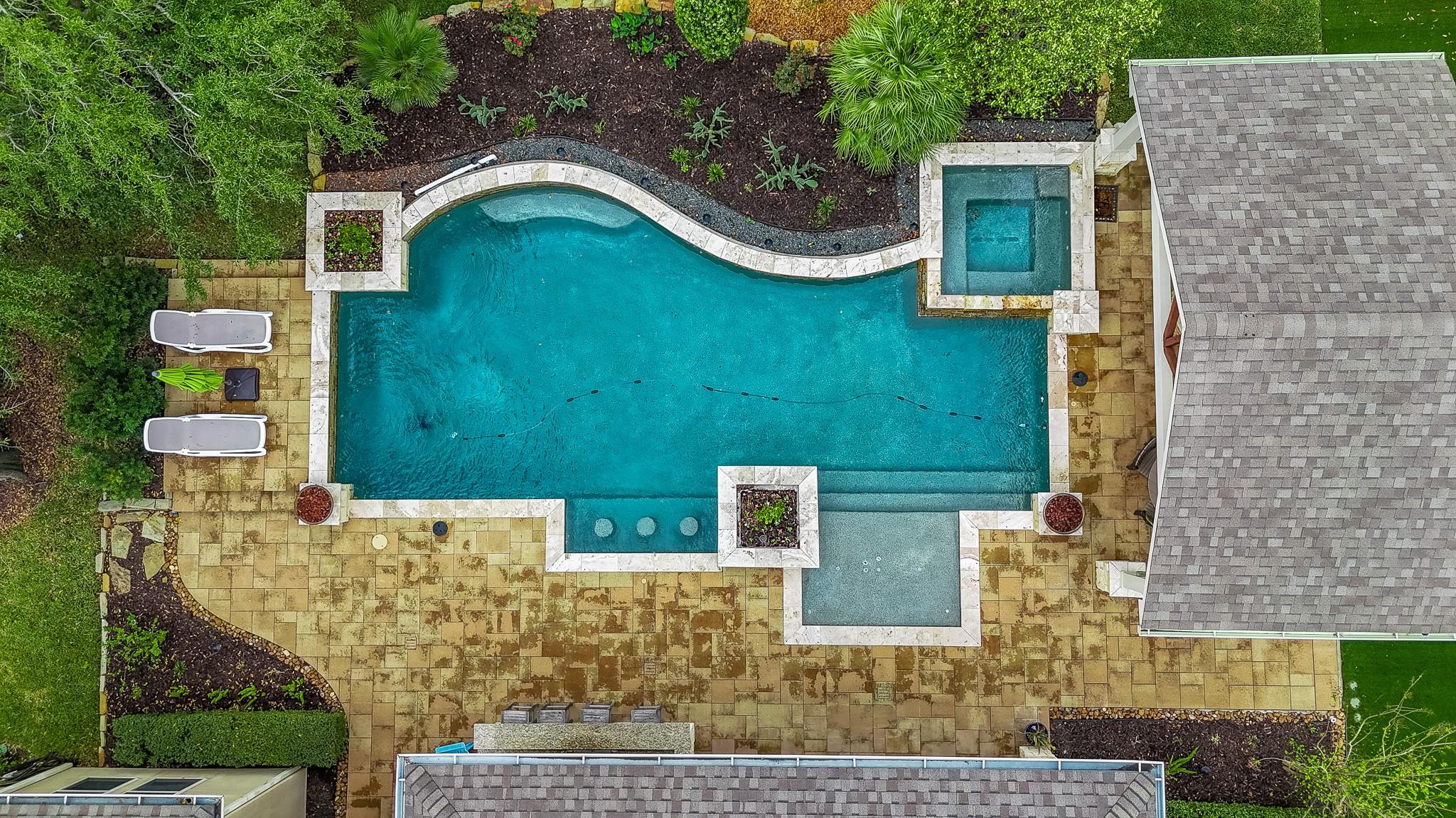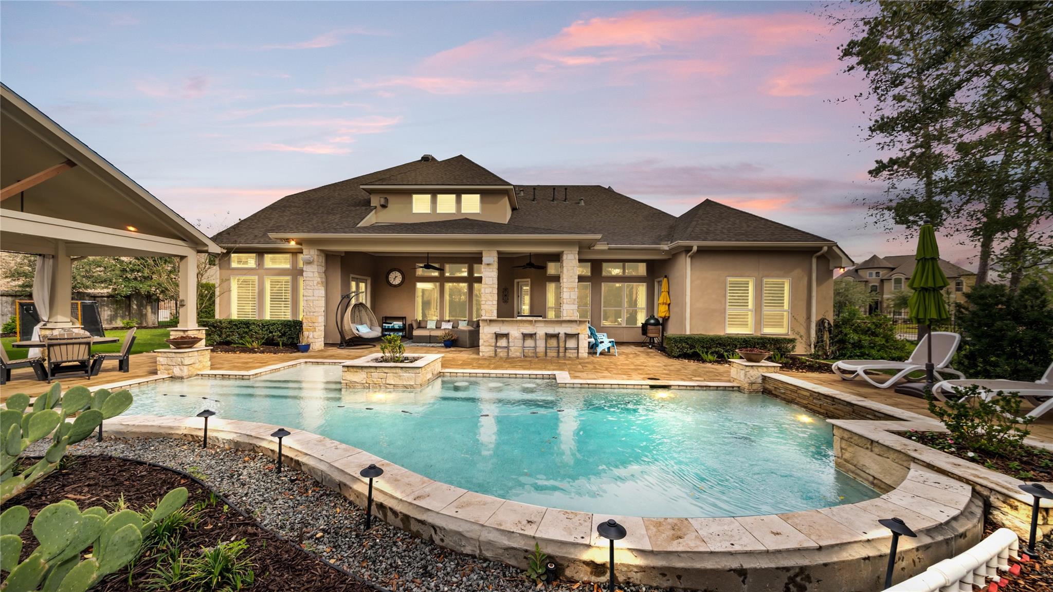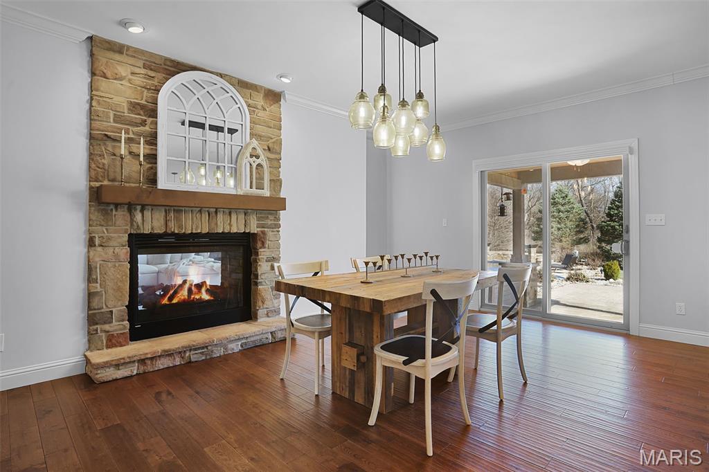 Welcome to an extraordinary residence where architectural elegance meets refined luxury. Striking stone & rich wood accents, soaring ceilings & 8 interior doors throughout create an impressive sense of scale & sophistication. Set on a picturesque 3/4-acre wooded lot, the backyard is a private resort featuring a spectacular saltwater pool w/ sun shelf & cascading waterfall, surrounded by mature trees & lush landscaping for ultimate privacy. Inside, the dramatic great room captivates w/ an arched wall of windows, open staircase & stunning see-through stone fireplace that creates warmth & grandeur. Just off the foyer, French doors open to a private office, thoughtfully designed w/ reclaimed wood doors that conceal shelving & supplies while adding distinctive character. The chefs kitchen impresses w/ premium appliances, granite counters, an expansive island, beverage bar, butlers pantry & a dining area perfectly positioned beside the fireplace. A well-appointed mudroom w/ custom built-in storage keeps daily life organized, while the laundry room features a convenient chute from the upper-level. The luxurious main-level owners suite offers dual walk-in closets & a spa-inspired bath w/ a custom onyx shower, whirlpool tub & separate vanities. Upstairs, 3 bedrooms each feature private ensuites & a bonus room w/ Juliet balconies. The light-filled lower level is ideal for entertaining w/ a family room, kitchenette, gym, 5th bedroom & full bath. Luxury, comfort & timeless design.