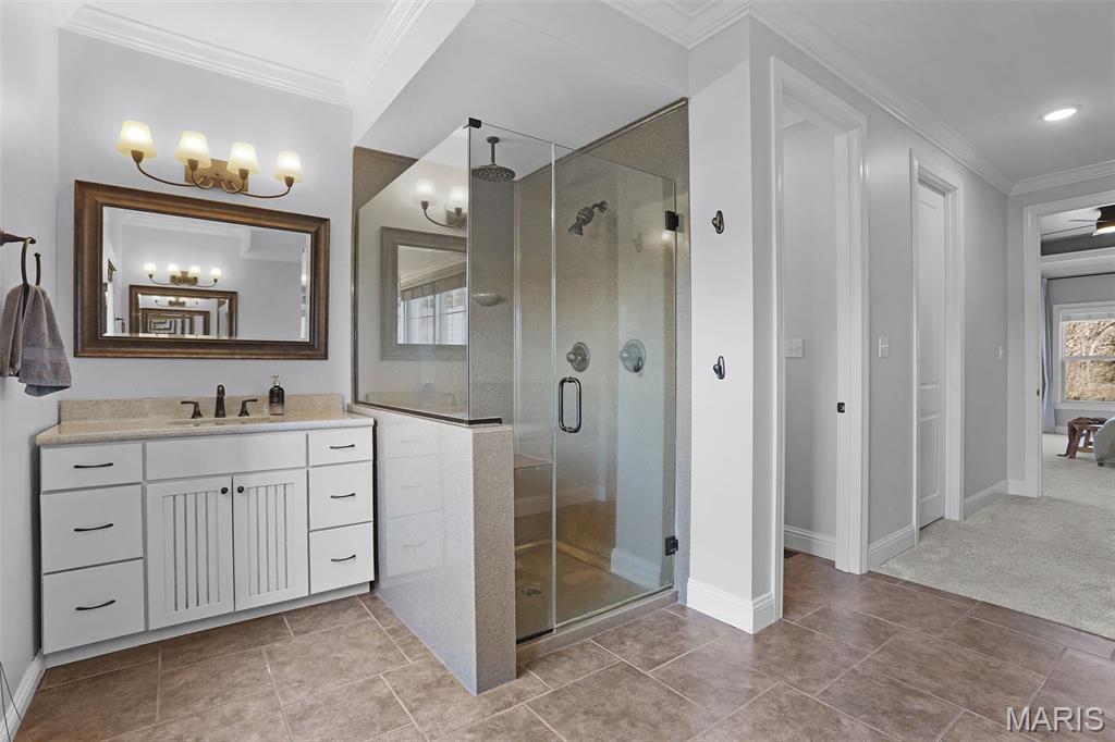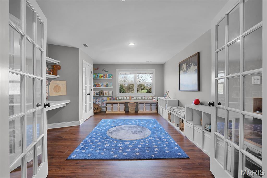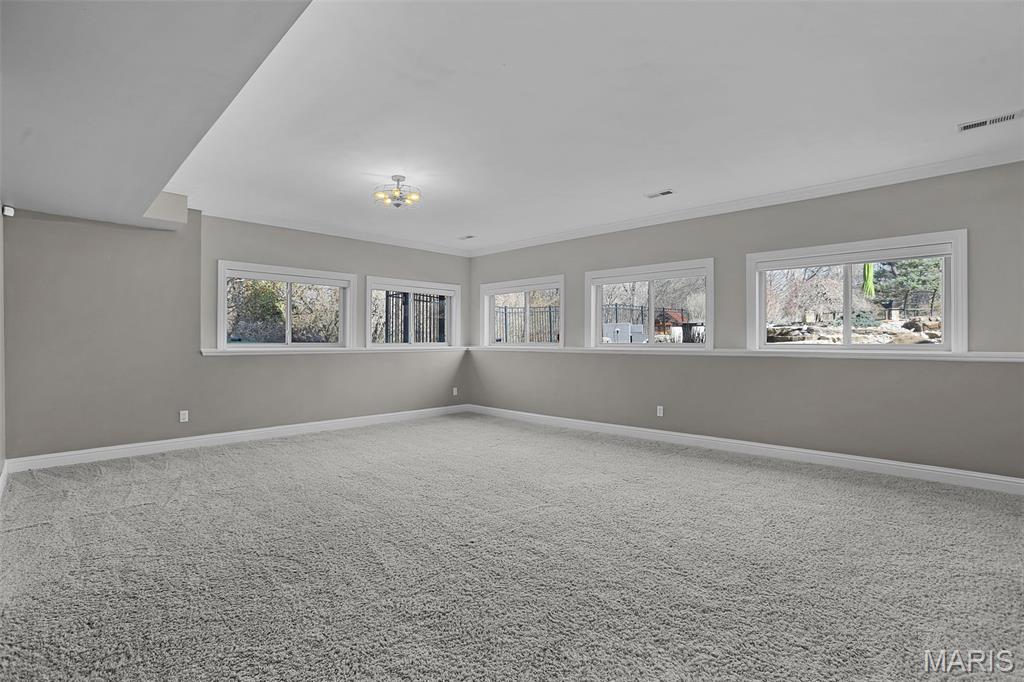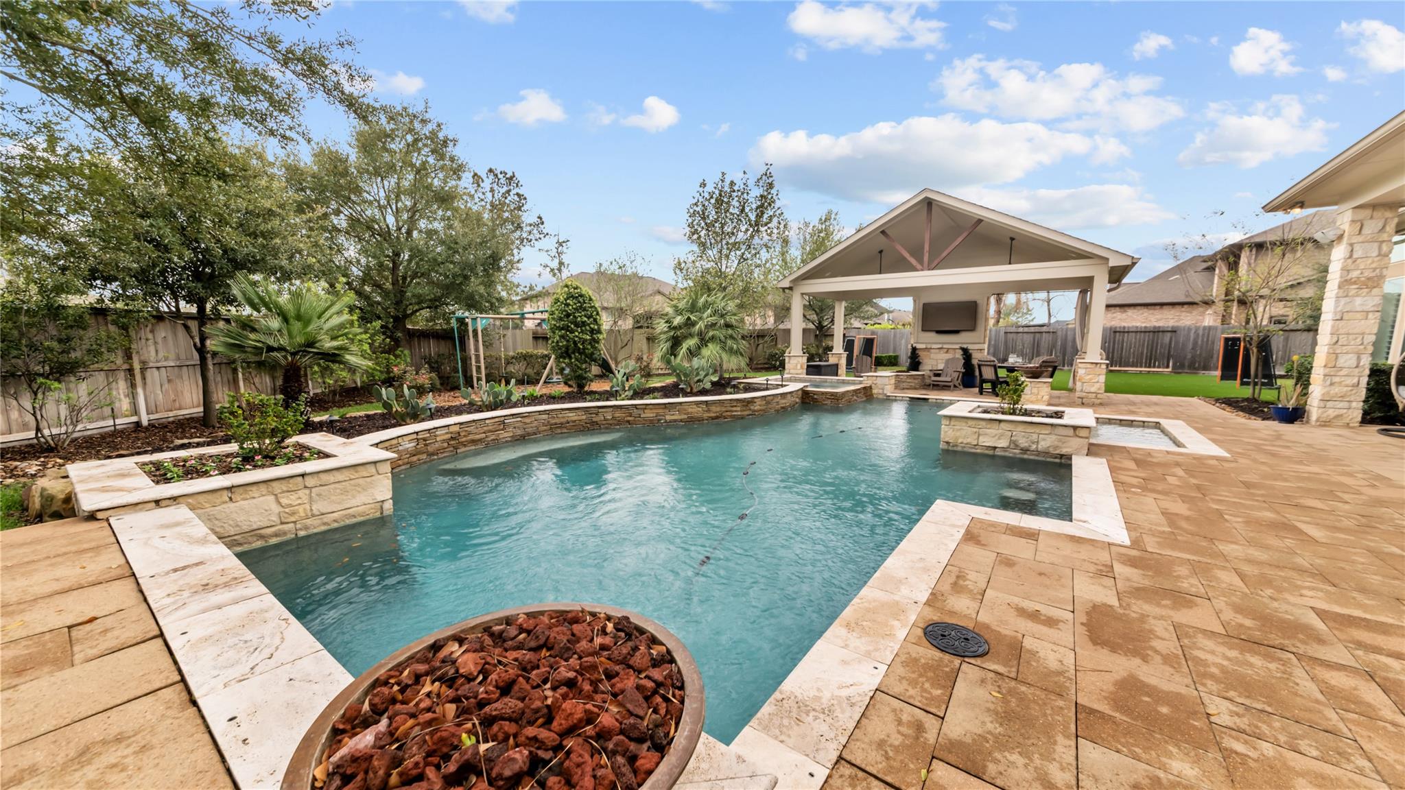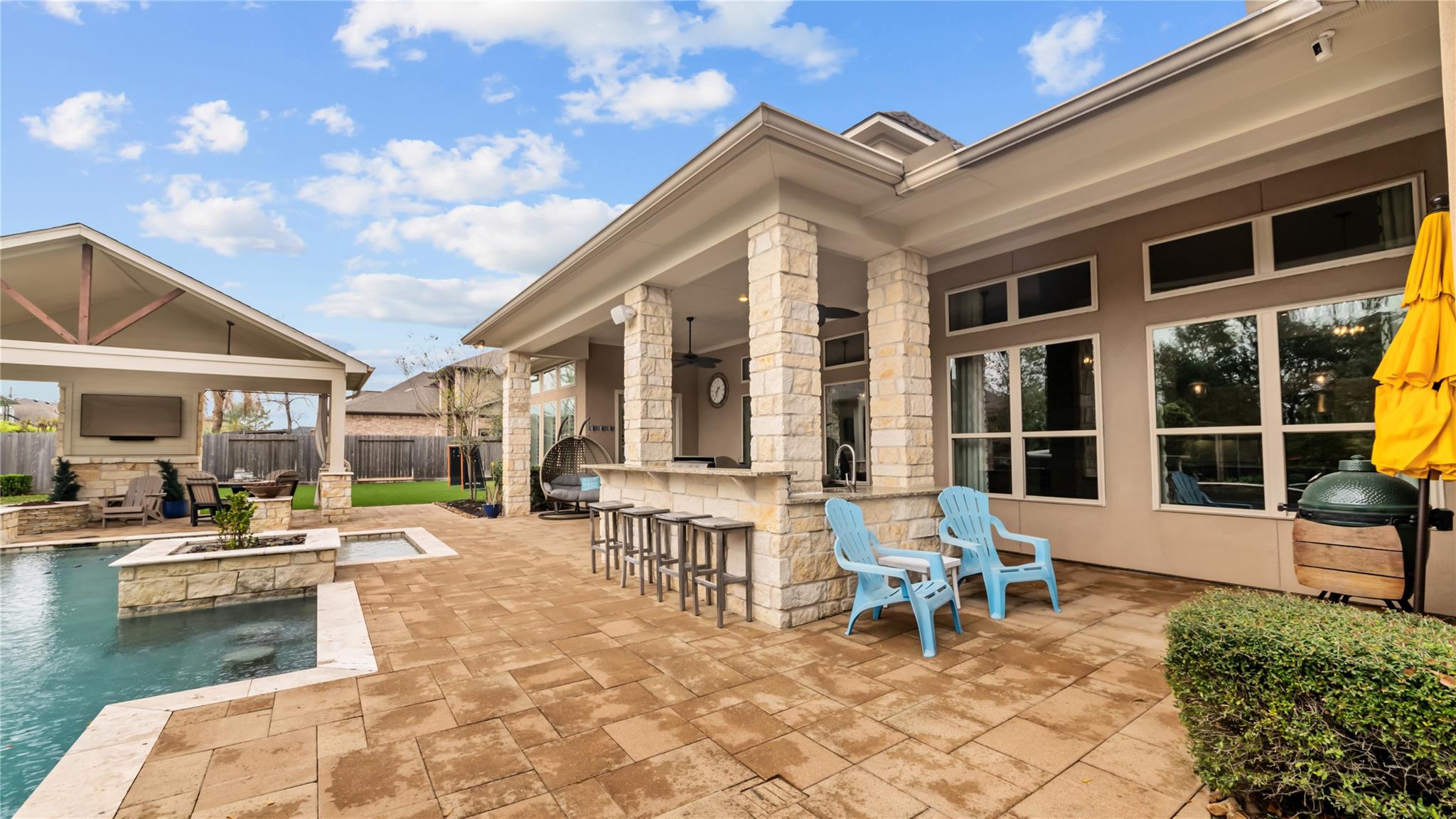 Welcome to an extraordinary residence where architectural elegance meets refined luxury. Striking stone & rich wood accents, soaring ceilings & 8 interior doors throughout create an impressive sense of scale & sophistication. Set on a picturesque 3/4-acre wooded lot, the backyard is a private resort featuring a spectacular saltwater pool w/ sun shelf & cascading waterfall, surrounded by mature trees & lush landscaping for ultimate privacy. Inside, the dramatic great room captivates w/ an arched wall of windows, open staircase & stunning see-through stone fireplace that creates warmth & grandeur. Just off the foyer, French doors open to a private office, thoughtfully designed w/ reclaimed wood doors that conceal shelving & supplies while adding distinctive character. The chefs kitchen impresses w/ premium appliances, granite counters, an expansive island, beverage bar, butlers pantry & a dining area perfectly positioned beside the fireplace. A well-appointed mudroom w/ custom built-in storage keeps daily life organized, while the laundry room features a convenient chute from the upper-level. The luxurious main-level owners suite offers dual walk-in closets & a spa-inspired bath w/ a custom onyx shower, whirlpool tub & separate vanities. Upstairs, 3 bedrooms each feature private ensuites & a bonus room w/ Juliet balconies. The light-filled lower level is ideal for entertaining w/ a family room, kitchenette, gym, 5th bedroom & full bath. Luxury, comfort & timeless design.