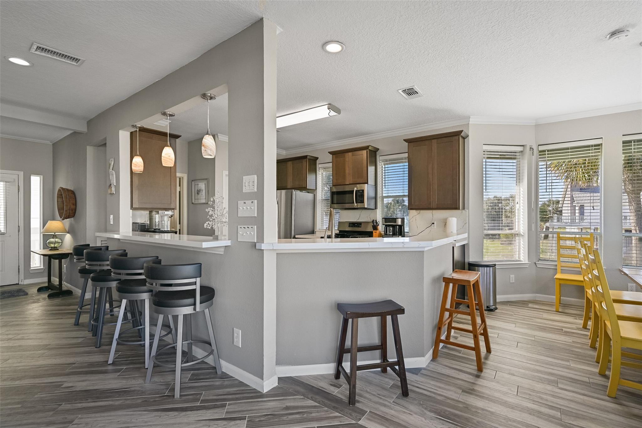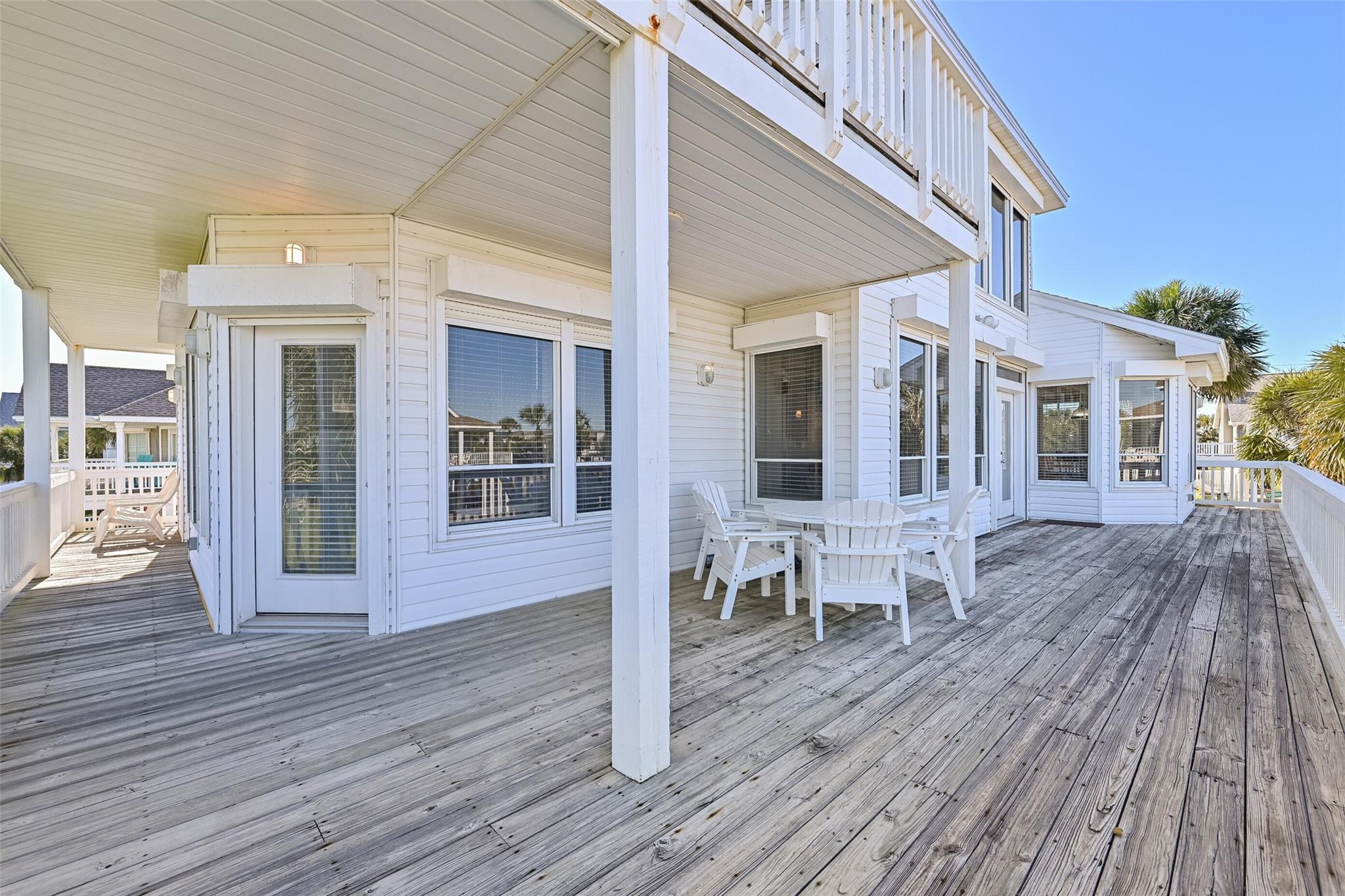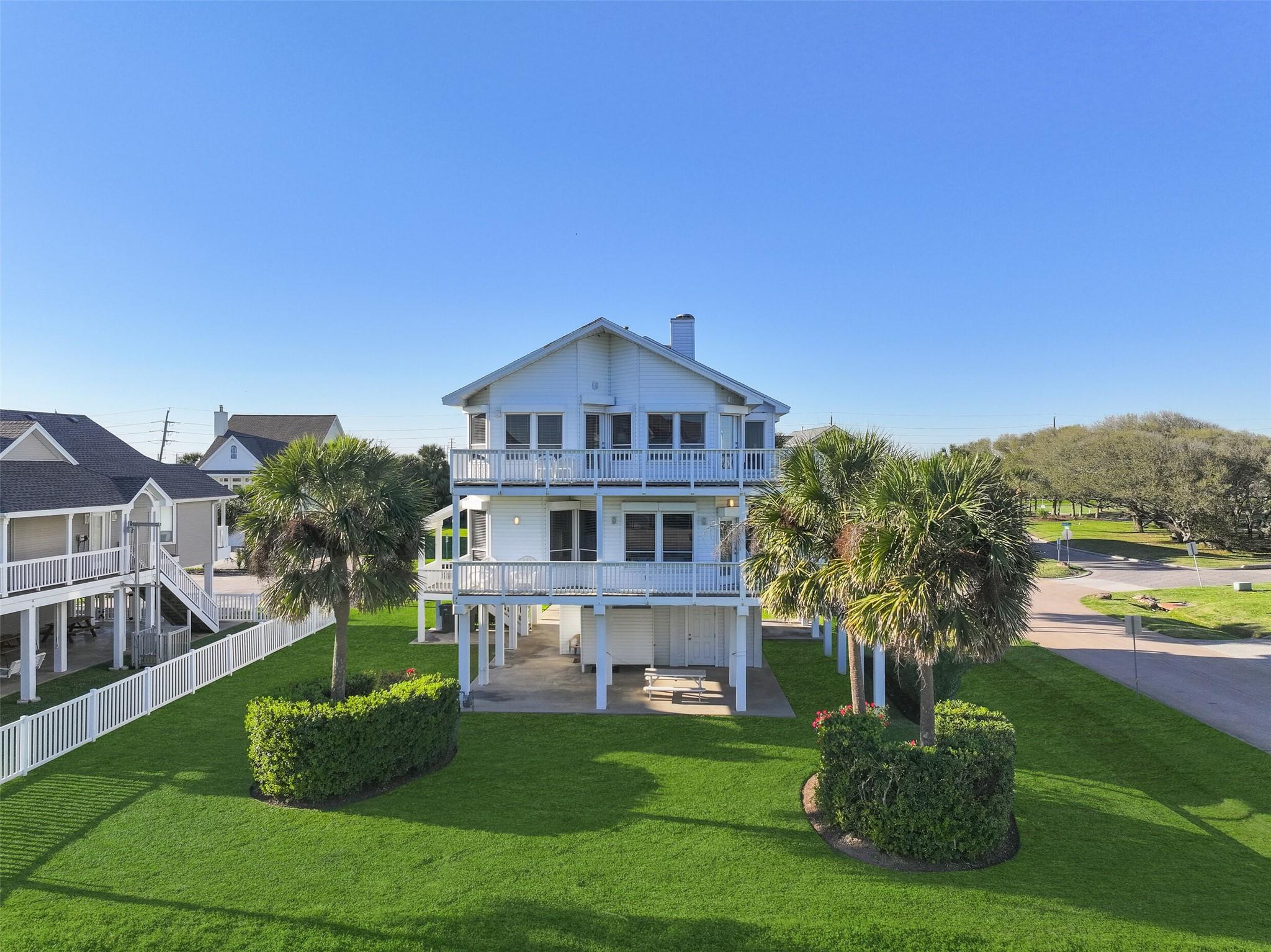 Welcome to your dream beachside retreat! Situated on a corner lot, this home features 4 bedrooms, 3 baths, and was updated in May 2022. Enjoy breathtaking beach views from multiple decks, and a prime location just blocks from the shore. The open-concept kitchen seamlessly flows into the living area, perfect for entertaining, & includes full wood cabinets, quartz Calacatta countertops, soft close drawers, gas range, & large walk-in pantry and gas log fireplace. Along with the kitchen, dining & living room, the main level hosts the primary suite, full guest bath & laundry area, while the second level offers a bonus den area, three guest bedrooms, & a full bath. Two of the guest bedrooms have access to a shared deck for enjoying the gulf breezes & gulf views. The ground level boasts 2 garages & outside shower. 2022 remodel included new furnishings, interior paint, tile flooring, 2 new HVAC units (inside & out), new fixtures & LED lights. Conveys furnished and is not a short-term rental.