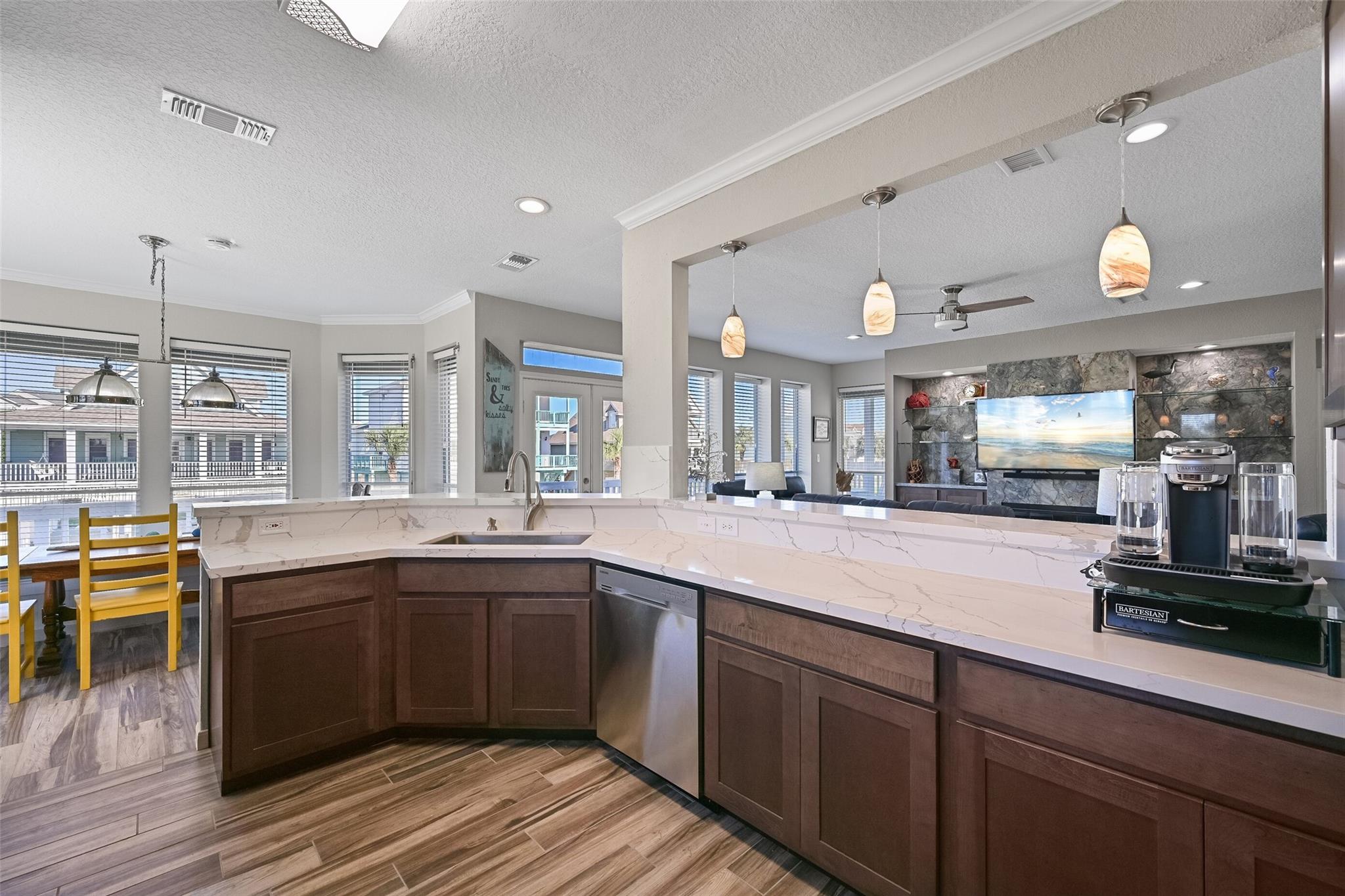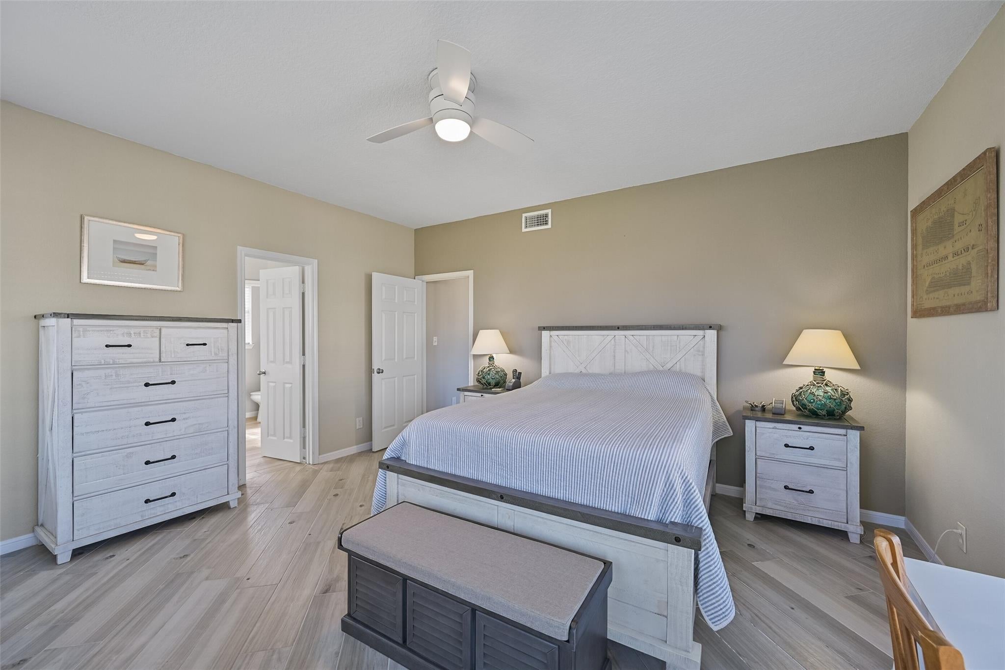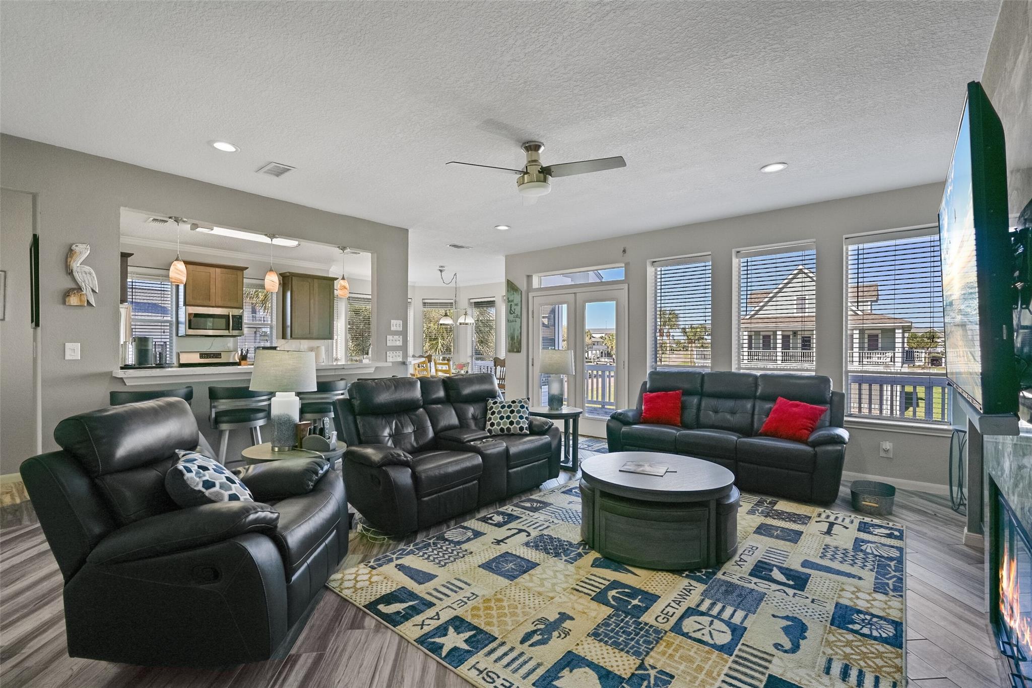Welcome to your dream beachside retreat! Situated on a corner lot, this home features 4 bedrooms, 3 baths, and was updated in May 2022. Enjoy breathtaking beach views from multiple decks, and a prime location just blocks from the shore. The open-concept kitchen seamlessly flows into the living area, perfect for entertaining, & includes full wood cabinets, quartz Calacatta countertops, soft close drawers, gas range, & large walk-in pantry and gas log fireplace. Along with the kitchen, dining & living room, the main level hosts the primary suite, full guest bath & laundry area, while the second level offers a bonus den area, three guest bedrooms, & a full bath. Two of the guest bedrooms have access to a shared deck for enjoying the gulf breezes & gulf views. The ground level boasts 2 garages & outside shower. 2022 remodel included new furnishings, interior paint, tile flooring, 2 new HVAC units (inside & out), new fixtures & LED lights. Conveys furnished and is not a short-term rental.
