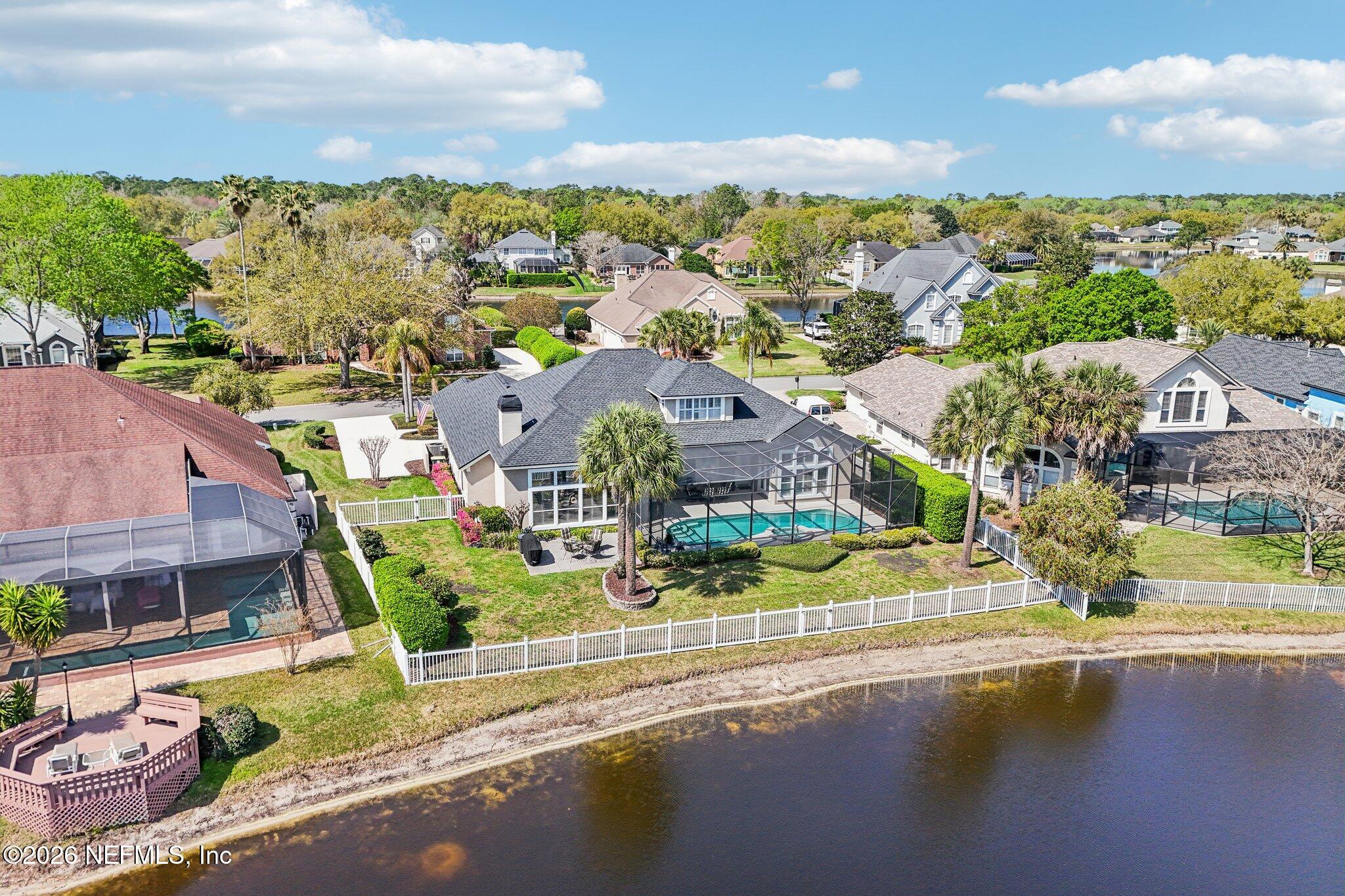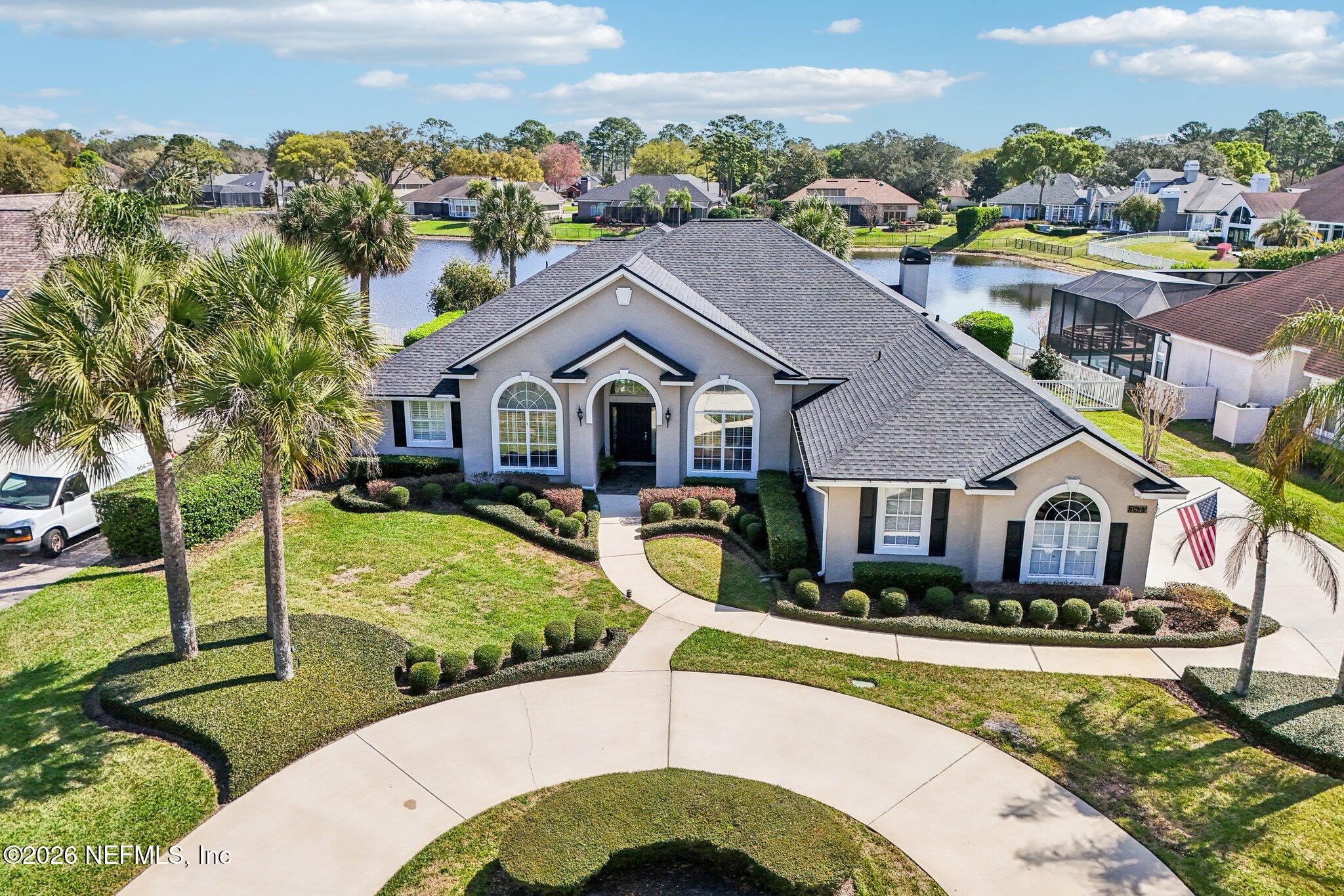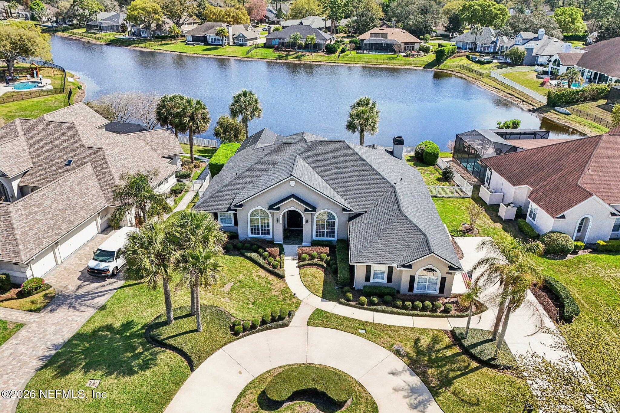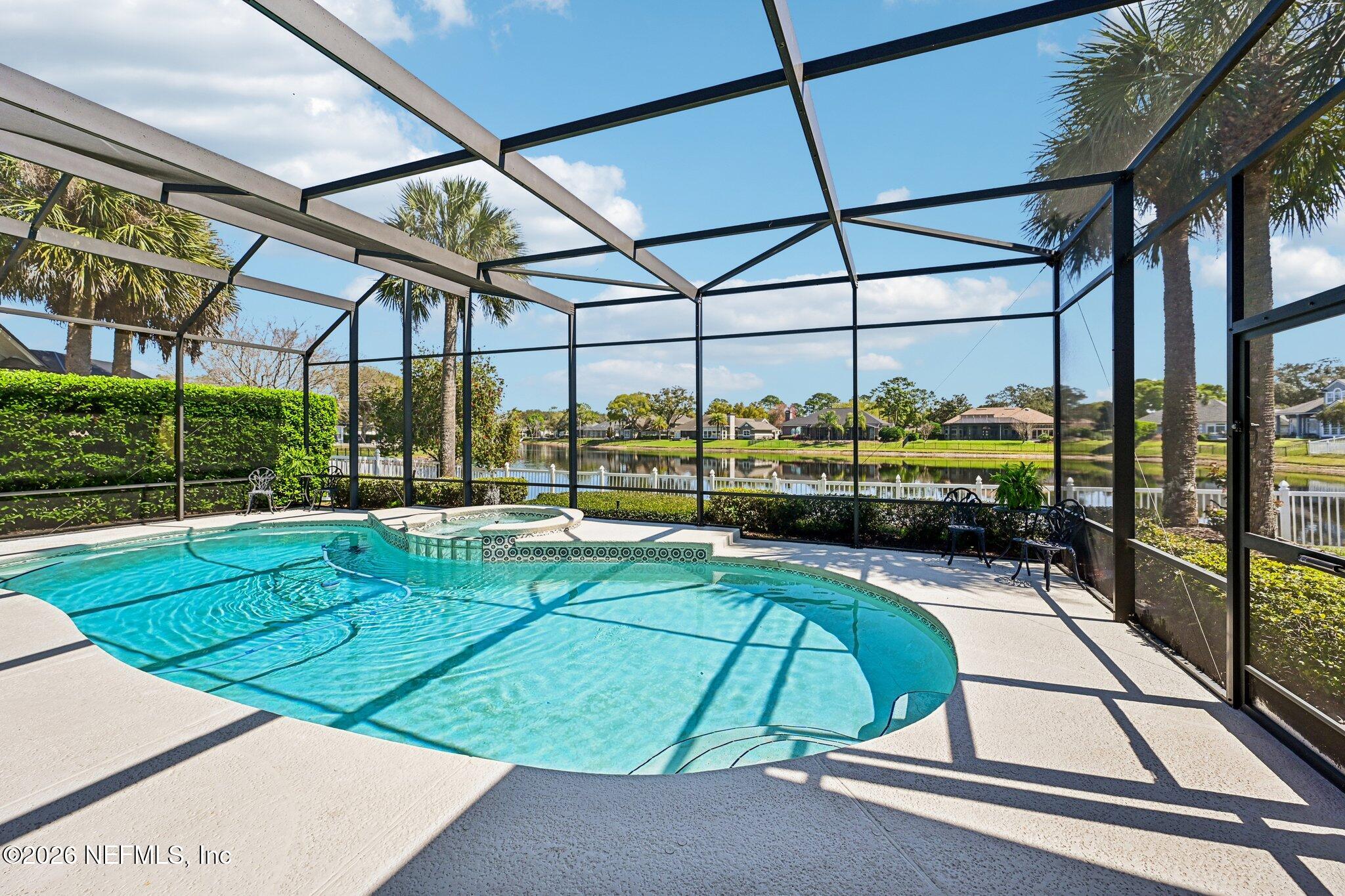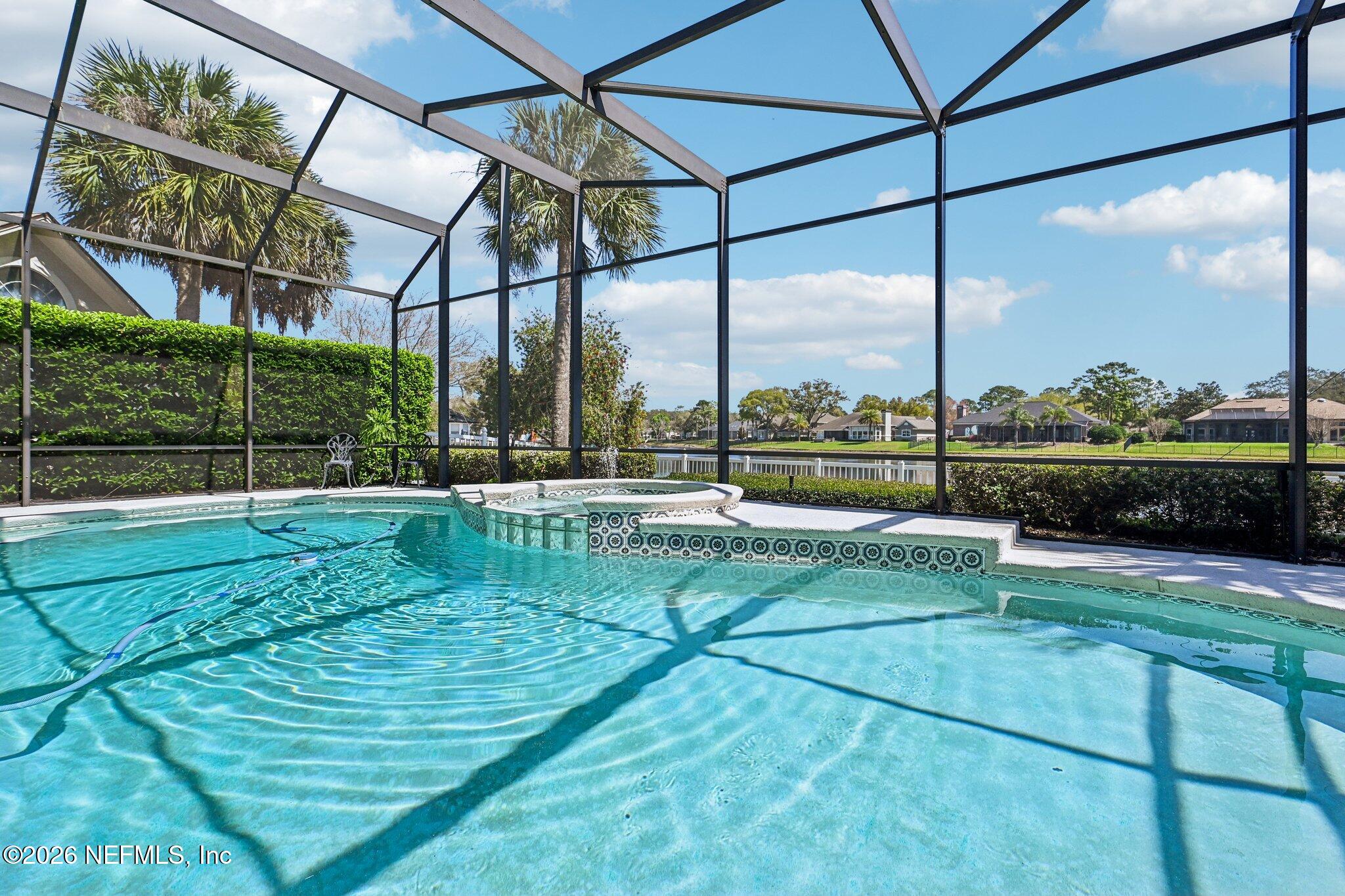 Welcome Home! To this highly desirable home in Jax Golf & Country Club on a beautiful lake lot! This spacious well-maintained home offers a formal living & dining room w/ carpet & wood laminate flooring throughout. The flexible floor plan includes a 5th bedroom guest suite w/ a private bath. The primary suite features walk-in closets with built-in shelving, updated dual vanities, a seamless glass shower, & a separate tub. The kitchen showcases white cabinets, solid surface countertops, & SS appliances. Enjoy a laundry room w/ cabinet storage and sink, shutters throughout, water softener system, smart thermostat, & smoke detectors, plus two AC systems (1 yr old). Step outside to a screened pool enclosure w/ a gas-heated pool & hot tub, a fenced yard w/ an additional invisible fence, & a circular driveway for extra parking. NEW roof 2026.
