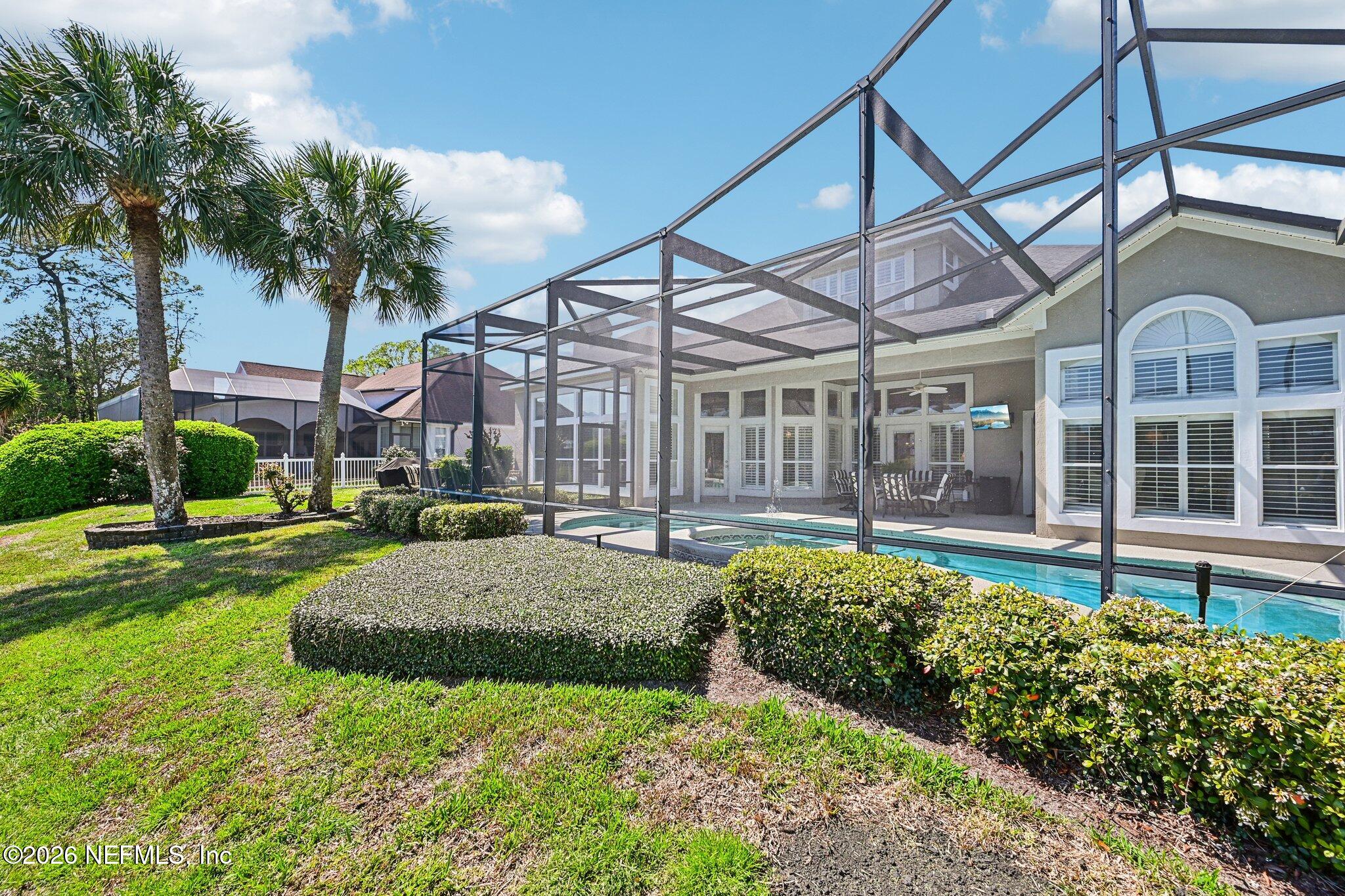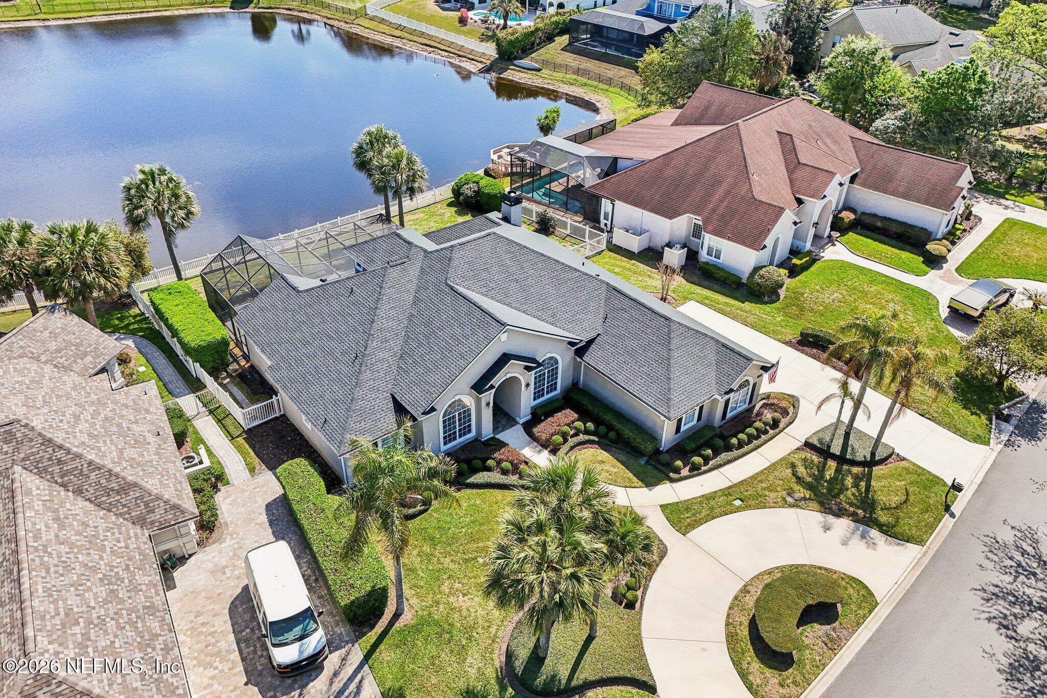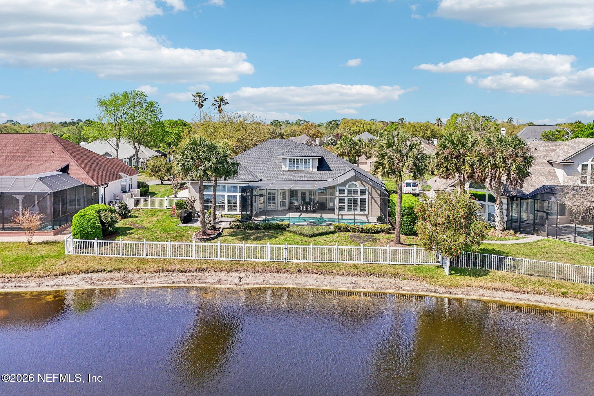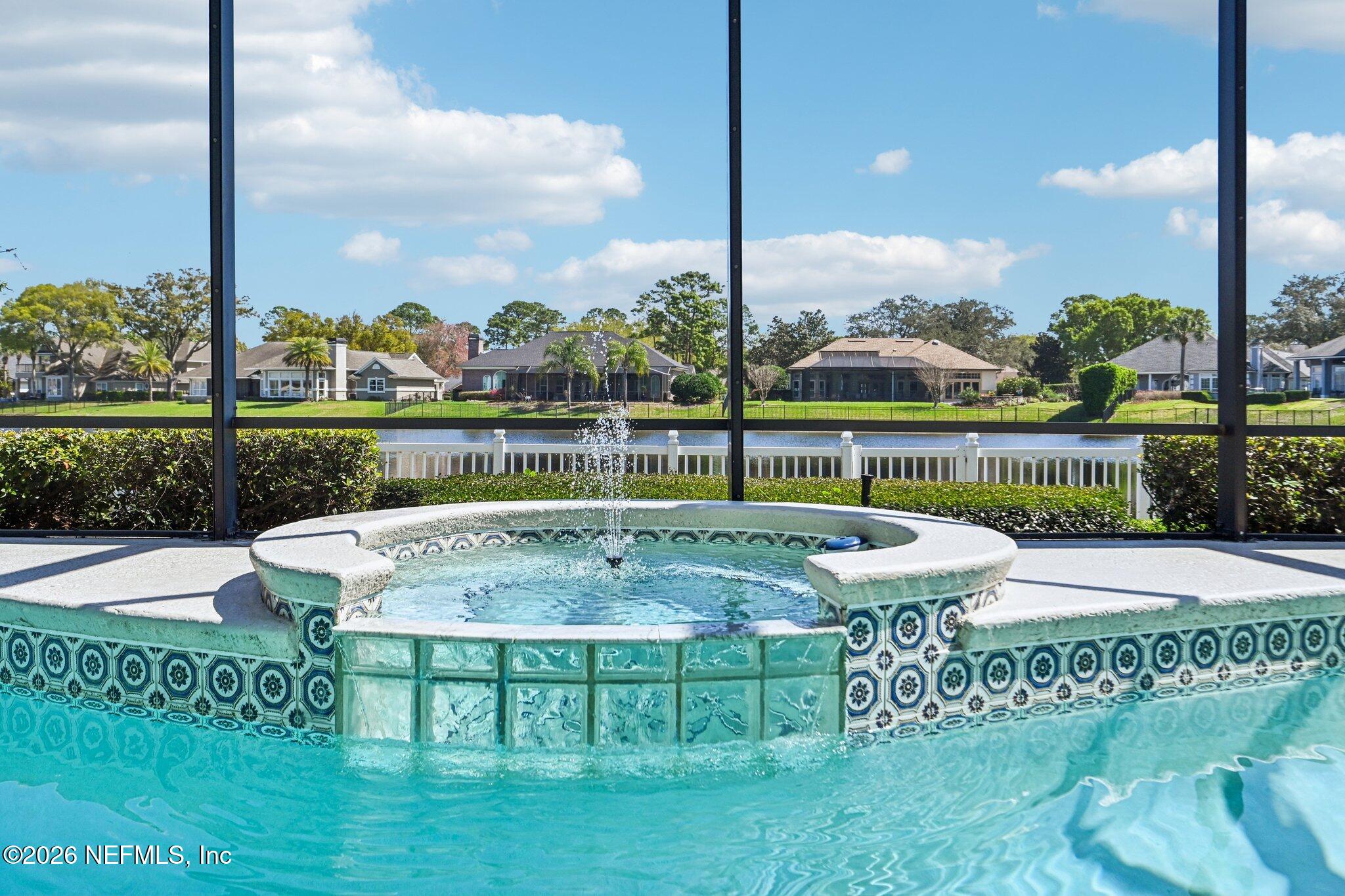 Welcome Home! To this highly desirable home in Jax Golf & Country Club on a beautiful lake lot! This spacious well-maintained home offers a formal living & dining room w/ carpet & wood laminate flooring throughout. The flexible floor plan includes a 5th bedroom guest suite w/ a private bath. The primary suite features walk-in closets with built-in shelving, updated dual vanities, a seamless glass shower, & a separate tub. The kitchen showcases white cabinets, solid surface countertops, & SS appliances. Enjoy a laundry room w/ cabinet storage and sink, shutters throughout, water softener system, smart thermostat, & smoke detectors, plus two AC systems (1 yr old). Step outside to a screened pool enclosure w/ a gas-heated pool & hot tub, a fenced yard w/ an additional invisible fence, & a circular driveway for extra parking. NEW roof 2026.
