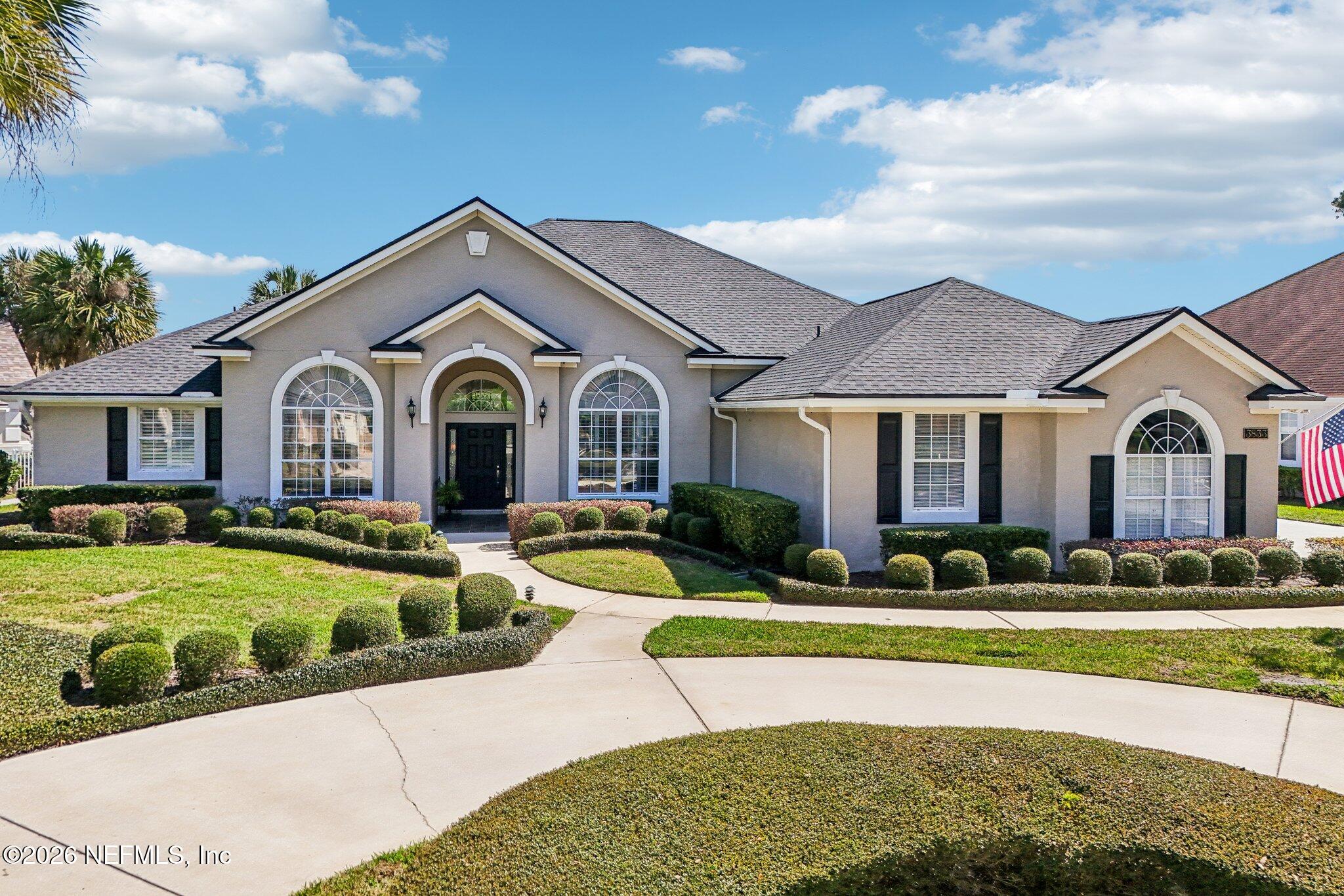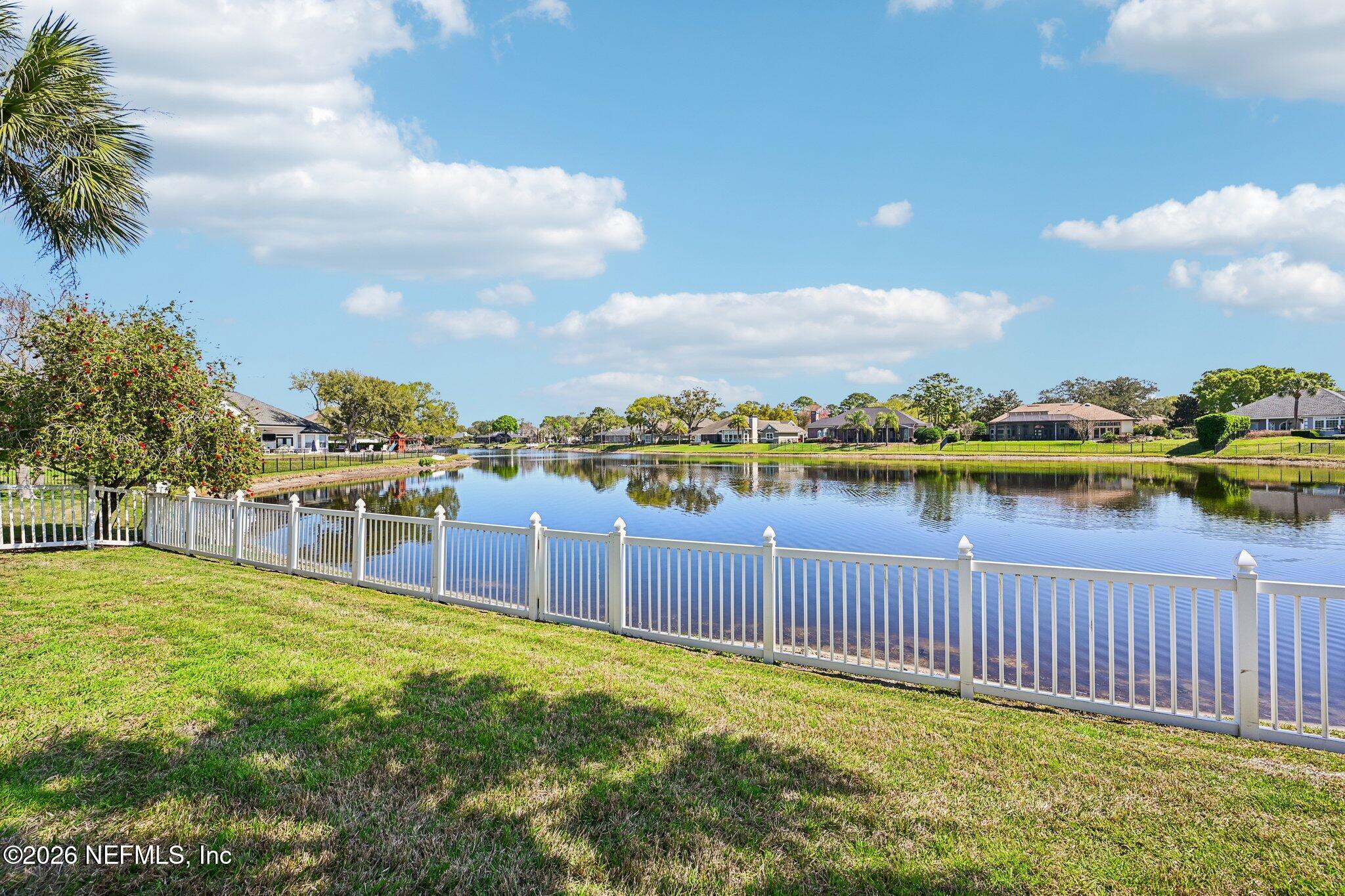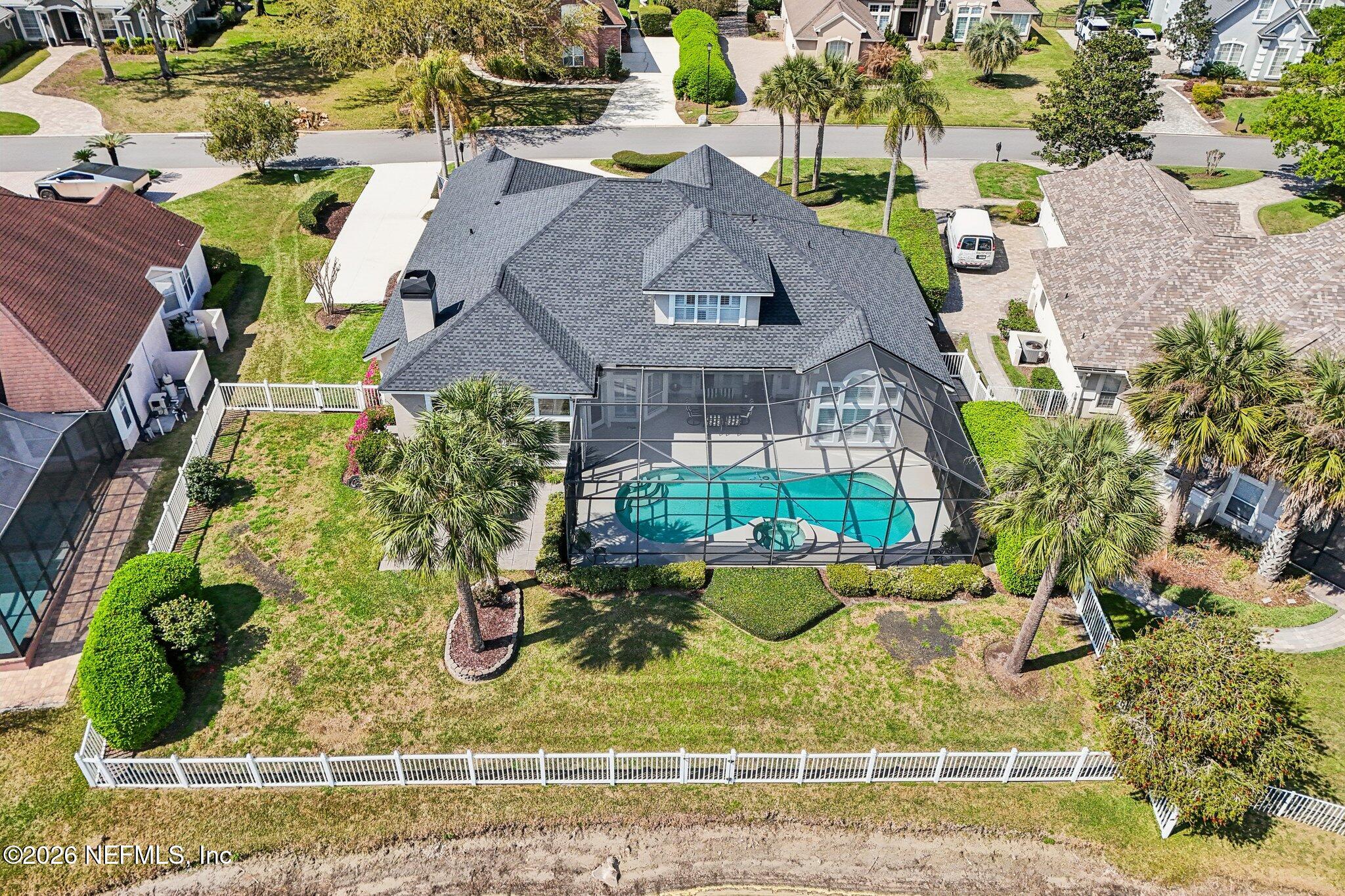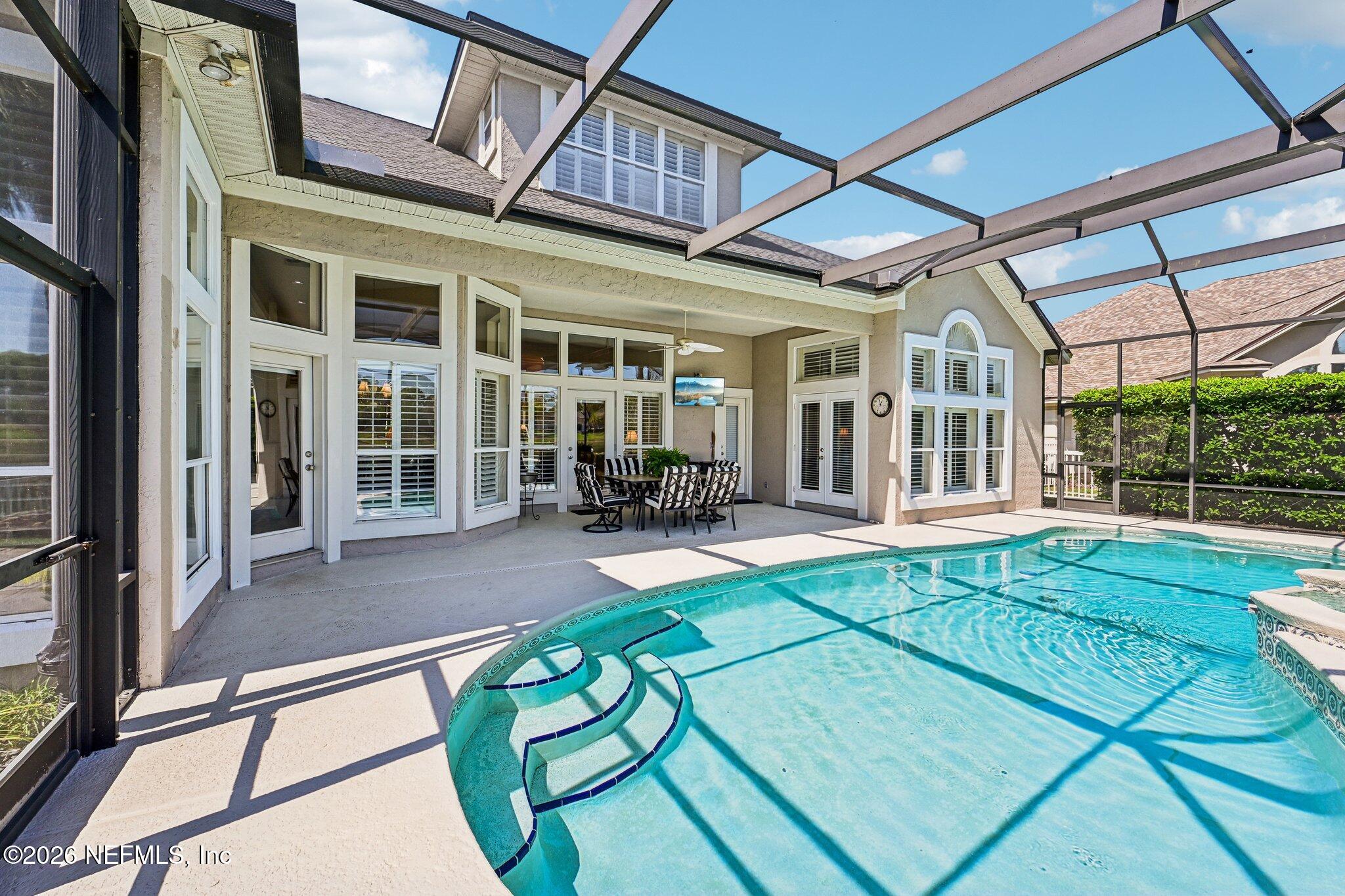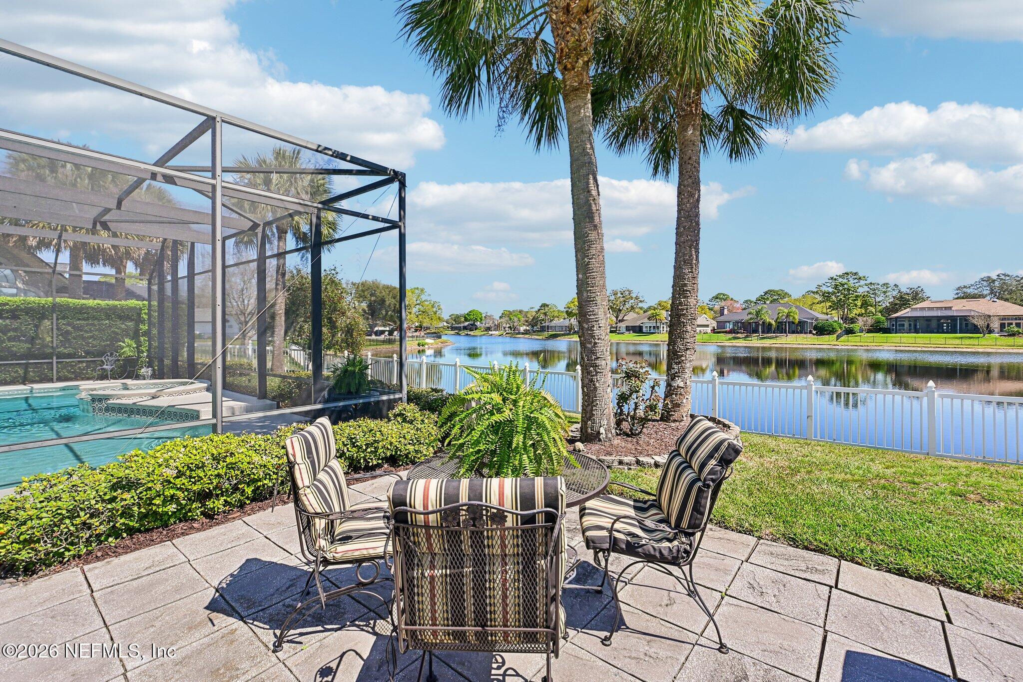 Welcome Home! To this highly desirable home in Jax Golf & Country Club on a beautiful lake lot! This spacious well-maintained home offers a formal living & dining room w/ carpet & wood laminate flooring throughout. The flexible floor plan includes a 5th bedroom guest suite w/ a private bath. The primary suite features walk-in closets with built-in shelving, updated dual vanities, a seamless glass shower, & a separate tub. The kitchen showcases white cabinets, solid surface countertops, & SS appliances. Enjoy a laundry room w/ cabinet storage and sink, shutters throughout, water softener system, smart thermostat, & smoke detectors, plus two AC systems (1 yr old). Step outside to a screened pool enclosure w/ a gas-heated pool & hot tub, a fenced yard w/ an additional invisible fence, & a circular driveway for extra parking. NEW roof 2026.