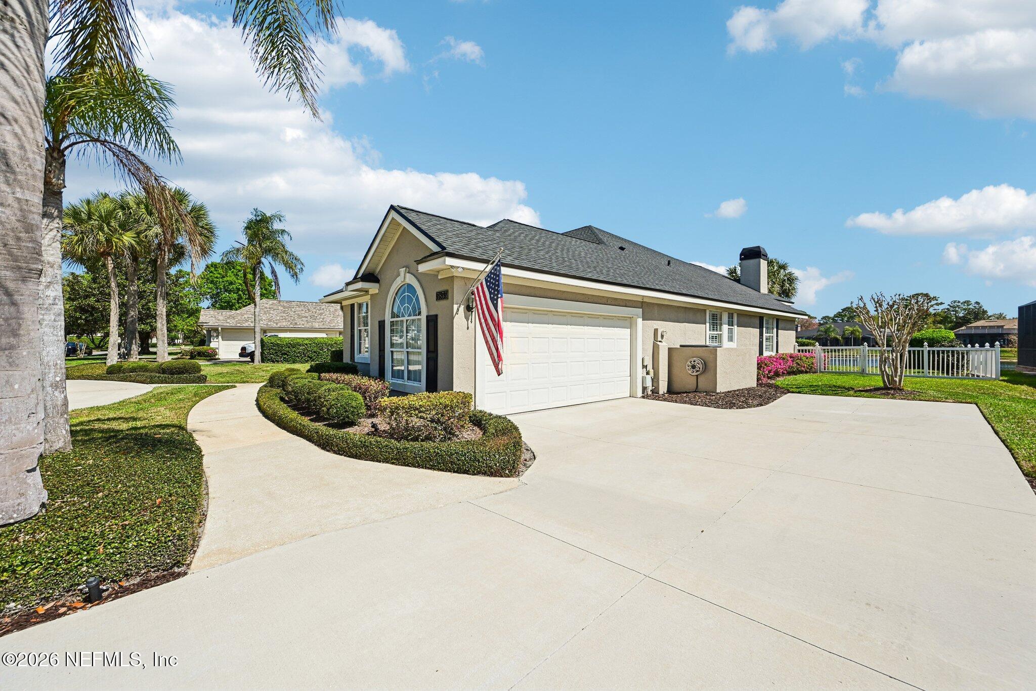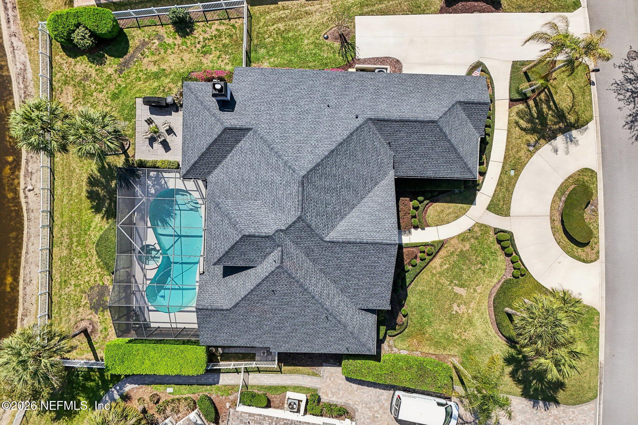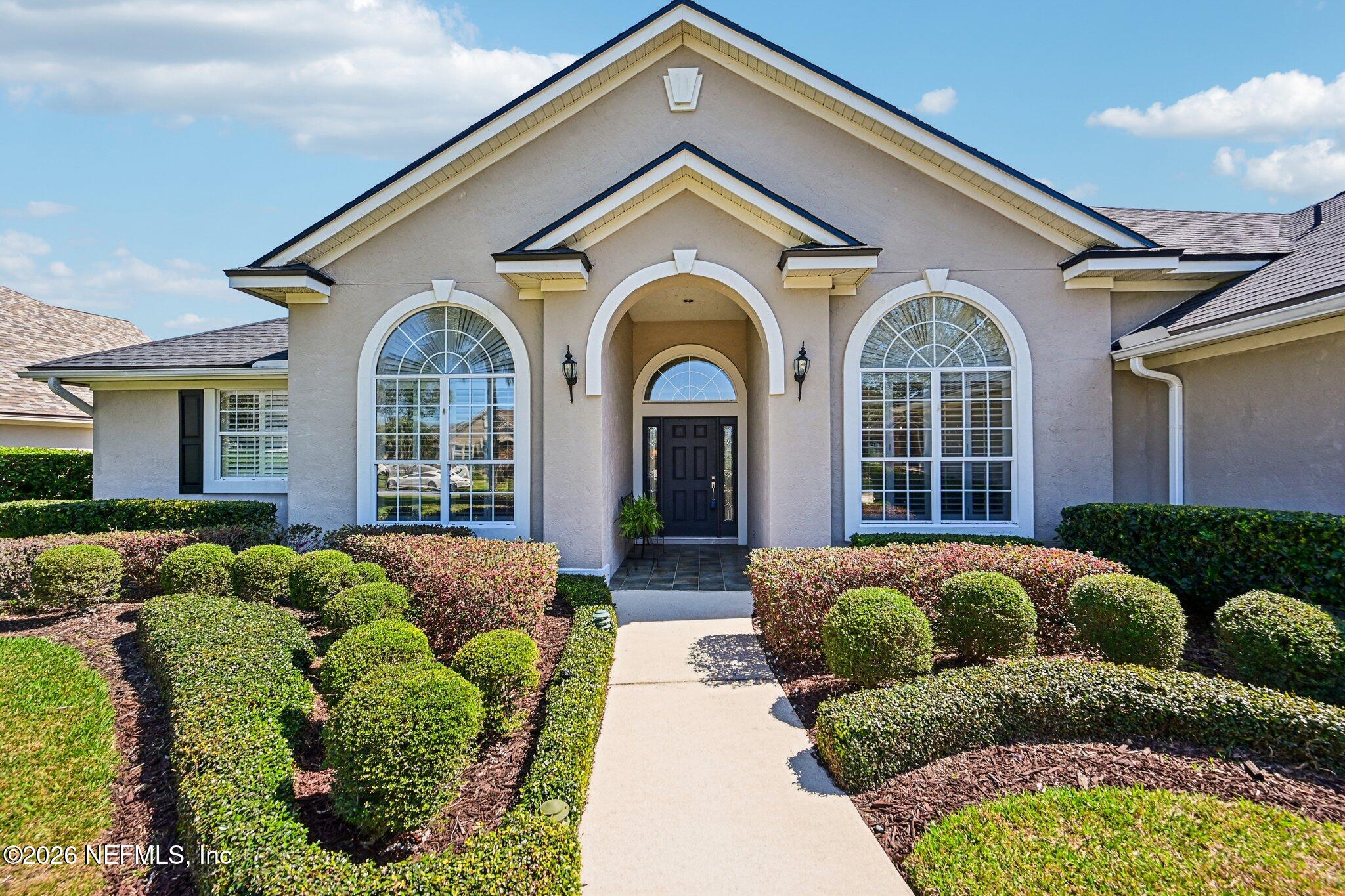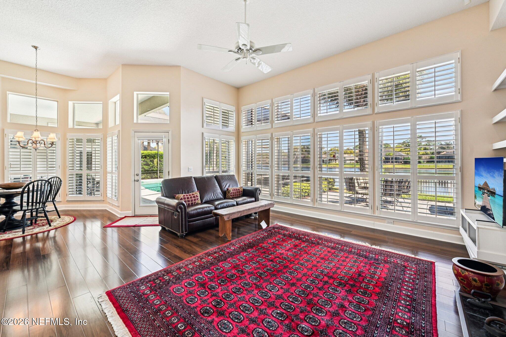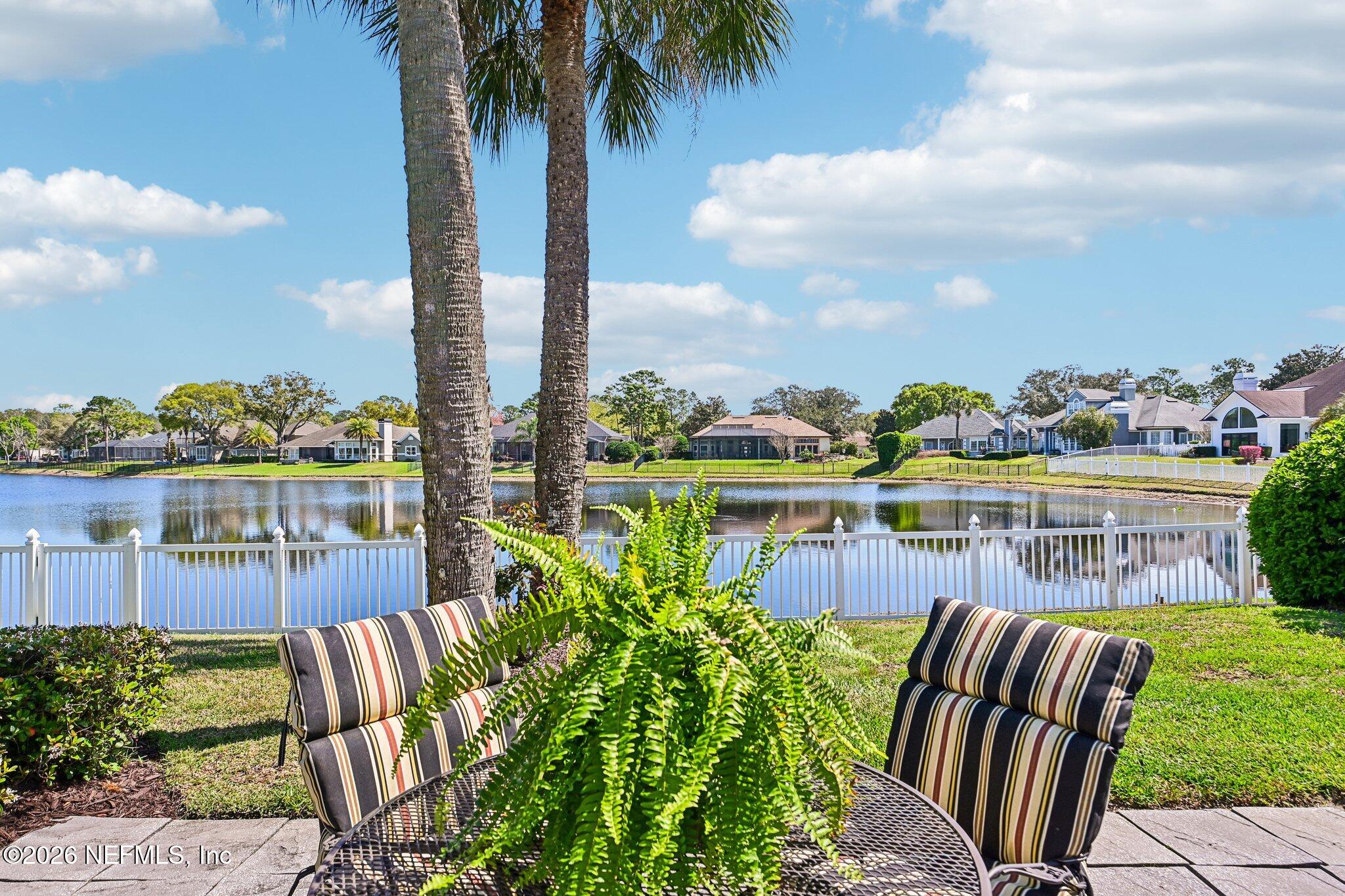 Welcome Home! To this highly desirable home in Jax Golf & Country Club on a beautiful lake lot! This spacious well-maintained home offers a formal living & dining room w/ carpet & wood laminate flooring throughout. The flexible floor plan includes a 5th bedroom guest suite w/ a private bath. The primary suite features walk-in closets with built-in shelving, updated dual vanities, a seamless glass shower, & a separate tub. The kitchen showcases white cabinets, solid surface countertops, & SS appliances. Enjoy a laundry room w/ cabinet storage and sink, shutters throughout, water softener system, smart thermostat, & smoke detectors, plus two AC systems (1 yr old). Step outside to a screened pool enclosure w/ a gas-heated pool & hot tub, a fenced yard w/ an additional invisible fence, & a circular driveway for extra parking. NEW roof 2026.