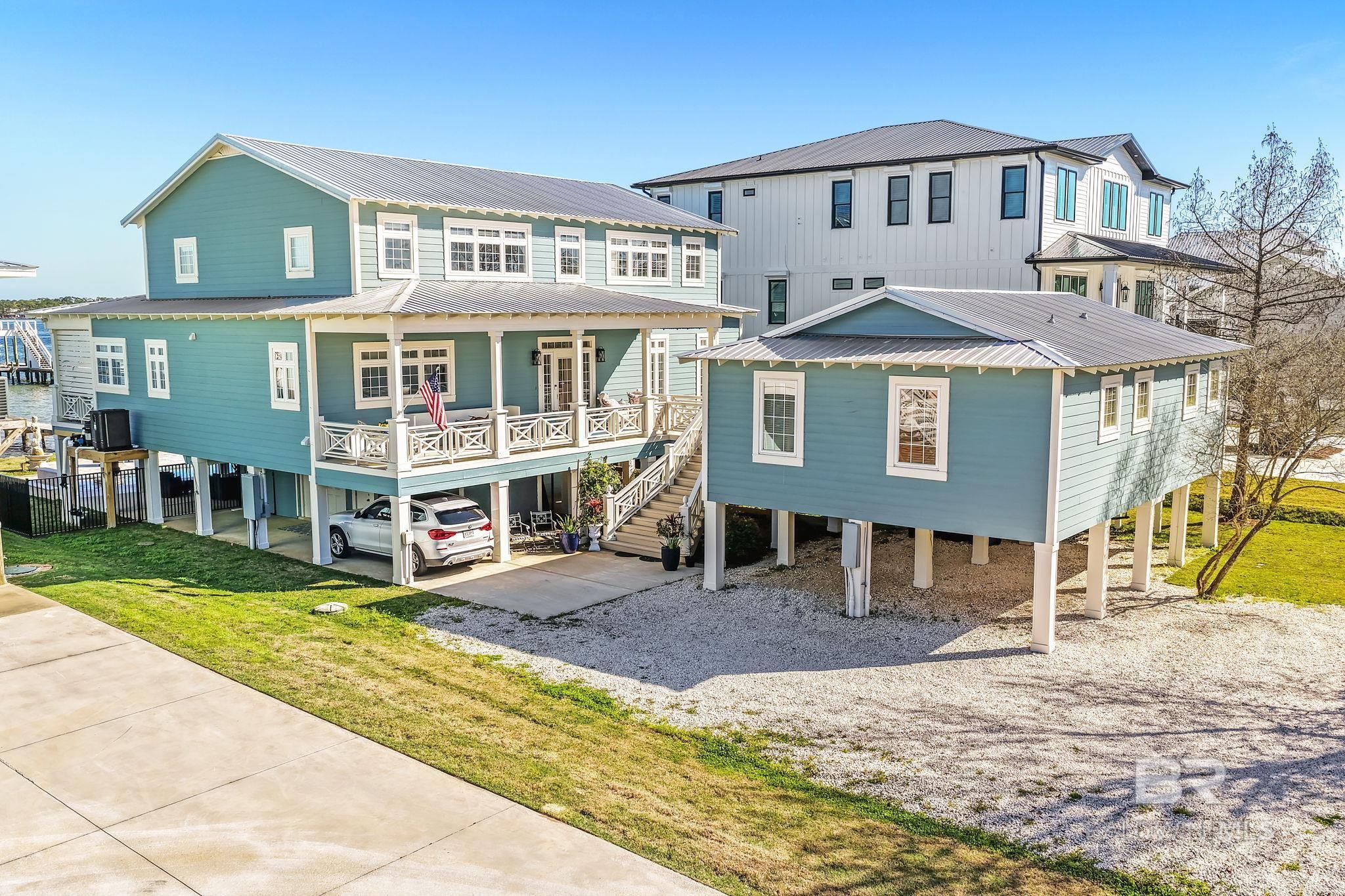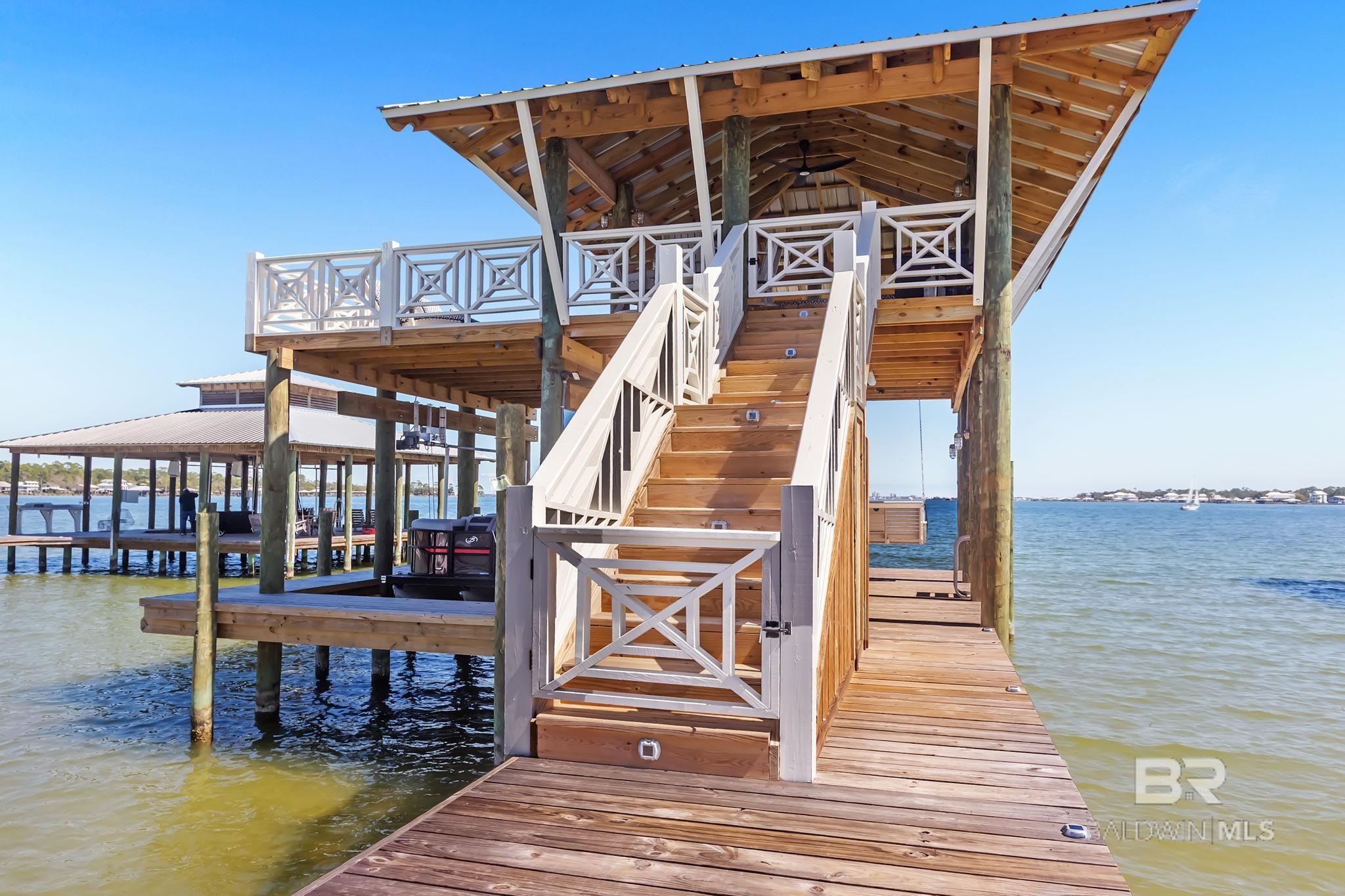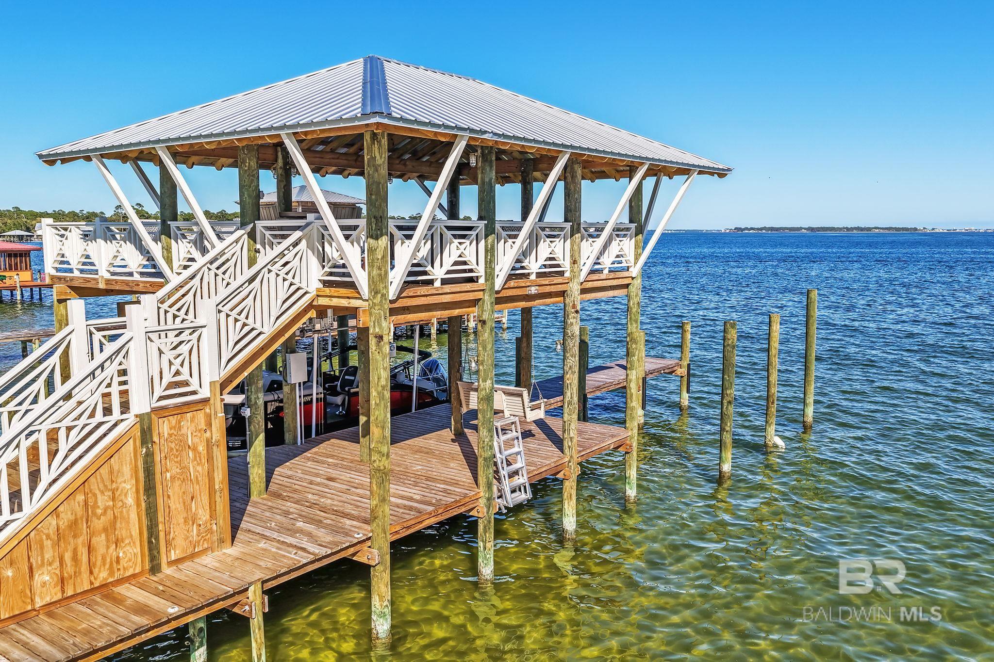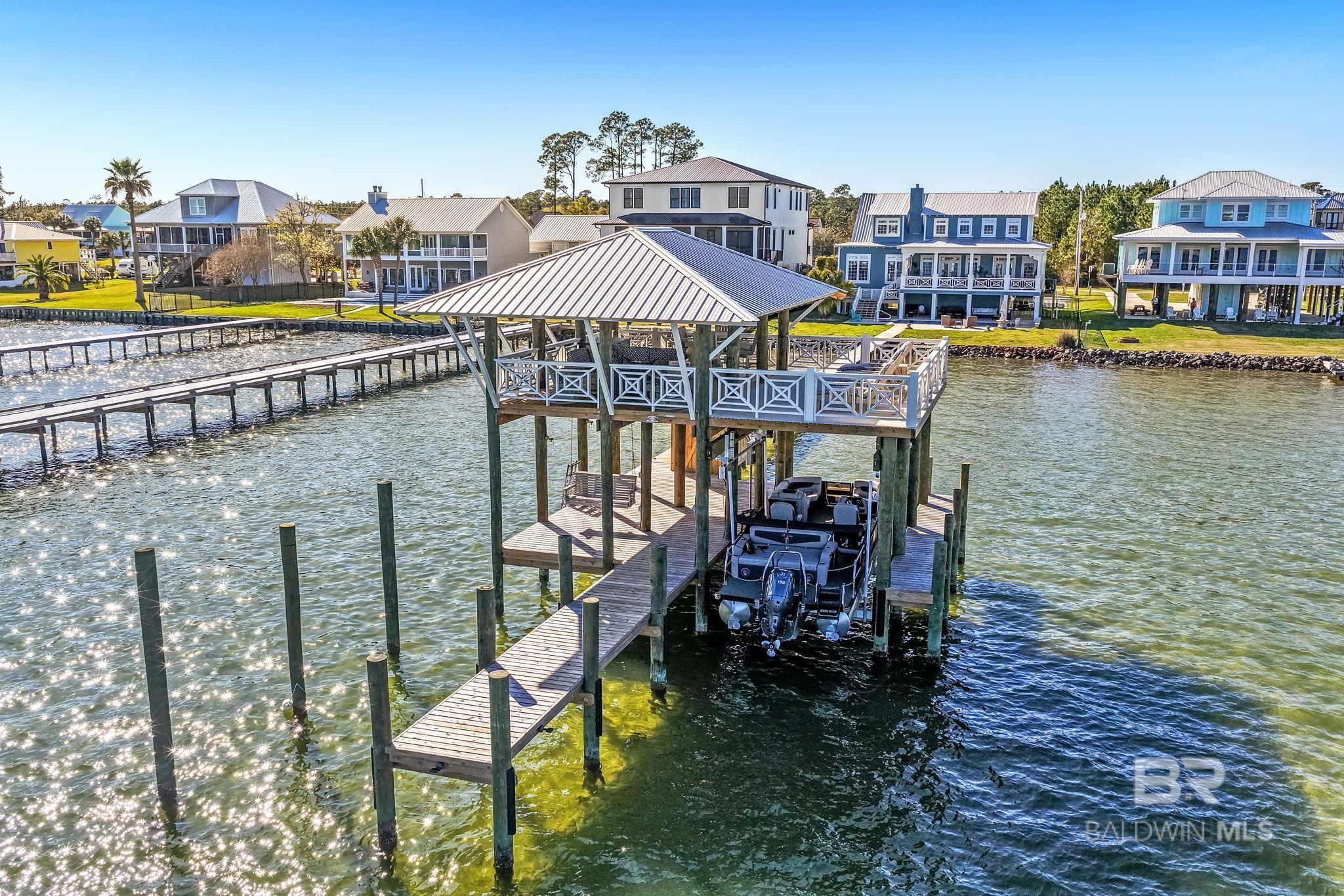 RARE BIG WATER SHORT-TERM RENTAL APPROVAL GUEST HOUSE CUSTOM PIER HEATED POOL Big-water home near Pirates Cove approved for short-term rentals, Perfectly positioned on the open waters of Arnica Bay in the Josephine boating community, this exceptional property combines breathtaking bay views, a custom two-level pier, heated saltwater pool, and a detached guest cottage creating the ultimate coastal compound for boating, entertaining, and hosting guests. THE PIER A TRUE DESTINATION ON THE BAY The custom-designed two-level pier is the centerpiece of the property. The covered upper deck captures steady bay breezes and panoramic water views Covered upper entertaining deck Two boat slips Boat lift Second slip for larger vessels Direct boating access to Pirates Cove Marina, Robinson Island, Perdido Pass, and the Gulf of Mexico MAIN RESIDENCE Designed to maximize views and comfortable coastal living. Spacious primary suite with private sitting room Water-view flex space currently used as an office Open living, dining, kitchen, and breakfast nook Built-in storage throughout Elevator Upper Level Three additional bedrooms Large second living / media room Full bath with room to add another Attic storage RESORT-STYLE OUTDOOR LIVING Large heated & cooled saltwater pool with travertine patio Expansive covered entertaining area under the home Waterside back porch overlooking Arnica Bay Classic Southern Living-style front porch Hot-water outdoor shower Irrigated sodded yard DETACHED GUEST COTTAGE Charming 2 bedroom / 1.5 bath guest cottage (approx. 940 sq ft) ideal for visiting guests, extended family, or additional short-term rental income potential. PRIME BOATING LOCATION Located in the heart of the beloved Josephine waterfront community, just a short walk or golf cart ride to: Pirates Cove Marina & Restaurant BIG WATER SHORT-TERM RENTAL APPROVAL GUEST HOUSE CUSTOM PIER HEATED POOL Buyer to verify all information during due diligence.
