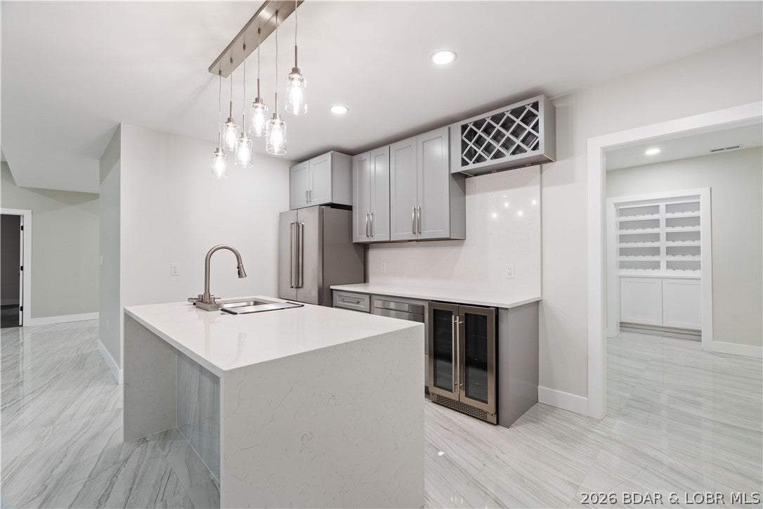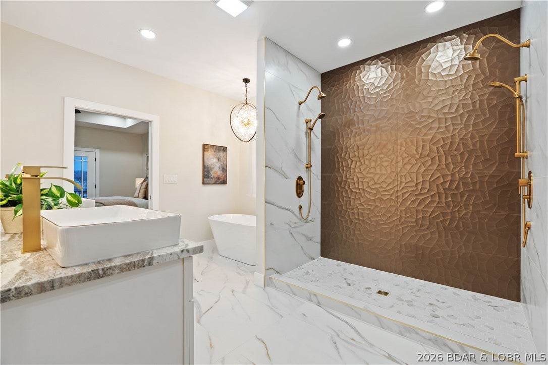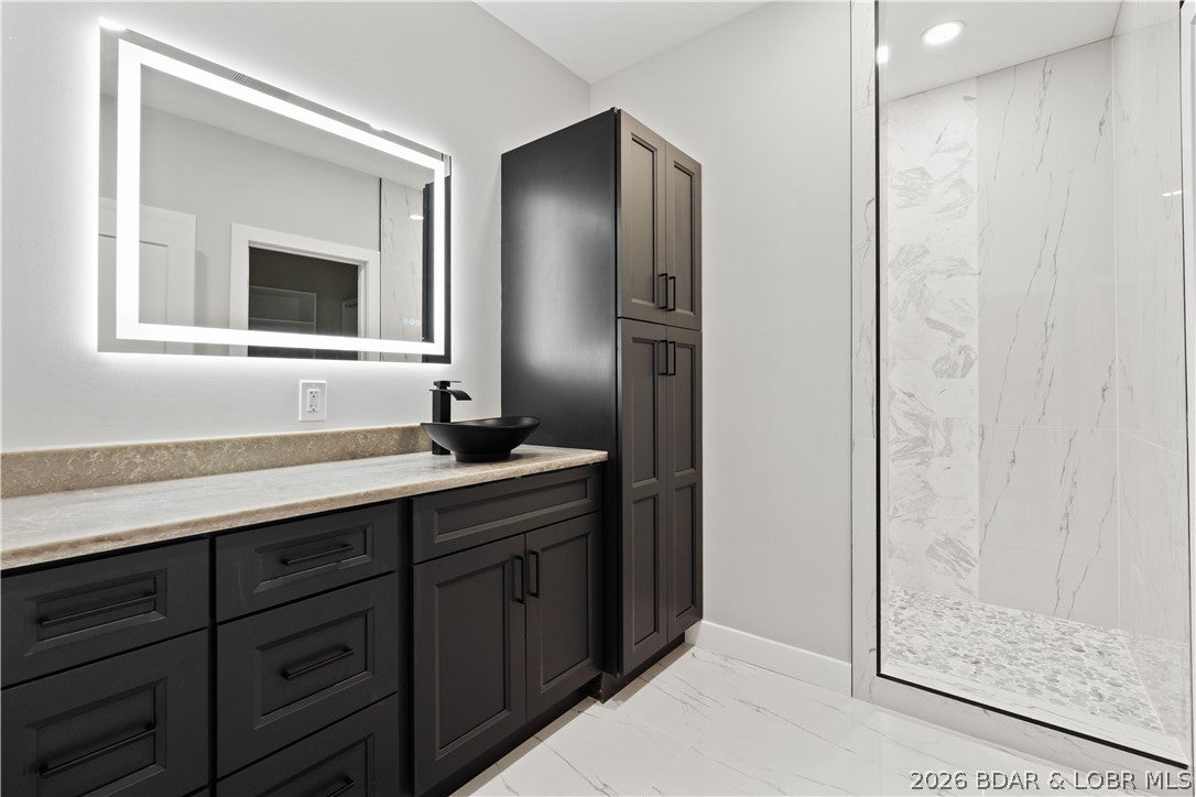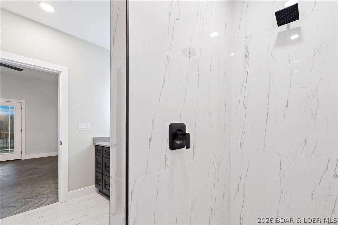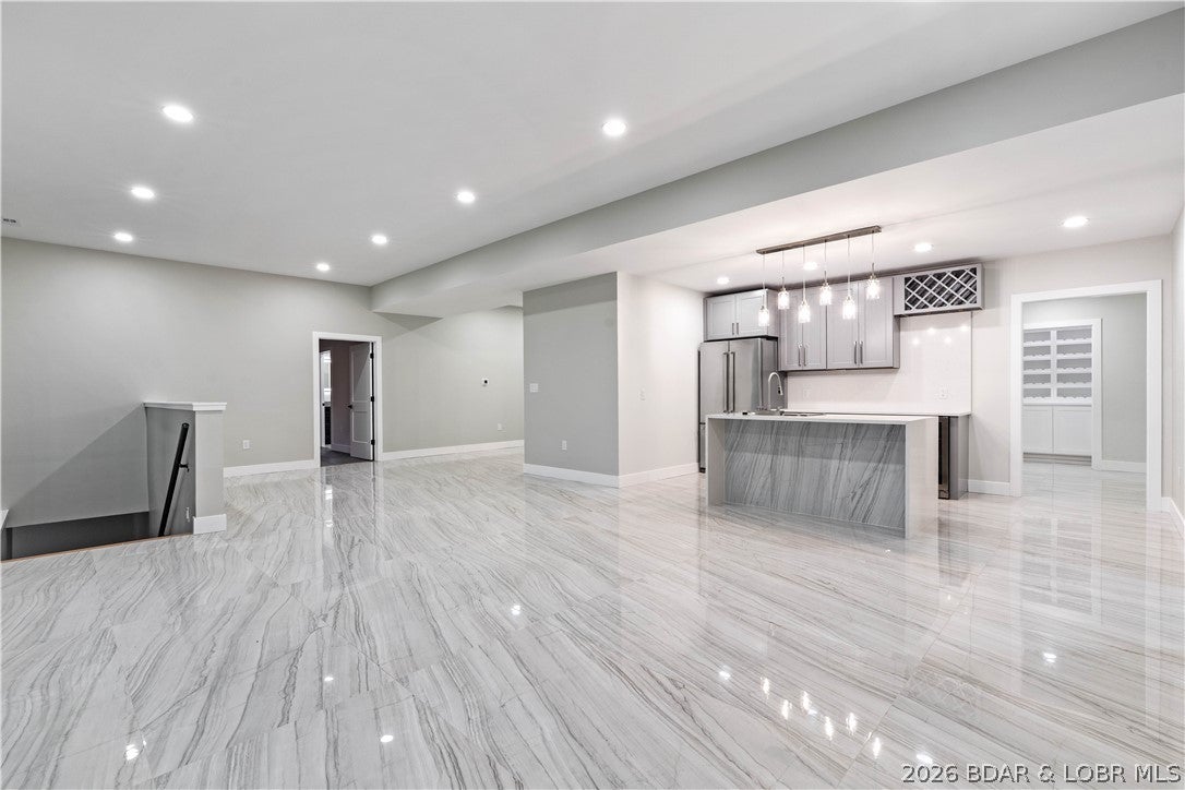 Stunning brand-new lakefront home offering the ultimate in luxury living. Grand entry welcomes you with soaring ceilings & a wall of windows with breathtaking views. The great room flows seamlessly into a gourmet kitchen w/ high-end appliances, formal dining, & a kitchen nook leading to expansive concrete decks. The lakeside primary suite features a spa-like bath, large walk-in closet, & access to the laundry room. The main level offers an additional lakeside suite & a third en-suite bedroom. Lower level includes a family room, three additional bedrooms (one Suite), 1/2 bathrm, a bonus room w/ custom wine cellar, second laundry, & ample storage. The pool room w/ bar, full bath, & storage opens directly to the 13x27 pool & large deck area. Dock featuring a 16x50 slip, 12x36 slip, PWC slip, & a filled-in 12x50 slip easily convertible for a performance boat. Oversized 3-car garage plus additional parking, 10 golf cart path w/ turnaround at the waters edge, deep-water cove, city water & sewer, & quick access to the main channel & amenities. Ideal as a luxury rental or executive retreat (see attched projections). Optional second-tier Lot 46 availableperfect for a guest home/man cave.