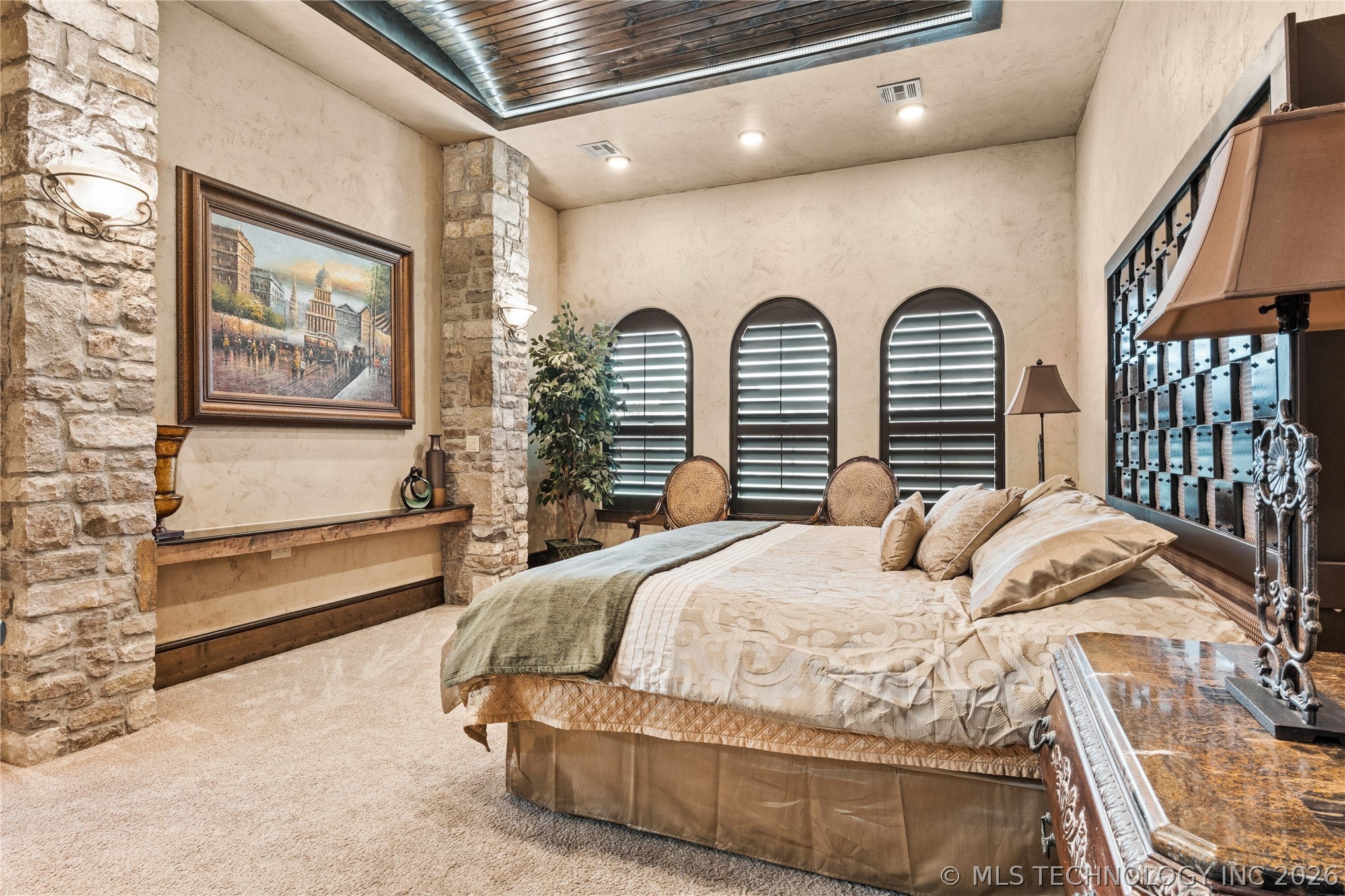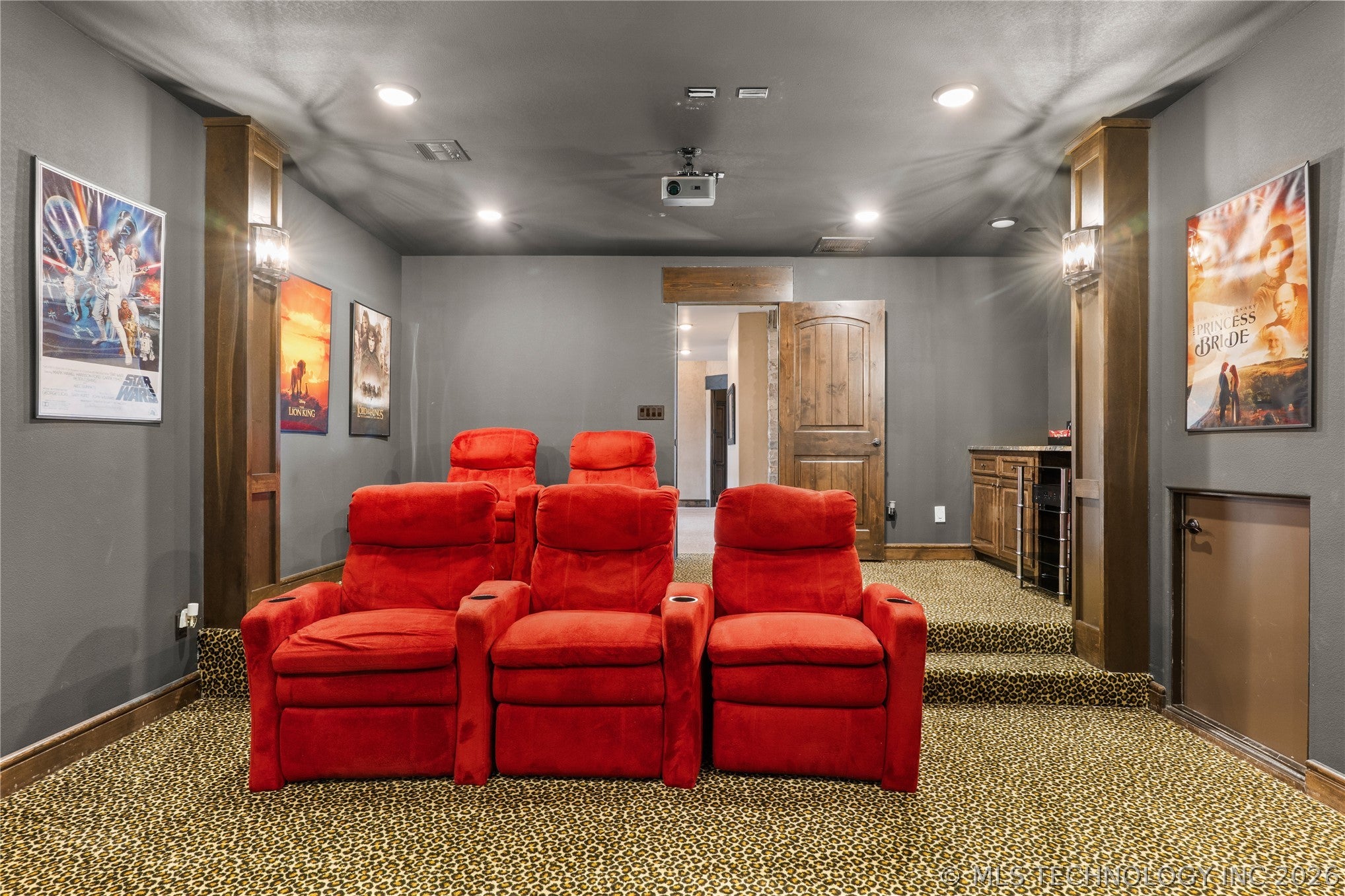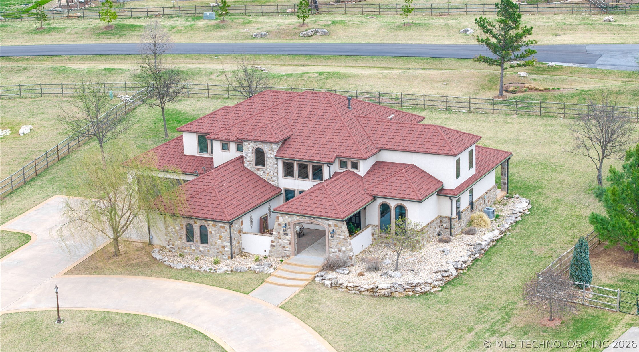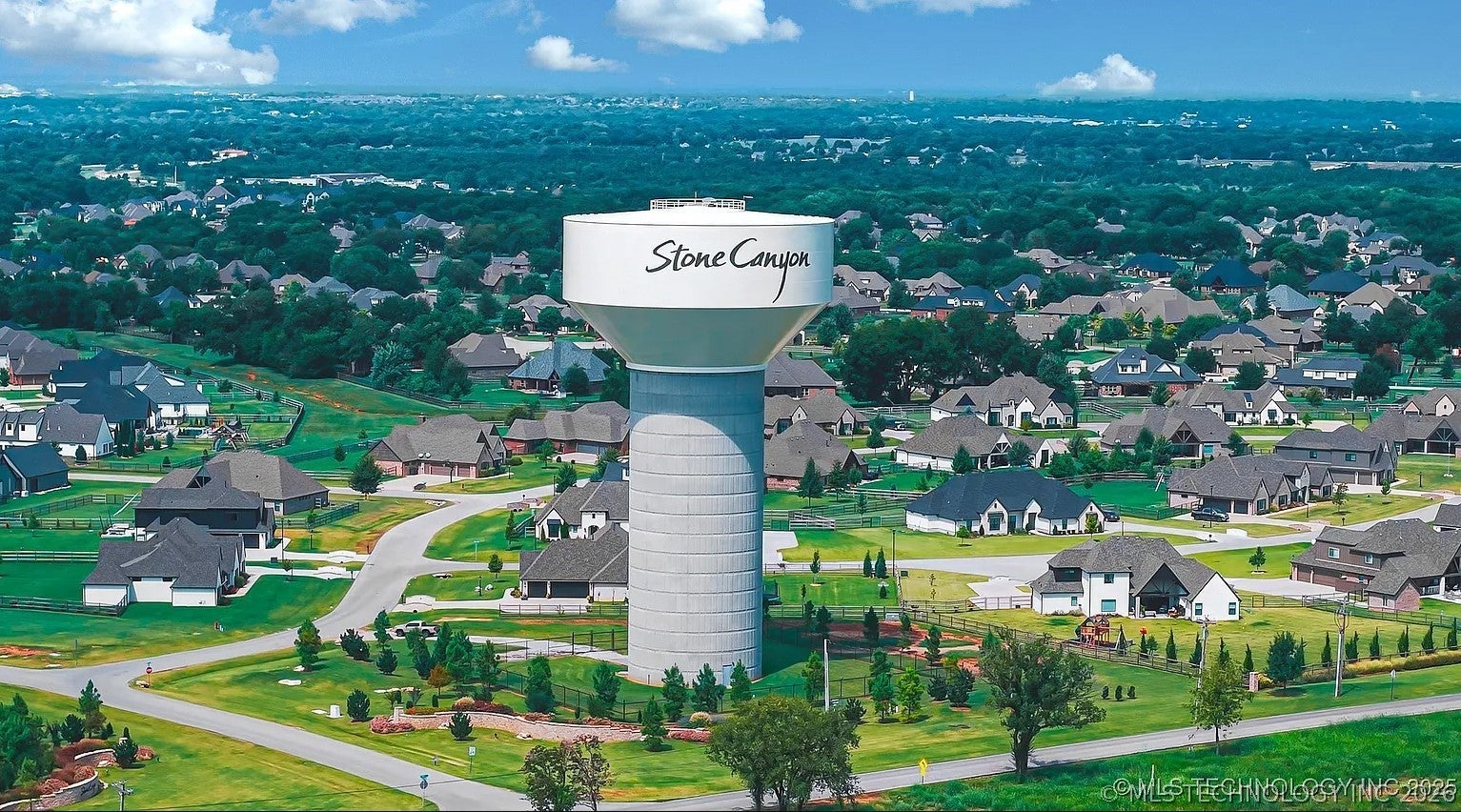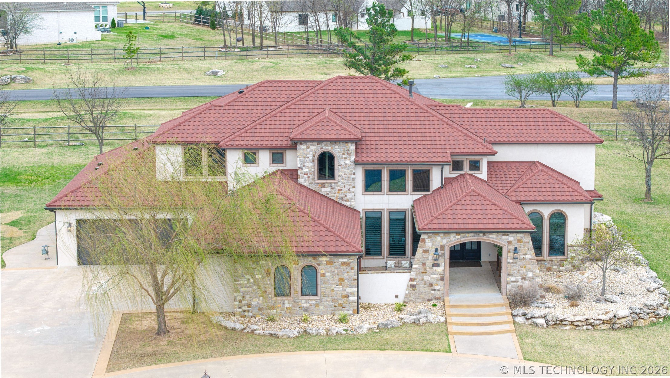 Experience the pinnacle of Mediterranean luxury in the exclusive, gated Highland Pointe of Stone Canyon. This Mission-style masterpiece commands a sprawling lot and features a signature tile roof, authentic stone masonry, and grand architectural arches. The interior reveals a sophisticated open-concept floor plan defined by 22-foot vaulted ceilings, rich hardwoods, and a gourmet chefs kitchen equipped with expansive granite countertops and professional-grade appliances. The primary suite offers a resort-style sanctuary with a spa-inspired bath including a hot rock steam sauna and double shower with body sprays and rain heads. There is a secondary downstairs suite complete w its own living room and bathroom, perfect for generational living options. An executive office, movie theater with snack bar, fitness room and another living area anchoring the bedrooms upstairs allows for function and fun! Residents enjoy elite community amenities including a gated entrance, the Patriot Golf Club (membership required), a 100-acre private lake, and scenic hiking trails, all within the top-rated Owasso school district.