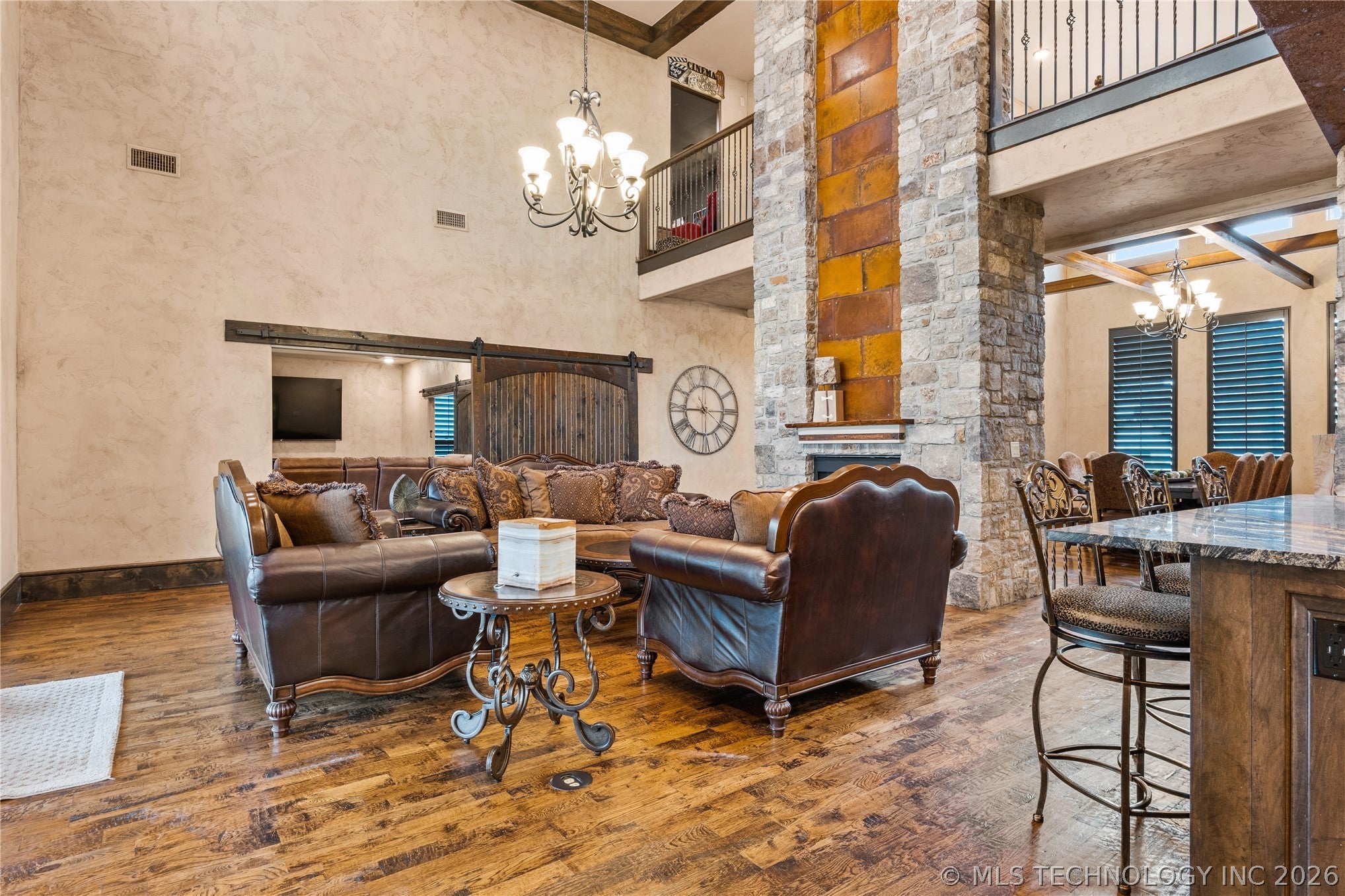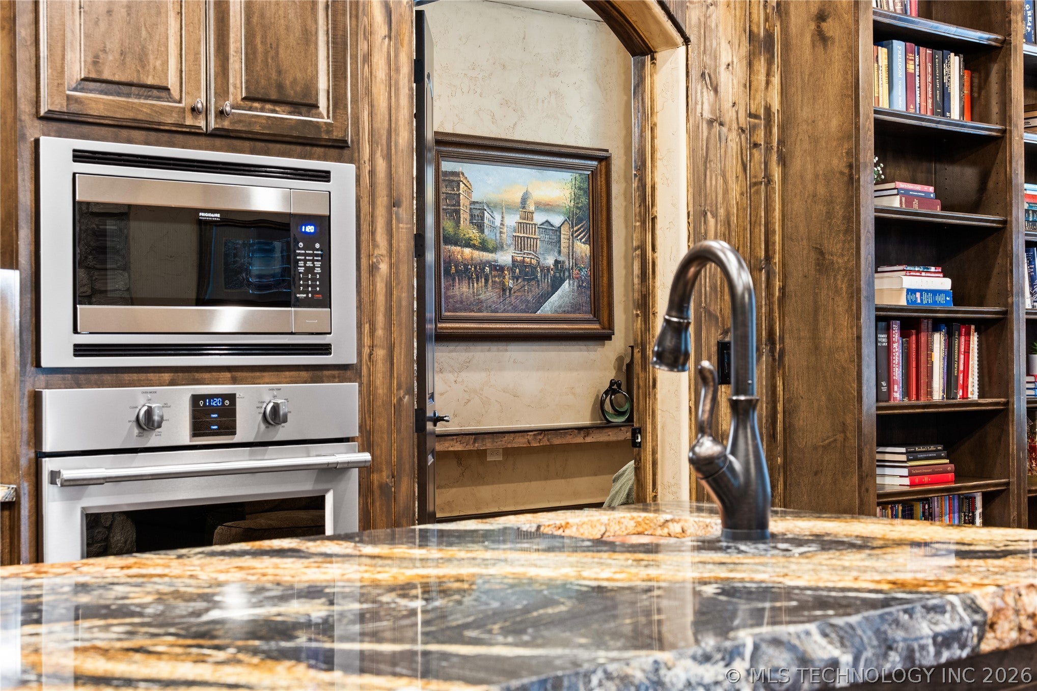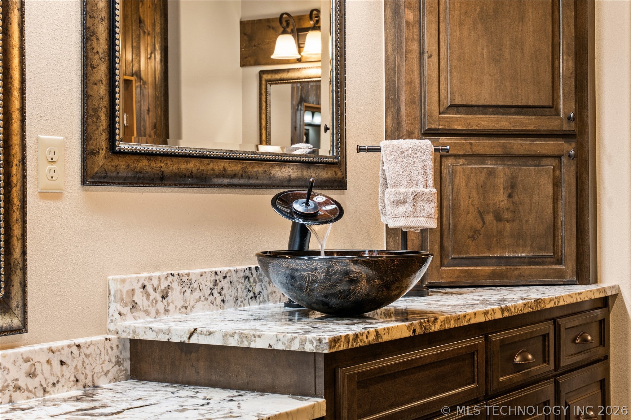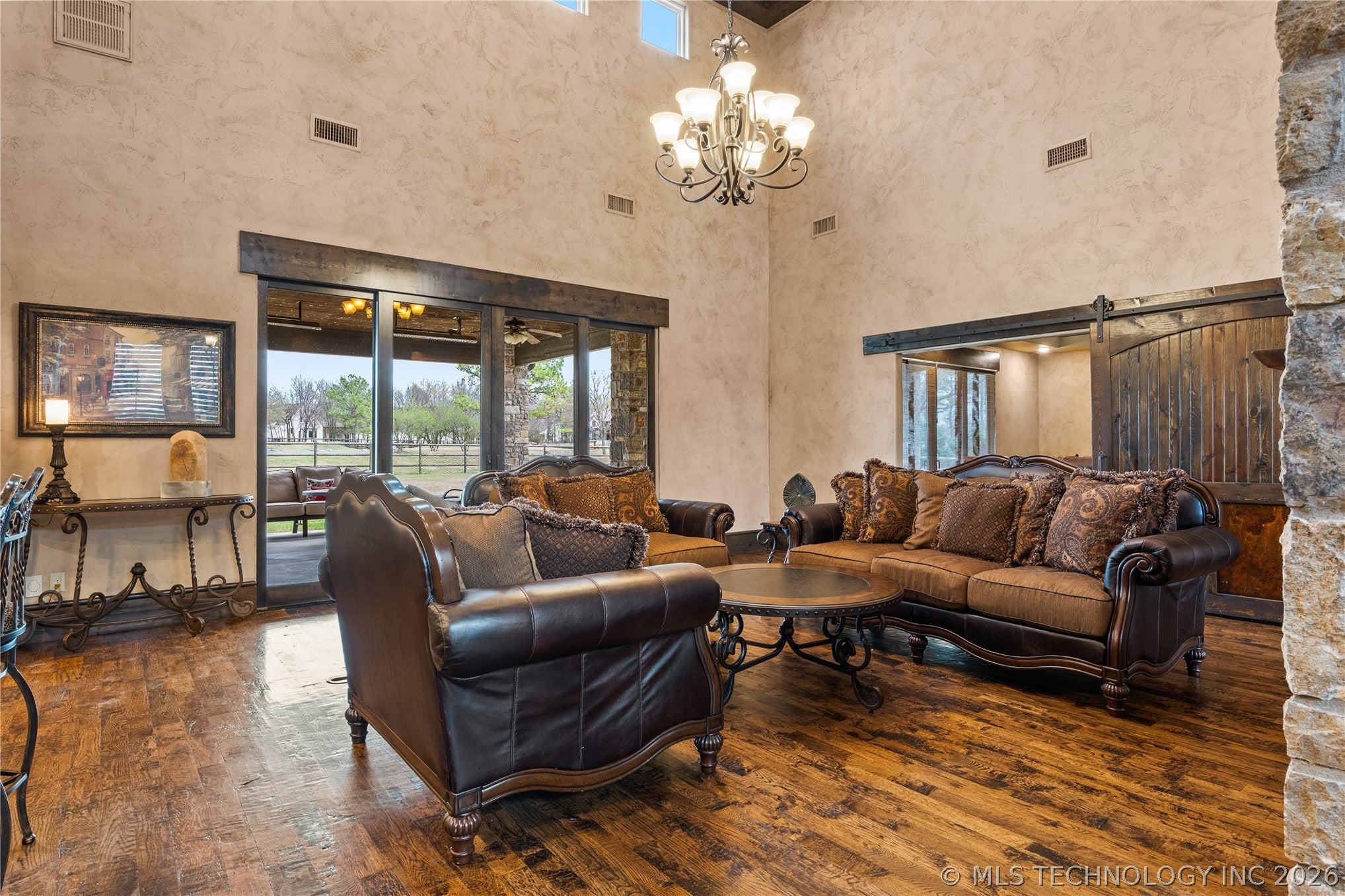 Experience the pinnacle of Mediterranean luxury in the exclusive, gated Highland Pointe of Stone Canyon. This Mission-style masterpiece commands a sprawling lot and features a signature tile roof, authentic stone masonry, and grand architectural arches. The interior reveals a sophisticated open-concept floor plan defined by 22-foot vaulted ceilings, rich hardwoods, and a gourmet chefs kitchen equipped with expansive granite countertops and professional-grade appliances. The primary suite offers a resort-style sanctuary with a spa-inspired bath including a hot rock steam sauna and double shower with body sprays and rain heads. There is a secondary downstairs suite complete w its own living room and bathroom, perfect for generational living options. An executive office, movie theater with snack bar, fitness room and another living area anchoring the bedrooms upstairs allows for function and fun! Residents enjoy elite community amenities including a gated entrance, the Patriot Golf Club (membership required), a 100-acre private lake, and scenic hiking trails, all within the top-rated Owasso school district.