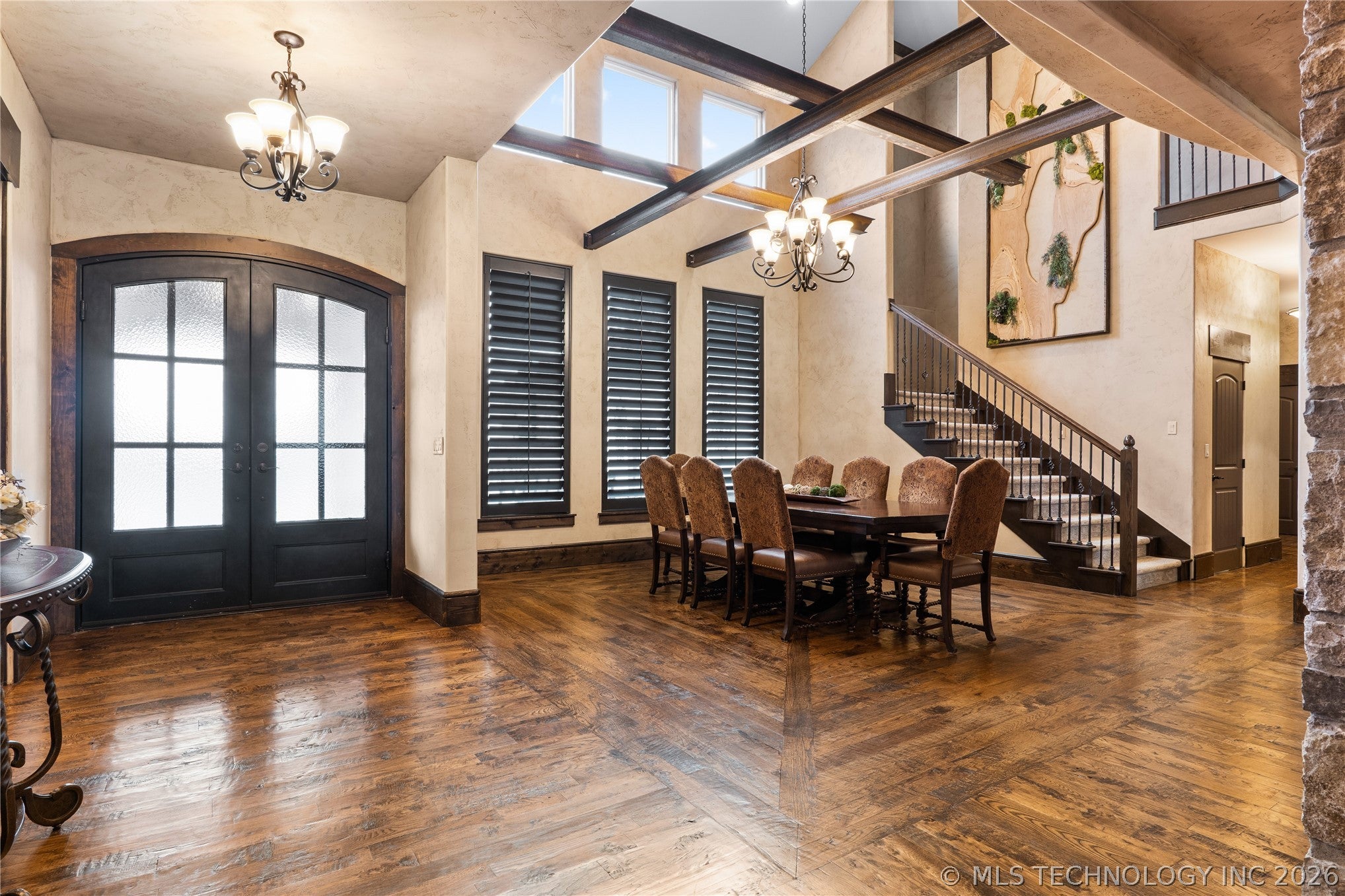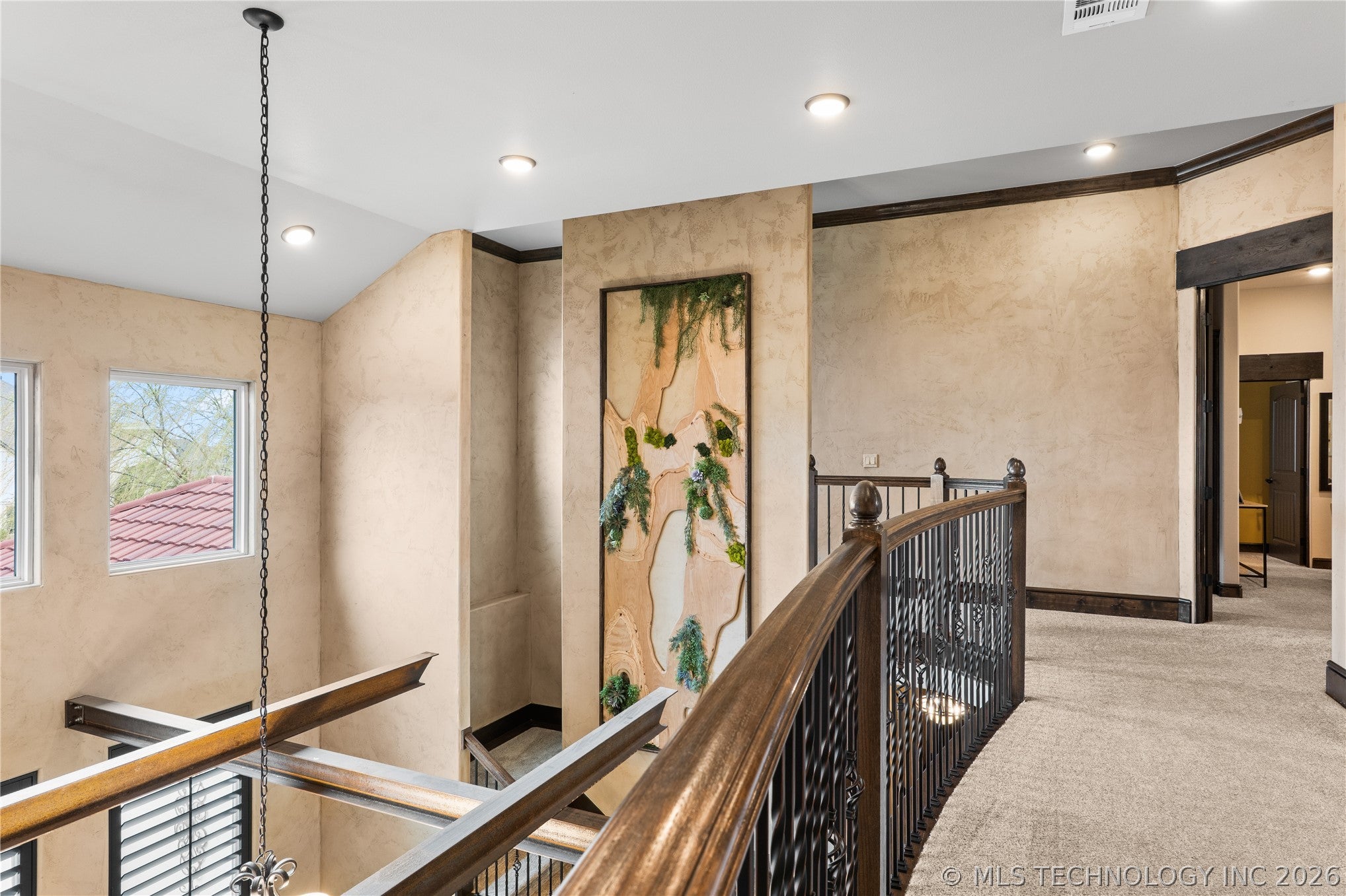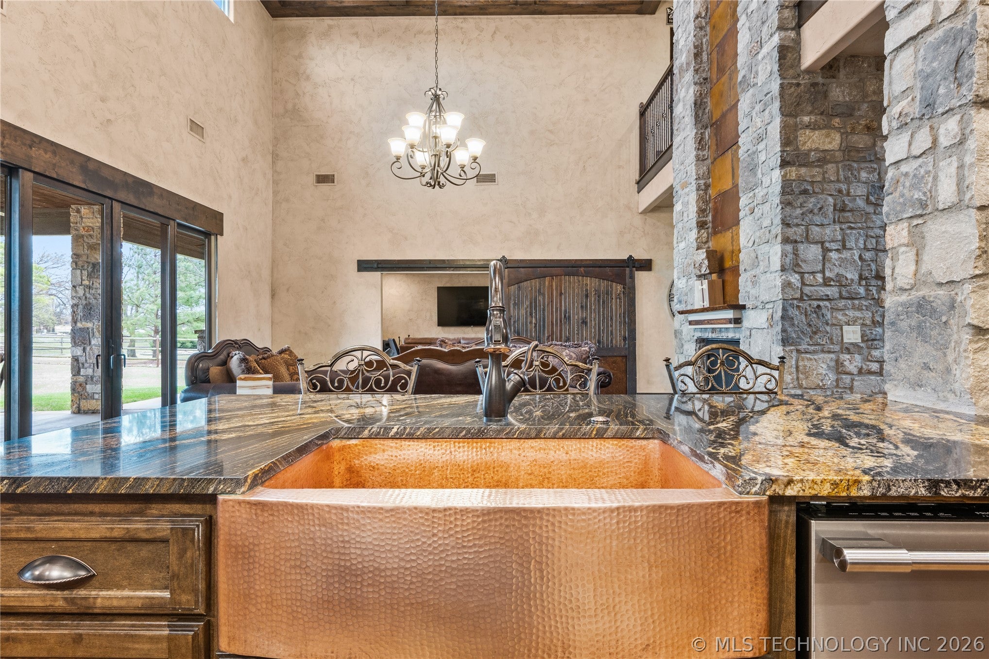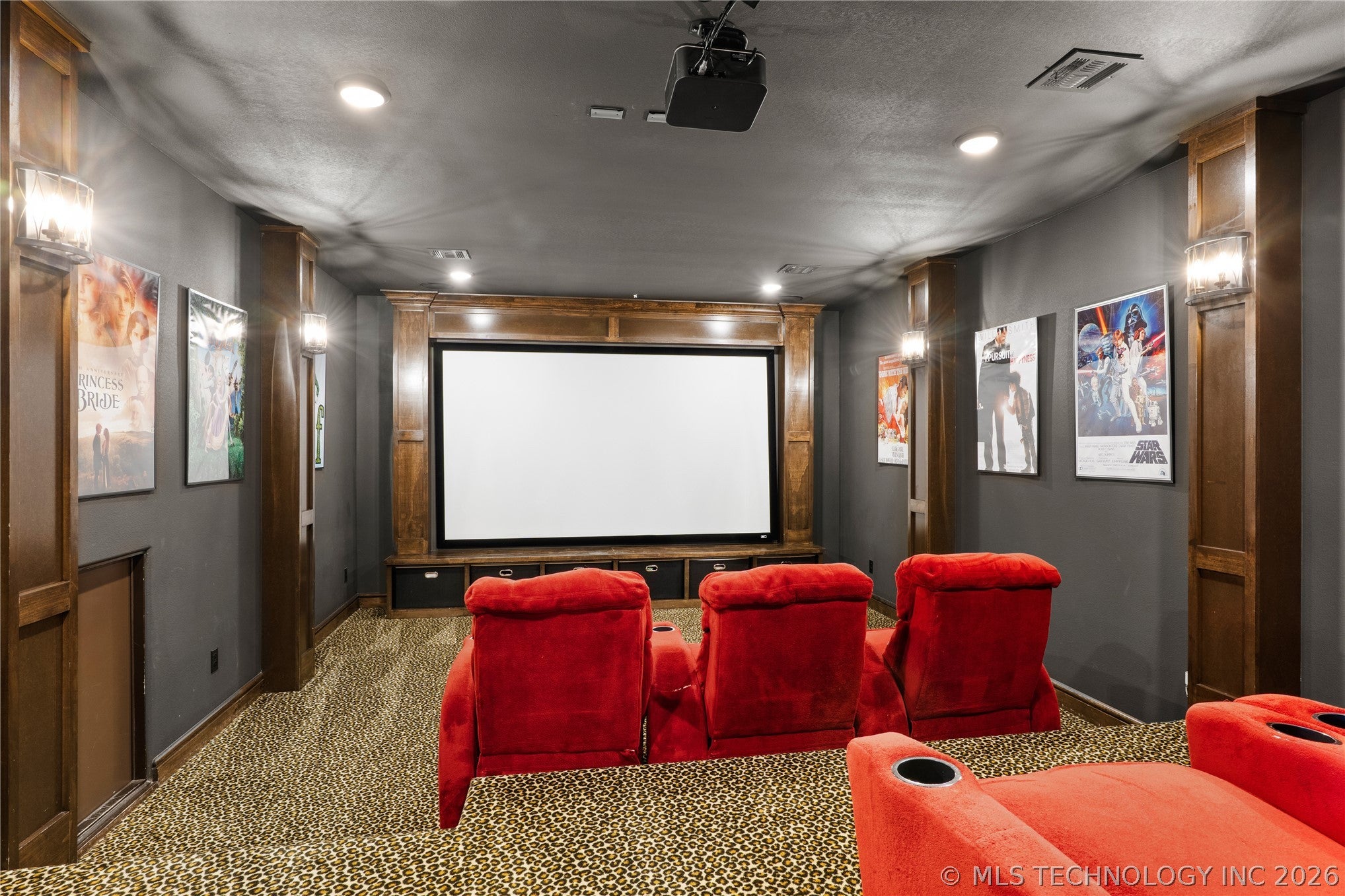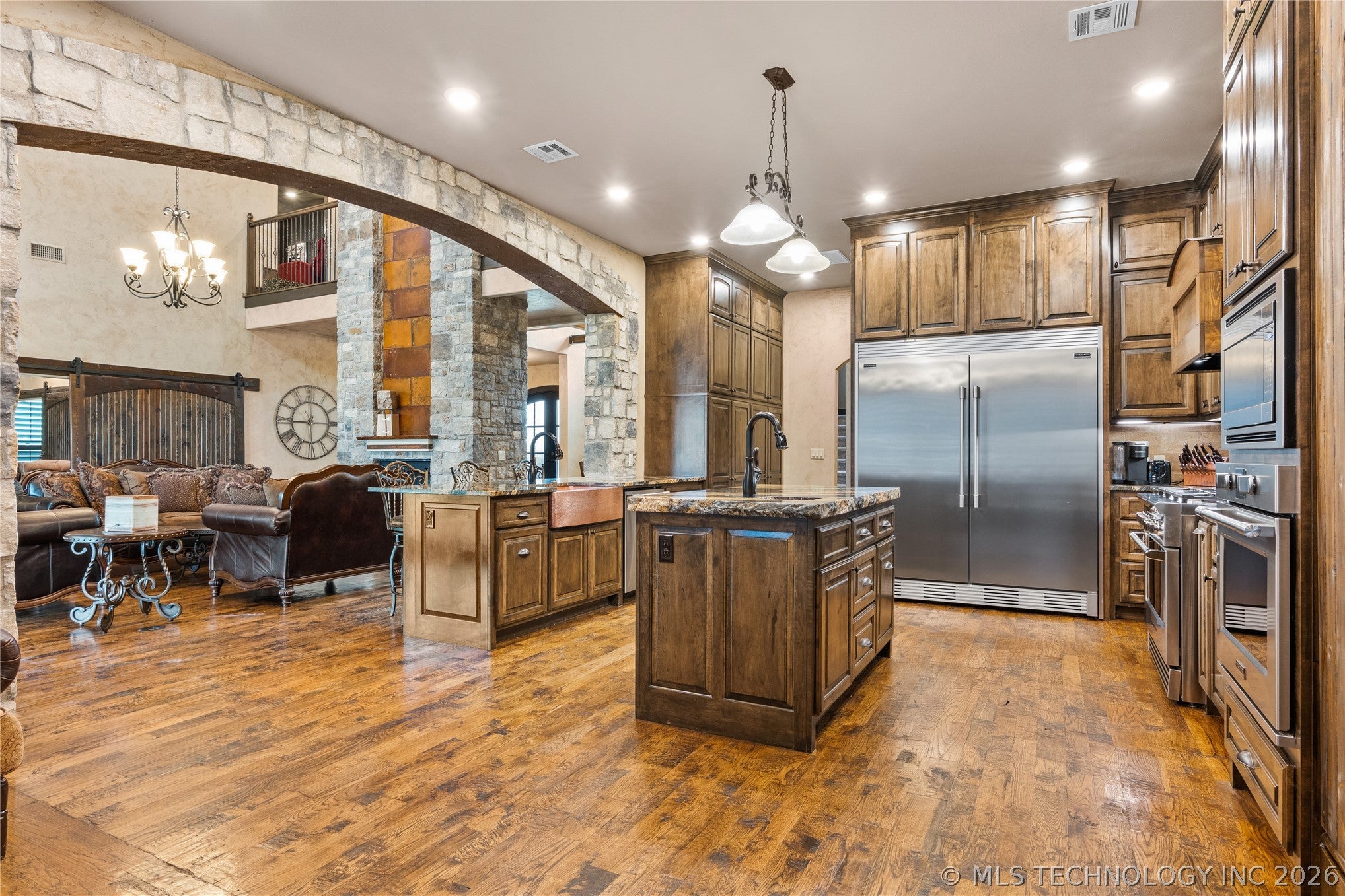 Experience the pinnacle of Mediterranean luxury in the exclusive, gated Highland Pointe of Stone Canyon. This Mission-style masterpiece commands a sprawling lot and features a signature tile roof, authentic stone masonry, and grand architectural arches. The interior reveals a sophisticated open-concept floor plan defined by 22-foot vaulted ceilings, rich hardwoods, and a gourmet chefs kitchen equipped with expansive granite countertops and professional-grade appliances. The primary suite offers a resort-style sanctuary with a spa-inspired bath including a hot rock steam sauna and double shower with body sprays and rain heads. There is a secondary downstairs suite complete w its own living room and bathroom, perfect for generational living options. An executive office, movie theater with snack bar, fitness room and another living area anchoring the bedrooms upstairs allows for function and fun! Residents enjoy elite community amenities including a gated entrance, the Patriot Golf Club (membership required), a 100-acre private lake, and scenic hiking trails, all within the top-rated Owasso school district.