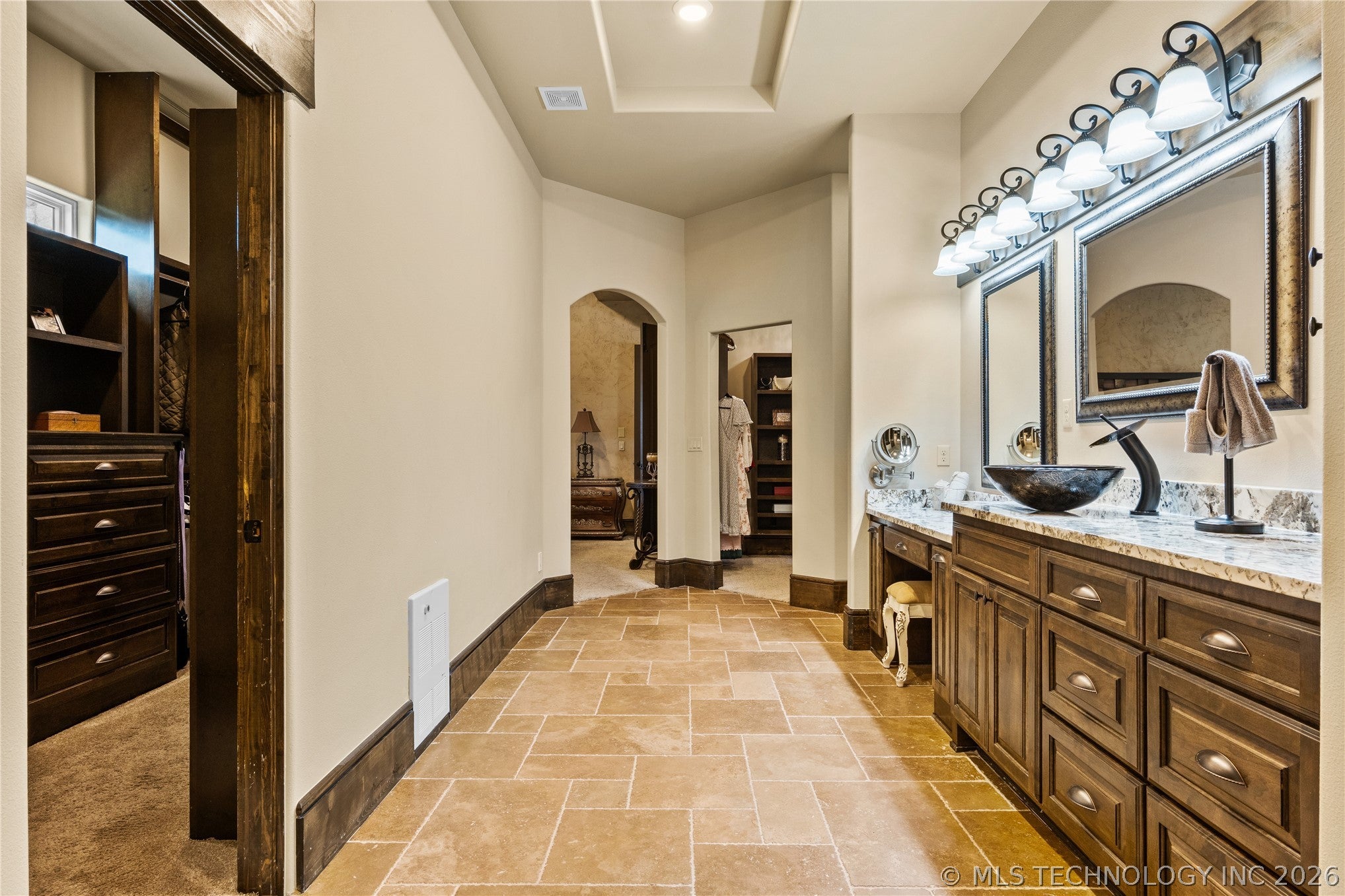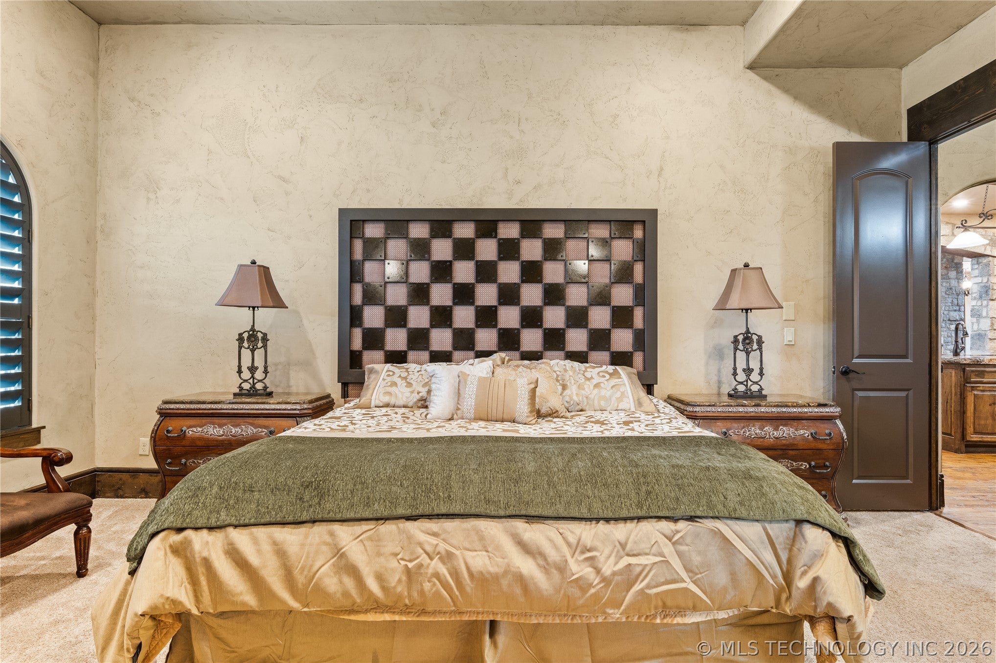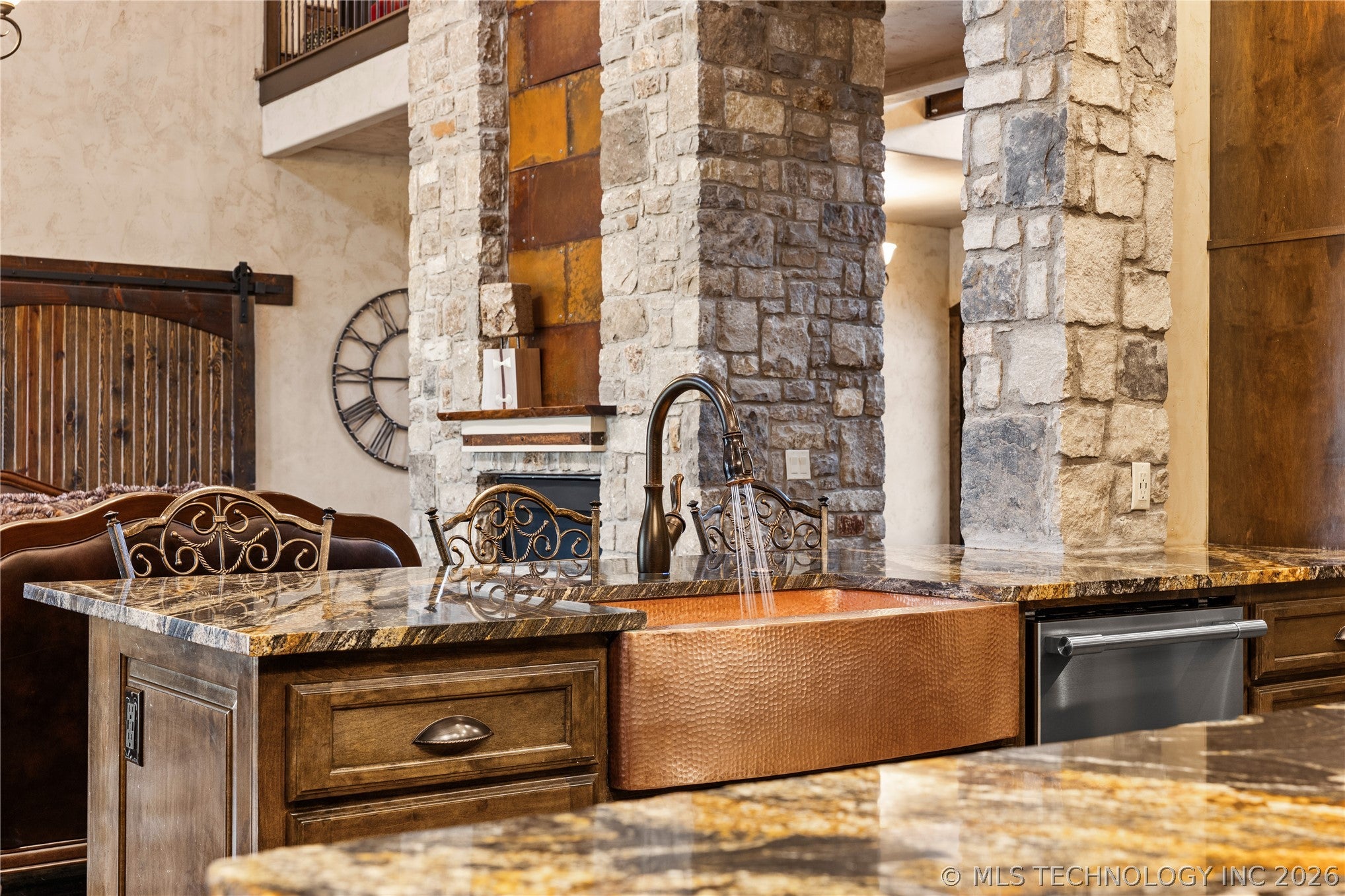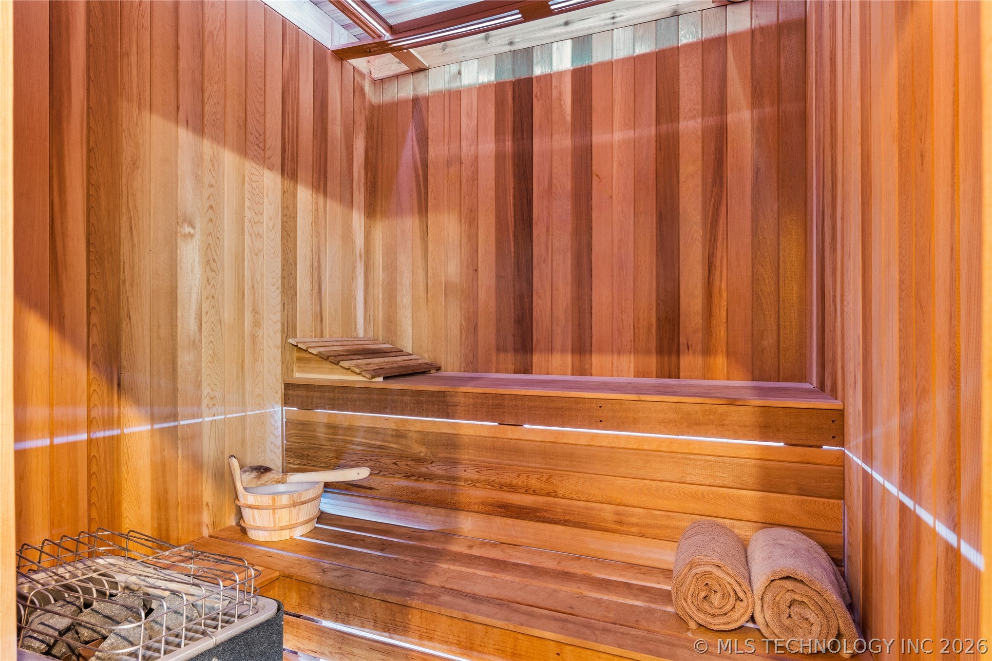 Experience the pinnacle of Mediterranean luxury in the exclusive, gated Highland Pointe of Stone Canyon. This Mission-style masterpiece commands a sprawling lot and features a signature tile roof, authentic stone masonry, and grand architectural arches. The interior reveals a sophisticated open-concept floor plan defined by 22-foot vaulted ceilings, rich hardwoods, and a gourmet chefs kitchen equipped with expansive granite countertops and professional-grade appliances. The primary suite offers a resort-style sanctuary with a spa-inspired bath including a hot rock steam sauna and double shower with body sprays and rain heads. There is a secondary downstairs suite complete w its own living room and bathroom, perfect for generational living options. An executive office, movie theater with snack bar, fitness room and another living area anchoring the bedrooms upstairs allows for function and fun! Residents enjoy elite community amenities including a gated entrance, the Patriot Golf Club (membership required), a 100-acre private lake, and scenic hiking trails, all within the top-rated Owasso school district.