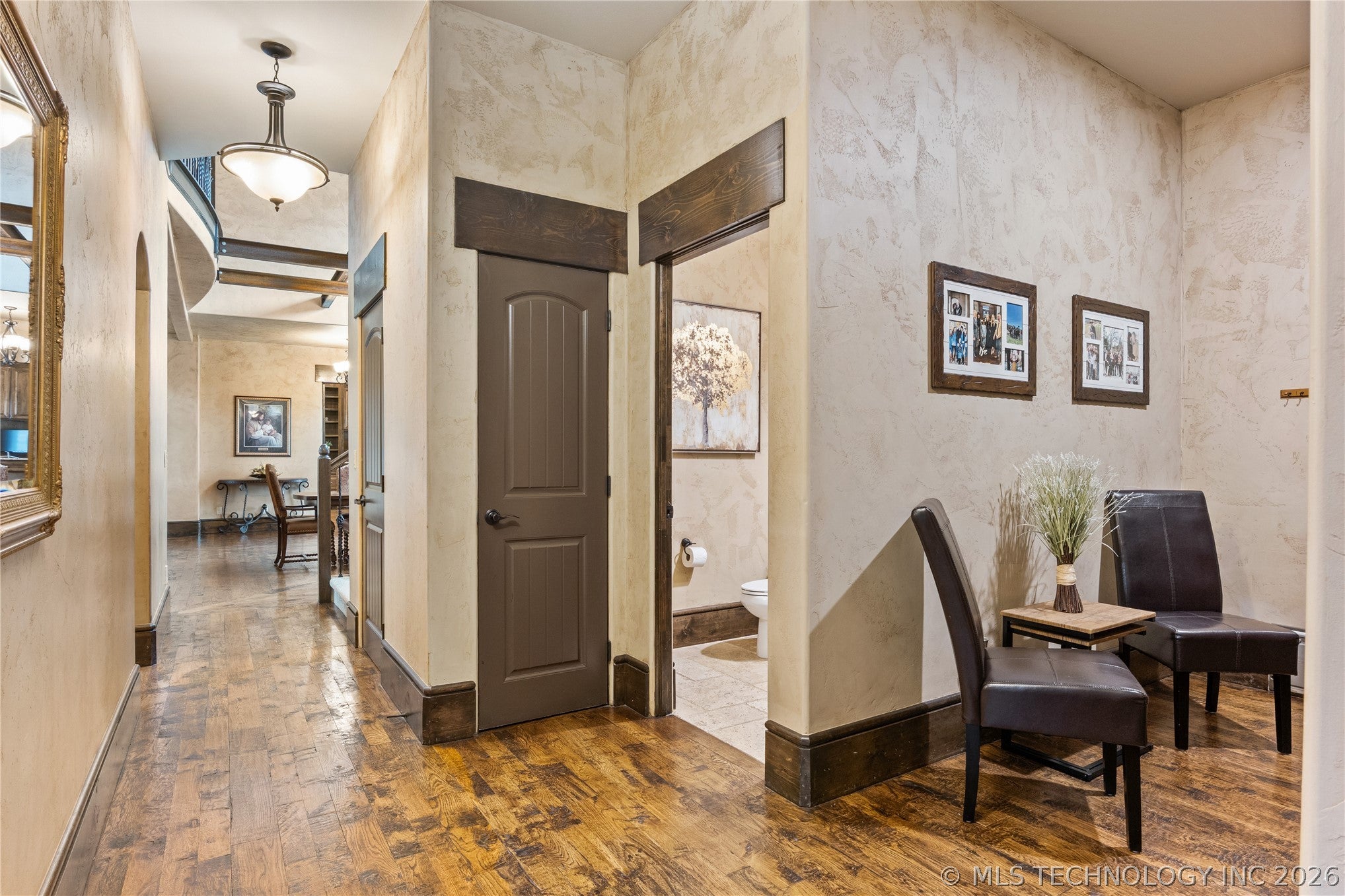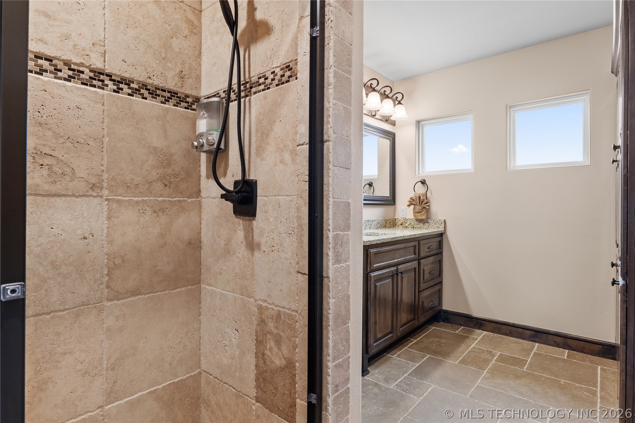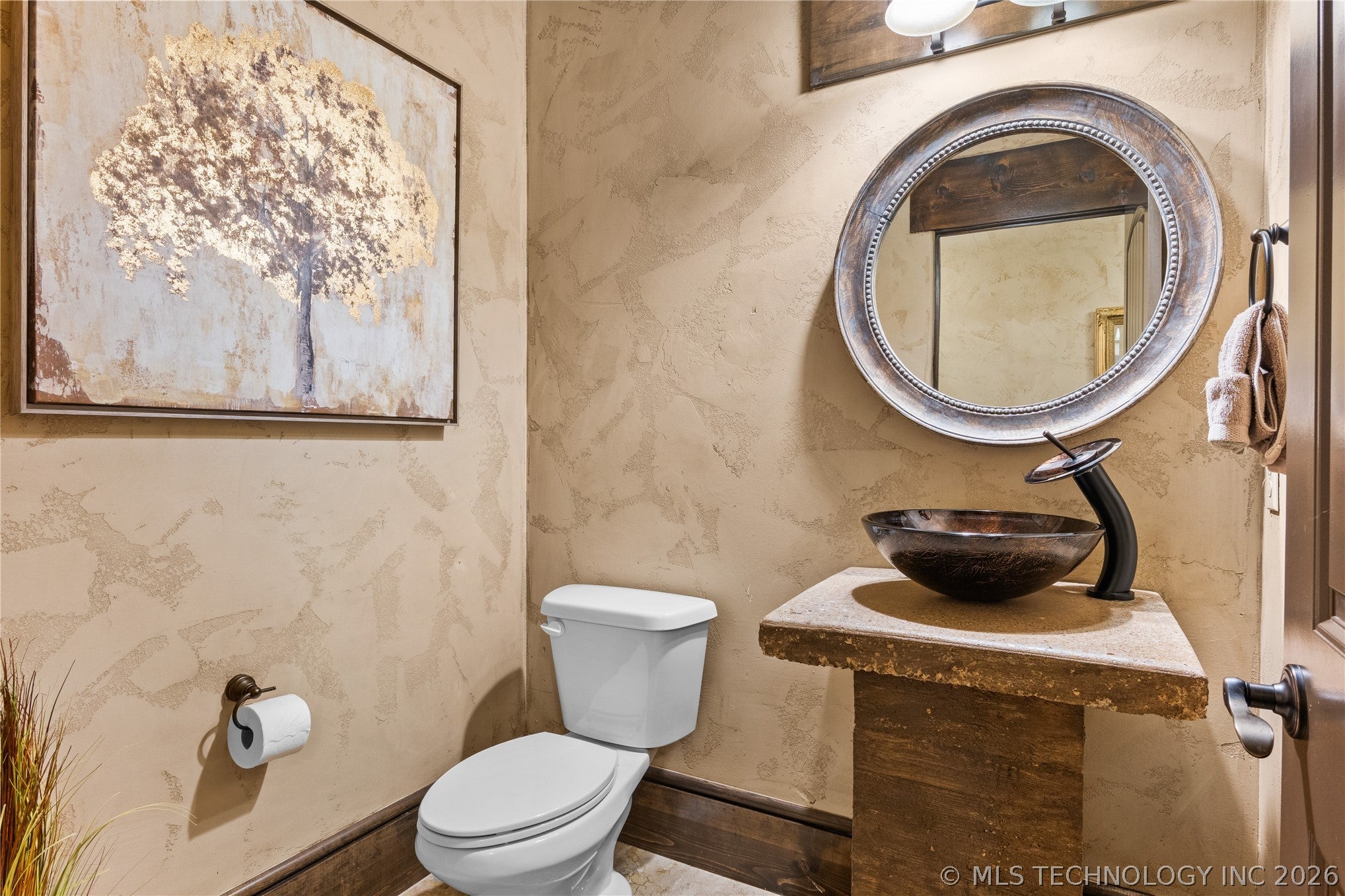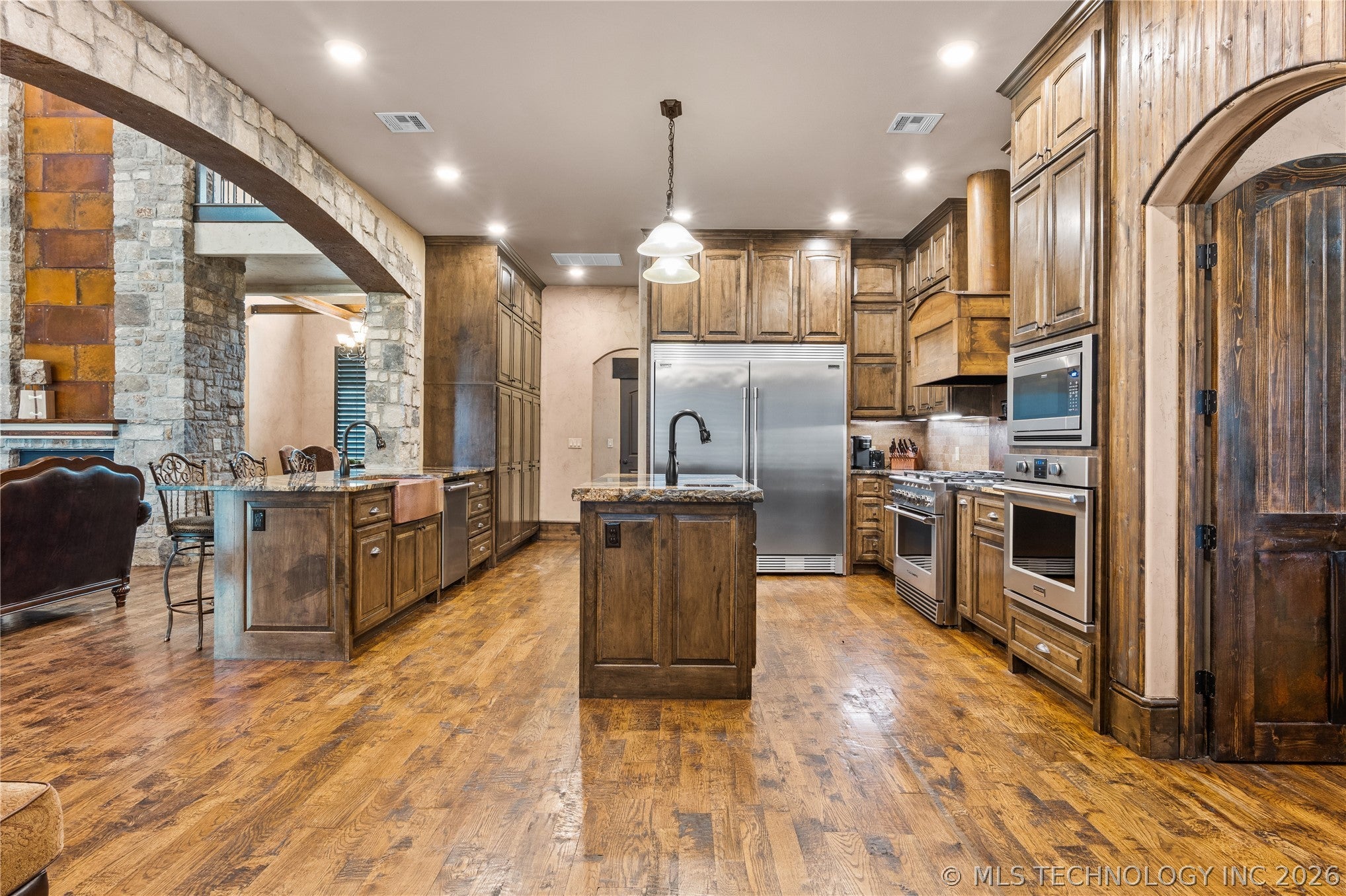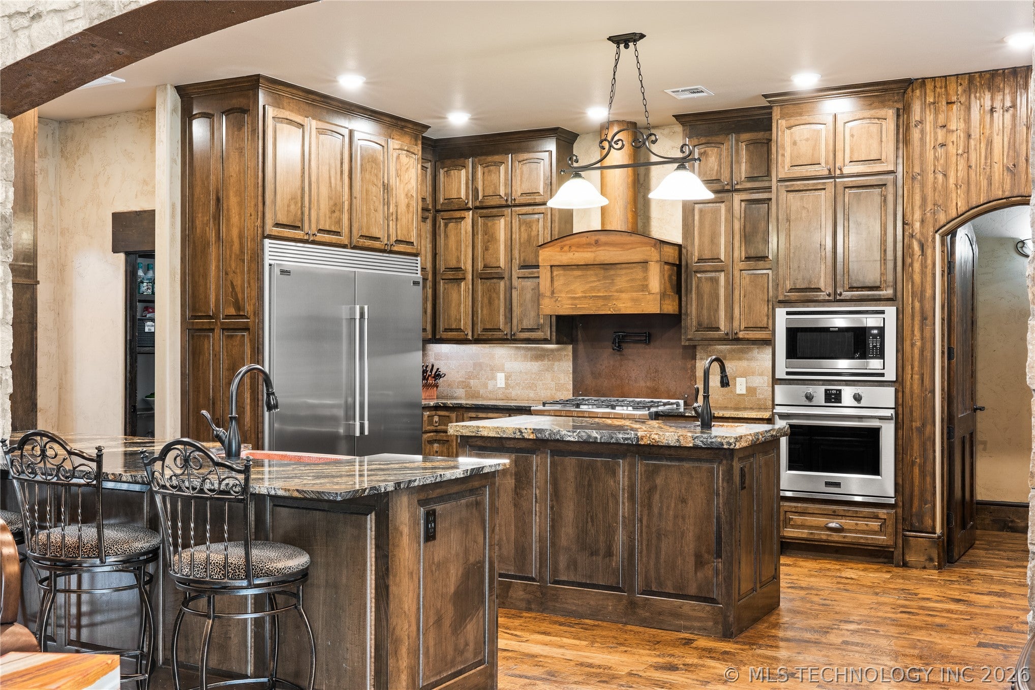 Experience the pinnacle of Mediterranean luxury in the exclusive, gated Highland Pointe of Stone Canyon. This Mission-style masterpiece commands a sprawling lot and features a signature tile roof, authentic stone masonry, and grand architectural arches. The interior reveals a sophisticated open-concept floor plan defined by 22-foot vaulted ceilings, rich hardwoods, and a gourmet chefs kitchen equipped with expansive granite countertops and professional-grade appliances. The primary suite offers a resort-style sanctuary with a spa-inspired bath including a hot rock steam sauna and double shower with body sprays and rain heads. There is a secondary downstairs suite complete w its own living room and bathroom, perfect for generational living options. An executive office, movie theater with snack bar, fitness room and another living area anchoring the bedrooms upstairs allows for function and fun! Residents enjoy elite community amenities including a gated entrance, the Patriot Golf Club (membership required), a 100-acre private lake, and scenic hiking trails, all within the top-rated Owasso school district.