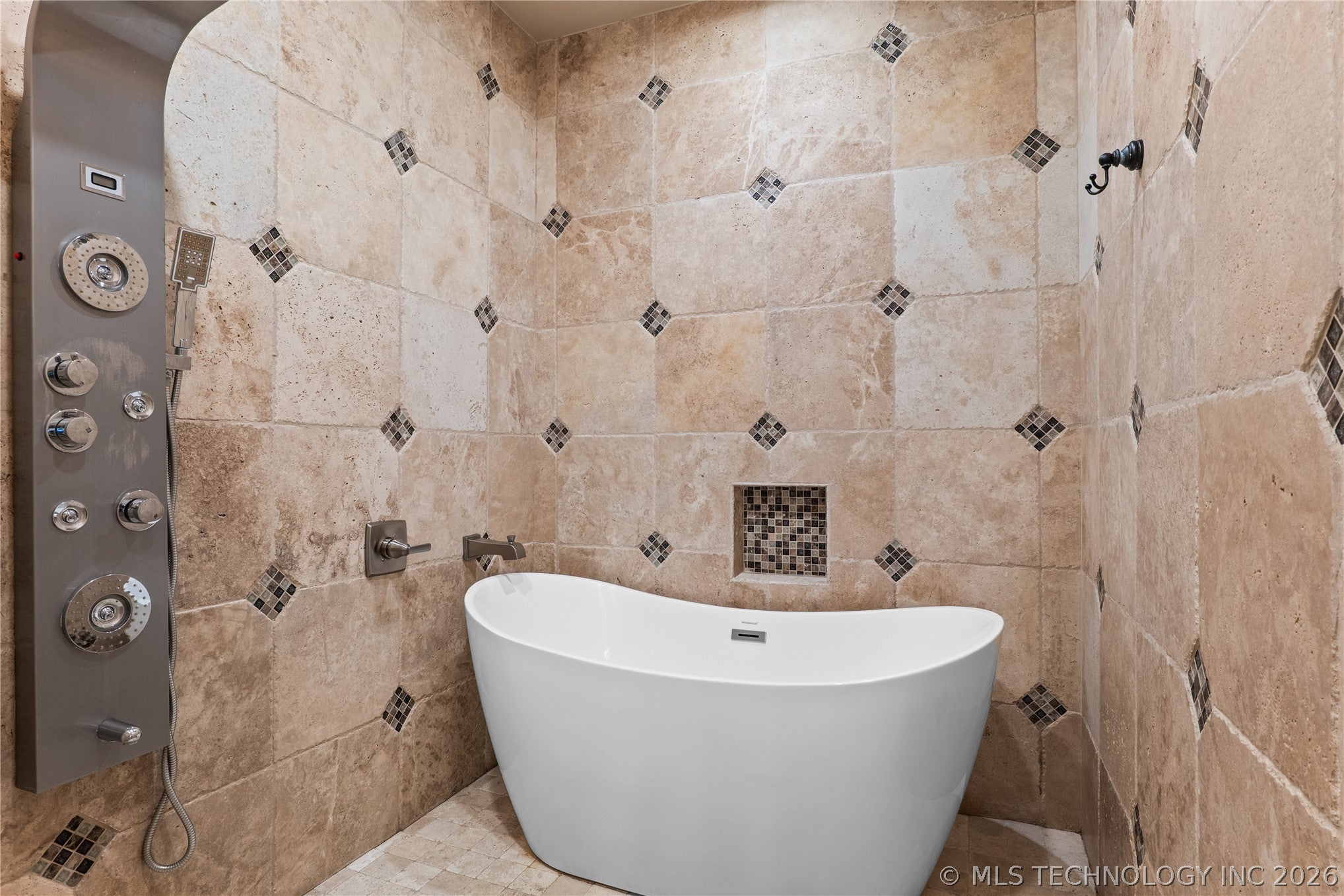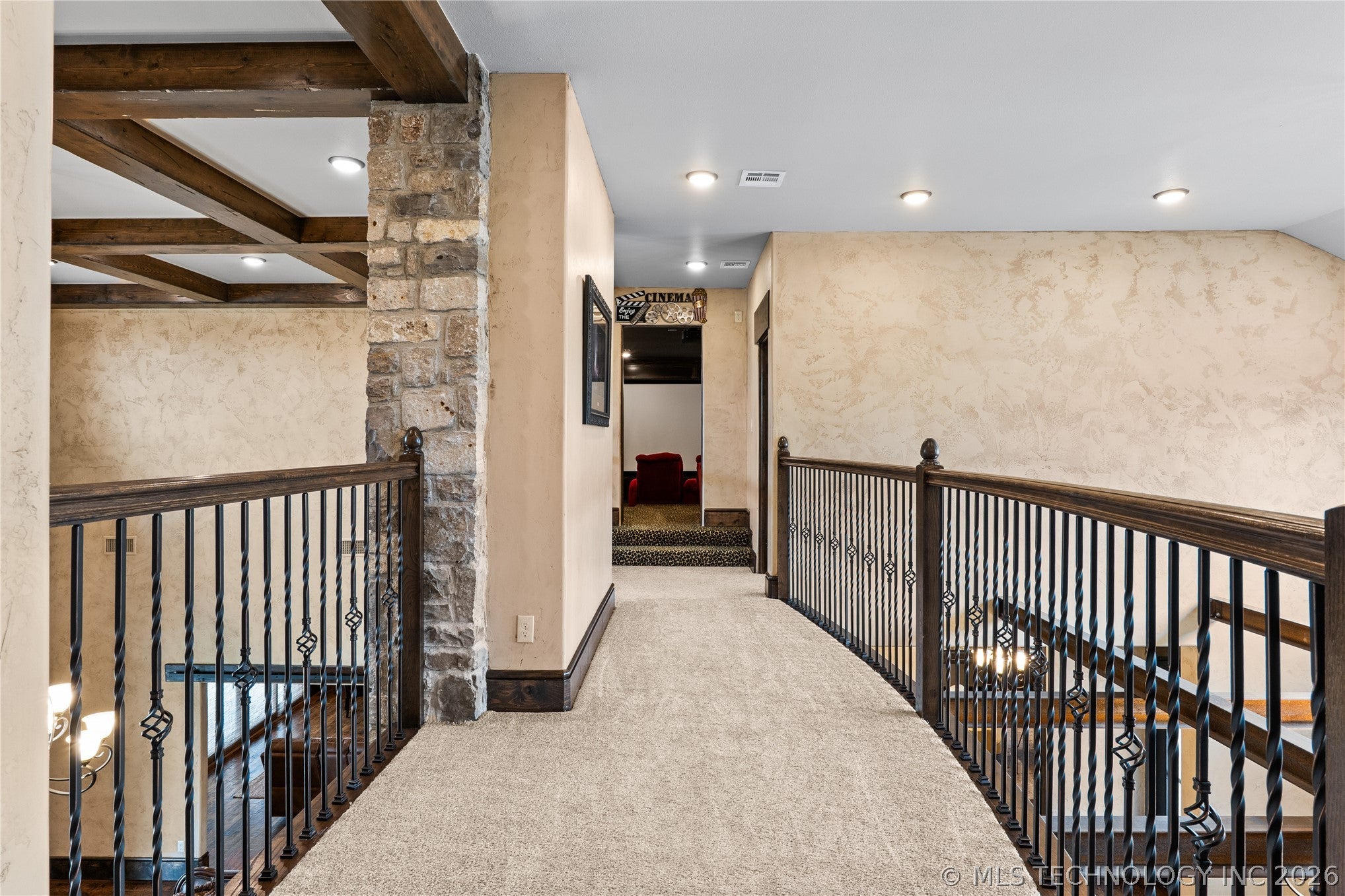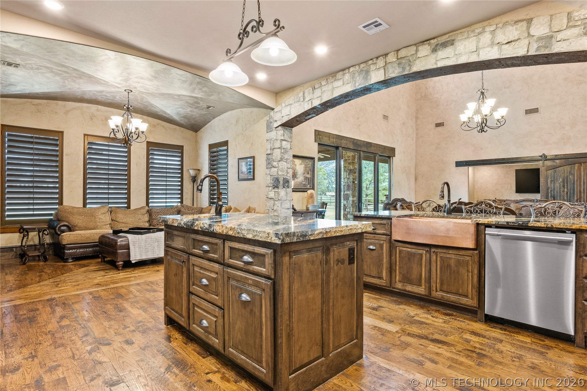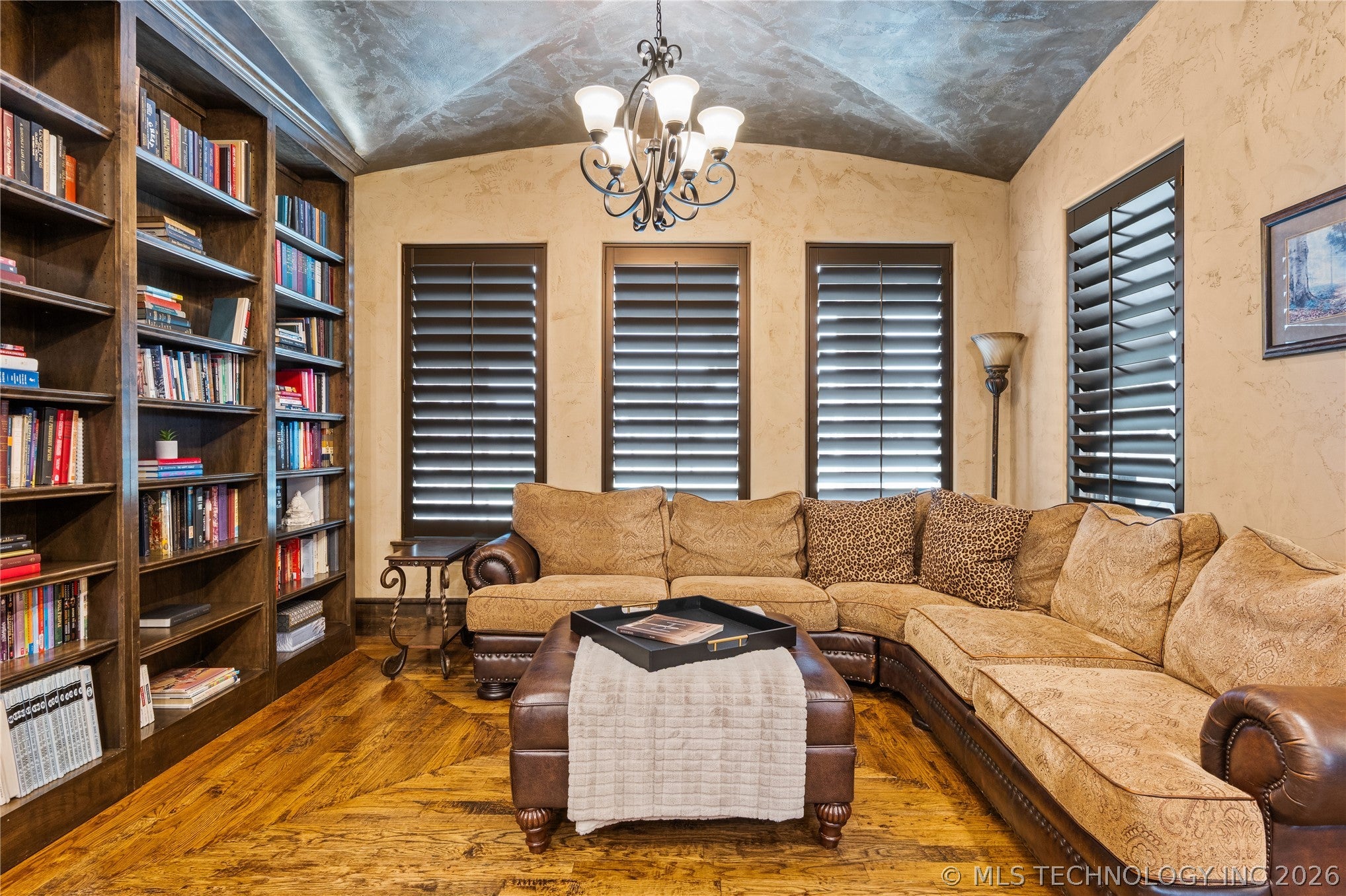 Experience the pinnacle of Mediterranean luxury in the exclusive, gated Highland Pointe of Stone Canyon. This Mission-style masterpiece commands a sprawling lot and features a signature tile roof, authentic stone masonry, and grand architectural arches. The interior reveals a sophisticated open-concept floor plan defined by 22-foot vaulted ceilings, rich hardwoods, and a gourmet chefs kitchen equipped with expansive granite countertops and professional-grade appliances. The primary suite offers a resort-style sanctuary with a spa-inspired bath including a hot rock steam sauna and double shower with body sprays and rain heads. There is a secondary downstairs suite complete w its own living room and bathroom, perfect for generational living options. An executive office, movie theater with snack bar, fitness room and another living area anchoring the bedrooms upstairs allows for function and fun! Residents enjoy elite community amenities including a gated entrance, the Patriot Golf Club (membership required), a 100-acre private lake, and scenic hiking trails, all within the top-rated Owasso school district.