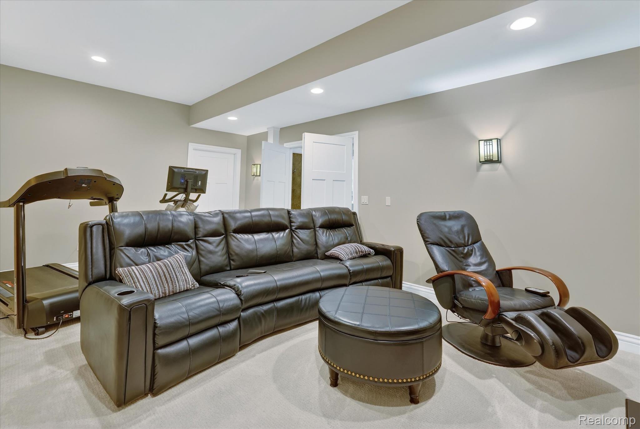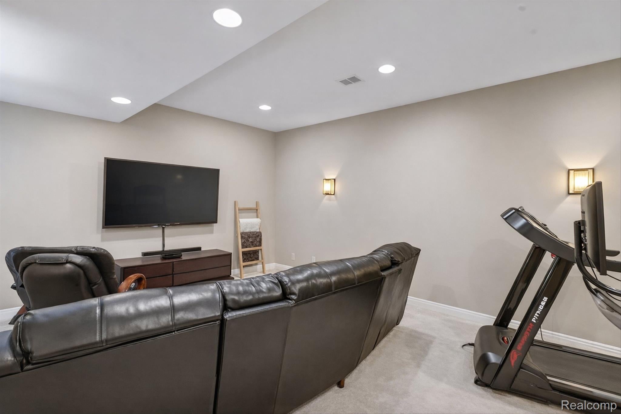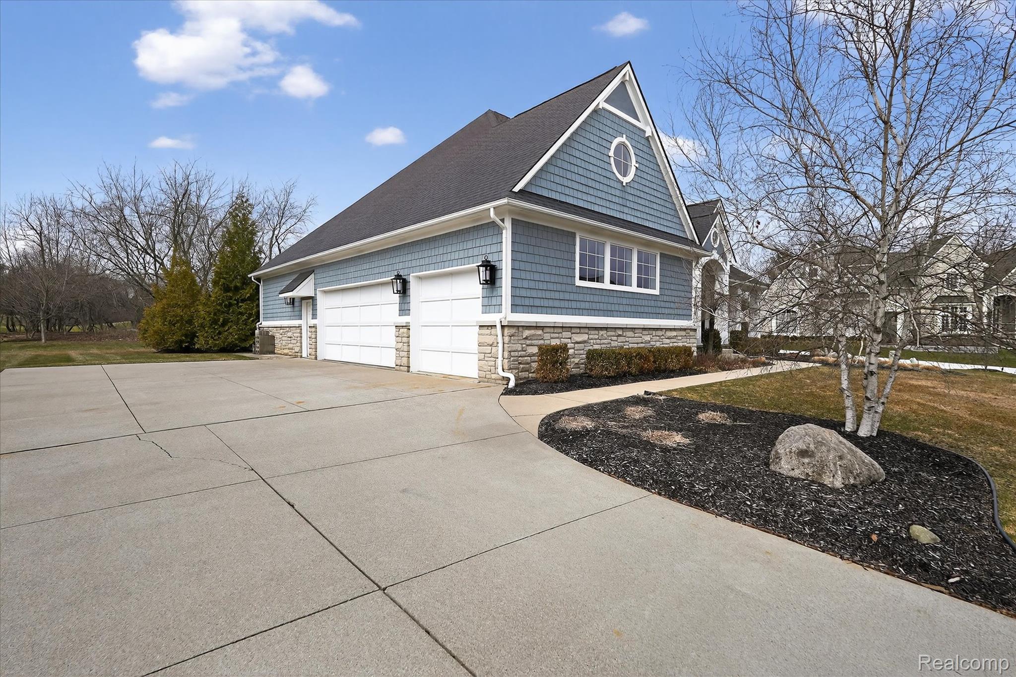 Experience elevated living in the prestigious Rivers Bend neighborhood, where sophistication, comfort, and technology define every detail of this exceptional Home !This 5-bedroom, 4.5-bath home features a main-level primary suite. Rich hardwood flooring flows throughout the main level, leading to a dramatic great room with 19-foot ceilings, expansive windows, one of a kind Custom, handcrafted metal fireplace mantel designed and fabricated by Kevin Mahan @ Metalwerks. The home is thoughtfully appointed with premium finishes and modern enhancements throughout, including high-end quartz surfaces, designer lighting, Hunter Douglas window treatments, and custom closets. Advanced features such as a commercial-grade security system, home audio, and remote-controlled blinds provide effortless luxury.The lower level is designed for easy entertaining, complete with 9-foot ceilings, a spacious family room, and a private home theater featuring HD projection, a 110-inch screen, and surround sound.Outdoors, professionally curated landscaping includes a chiseled limestone patio, copper lighting accents, and a distinctive imported lead planter. An oversized, heated three-stall garage offers epoxy flooring, tinted windows, and EV-ready wiring. Additional highlights include Andersen 400 Series windows, a 3-zone HVAC system, reverse osmosis water system, Speed Queen laundry, and Toto fixtures. Dont miss this beautifully maintained, move-in-ready home that perfectly balances luxury, uncompromising quality, and modern living.