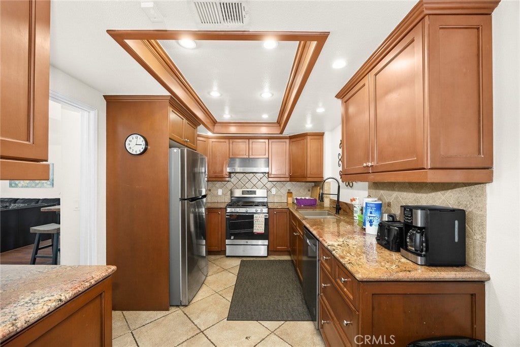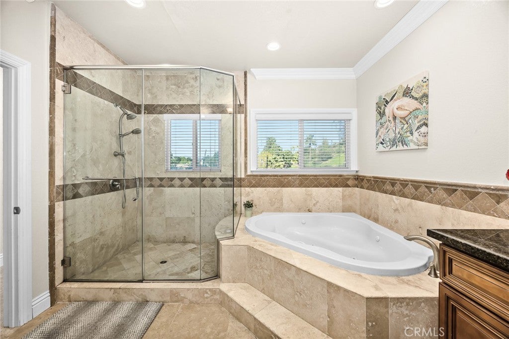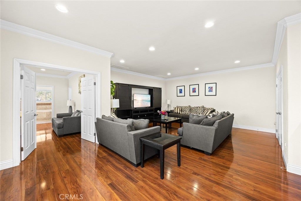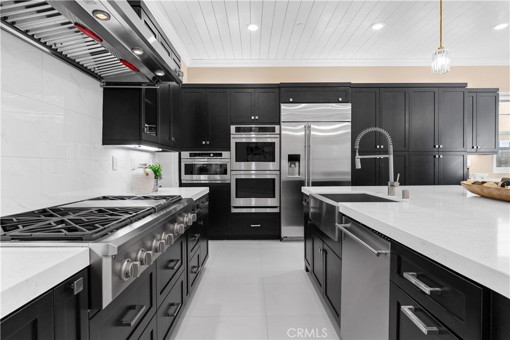 Perched above the city with 180-degree views, this fully reimagined European French Modern retreat is the definition of California luxury. Almost every inch of this home has been thoughtfully redesigned, blending architectural drama with warm finishes and innovative technology.A private, gated courtyard welcomes you through a striking custom metal pivot door, setting the tone for the elevated design found throughout. Inside, walls were opened, and structural upgrades added to create expansive, light-filled living spaces that flow effortlessly from room to room. Floor-to-ceiling Fleetwood multi-slide doors frame the views and dissolve the line between indoors and out. The dining room features dramatic Italian stone accents, and the living room stuns with a drop-down projector screen and modern fireplace.The designer kitchen is a true showpiece--custom walnut cabinetry, Texston countertops, a Lacanche French range, Sub-Zero refrigerator, and a 150-bottle dual-zone Sub-Zero wine refrigerator. A large pass-through window connects the kitchen to the backyard, perfect for entertaining.Outside, the property resembles a private resort. The stunning view lot includes an infinity-edge pool and spa, complete with Baja shelf, fire bowls, and gas firepit. An outdoor kitchen with premium appliances, concrete counters, smoker, beer tap dispenser, IPE wood accents, and built-in speakers makes hosting effortless. Additional highlights include an outdoor shower with a dedicated tankless water heater, bocce ball court with caf lighting, fruit trees, and lush landscaping.Upstairs, the primary suite is a sanctuary with statement Italian stone, custom metal French doors opening to the viewing balcony, a generous walk-in closet, and a spa-inspired bathroom featuring floating vanities and dual shower heads.This home is equipped with a whole-house Lutron lighting system, Toto customizable toilets, custom interior doors, a Tesla solar roof, tankless water heater, dual-zone HVAC, and extensive landscape lighting. Downstairs is a Denon/Bose distributed audio system and stainless-steel baseboards. Upstairs are heated porcelain tile floors with individual room zoning.The three-car finished garage features cedar garage doors, EV charging outlets, cabinetry and attic storage.This is a fully curated lifestyle property, designed for privacy, entertaining, and effortless luxury in one of Woodland Hills most coveted view locations. Close to restaurants, shopping and freeways.