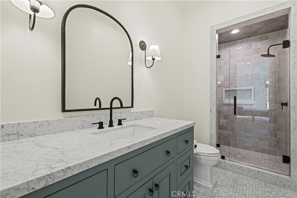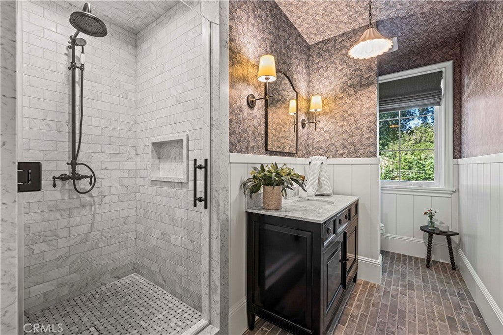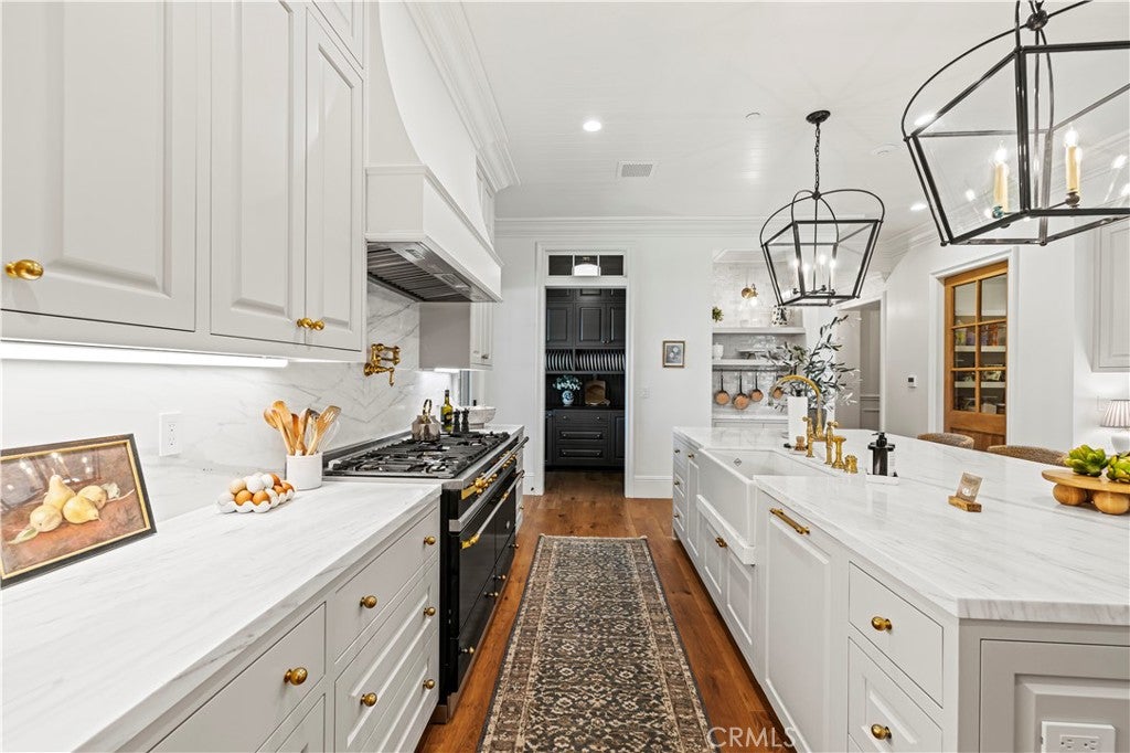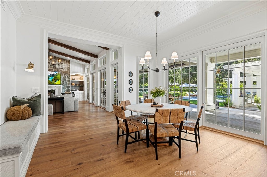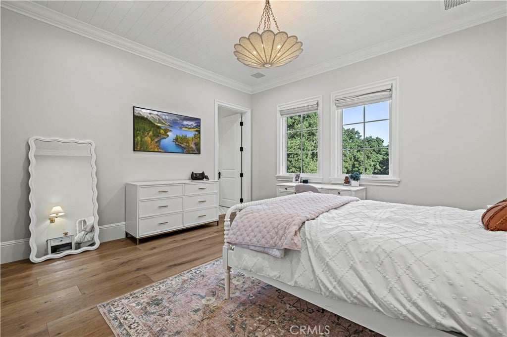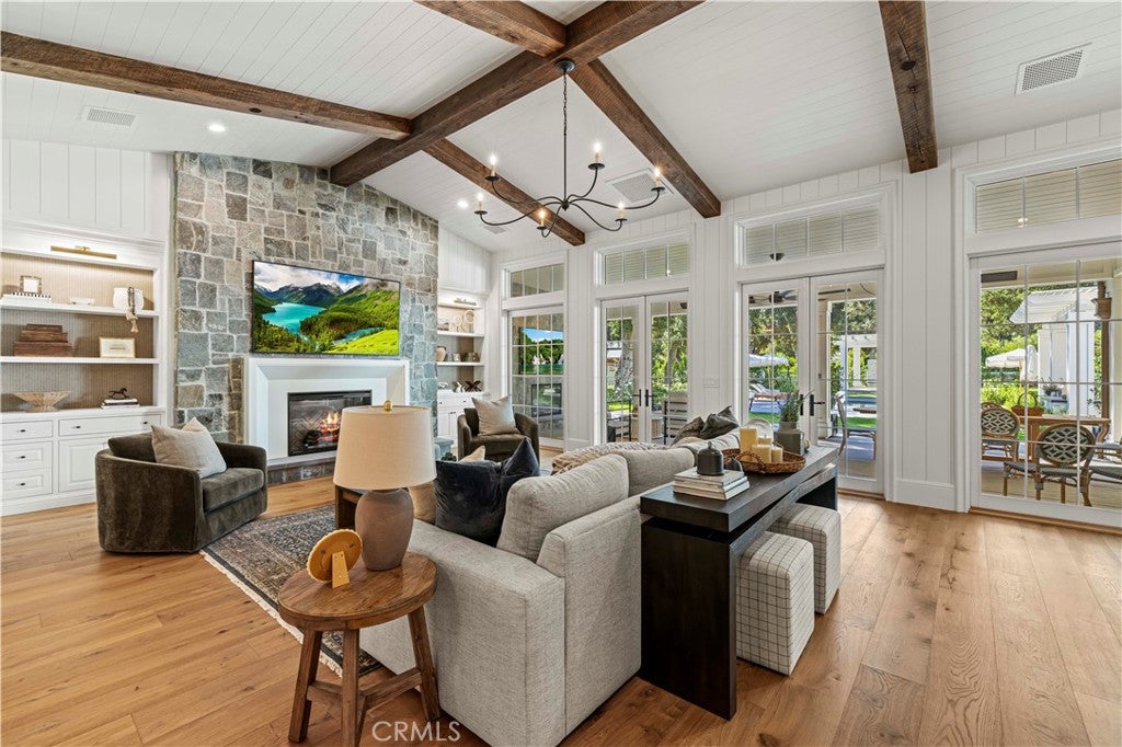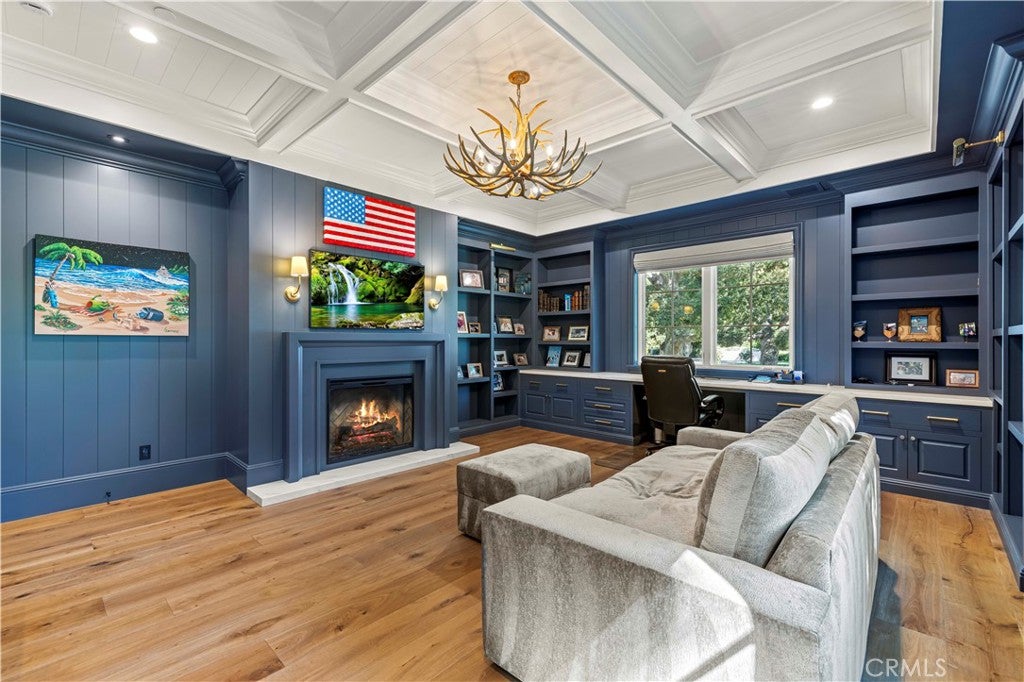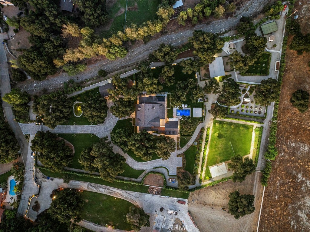Tucked behind private gates and approached by a long paver stone driveway, this truly magnificent Sand Canyon estate spans approximately 7,815 sqft across five exquisitely manicured acres. The 6,800 sqft main residence is complemented by a spacious 653 sqft ADU above the attached three car garage, along with a separate two car carriage garage connected to a 362 square foot gym or office. Inside, soaring ceilings, coffered detailing, custom wall paneling, rich wood accents, and wide plank oak floors set a warm yet grand tone, anchored by striking stone fireplaces and reclaimed beams showcased in the family room. The home flows effortlessly into a showpiece kitchen finished in Calacatta marble with a statement Lacanche range, Thermador appliances, handmade tile, a butlers pantry, wine refrigeration, seamless custom cabinetry, and a large walk-in pantry with two additional refrigerators. The main level features both the expansive primary bedroom suite and an additional downstairs bedroom with a full bath, while upstairs offers three guest bedrooms each with their own ensuite baths, a spacious loft, and beautifully appointed bathrooms finished in Carrera marble. The primary suite is a true retreat with its own fireplace, breathtaking estate views, and a spa inspired bath featuring herringbone marble floors, a luxurious shower, and a stunning standalone soaking tub. Entertaining continues with a refined dining room with classic wainscoting, a dedicated movie theater with insulated soundproofed walls, and space beneath the stairs that could offer a potential wine cellar. The ADU provides private guest accommodations with tall ceilings, kitchenette, separate HVAC, studio style living, and marble shower. Outdoors, the estate unfolds with stone patios and walkways, copper lanterns and gutters, a stunning resort style pool with deck jets and spa, a tranquil pond with multiple water features for added ambiance, an outdoor shower, a fully equipped outdoor kitchen, covered entertaining areas with heaters and oversized fan, 48 heritage oak trees, a stone encased raised bed garden with greenhouse, full perimeter snake fencing, manicured lawns, professional lighting, a five stall barn with turnouts, sport courts, sauna, and generous storage, all powered by a 600 amp electrical panel, paid off solar, public water for the home, and a private irrigation well, firmly positioning this exceptional property among the most premier estates Santa Clarita has to offer.