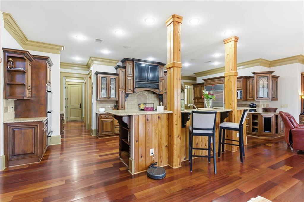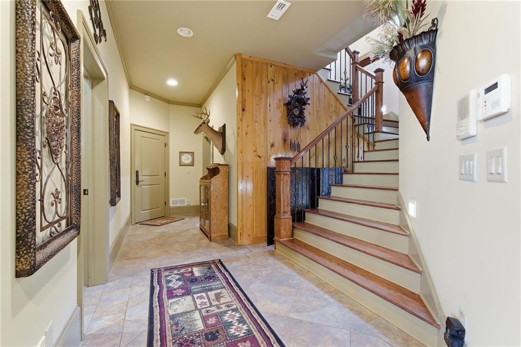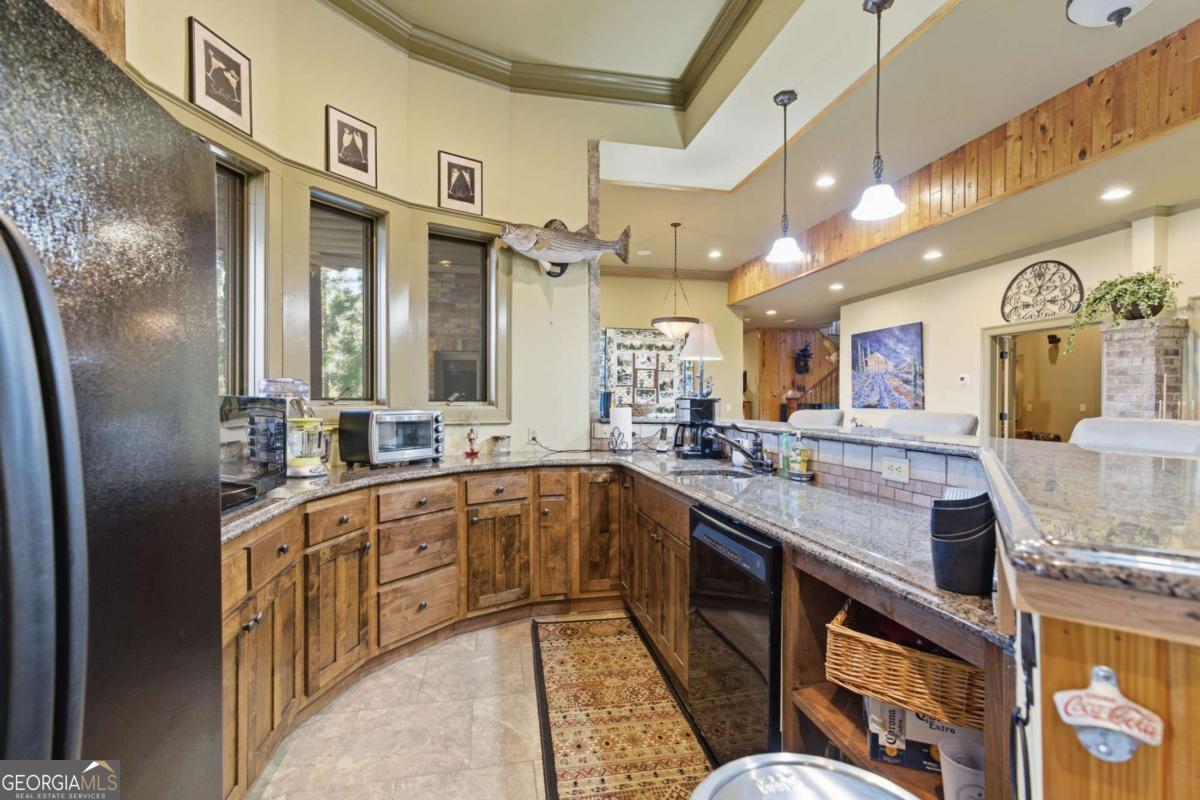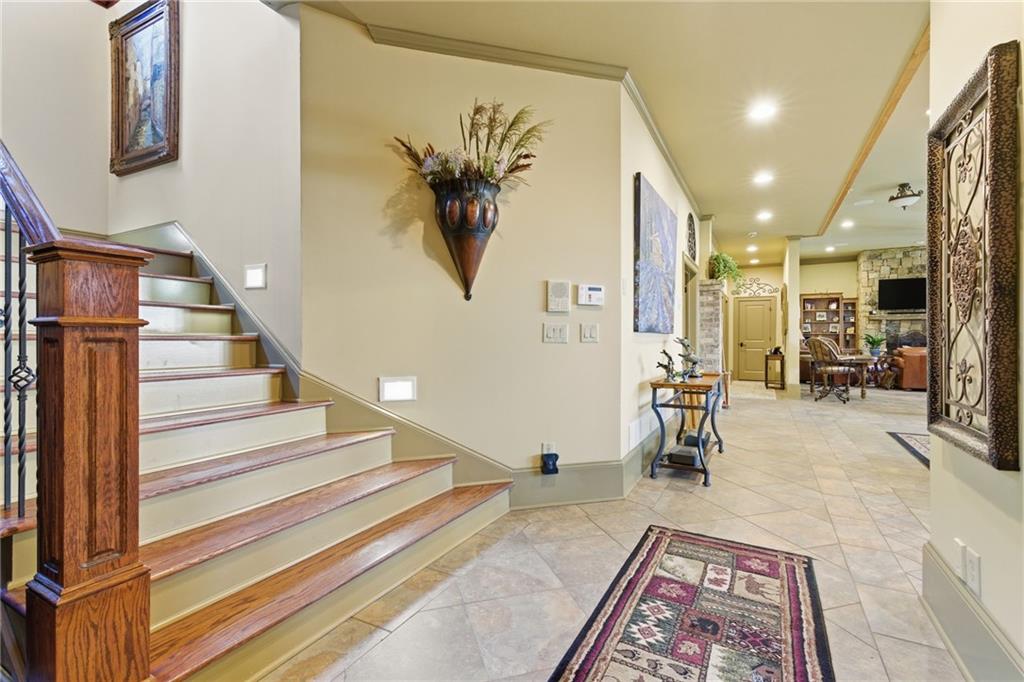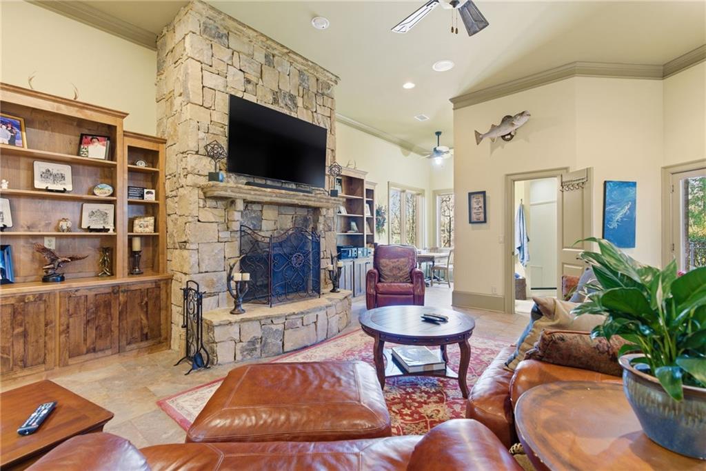 A rare opportunity to own an extraordinary lakefront retreat where luxury, comfort, and thoughtful design come together effortlessly. This sprawling custom-built ranch with a fully finished terrace level was designed for both grand entertaining and everyday ease. A private elevator connects two levels, making multi-generational living seamless and allowing you to enjoy the home for years to come. Every room is tastefully curated with exceptional craftsmanship - coffered ceilings, vaulted tongue-and-groove details, elegant barrel vaults, custom cabinetry, and stone details create warmth and architectural interest throughout. The main-level primary suite is a true sanctuary, featuring separate vanities, his-and-her walk-in closets, and an expansive dual shower in the en suite. At the heart of the home, the expansive main kitchen is a chefs dream. Outfitted with a 6-burner gas cooktop, double ovens, warming drawer, refrigerated drawers, and abundant custom cabinetry, blending beauty with high performance. A spacious island with breakfast bar anchors the room, while natural light pours in, creating an inviting space where everyone will gather. Just off the fireside keeping room youll find a graceful spiral staircase leading to the sun-drenched solarium, a peaceful retreat to unwind with a book or morning coffee. All secondary bedrooms are generously sized and offer private en suites. Two dedicated offices provide ideal work-from-home flexibility, while the terrace level boasts high ceilings, a game room, media room, and even a second kitchen - perfect for hosting unforgettable gatherings. Above the three-car garage, a private guest suite offers a bedroom, living area, full bath, and kitchenette - ideal for extended stays. Outdoors, a gentle path leads to your 32x32 double-slip dock with party deck and waverunner floats - just hop on the golf cart and head to the water where youll enjoy deepwater access year-round. Entertain with ease on the curved, double-stacked deck designed for grilling, relaxing in the hot tub, or unwinding by the beautiful outdoor fireplace and patio. Meticulously maintained with pride of ownership evident at every turn, this is a must-tour lake property offering more than can be listed here - an exceptional place to call home.