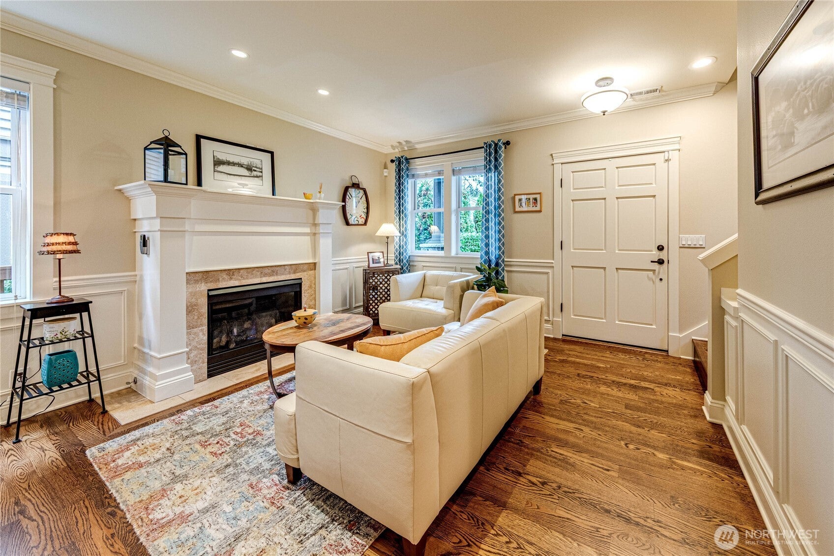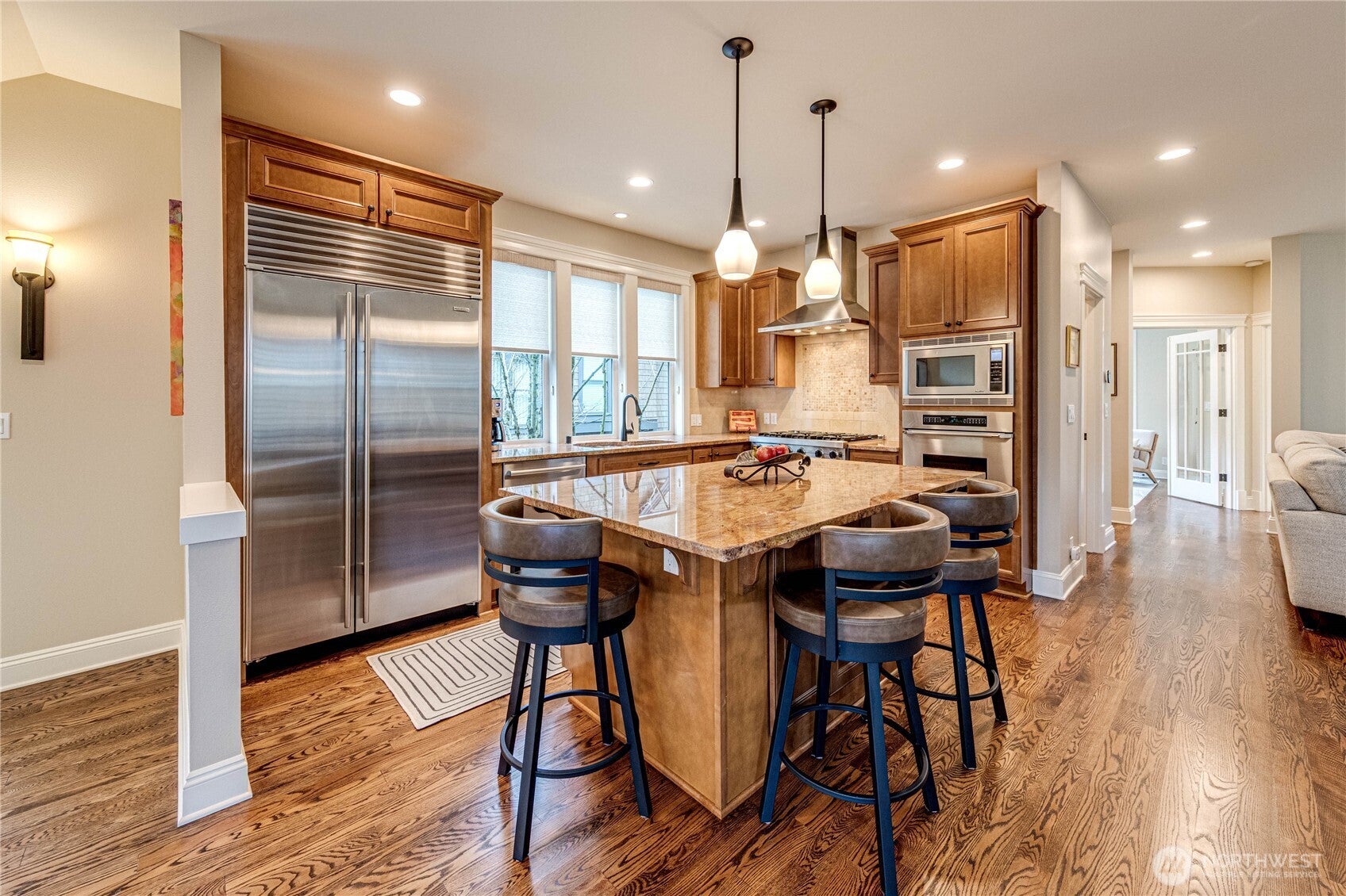 Experience the ultimate in downtown Kirkland living in this exquisite NW shingle-style craftsman townhome, perfectly positioned just half a block from the scenic Lake Washington waterfront. This residence seamlessly blends timeless architecture with high-end designer finishes, including rich espresso hardwoods, gold limestone, and walnut travertine.