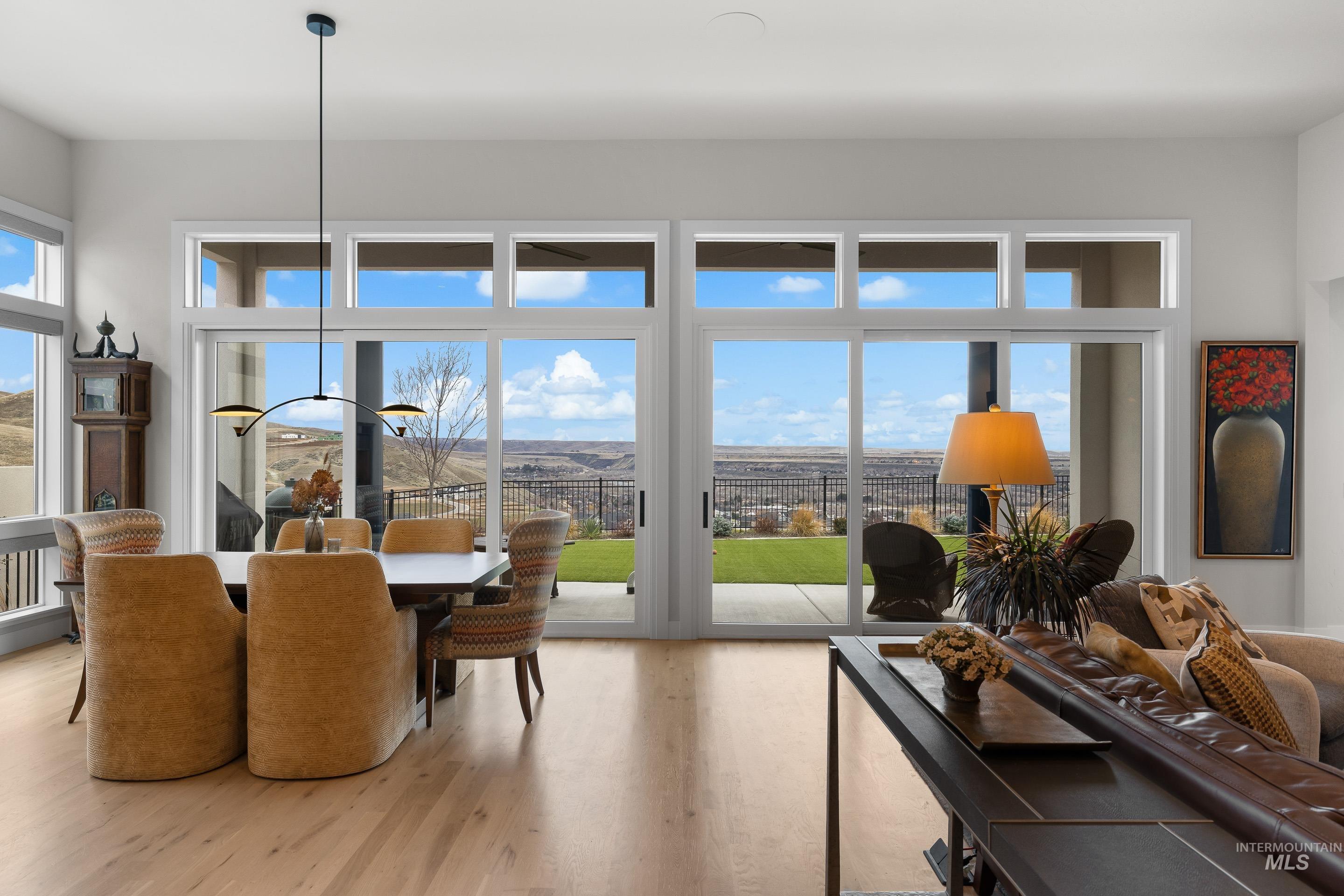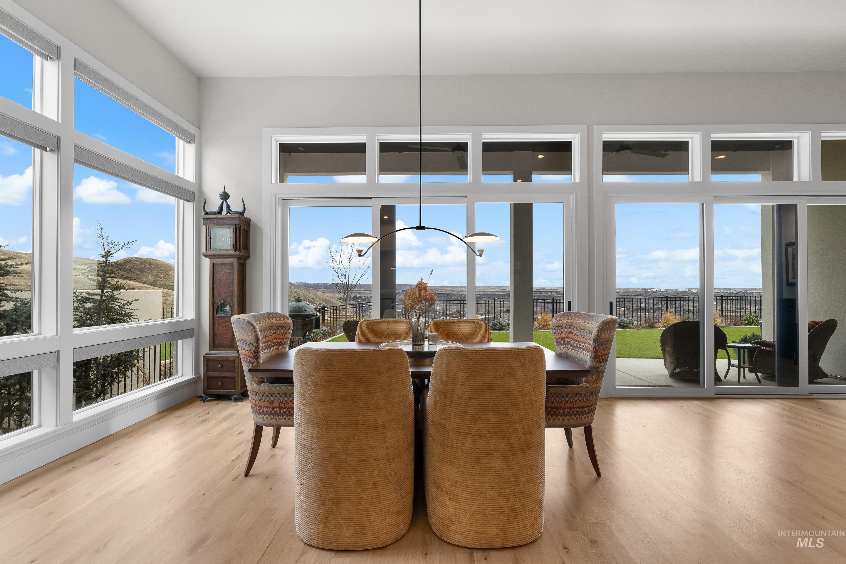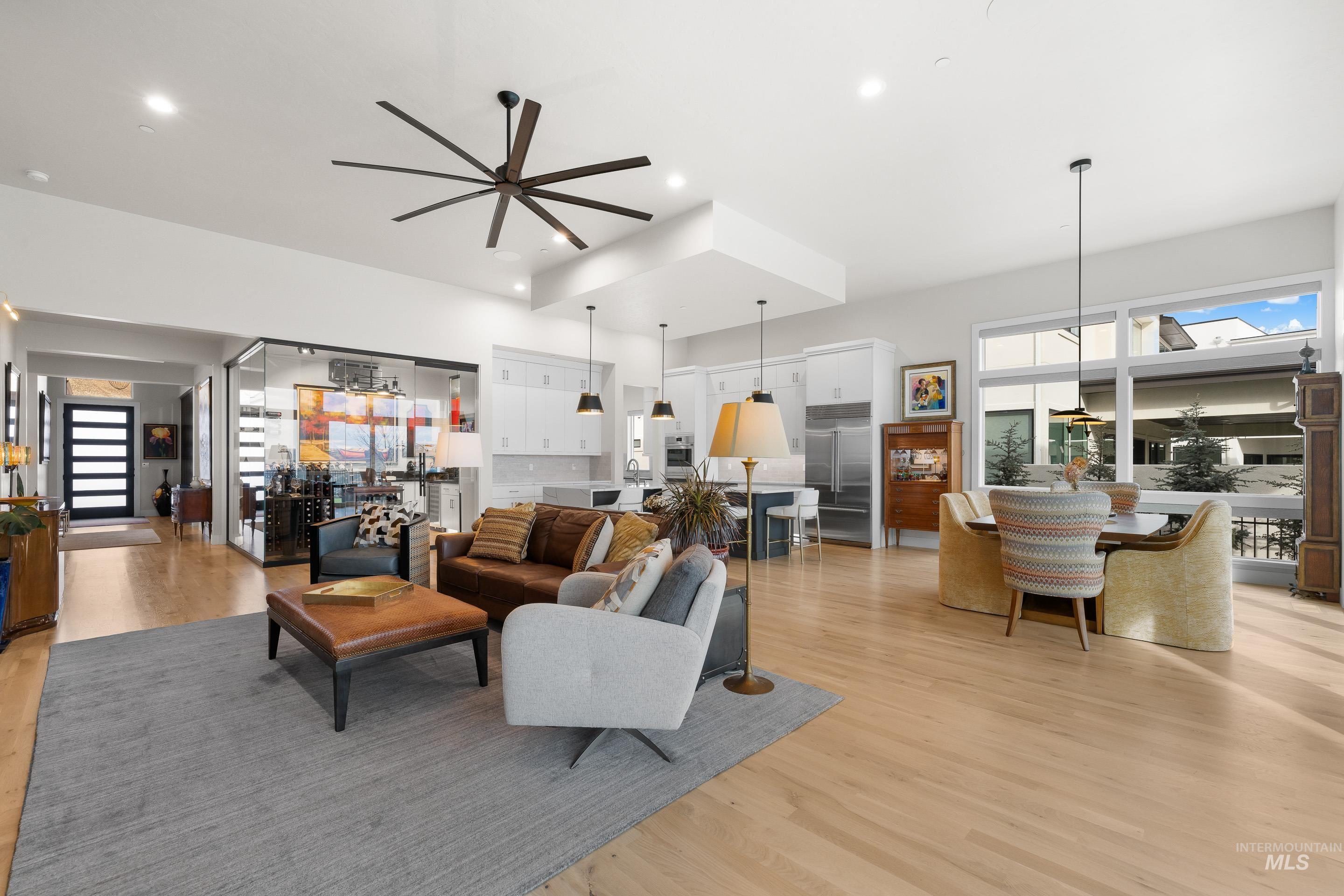 Experience the finest luxury living that NE Boise has to offer in this modern Harris North property. Enjoy incredible views of the Boise Foothills off the main living areas and primary suite. Abundant natural light floods into this open concept single level floor plan. Expansive kitchen with Wolf appliances and butlers pantry. The main area includes a linear fireplace and sliders that open up to the covered patio with premium low maintenance turf. The real show stopper of this space is the wine cellar, finished with glass walls and a climate controlled humidifying system. Large primary suite with dual vanities, and a luxurious walk in shower opposite the soaking tub. This property lives large with a guest suite, Jack and Jill bedroom with shared bathroom, bonus room and a den. Two separate garage bays fitting three units finished with epoxy floors. Upgrades include real hardwood floors, built in audio speaker system with upgraded low voltage package, two dishwashers, under cabinet lighting, premium cabinetry with dovetail cabinet drawers, electric blinds and more! Harris North includes a community pool, easy access to DT Boise, local rivers, parks and Lucky Peak recreation.