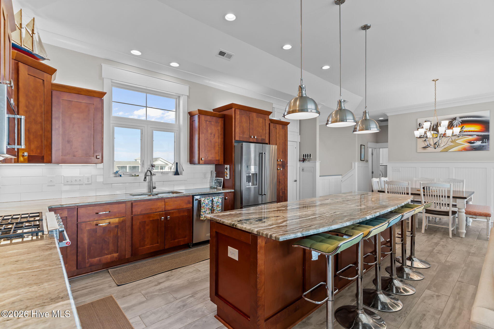 OCEANFRONT DESIRABLE KINGS LYNN! Gaze at spectacular Atlantic Ocean scenery from just about every room in this gorgeous 5-bedroom, 3.5 bath dream home on Oak Island. Abundant light and a sparkling blue backdrop enhance a wonderful reverse floor plan featuring 4-pane transom crowned doorways and windows, wide trim beadboard wainscot, tile floors, granite tops, and upscale fixtures.