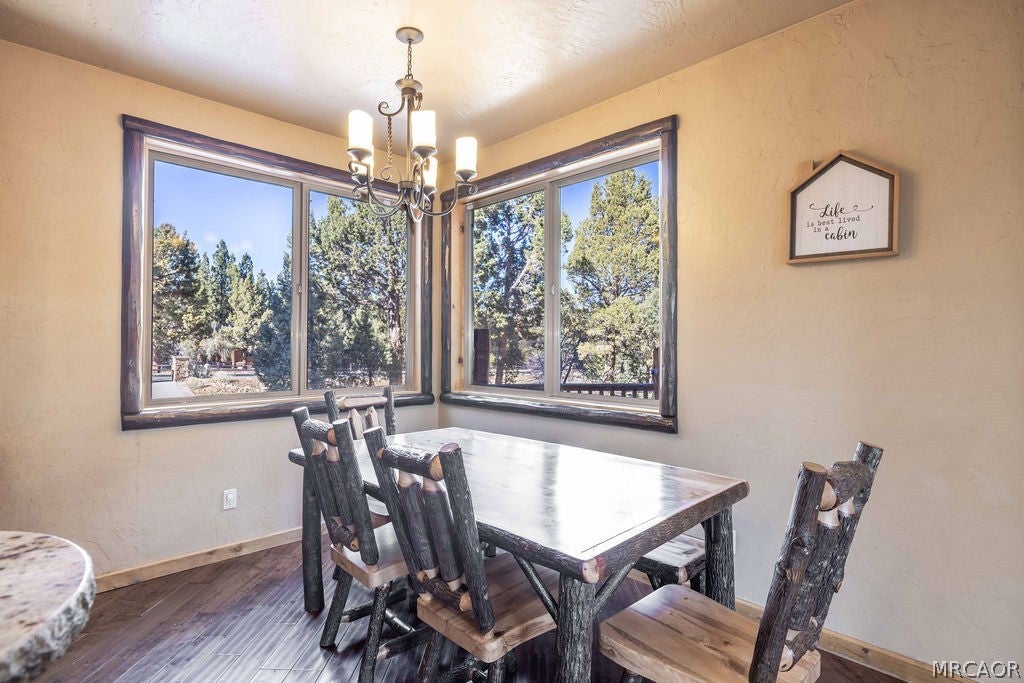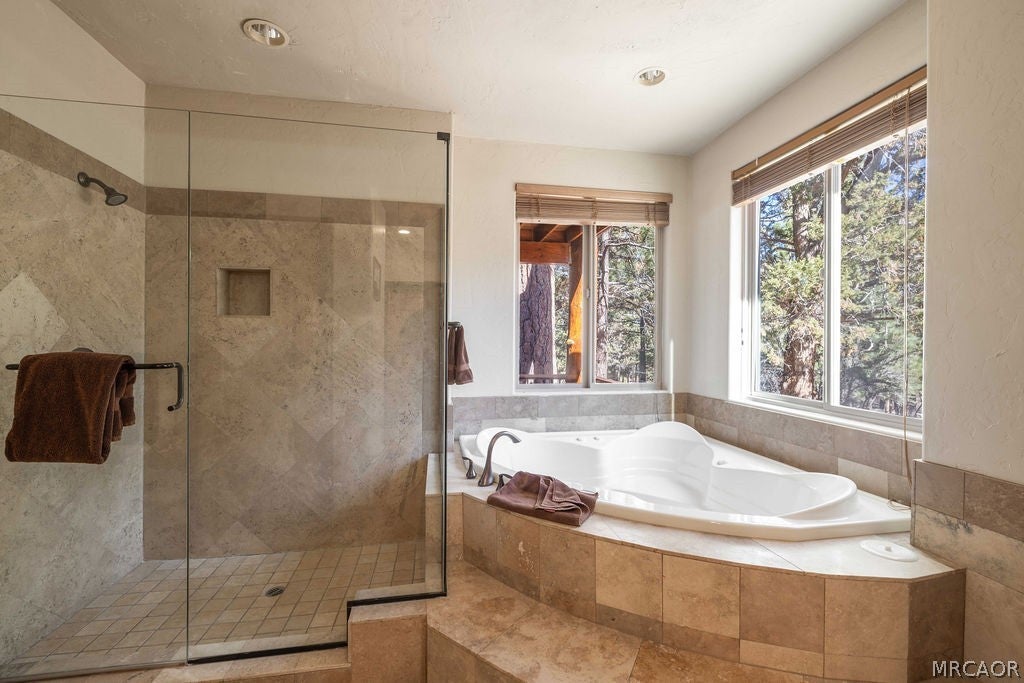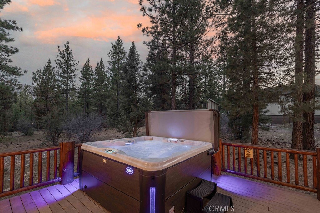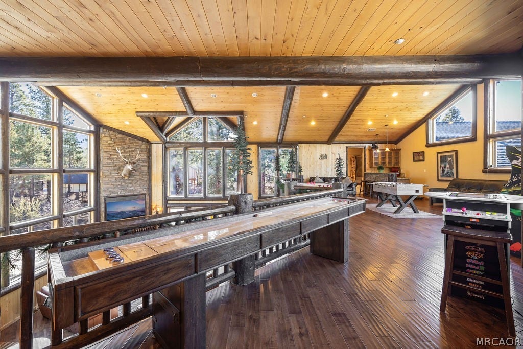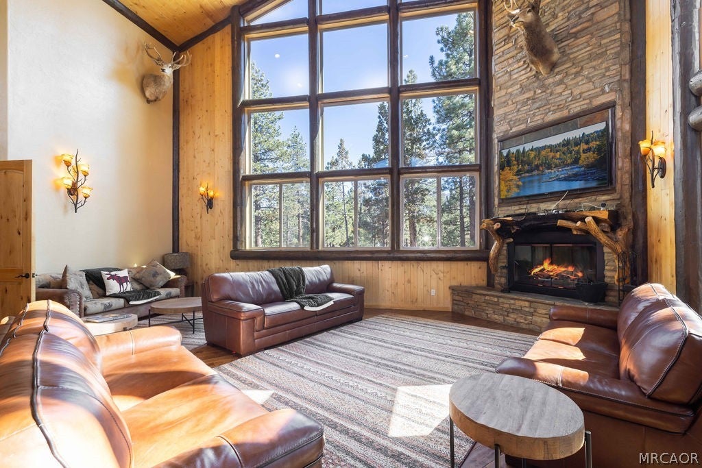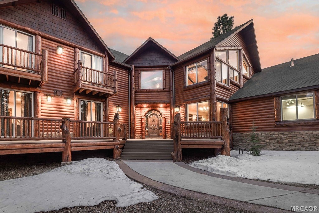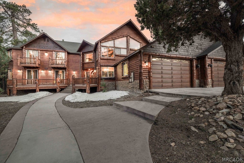 Set on over an acre in the highly sought-after Meadowbrook Estates, this custom log-style retreat offers the space, privacy, and craftsmanship that define true mountain living. Inside, soaring ceilings and rich log accents create an impressive yet inviting atmosphere, while expansive windows frame the surrounding forest and bring natural light into the open living spaces. The thoughtfully designed floor plan flows effortlessly for both everyday living and entertaining, centered around a chefs kitchen ideal for gathering with family and friends. Upstairs youll find an expansive open loft style game room with a full bar, the perfect setting for cocktails, games, and relaxed evenings. Multiple fireplaces throughout the home add warmth and ambiance, including within the primary suite featuring a private sitting area, spa-inspired bath with soaking tub, walk-in shower, generous walk-in closet, and its own private deck. The home features three additional bedrooms, including a second suite with fireplace and private balcony making it the ideal for guests. Step outside to soak beneath the stars in the outdoor spa and take in the peaceful mountain setting that surrounds the property. Car enthusiasts and hobbyists will appreciate the expansive five-car garage, offering ample space for vehicles, recreation gear, and storage. Located just minutes from the heart of Big Bear Lake yet tucked away in one of the areas most desirable neighborhoods, this property delivers both convenience and tranquility. Adding even more opportunity, the neighboring 1.2-acre parcel is also available for purchase - offering the rare chance to expand your privacy, build, or secure additional space in this premier setting.
