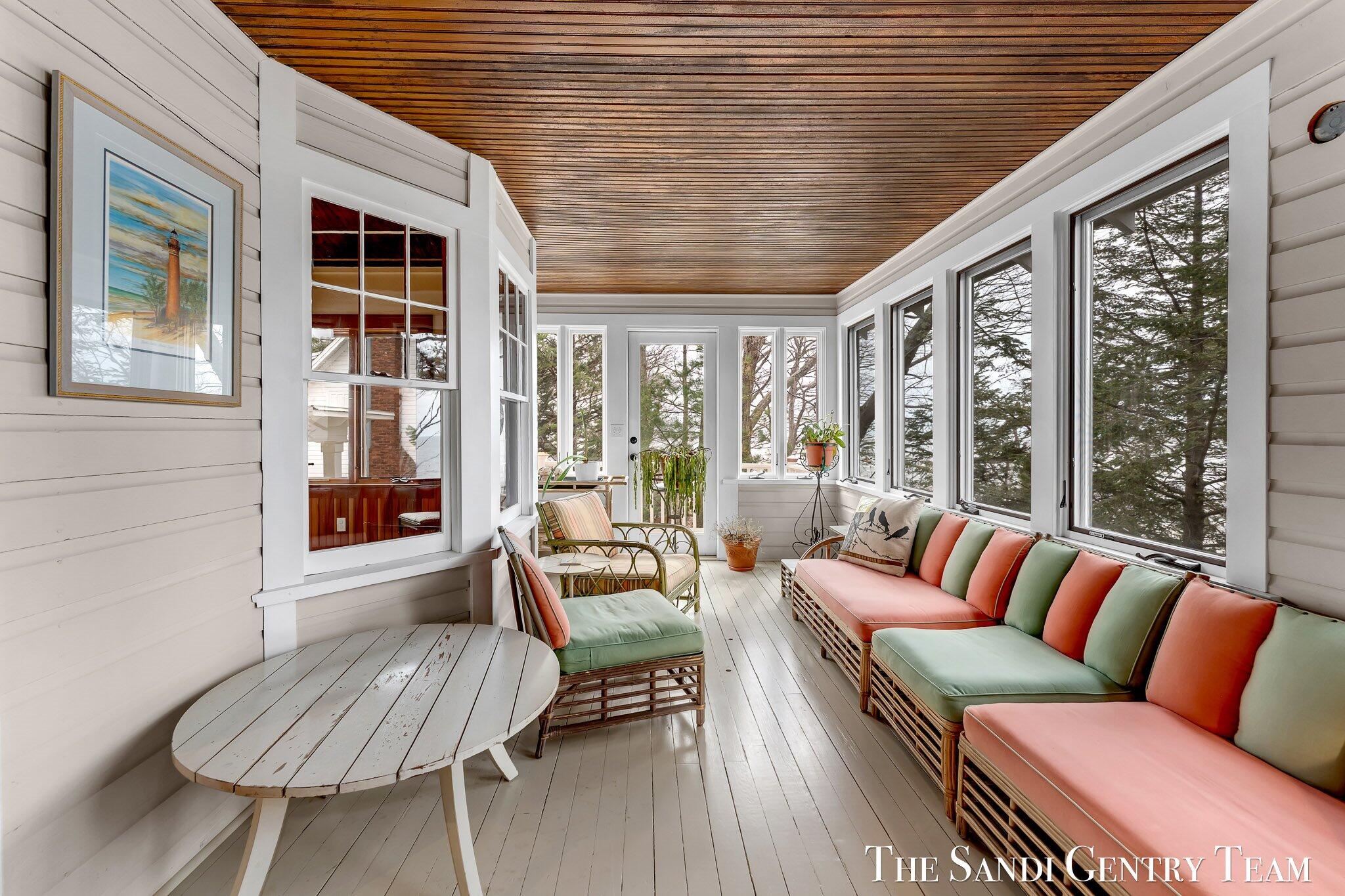 Where the rhythm of the waves becomes part of everyday life, this 4 bedroom, 3.5 bath Lake Michigan retreat offers 65 feet of private frontage and more than 3,000sq ft of thoughtfully designed living space. Blending timeless character with panoramic water views, the home delivers an inviting setting that feels both refined and effortlessly relaxed. Originally constructed with care and extensively renovated in 1999, the residence radiates warmth and enduring appeal. Rich hardwood floors anchor the main living areas, including a welcoming living room centered around a striking stone wood burning fireplace, the perfect place to gather after a day on the beach. The spacious dining room flows seamlessly into a light filled kitchen featuring custom cabinetry, a charming breakfast nook, and distinctive architectural details that elevate daily living. Just off the main level, a sun filled sitting porch captures expansive lake views and offers a comfortable, climate controlled space for for morning coffee, evening cocktails, or peaceful afternoons with a book. Large windows throughout the home frame the ever changing waterscape and bathe each room in natural light. The primary suite is a private sanctuary, complete with an en suite bath featuring a jetted tub, a generous walk in closet, and a separate sitting and dining area with a wet bar and beverage refrigerator. Direct access to a screened porch invites you to unwind to the soothing sound of the shoreline. Additional bedrooms and baths provide ample accommodations for family and guests, while a cozy loft offers flexible space for a home office or additional lounge area. Designed for gathering and celebration, the home features multiple indoor and outdoor living spaces, along with a private staircase leading directly to the sandy beach below. From sun filled summer afternoons to vibrant sunset skies, every detail embraces the beauty and tranquility of lakefront living. Whether enjoyed as a seasonal escape or a year round residence, this exceptional Lake Michigan property offers a rare opportunity to create lasting memories in an unforgettable waterfront setting.