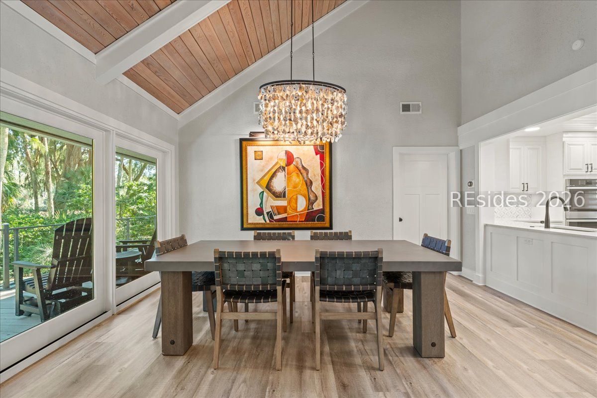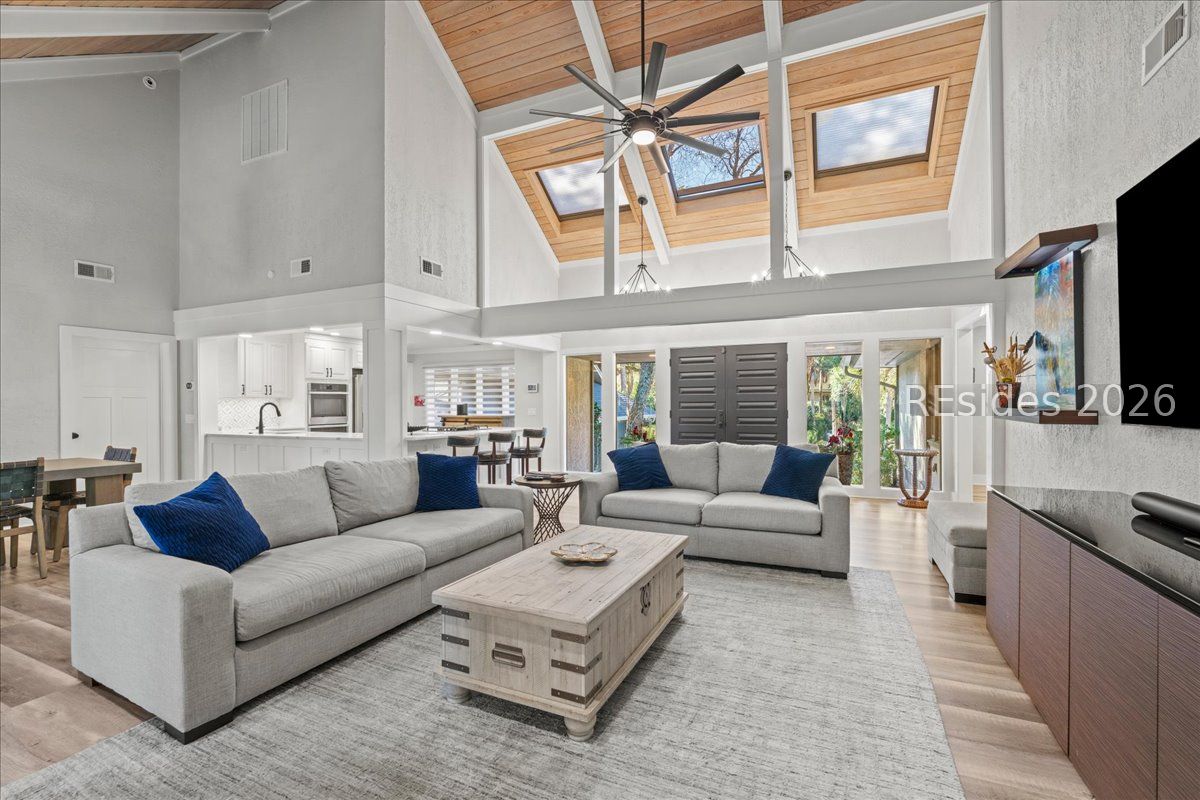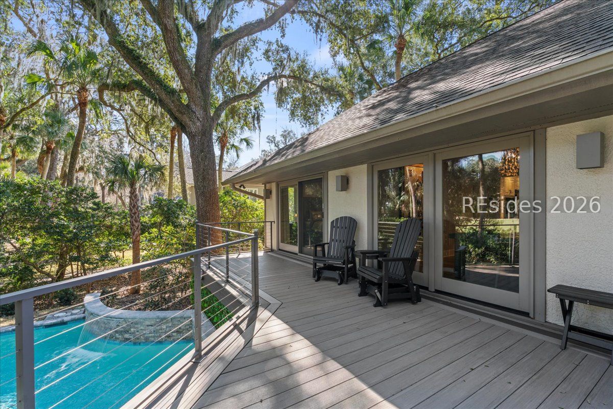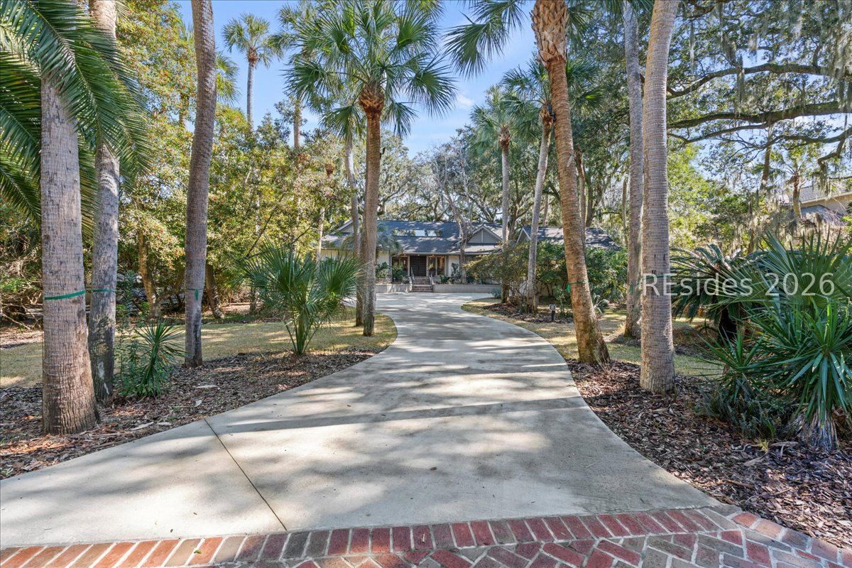 Fall in love with this beautifully updated single-level home, perfectly positioned on a private cul-de-sac along the 16th fairway of the Robert Trent Jones Golf Course in Palmetto Dunes. Set on a large, secluded lot framed by majestic live oaks and palms, this 3-bedroom, 3-bath residence offers effortless indoor-outdoor living with an open, light-filled floor plan and soaring vaulted ceilings accented by wood beams. The welcoming living area centers around a gas fireplace and flows seamlessly into a gourmet kitchen featuring double ovens, a gas range, and modern finishes. Every detail has been thoughtfully updated within the past four years, including LVP flooring throughout and luxurious baths. Outdoors, enjoy a brand-new pool with waterfall and resistance jets, Trex decking, and a built-in grill-ideal for relaxing or entertaining while taking in serene golf views. Additional highlights include a heated and cooled 2 car garage with epoxy flooring and expansion plans, 24-hour security, beach access, bike trails, golf, tennis, and marina amenities-all just moments away. Modern comfort meets timeless Lowcountry charm.