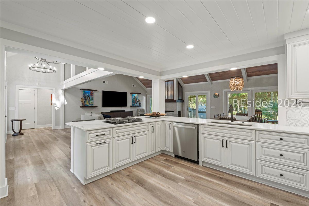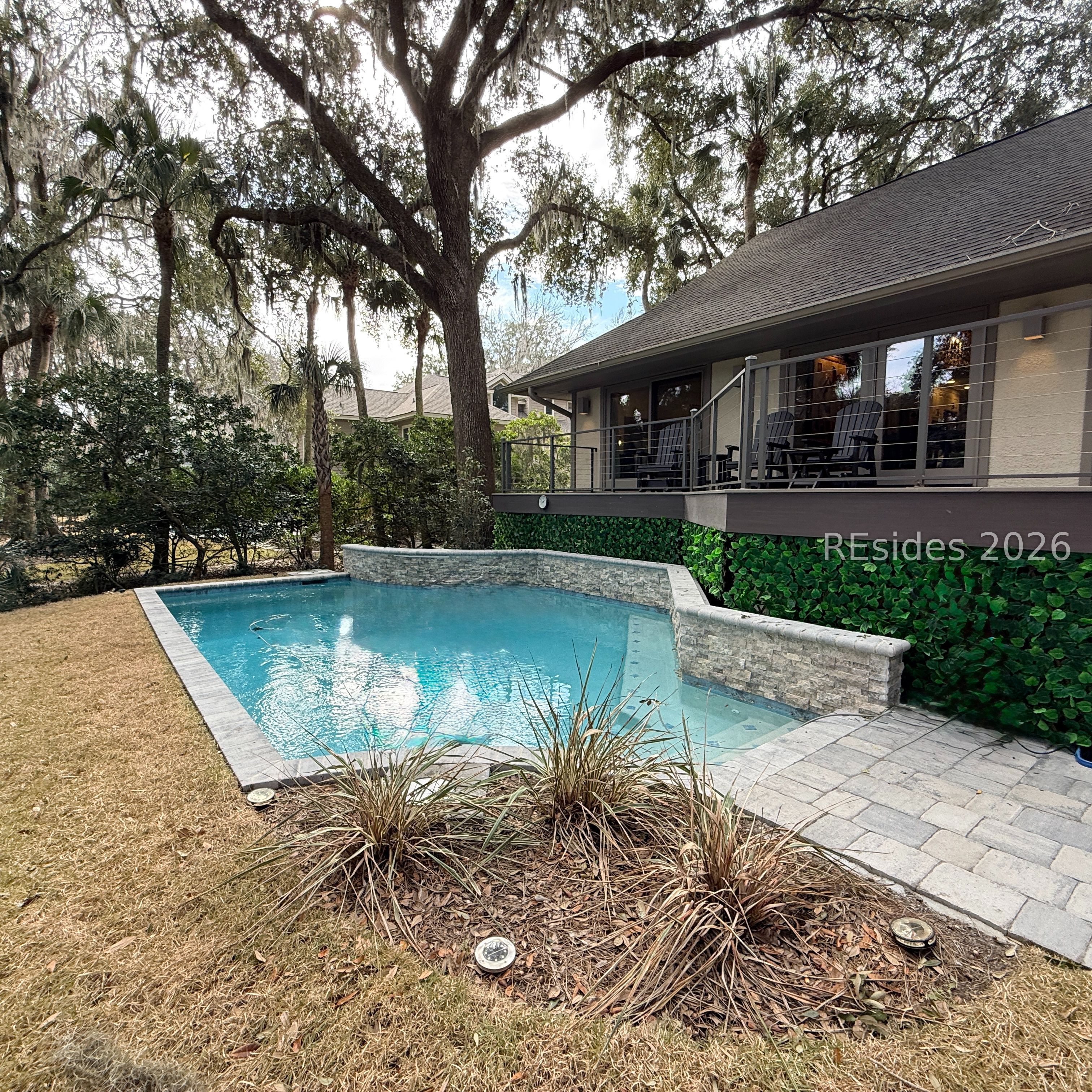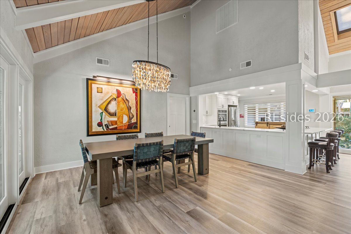 Fall in love with this beautifully updated single-level home, perfectly positioned on a private cul-de-sac along the 16th fairway of the Robert Trent Jones Golf Course in Palmetto Dunes. Set on a large, secluded lot framed by majestic live oaks and palms, this 3-bedroom, 3-bath residence offers effortless indoor-outdoor living with an open, light-filled floor plan and soaring vaulted ceilings accented by wood beams. The welcoming living area centers around a gas fireplace and flows seamlessly into a gourmet kitchen featuring double ovens, a gas range, and modern finishes. Every detail has been thoughtfully updated within the past four years, including LVP flooring throughout and luxurious baths. Outdoors, enjoy a brand-new pool with waterfall and resistance jets, Trex decking, and a built-in grill-ideal for relaxing or entertaining while taking in serene golf views. Additional highlights include a heated and cooled 2 car garage with epoxy flooring and expansion plans, 24-hour security, beach access, bike trails, golf, tennis, and marina amenities-all just moments away. Modern comfort meets timeless Lowcountry charm.