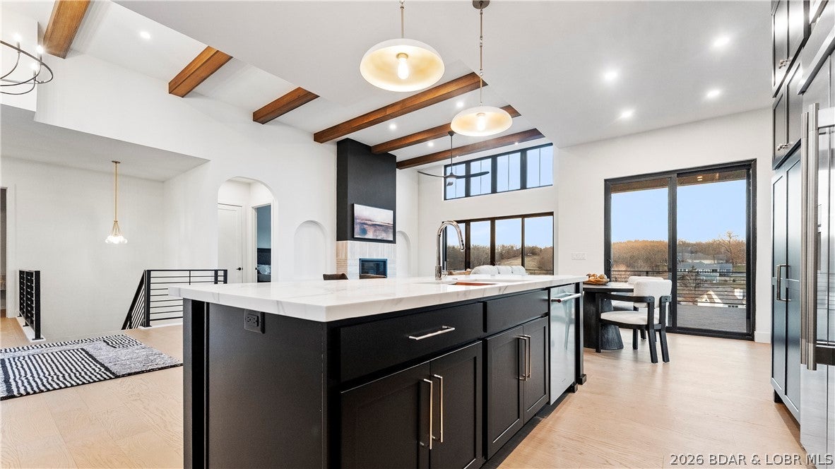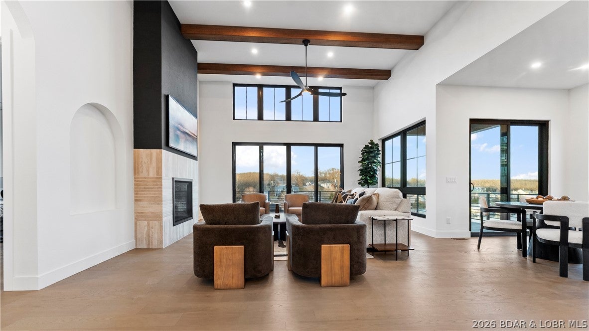 Recently completed by Thomas Construction, this luxury residence presents a turnkey opportunity within the Harpers Cov lake community. Blending modern design with timeless architecture, the 4-bed, 5-bath home features oversized windows, elevated ceiling heights, and cantilevered decks positioned for wide cove views.The main level is designed for single-level living and entertaining.