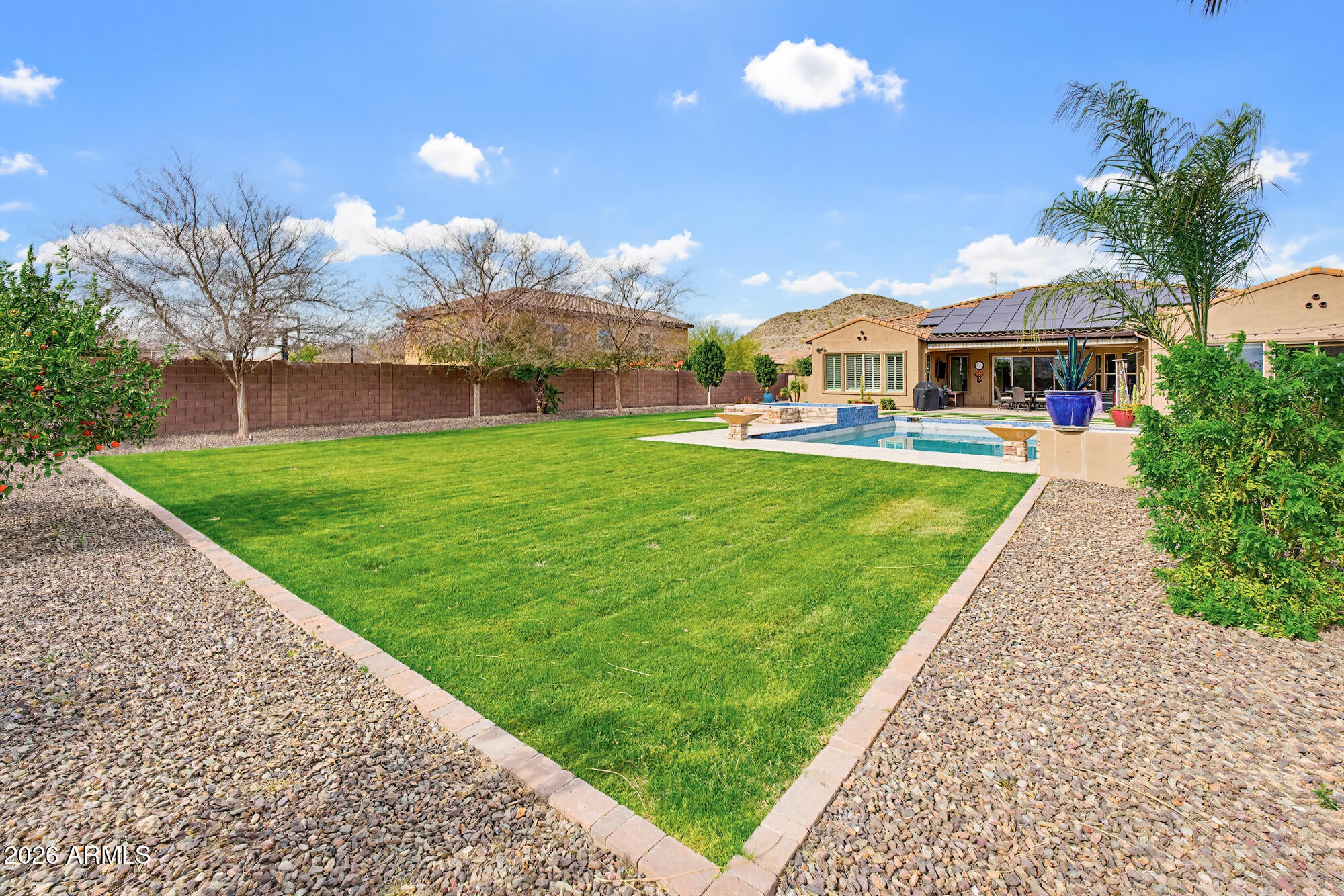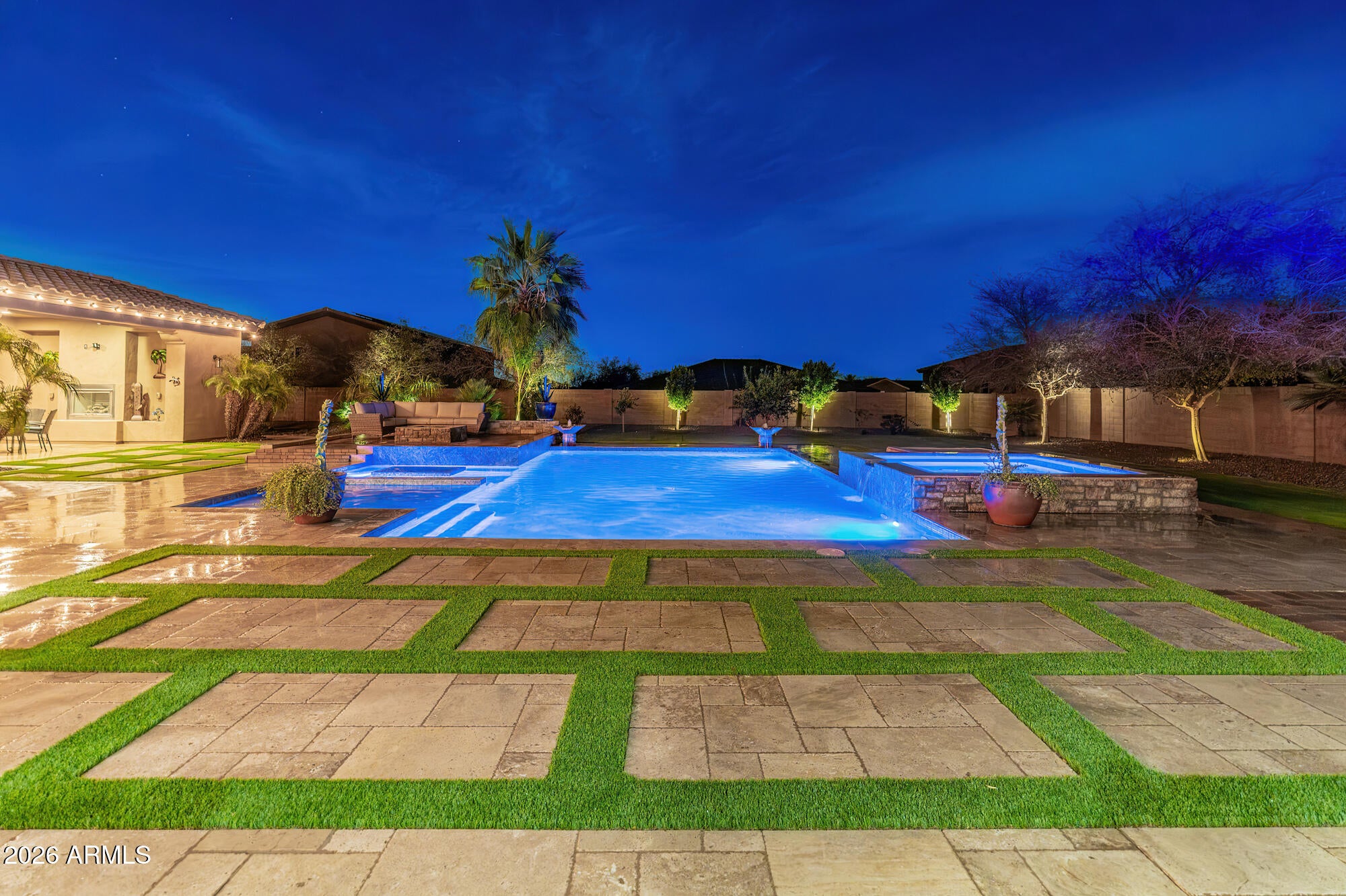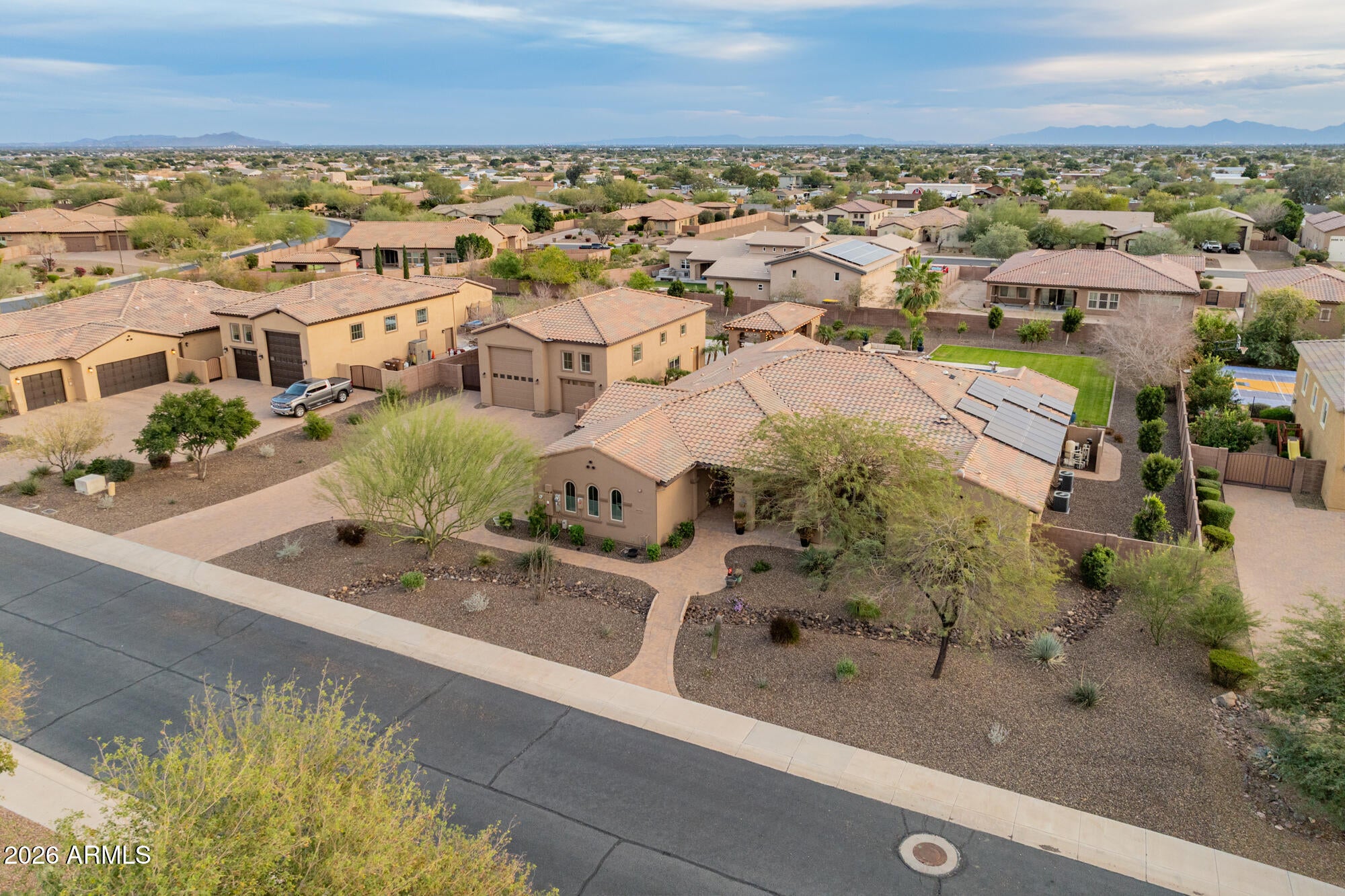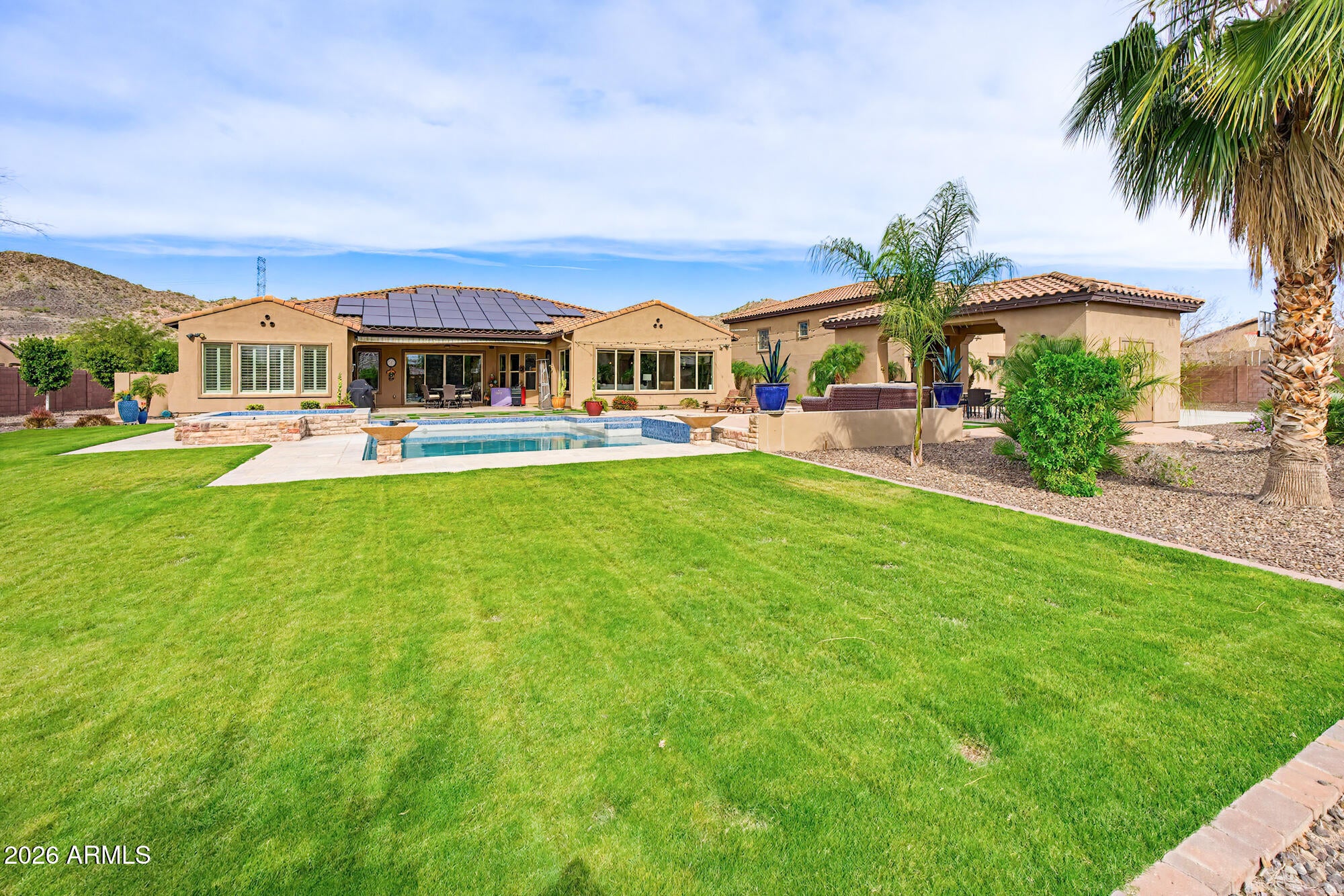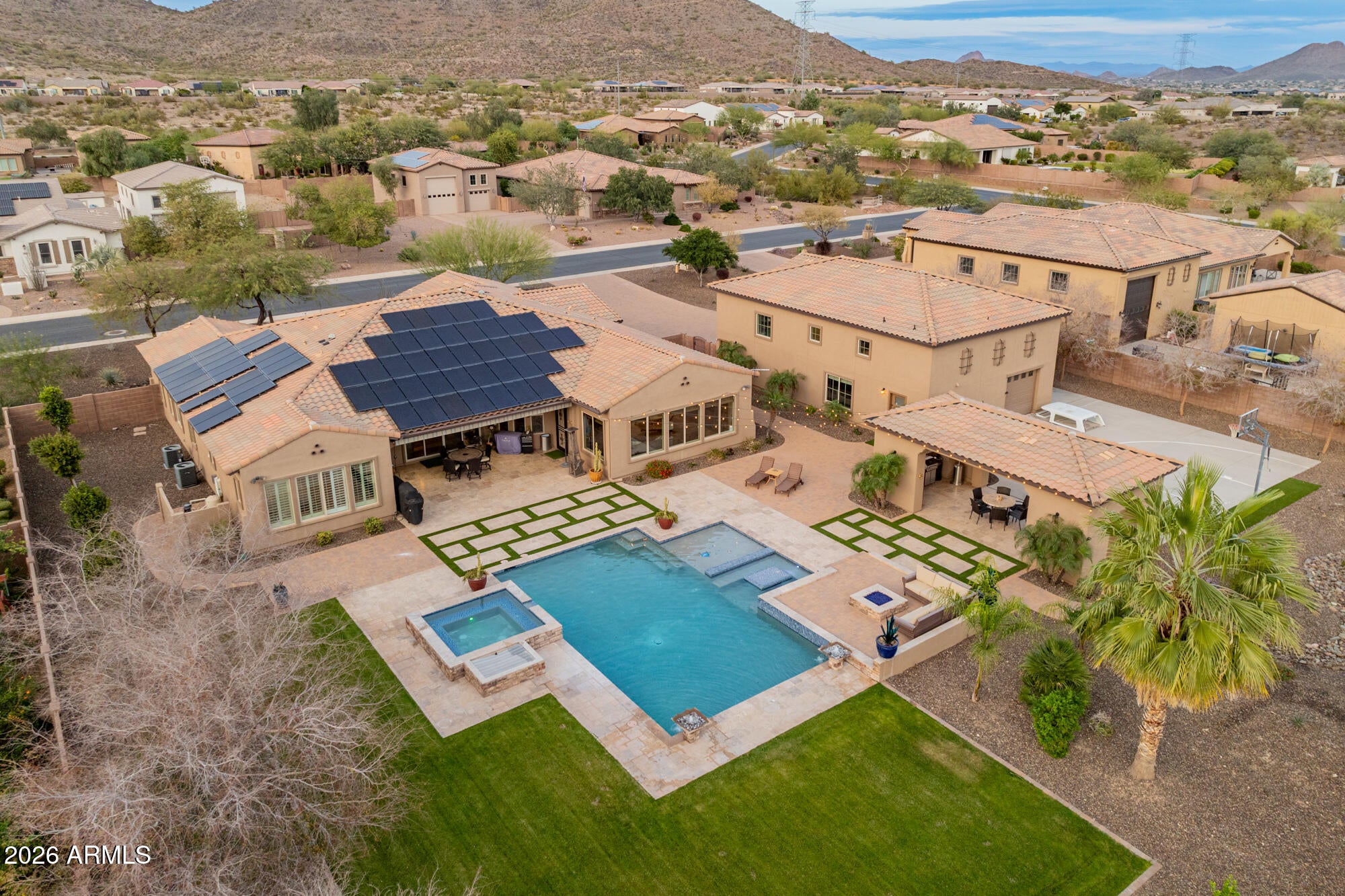 Welcome to luxury living in a gated community within Vista Montana. Situated on nearly an acre, this exceptional property blends privacy, functionality, and resort-style design in one unforgettable setting. From the moment you arrive, youll appreciate the expansive lot, elegant curb appeal, and thoughtfully designed layout. Inside, the home offers spacious open living areas, high ceilings, and seamless indoor-outdoor flowperfect for both everyday living and entertaining. The chefs kitchen anchors the heart of the home with rich cabinetry, quartz countertops, generous prep space, and a large island ideal for gathering. Expansive windows frame views of the backyard oasis and fill the home with natural light. Step outside to your private resort: a stunning pool and spa with water feature, expansive paver patios, lush green lawn, and multiple entertaining areas. Whether hosting under the covered patio or enjoying a quiet Arizona evening by the fire feature, this backyard delivers.Car enthusiasts and hobbyists will love the oversized RV garage (32x52 with 14high door) complete with a custom man cave featuring its own kitchenette and bath perfect for guests, projects, or the ultimate retreat space. Additional Highlights include: nearly acre lot, gated community, resort style pool/spa, RV garage with lift capability and 8 car capacity, private man cave with kitchenette and bath, OWNED SOLAR for energy efficiency, Generous storage and workspace.This is more than a home - its an Arizona lifestyle property built for entertaining storing the toys and living comfortably year round.