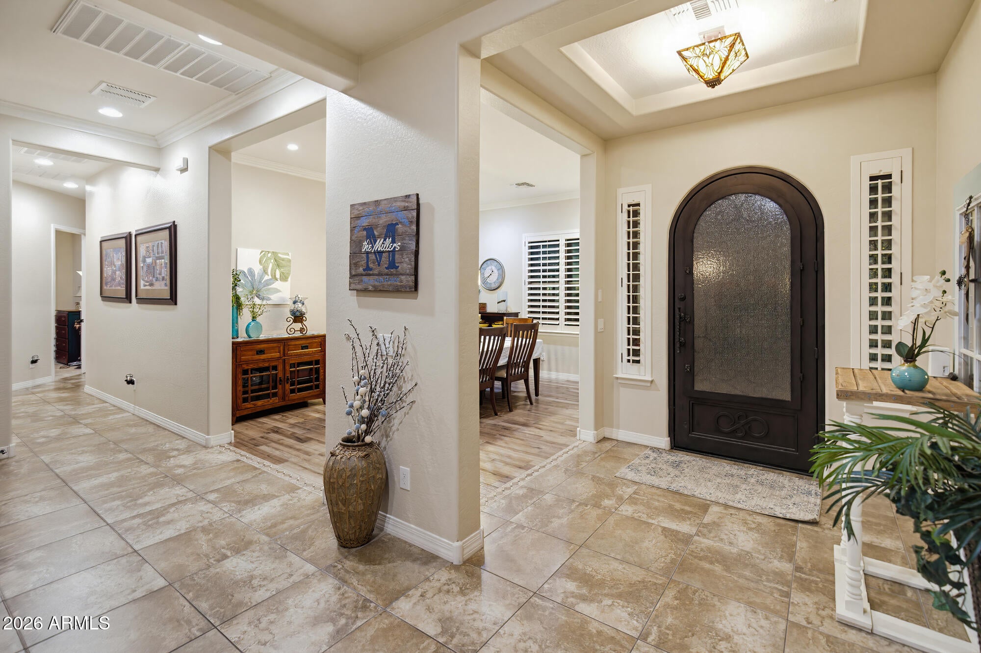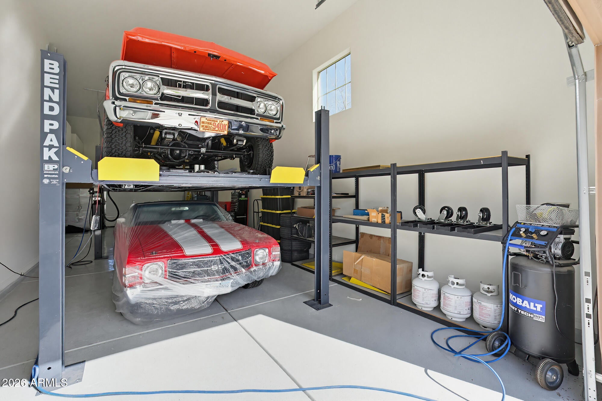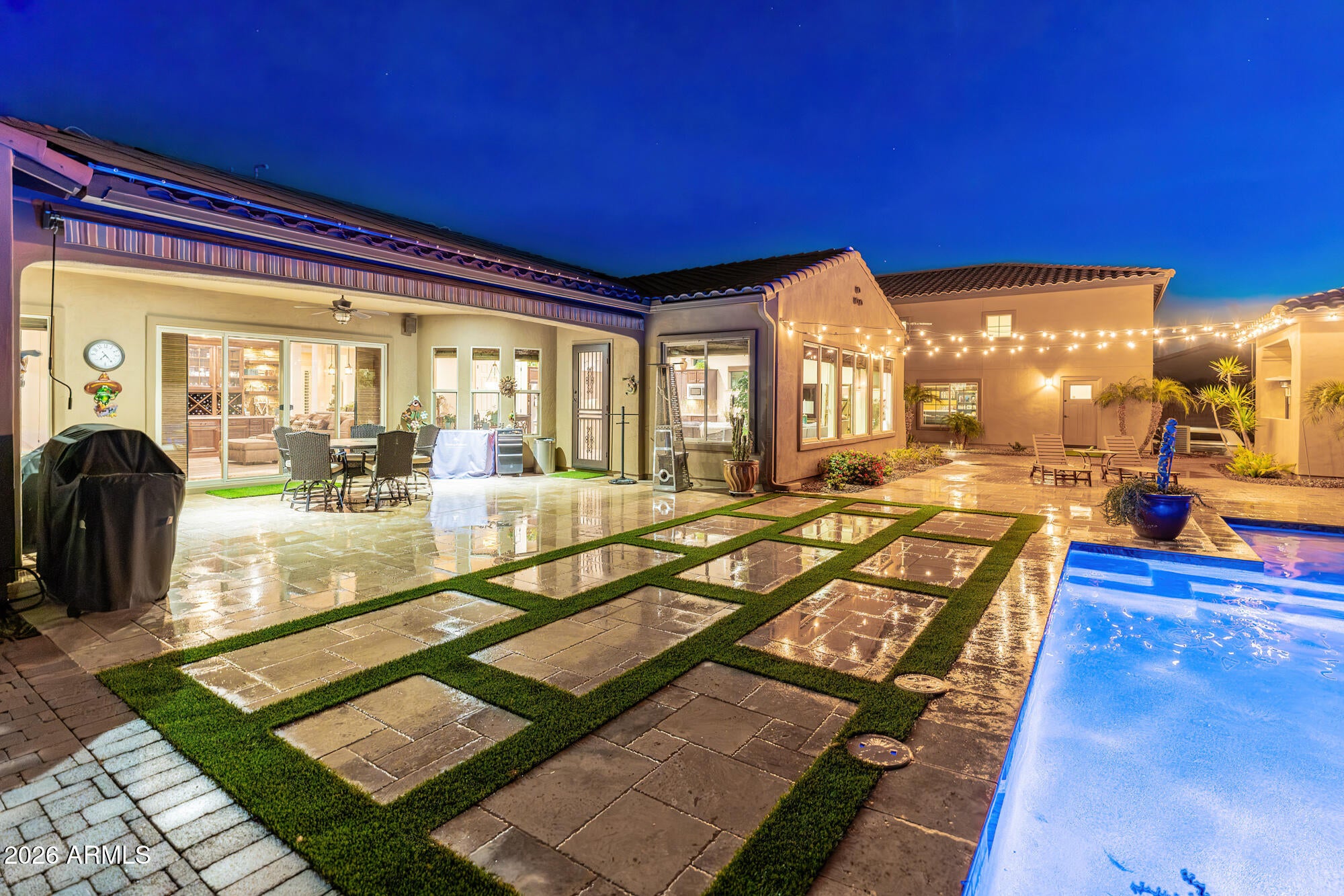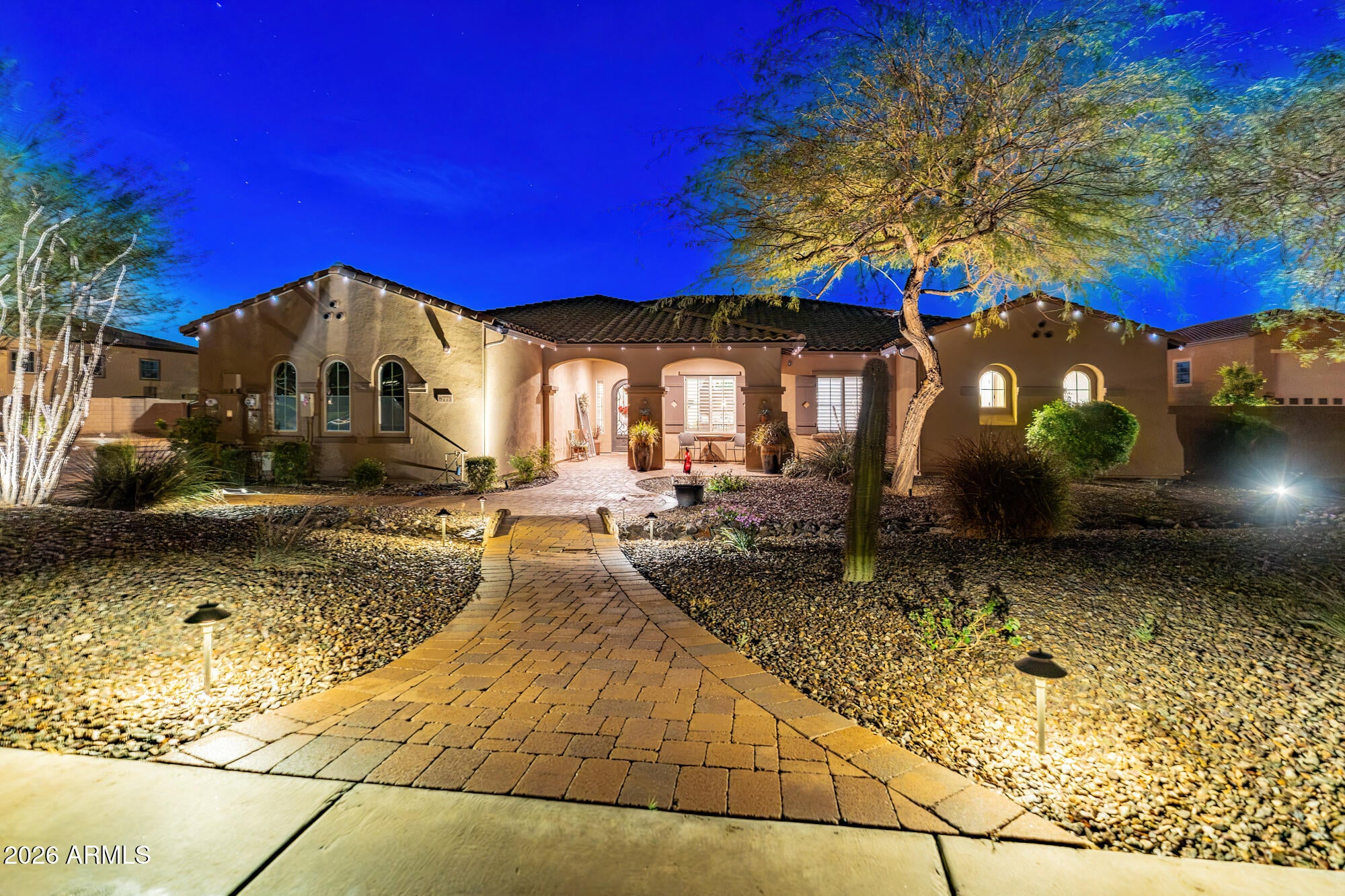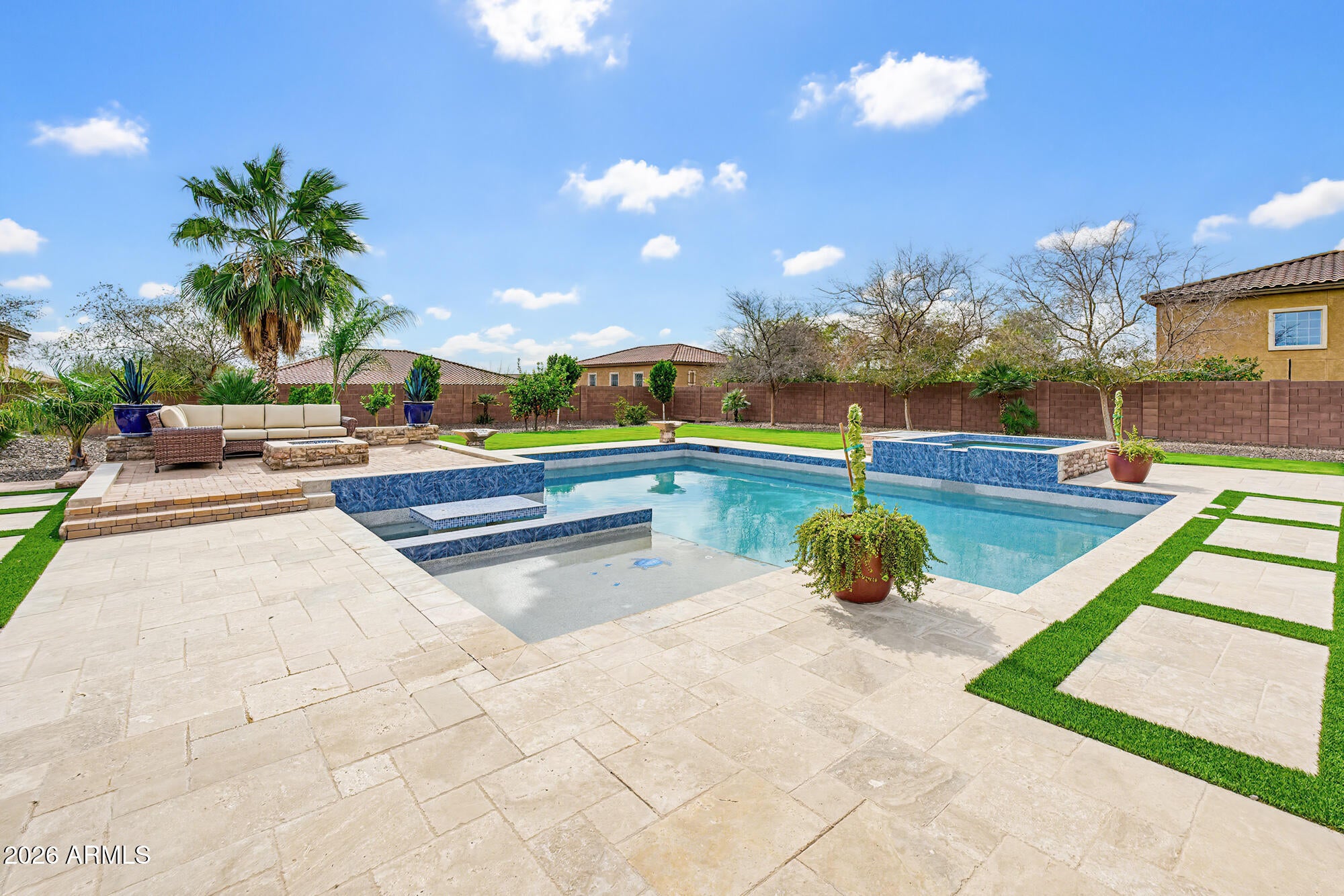 Welcome to luxury living in a gated community within Vista Montana. Situated on nearly an acre, this exceptional property blends privacy, functionality, and resort-style design in one unforgettable setting. From the moment you arrive, youll appreciate the expansive lot, elegant curb appeal, and thoughtfully designed layout. Inside, the home offers spacious open living areas, high ceilings, and seamless indoor-outdoor flowperfect for both everyday living and entertaining. The chefs kitchen anchors the heart of the home with rich cabinetry, quartz countertops, generous prep space, and a large island ideal for gathering. Expansive windows frame views of the backyard oasis and fill the home with natural light. Step outside to your private resort: a stunning pool and spa with water feature, expansive paver patios, lush green lawn, and multiple entertaining areas. Whether hosting under the covered patio or enjoying a quiet Arizona evening by the fire feature, this backyard delivers.Car enthusiasts and hobbyists will love the oversized RV garage (32x52 with 14high door) complete with a custom man cave featuring its own kitchenette and bath perfect for guests, projects, or the ultimate retreat space. Additional Highlights include: nearly acre lot, gated community, resort style pool/spa, RV garage with lift capability and 8 car capacity, private man cave with kitchenette and bath, OWNED SOLAR for energy efficiency, Generous storage and workspace.This is more than a home - its an Arizona lifestyle property built for entertaining storing the toys and living comfortably year round.
