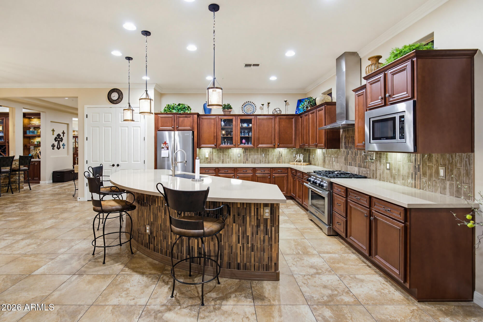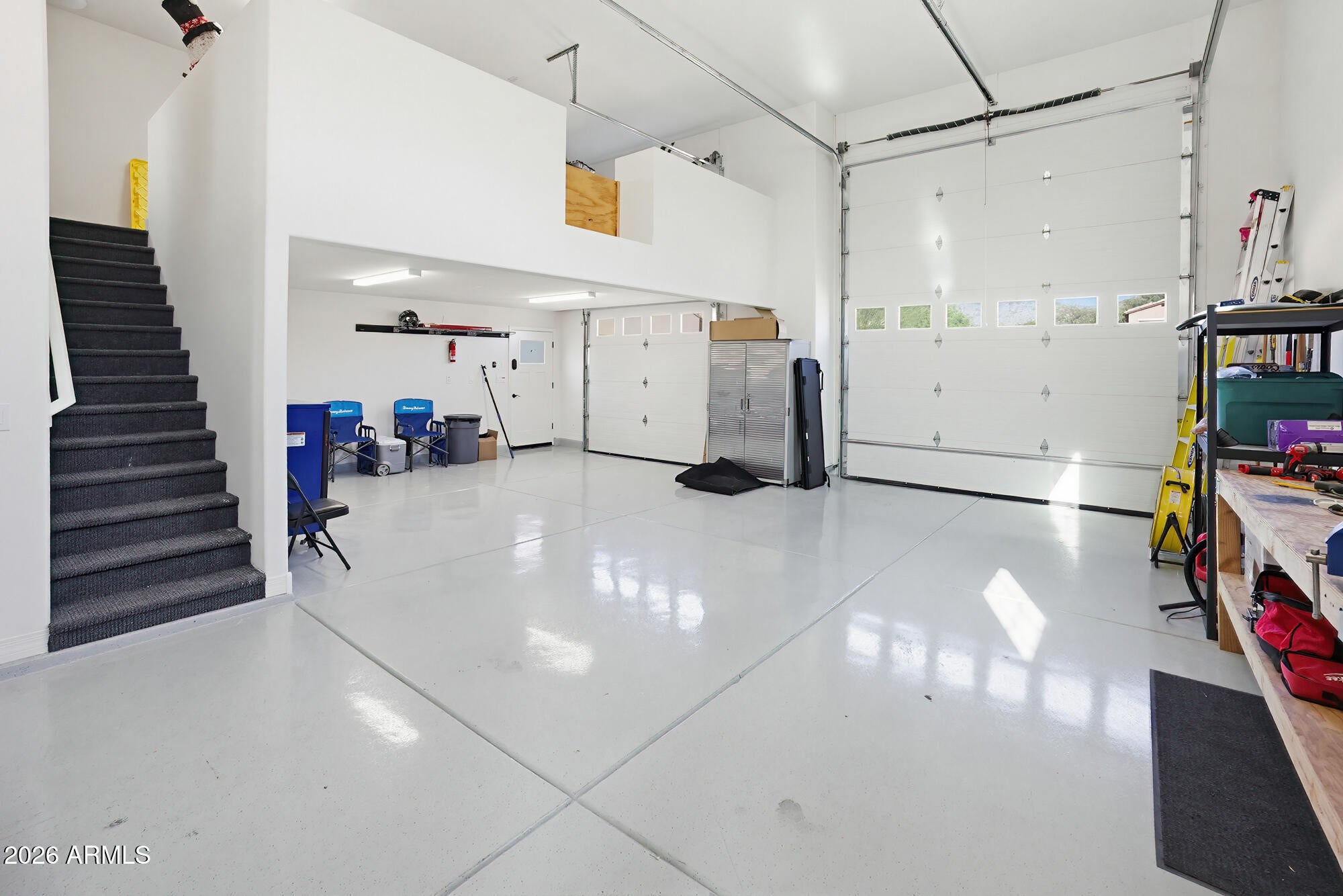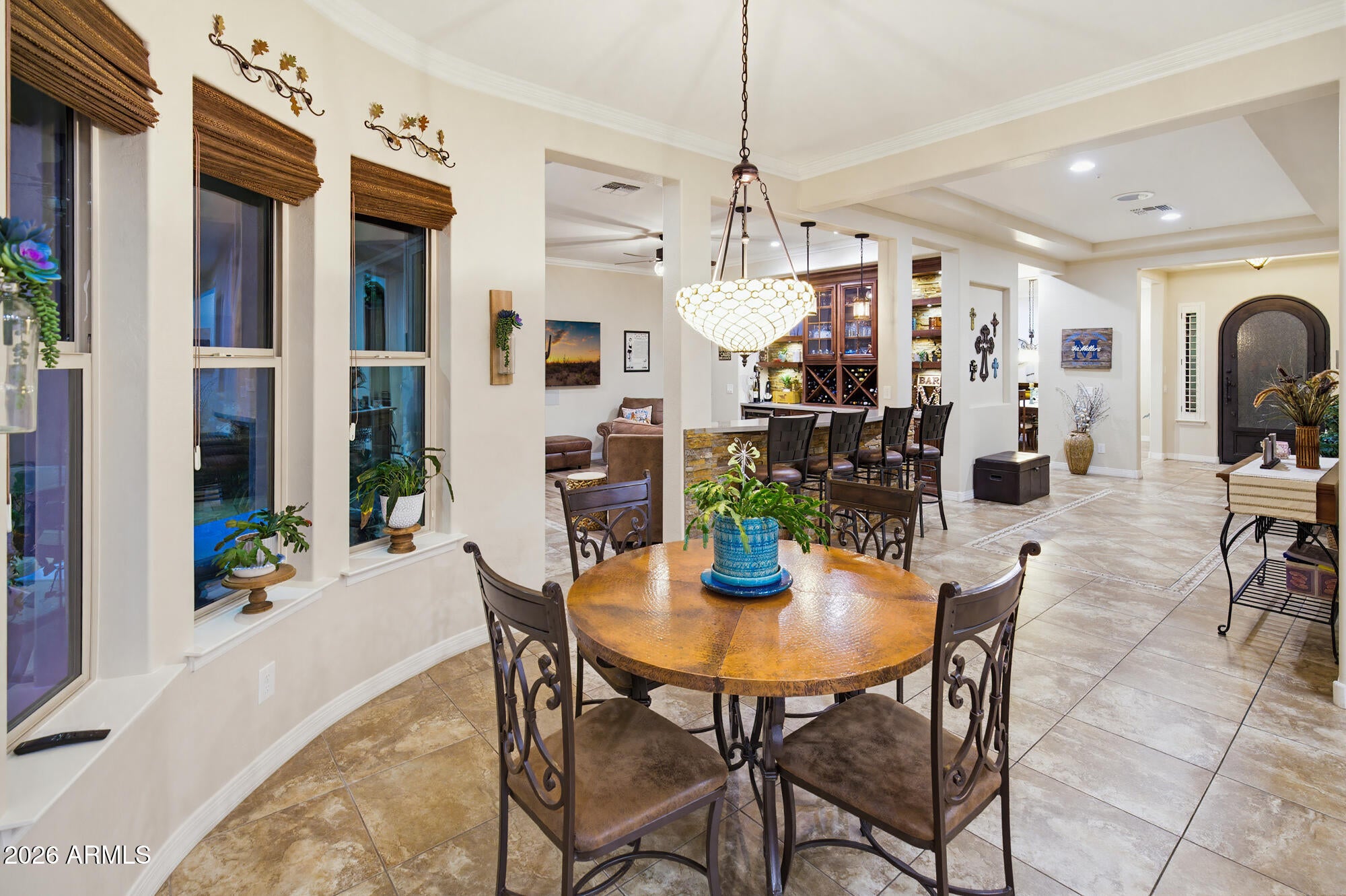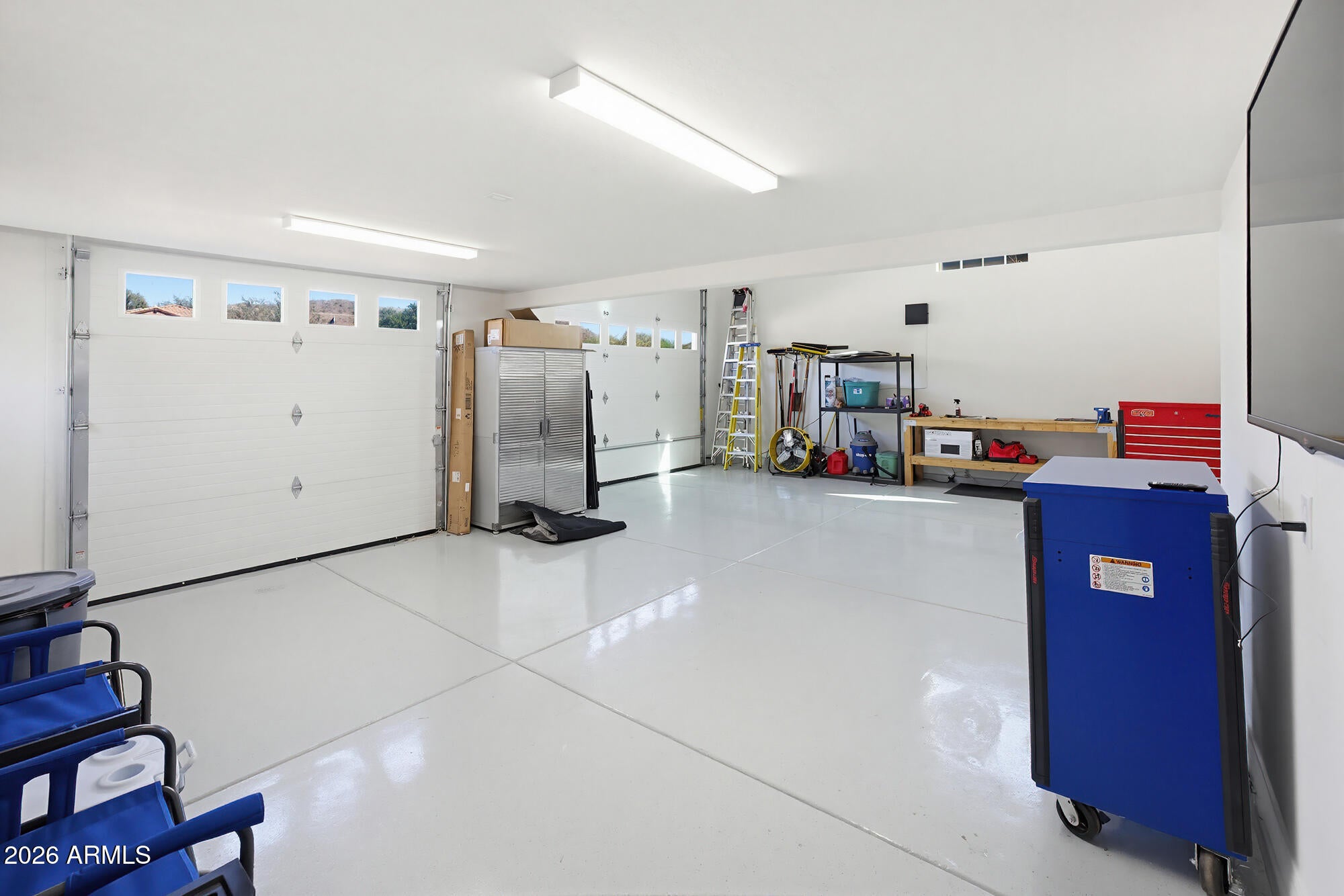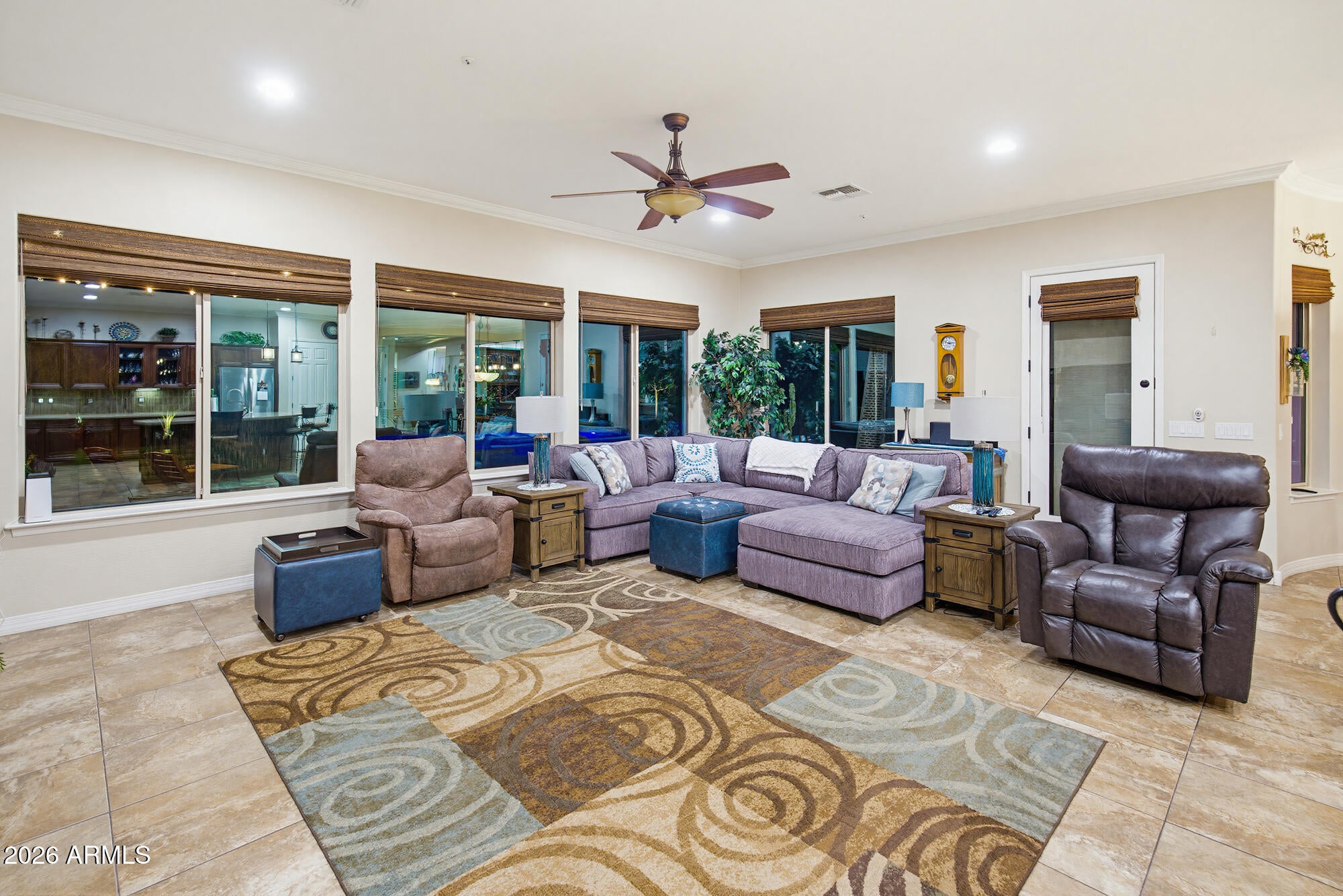 Welcome to luxury living in a gated community within Vista Montana. Situated on nearly an acre, this exceptional property blends privacy, functionality, and resort-style design in one unforgettable setting. From the moment you arrive, youll appreciate the expansive lot, elegant curb appeal, and thoughtfully designed layout. Inside, the home offers spacious open living areas, high ceilings, and seamless indoor-outdoor flowperfect for both everyday living and entertaining. The chefs kitchen anchors the heart of the home with rich cabinetry, quartz countertops, generous prep space, and a large island ideal for gathering. Expansive windows frame views of the backyard oasis and fill the home with natural light. Step outside to your private resort: a stunning pool and spa with water feature, expansive paver patios, lush green lawn, and multiple entertaining areas. Whether hosting under the covered patio or enjoying a quiet Arizona evening by the fire feature, this backyard delivers.Car enthusiasts and hobbyists will love the oversized RV garage (32x52 with 14high door) complete with a custom man cave featuring its own kitchenette and bath perfect for guests, projects, or the ultimate retreat space. Additional Highlights include: nearly acre lot, gated community, resort style pool/spa, RV garage with lift capability and 8 car capacity, private man cave with kitchenette and bath, OWNED SOLAR for energy efficiency, Generous storage and workspace.This is more than a home - its an Arizona lifestyle property built for entertaining storing the toys and living comfortably year round.