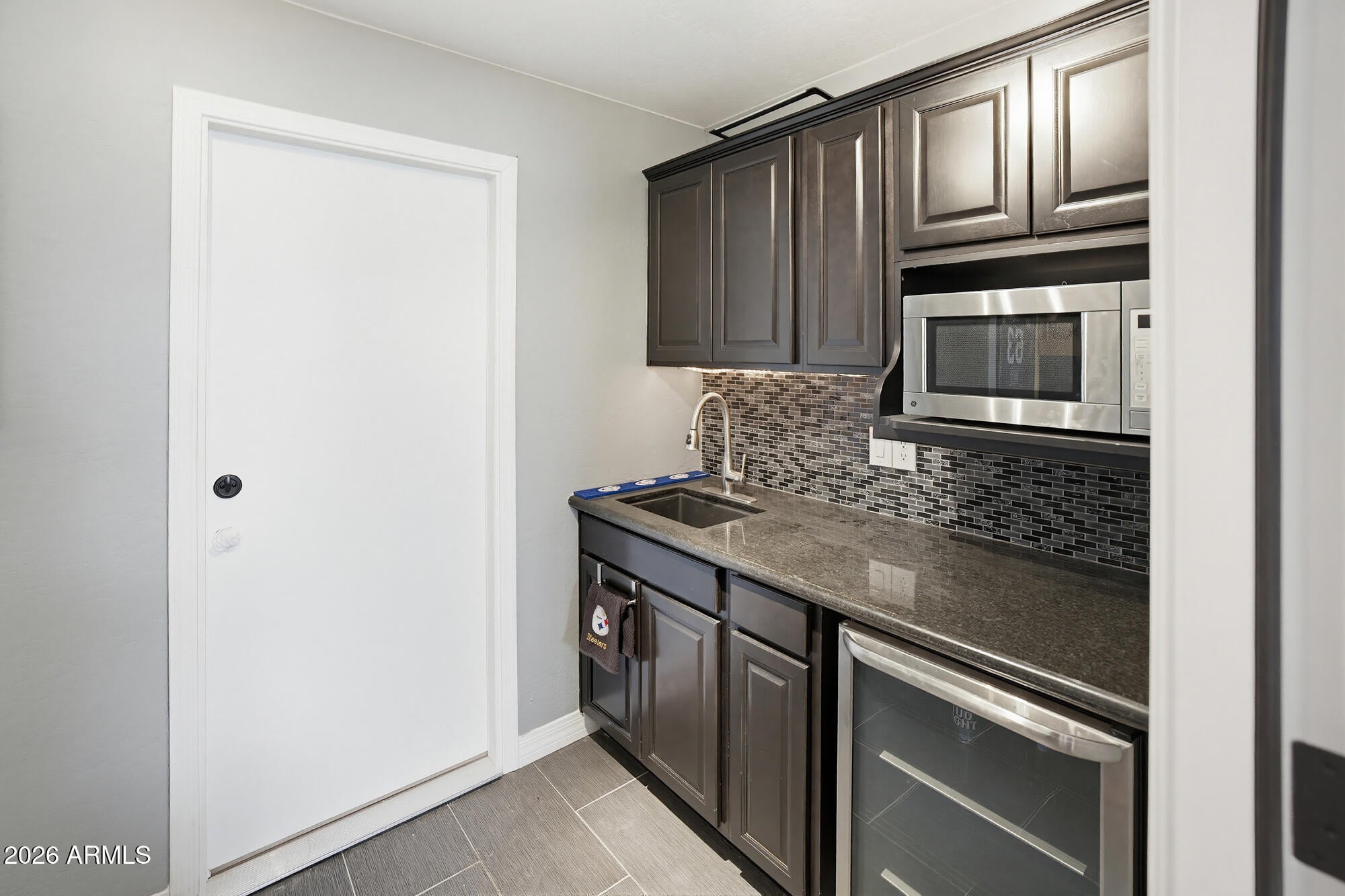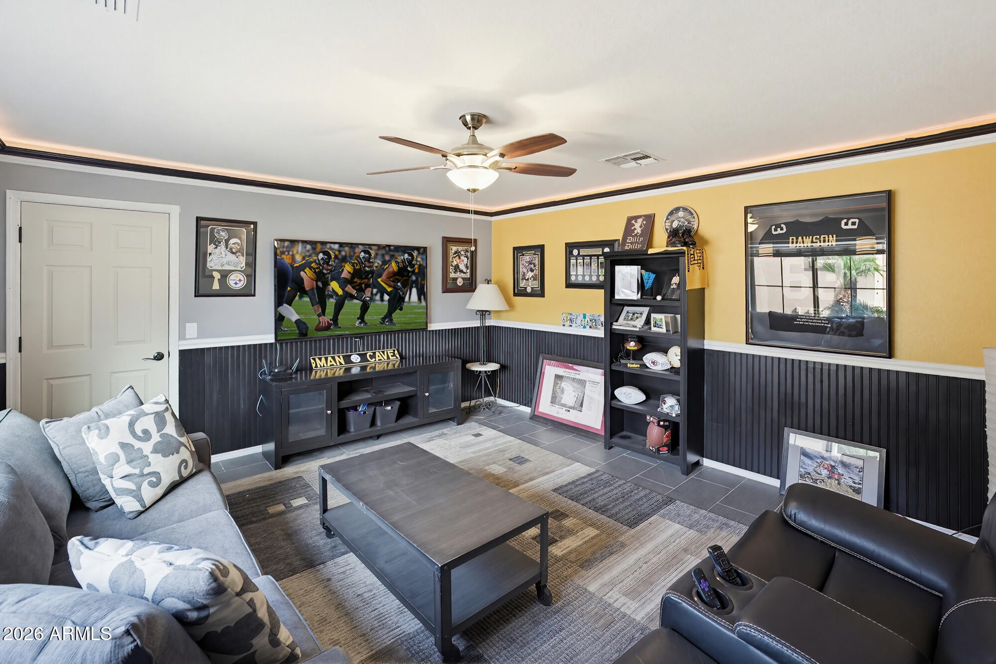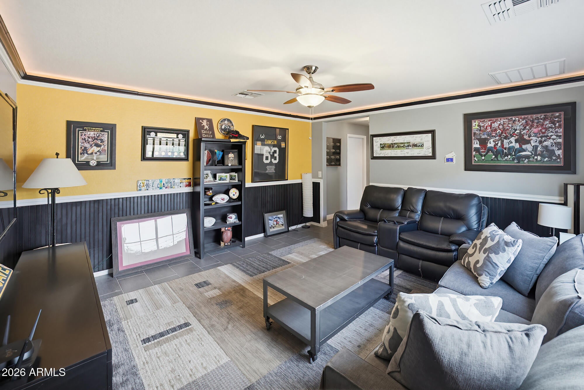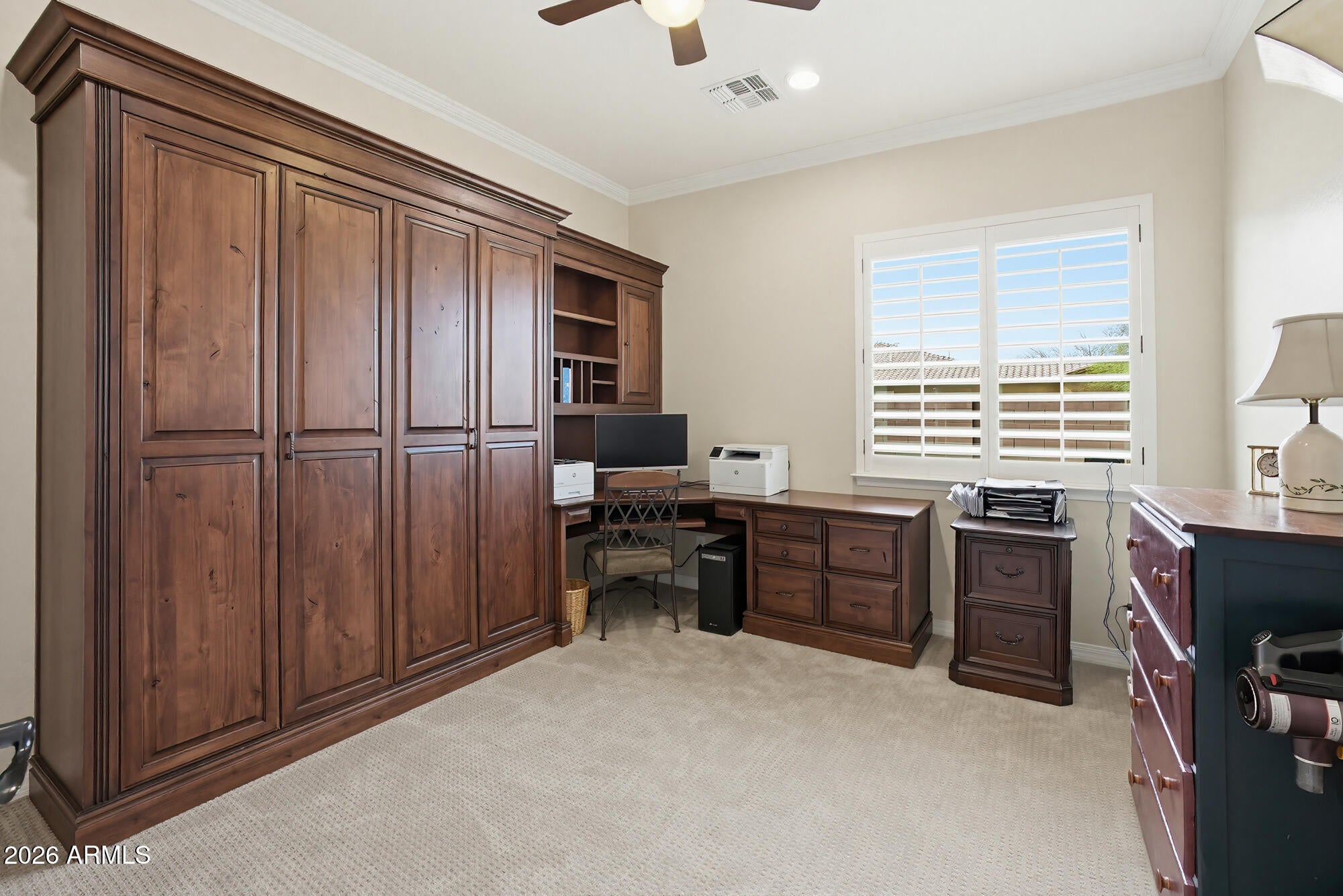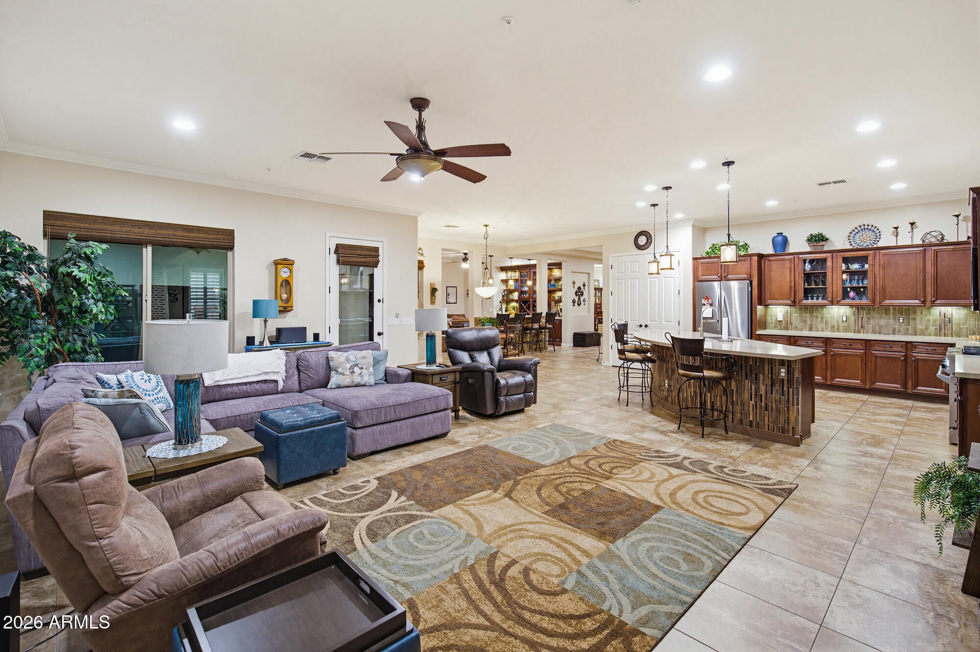 Welcome to luxury living in a gated community within Vista Montana. Situated on nearly an acre, this exceptional property blends privacy, functionality, and resort-style design in one unforgettable setting. From the moment you arrive, youll appreciate the expansive lot, elegant curb appeal, and thoughtfully designed layout. Inside, the home offers spacious open living areas, high ceilings, and seamless indoor-outdoor flowperfect for both everyday living and entertaining. The chefs kitchen anchors the heart of the home with rich cabinetry, quartz countertops, generous prep space, and a large island ideal for gathering. Expansive windows frame views of the backyard oasis and fill the home with natural light. Step outside to your private resort: a stunning pool and spa with water feature, expansive paver patios, lush green lawn, and multiple entertaining areas. Whether hosting under the covered patio or enjoying a quiet Arizona evening by the fire feature, this backyard delivers.Car enthusiasts and hobbyists will love the oversized RV garage (32x52 with 14high door) complete with a custom man cave featuring its own kitchenette and bath perfect for guests, projects, or the ultimate retreat space. Additional Highlights include: nearly acre lot, gated community, resort style pool/spa, RV garage with lift capability and 8 car capacity, private man cave with kitchenette and bath, OWNED SOLAR for energy efficiency, Generous storage and workspace.This is more than a home - its an Arizona lifestyle property built for entertaining storing the toys and living comfortably year round.
