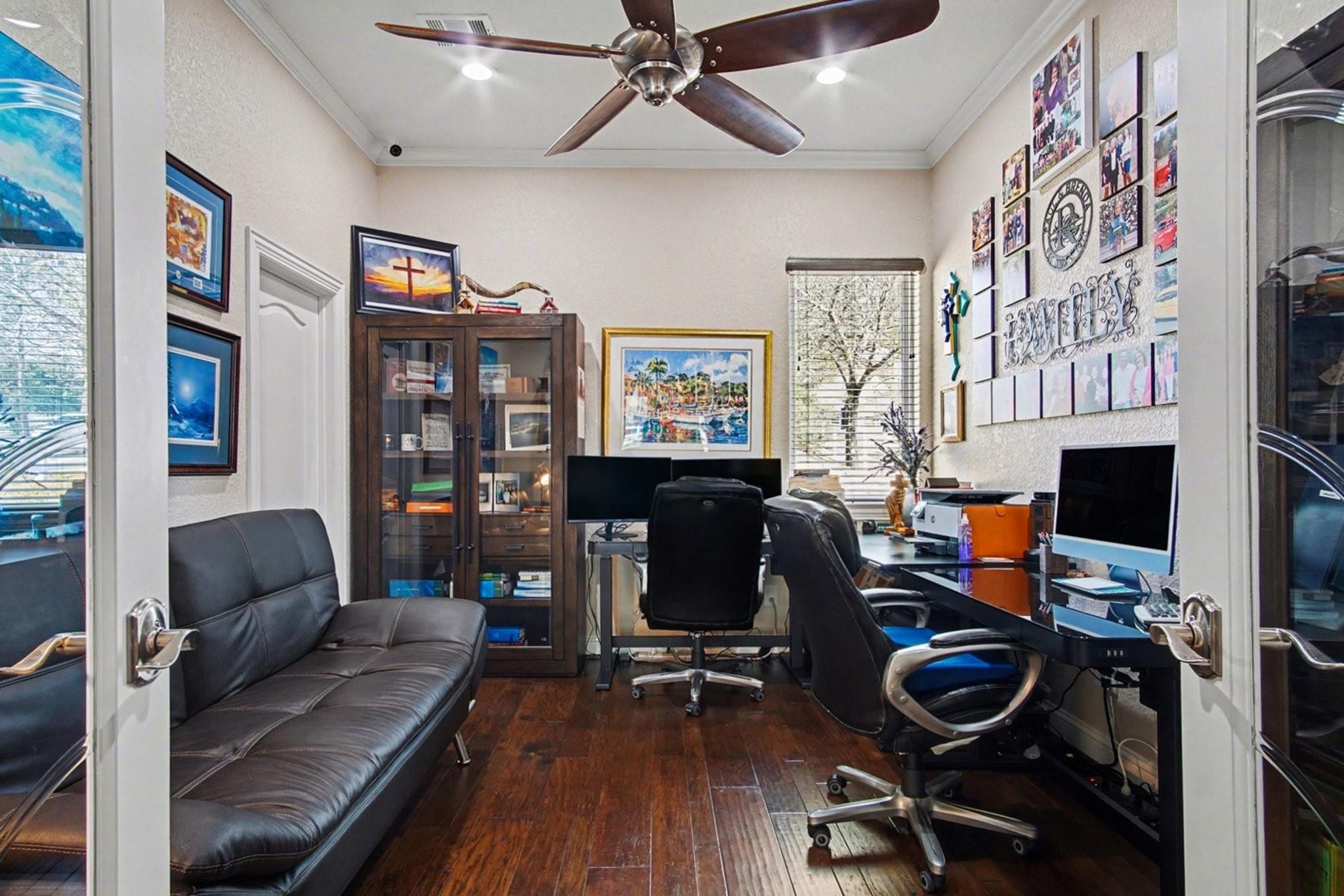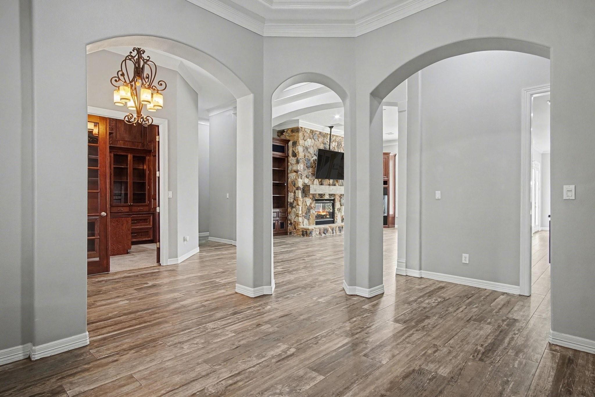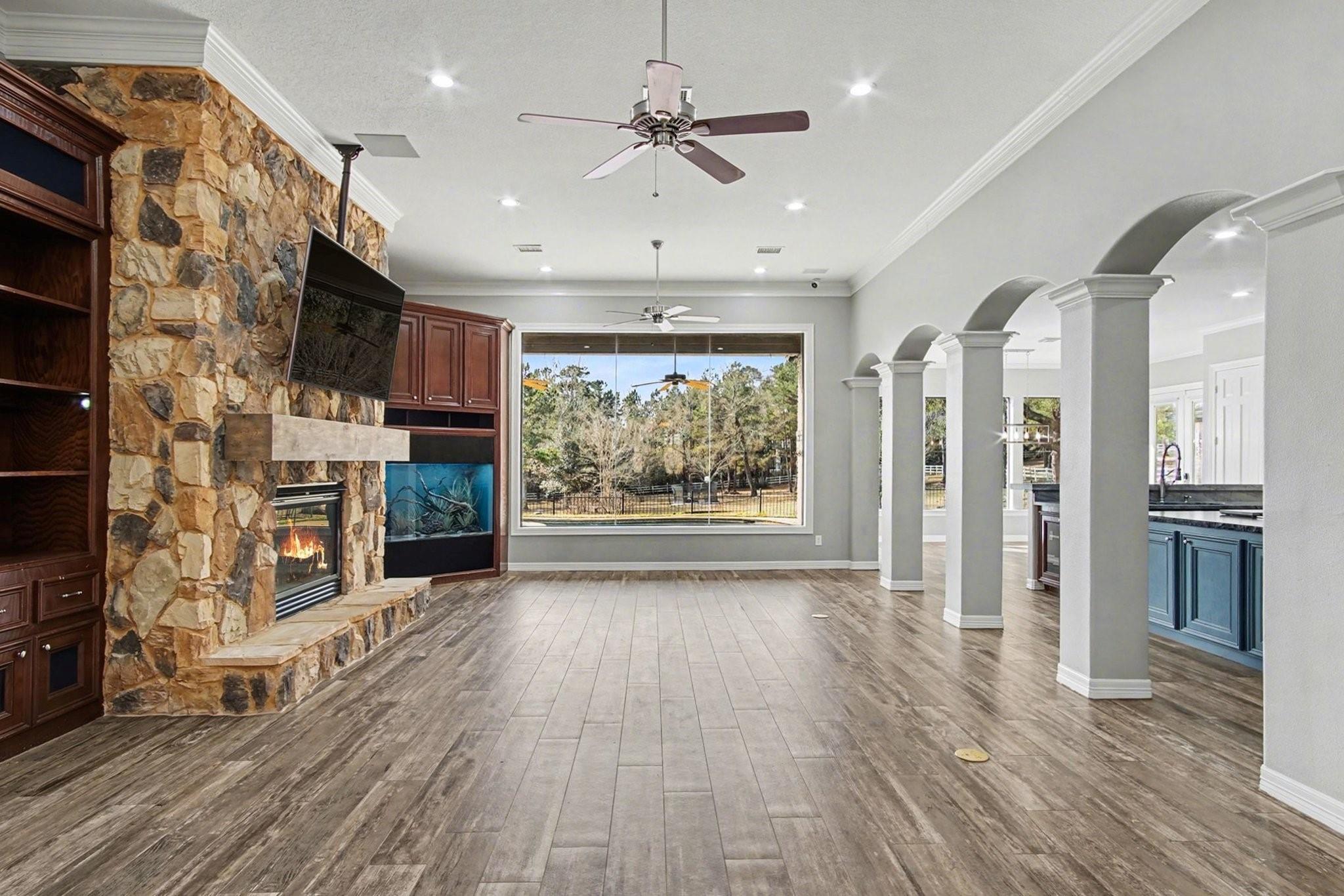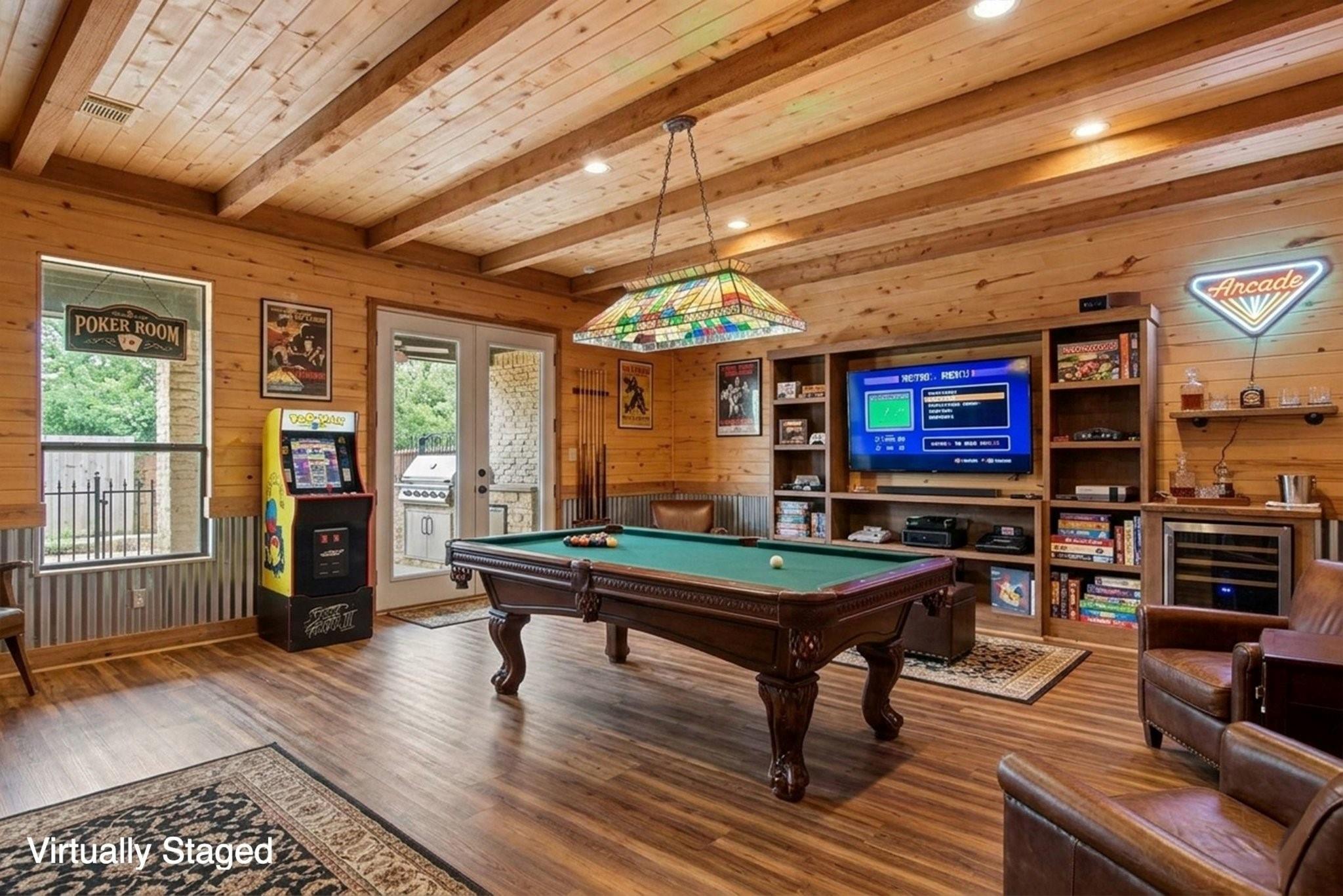 Enter through your private gated drive and experience 7 breathtaking acres of pure Texas luxury. This corner-lot estate delivers immense privacy. The main one-story home features a sprawling layout w/ four spacious bedrooms, four full baths, a private study w/ custom built-ins, & a separate game room w/ its own entrance.