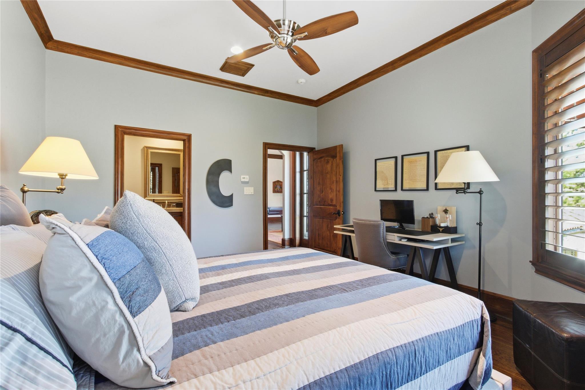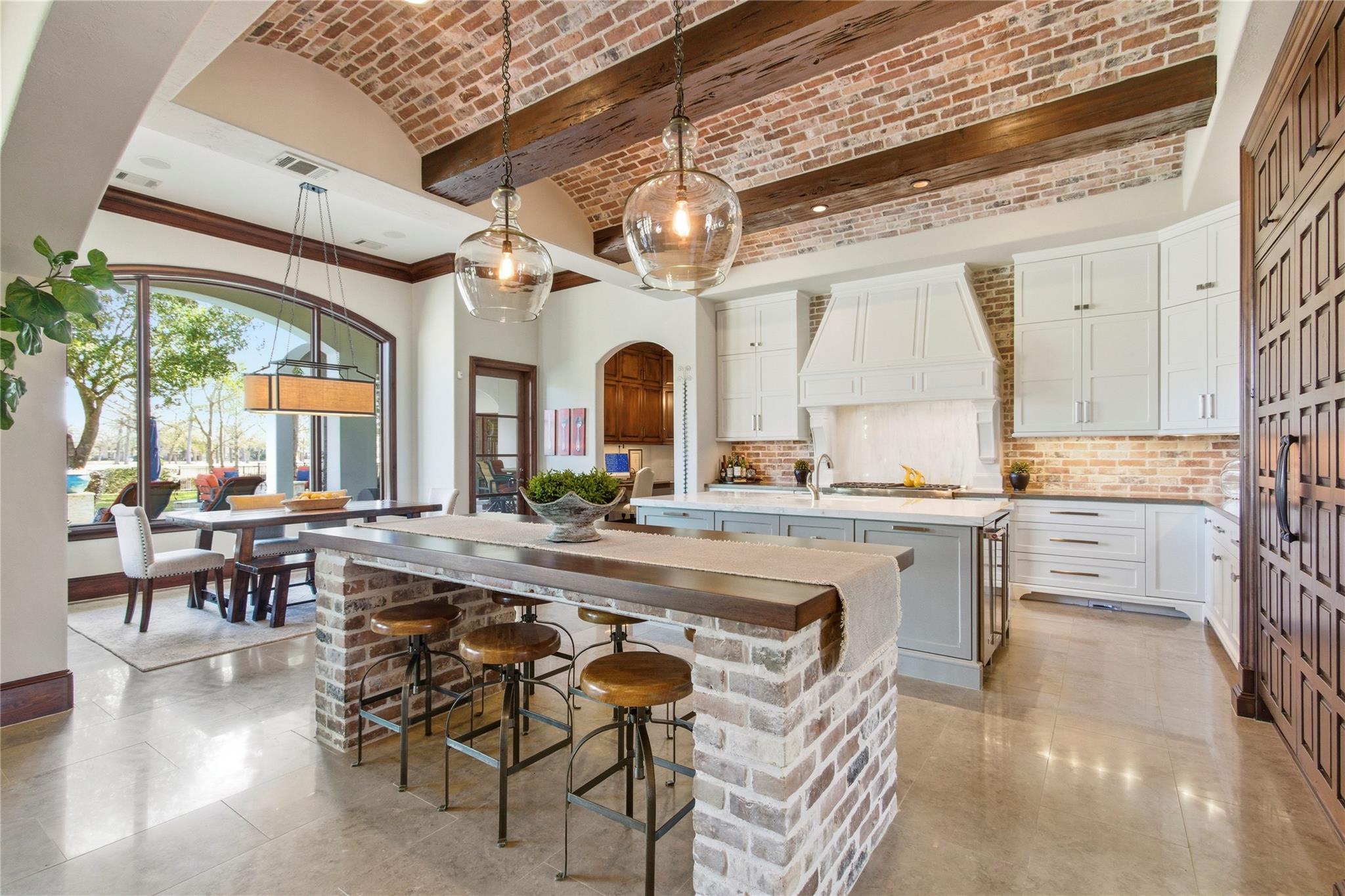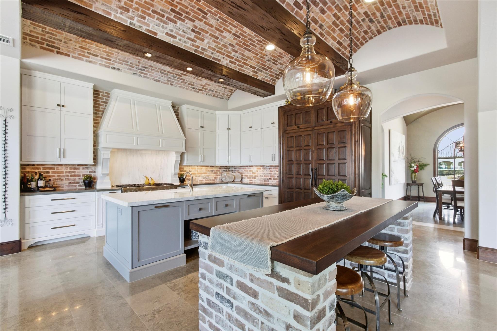 Enter through your private gated drive and experience 7 breathtaking acres of pure Texas luxury. This corner-lot estate delivers immense privacy. The main one-story home features a sprawling layout w/ four spacious bedrooms, four full baths, a private study w/ custom built-ins, & a separate game room w/ its own entrance. An oversized flex space near the secondary bedrooms offers endless possibilities. The chefs kitchen is equipped w/ premium Wolf appliances, while walls of windows frame serene views of your rolling property. The oversized primary suite offers exceptional space & storage, plus an additional private en-suite bedroom upstairs. A separate guest home built in 2020 showcases high-end finishes, Viking appl, hardwood floors, & crown molding perfect for the in-laws. Enjoy beautifully landscaped grounds, front & back porches, a resort-style pool and spa, pool bath, full-house generator, and a two-story barn perched atop the hill. A new roof completes this extraordinary estate.