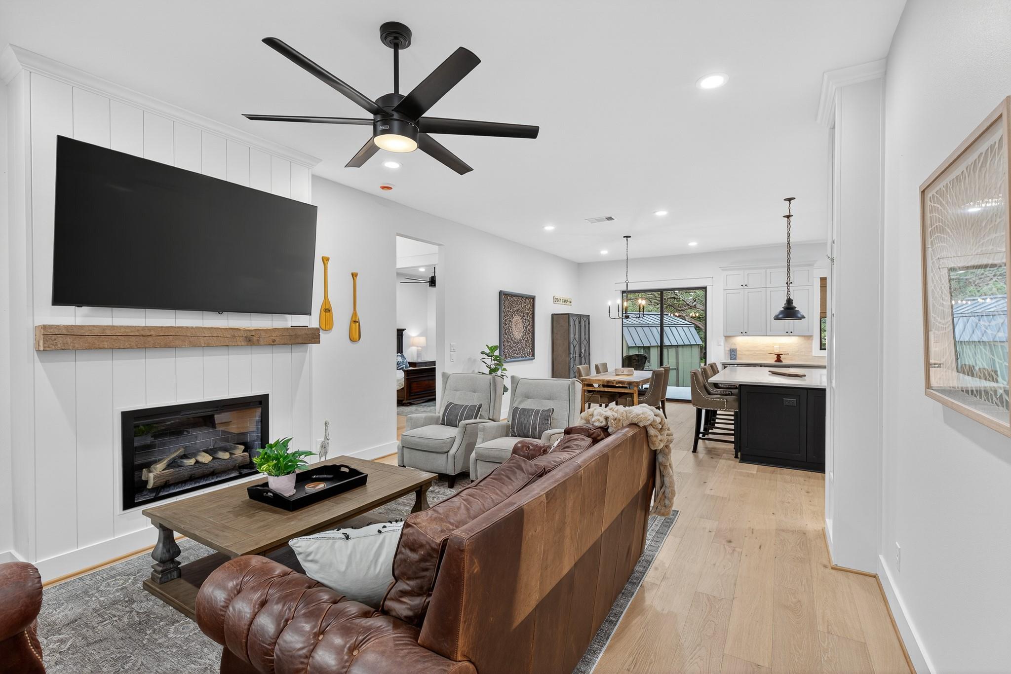 Experience Lake LBJ majesty in this newly constructed, custom Texas Hill Country Chic retreat that delivers unmatched serenity, beauty and superior craftsmanship. Built upon the legacy of those who cherished this land before, the architecture is thoughtfully designed to compliment perfectly the natural beauty of the lush, rolling terrain. Towering clean line elevations, expansive banks of windows and huge covered porches situate the home beneath a canopy of ancient sculpted oaks that reach toward the lake. When the builder was asked what corners were cut during the construction, he replied without hesitation, ABSOLUTELY NONE. And it shows! Premium upgraded features include hardwood flooring throughout, 8 ton highly efficient HVAC, complete spray foam insulation, standing seam metal roof, heated pool, crushed ice maker, wine chiller, custom window treatments and climate controlled owners storage room. Five spacious bedrooms (two with en suite baths,) three full baths with dual vanities, home office/man cave with half bath, warm and open living/dining/kitchen, HUGE island/bar for entertaining, and the seamless flow from indoor to outdoor living and dining- you will LOVE how the property lives. Take a dip in the heated cowboy pool, relax around the built in fire pit, and go jump in the lake! Custom metal fabricated dual lift dock, quiet channel on the cusp of open lake provides serenity and privacy with instant access to everything Lake LBJ. Whether youre escaping for a weekend or lifetime, or searching for a lucrative STR investment, LOOK NO FURTHER! The house is TURN KEY - thoughtfully and beautifully appointed, and will sell fully furnished. There is no better time to start enjoying lake living, and no better property on Lake LBJ.