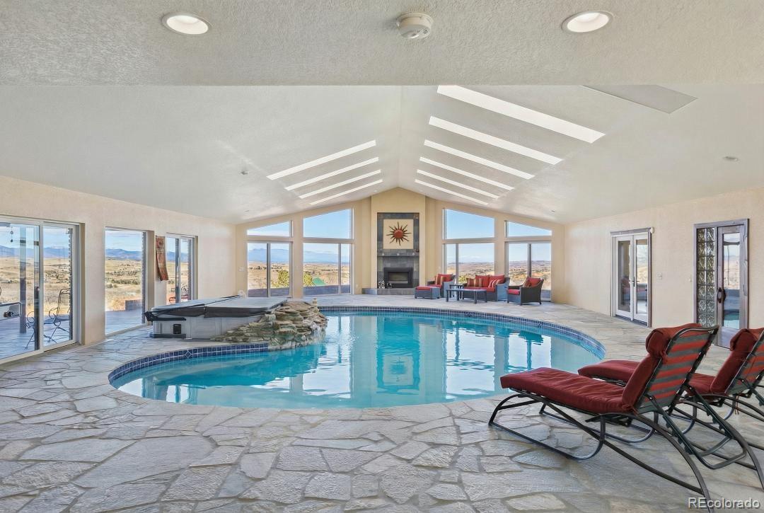 Perched on one of the highest elevations within desirable Indian Creek Ranch, the stunning Sacco Estate is situated perfectly on 5 acres at the end of a quiet cul-de-sac. A black iron gate opens to reveal this one of a kind 10,239 sq ft estate featuring hardwood floors, 3 fireplaces, skylights, breathtaking mtn & city views. For the true culinary enthusiast, the kitchen features Silestone quartz countertops, SS appls, island/breakfast bar, built-in desk, 55 high custom cabinets, amazing mountain views & downtown Denver city views. A unique aspect of this estate is its exceptional design, its configured to accommodate extended family w/two M-I-L suites, rental income or cater to multigenerational living through its distinct west & east wing separation. East wing has a mother-in-law suite w/soaring ceilings, stone gas fireplace, full-sized kitchen, nook, bath, laundry & separate main floor entry. Youll love the extraordinary pool & entertaining room, which is unlike any youve ever seen; featuring saltwater swimming pool, hot tub, dedicated bar, indoor sauna & cascading waterfall. Not interested in a pool? Convert this grand room into an indoor pickleball or basketball court, ballroom, sizable gym, whatever you desire! The BRs including the primary BR have en suite remodeled baths! Youll love the attached 3-Car garage & detached garage/barn w/room for 2 cars and 2 horse stalls w/paddocks. Newer windows & roof, Solar (paid for), 2 septic systems! Fire Hydrant off driveway - low insurance ! Community clubhouse, playground, equestrian arena & bridle path thru the neighborhood. Take an adventure up the canyon w/Pikes Natl Park, OHV riding at Rampart Range, world-class rafting & fishing. Sedalia offers a small-town vibe w/easy access to city amenities, shopping, restaurants & C470/I25. Sedalia homes run 300 - 450 a sq ft...this estate is 161 a sq ft! HOA, great schools, nice neighbors! Acquiring an estate such as this is truly a rare opportunity!