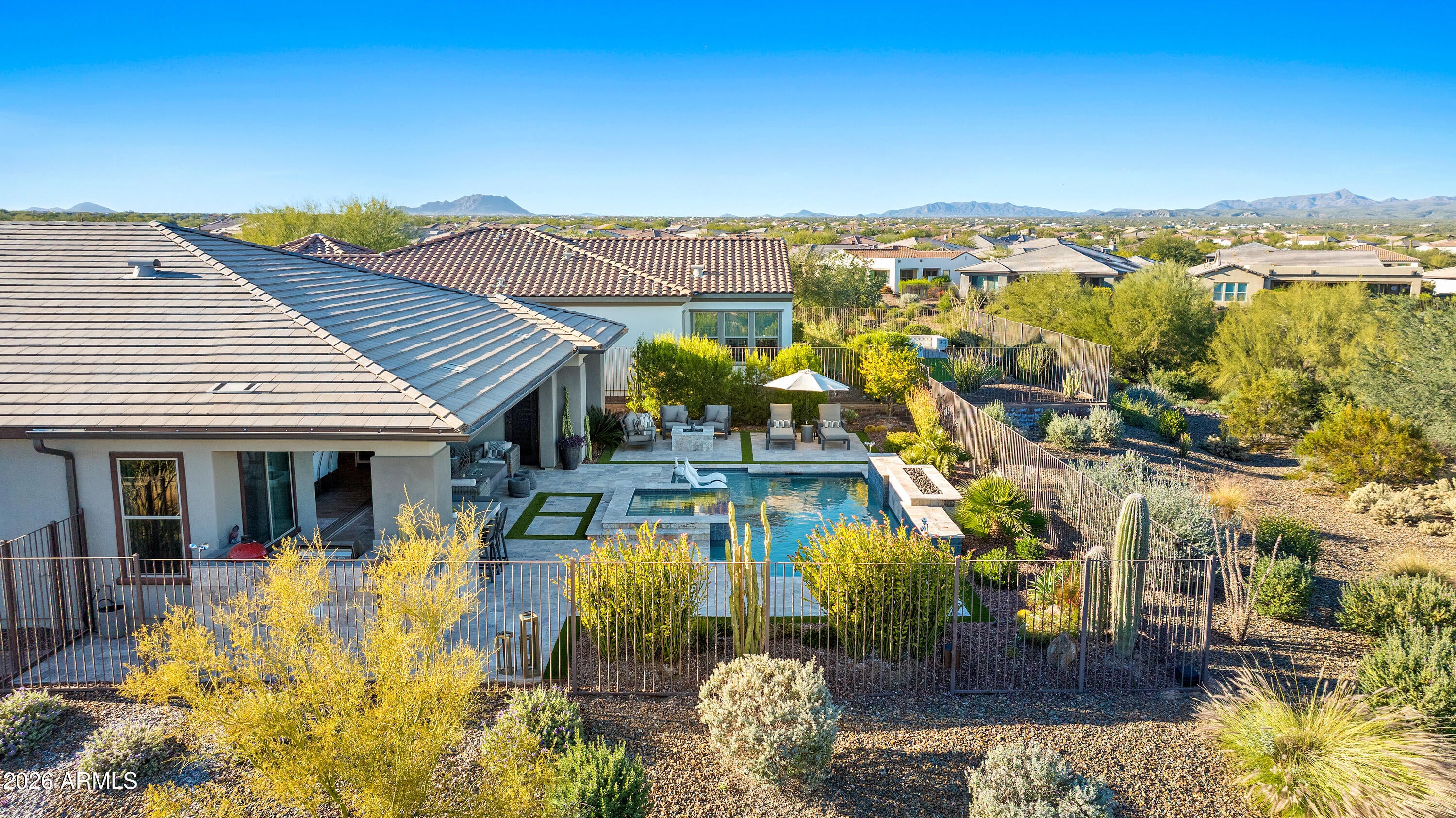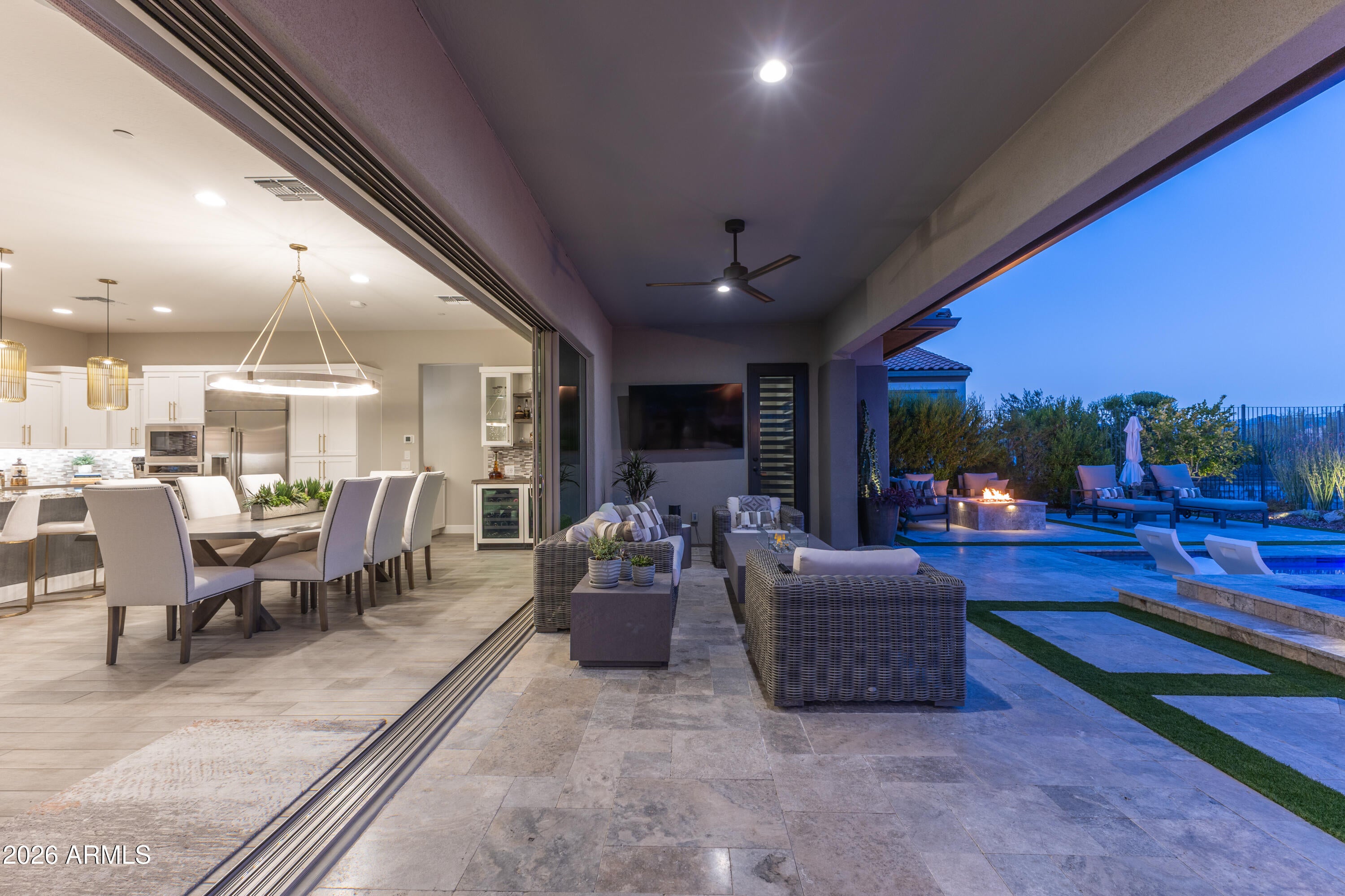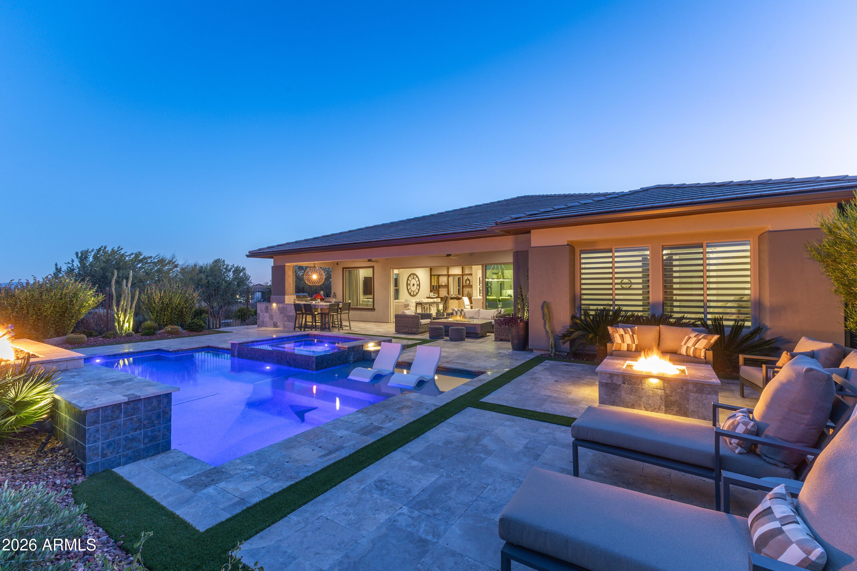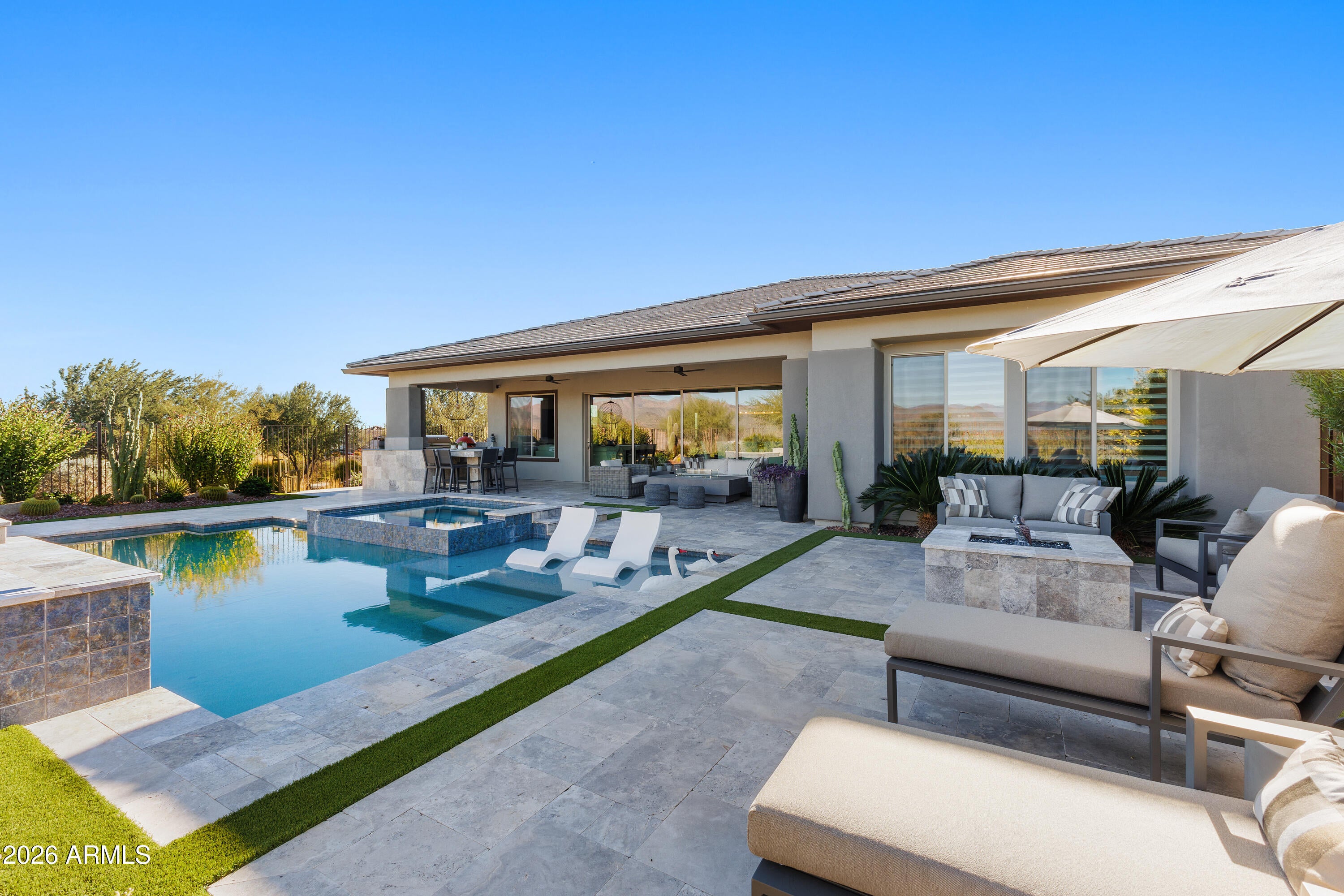 Experience resort-style living at its finest in this highly upgraded Cordoba with casita, ideally situated on a premium corner lot with only one neighboring home. Offering 2,661 sq. ft., this thoughtfully designed residence features 2 bedrooms, 3.5 baths, a private office/den, and an open-concept floor plan perfect for both everyday living and entertaining. High-end, timeless finishes shine throughout, complemented by designer lighting, motorized window shades, and elegant plantation shutters. The gourmet kitchen is a true showstopper with quartz countertops, a dramatic waterfall granite island, premium appliances, beverage center with wine fridge, walk-in pantry with a second refrigerator, and abundant storage. The living area is anchored by a stunning fireplace and opens seamlessly through an expanded multi-slide patio door to a jaw-dropping backyard. Enjoy breathtaking mountain views from your own private oasis featuring a pool, spa, fire pit, built-in BBQ, smoker, and barperfect for entertaining Arizona-style. The attached casita includes a separate living room with a wet bar and an under-counter refrigerator, offering ideal guest or flex space. Additional highlights include a 4-car air-conditioned garage with epoxy flooring and built-in cabinets, water softener, reverse osmosis system, and meticulous attention to detail throughout. This exceptional home embodies luxury, privacy, and the coveted Trilogy at Verde River lifestyle.Trilogy at Verde River is a resort-style community featuring something for everyone! Golf, tennis, pickleball, bocce ball, heated lap pool and swimming pool, hot tub, fitness center, demonstration kitchen, and a 7.5-acre dog park. The community center has casual and fine dining, a luxury spa, and an events center. Trilogy at Verde River is adjacent to the Tonto National Forest and is situated in the middle of miles and miles of hiking and biking trails. Live like youre on vacation!