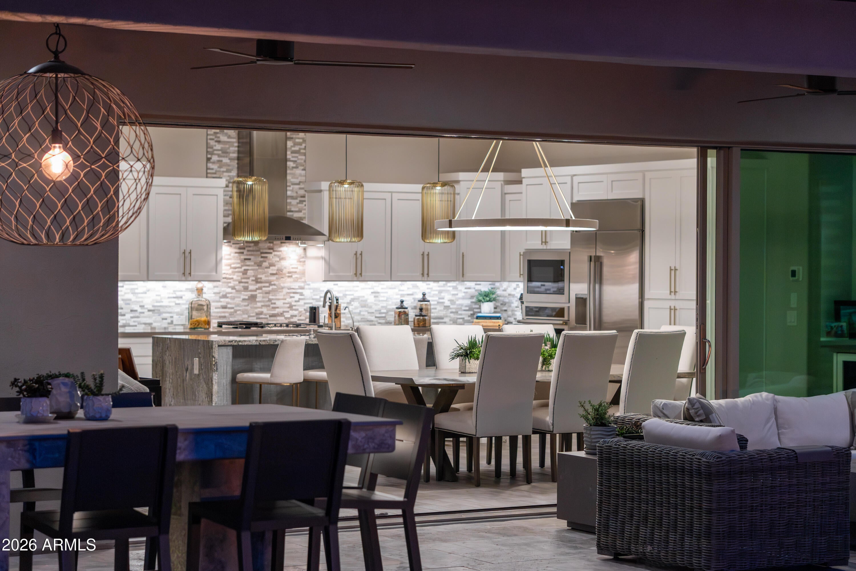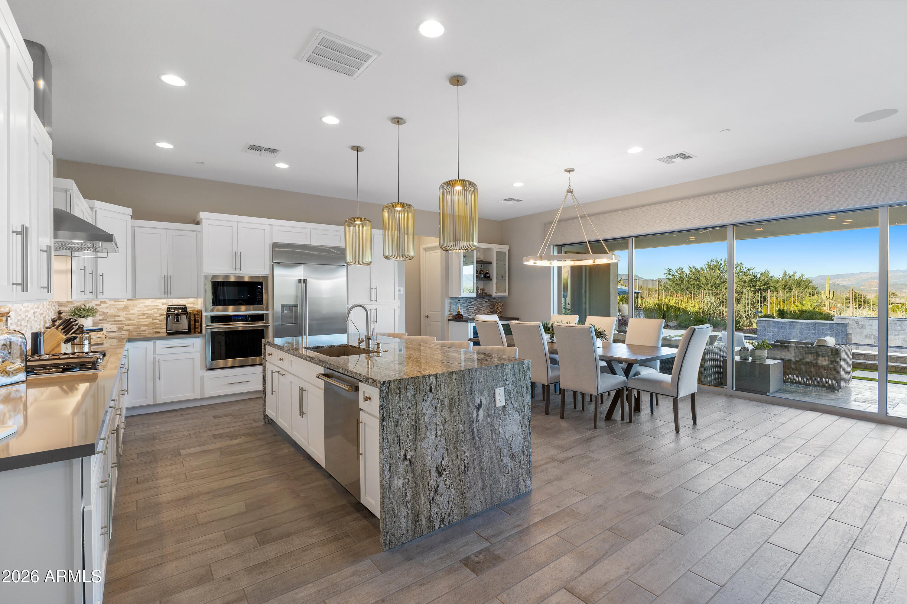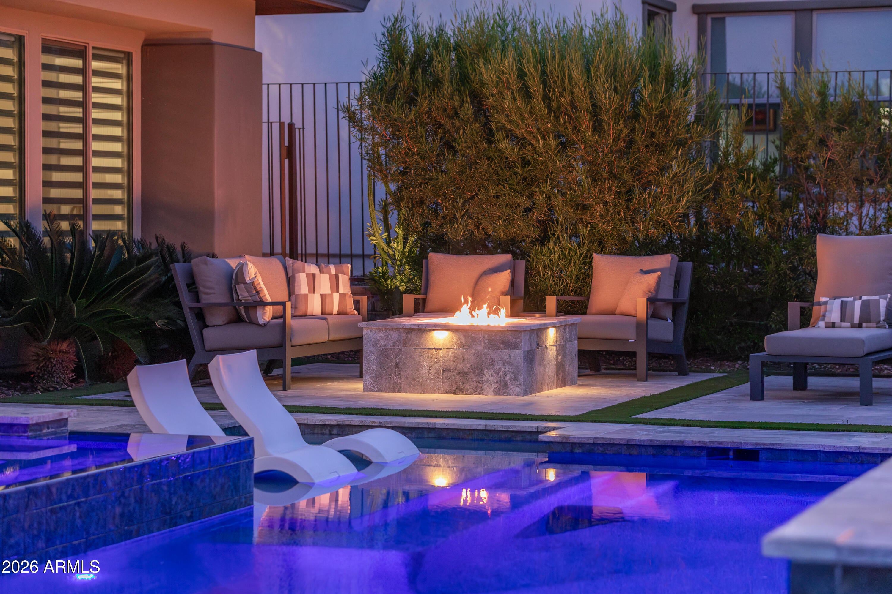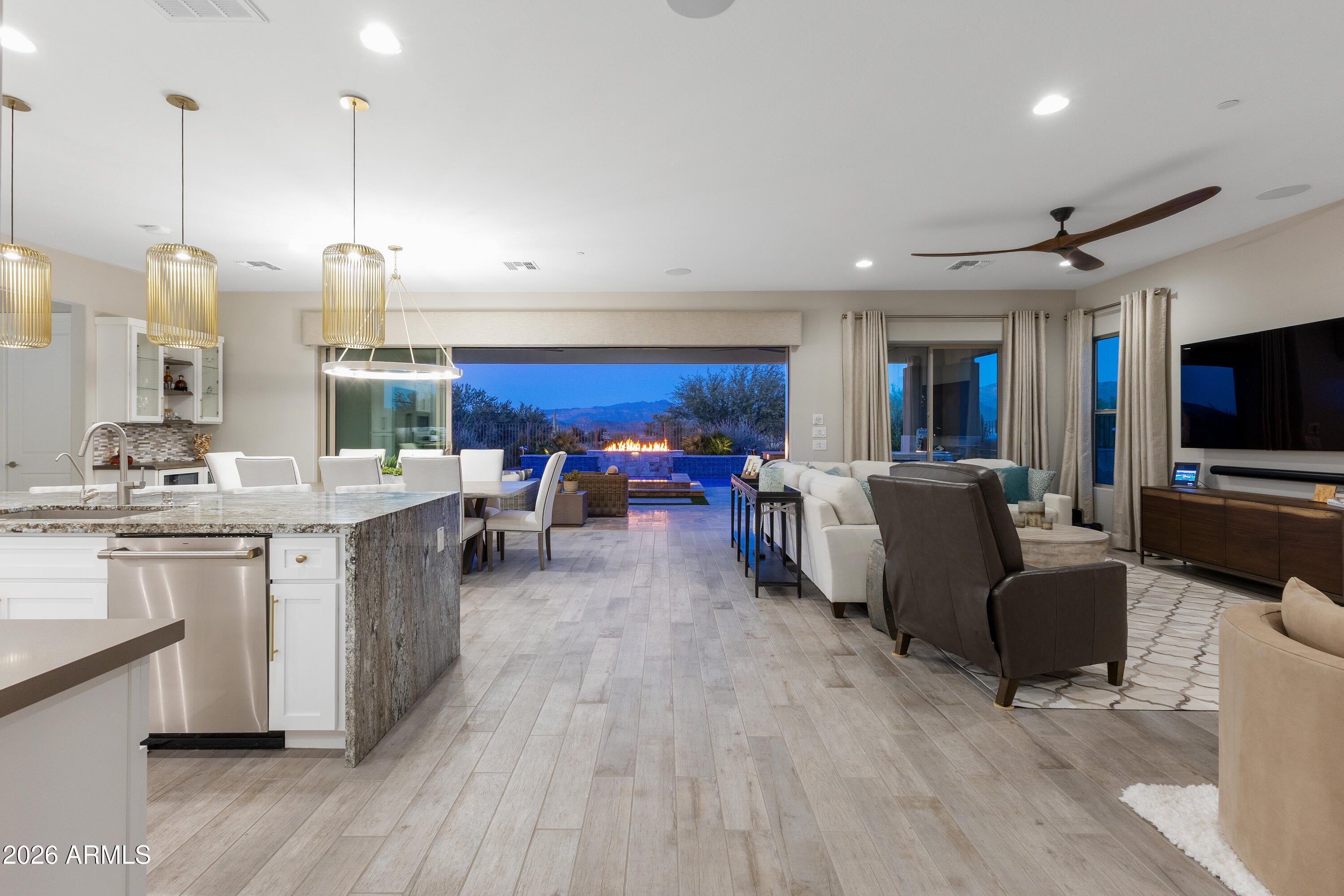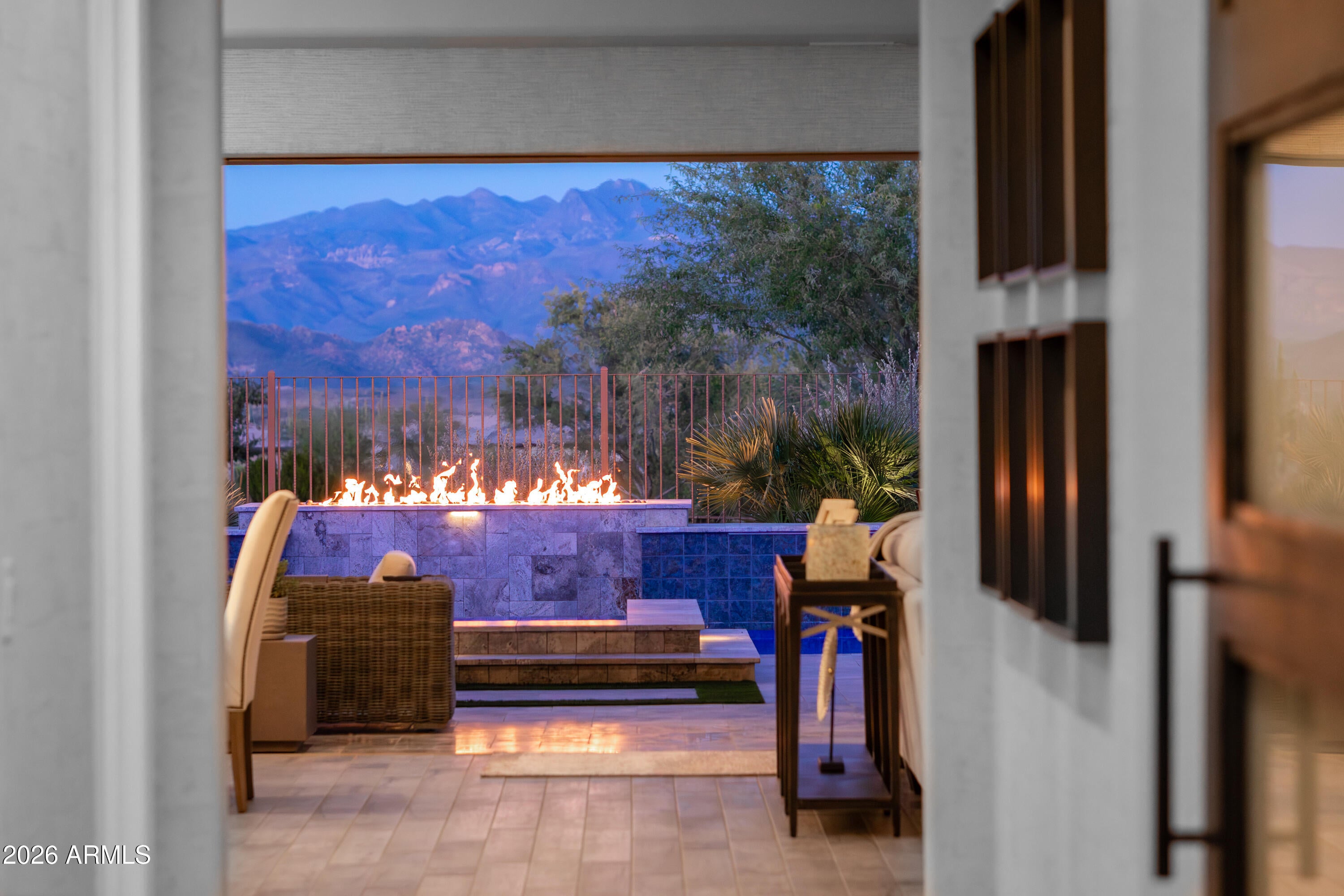 Experience resort-style living at its finest in this highly upgraded Cordoba with casita, ideally situated on a premium corner lot with only one neighboring home. Offering 2,661 sq. ft., this thoughtfully designed residence features 2 bedrooms, 3.5 baths, a private office/den, and an open-concept floor plan perfect for both everyday living and entertaining. High-end, timeless finishes shine throughout, complemented by designer lighting, motorized window shades, and elegant plantation shutters. The gourmet kitchen is a true showstopper with quartz countertops, a dramatic waterfall granite island, premium appliances, beverage center with wine fridge, walk-in pantry with a second refrigerator, and abundant storage. The living area is anchored by a stunning fireplace and opens seamlessly through an expanded multi-slide patio door to a jaw-dropping backyard. Enjoy breathtaking mountain views from your own private oasis featuring a pool, spa, fire pit, built-in BBQ, smoker, and barperfect for entertaining Arizona-style. The attached casita includes a separate living room with a wet bar and an under-counter refrigerator, offering ideal guest or flex space. Additional highlights include a 4-car air-conditioned garage with epoxy flooring and built-in cabinets, water softener, reverse osmosis system, and meticulous attention to detail throughout. This exceptional home embodies luxury, privacy, and the coveted Trilogy at Verde River lifestyle.Trilogy at Verde River is a resort-style community featuring something for everyone! Golf, tennis, pickleball, bocce ball, heated lap pool and swimming pool, hot tub, fitness center, demonstration kitchen, and a 7.5-acre dog park. The community center has casual and fine dining, a luxury spa, and an events center. Trilogy at Verde River is adjacent to the Tonto National Forest and is situated in the middle of miles and miles of hiking and biking trails. Live like youre on vacation!