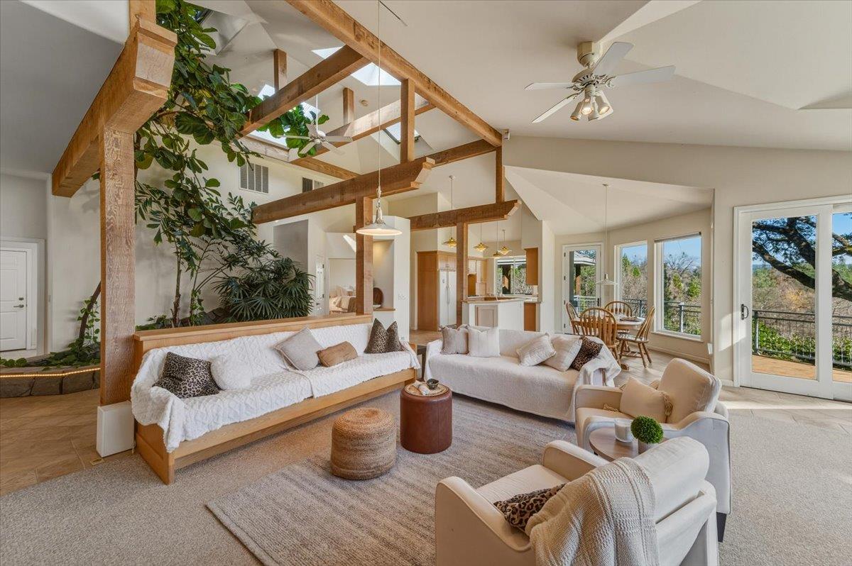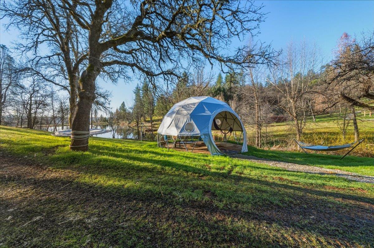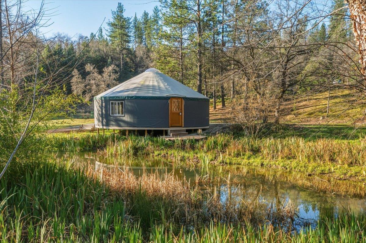 Magical, private, and truly ONE OF A KIND, this extraordinary gated estate offers 30 serene acres with a stunning pond, owned solar, comfortable main residence w/2-car garage, ADU w/2-car garage, yurt, geo-domes, abundant trail system, and multiple additional outbuildings - all thoughtfully positioned and hidden from view - creating an unmatched opportunity for multi-generational living, retreat potential, or private estate lifestyle. From the moment you enter through the private gate, a sense of calm and possibility surrounds you. The picturesque drive opens to a breathtaking pond reflecting sky and trees, setting the tone for this peaceful and inspiring property. The main home is warm, open, and filled with natural light, designed for comfortable living and effortless entertaining. Expansive windows capture sweeping water and land views while maintaining privacy. The thoughtful floor plan offers excellent flow, and the attached three-car garage provides everyday convenience. The private ADU features two bedrooms, 1 full & 1 half bath, ideal for guests, extended family, rental income, or caretaker housing, and also offers its own attached two-car garage, workshop, office space, with an additional flexible upper level perfect for an art studio, gym, crafting space, or storage. Outdoor amenities make this property truly exceptional. The large pond with private dock allows for kayaking and paddle activities at home. A high-quality yurt overlooks two ponds, creating a tranquil space for yoga, meditation, or guest retreat use. Unique geo-domes and an aerial arts space near the water add architectural character and creative flexibility. Formerly owned by a landscape designer, the grounds are thoughtfully developed and highly functional, featuring a tractor shed, greenhouses, wood shed, established orchard producing fresh fruit and berries, plus additional utility and storage structures, all positioned for privacy and minimal visual impact. An abundant trail system weaves throughout the acreage, offering endless opportunities for recreation, quiet reflection, and immersive connection to the natural beauty surrounding you. Located in a desirable private setting while remaining convenient to town, Rollins Lake, and major commuter routes, and approximately one hour to both Sacramento and Truckee. This property offers the rare combination of privacy, functionality, and accessibility. This is more than a home, its a private sanctuary offering space to live & thrive!