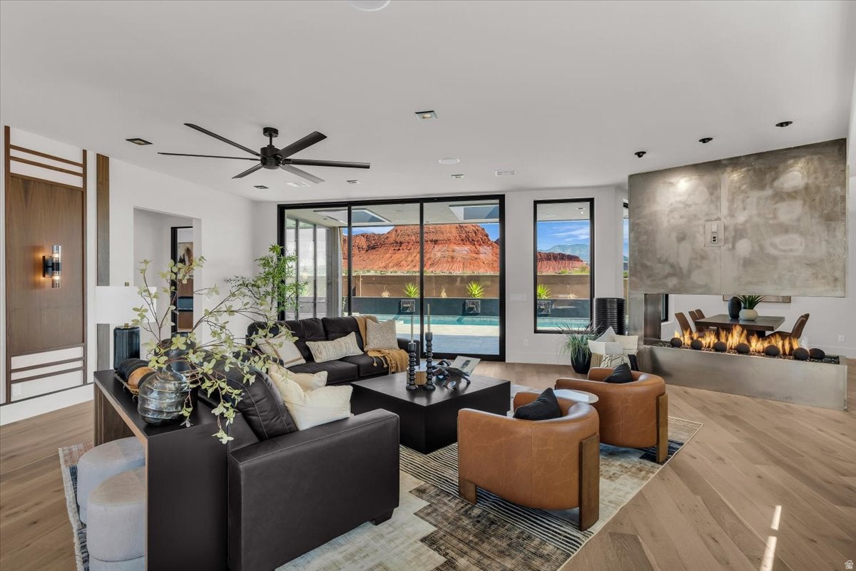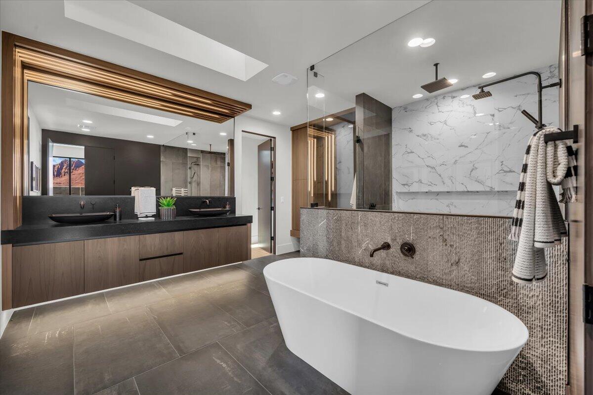 Nestled within the prestigious gated community of Entrada, this stunning residence offers captivating views of the majestic Red Mountains and Snow Canyon. Designed for luxury living, the open concept layout offers soaring ceilings, custom finishes and an abundance of natural light. The gourmet kitchen boasts a large island, custom cabinetry and high end appliances, flowing seamlessly into a spacious living room with floor to ceiling windows that frame the breathtaking scenery. The primary suite offers stunning views as well a generous walk in closet and spa inspired ensuite bath. Outdoors, enjoy a private oasis complete with a swim spa, putting green, water feature and expansive patio ideal for entertaining all set against the dramatic backdrop of the Red Mountain. An oversized garage with two storage rooms completes this exceptional home. Dont miss this opportunity to experience luxury living in Entrada, one of Southern Utahs premier gated communities.
