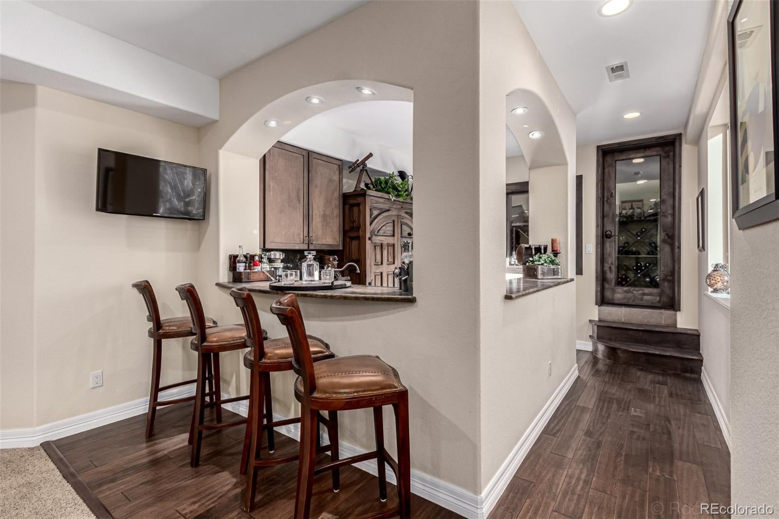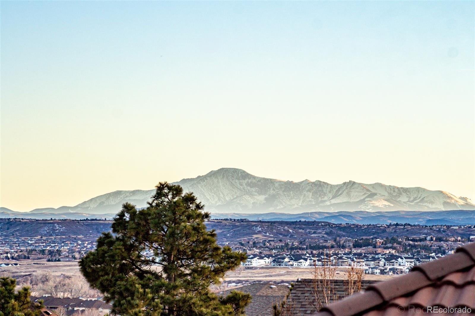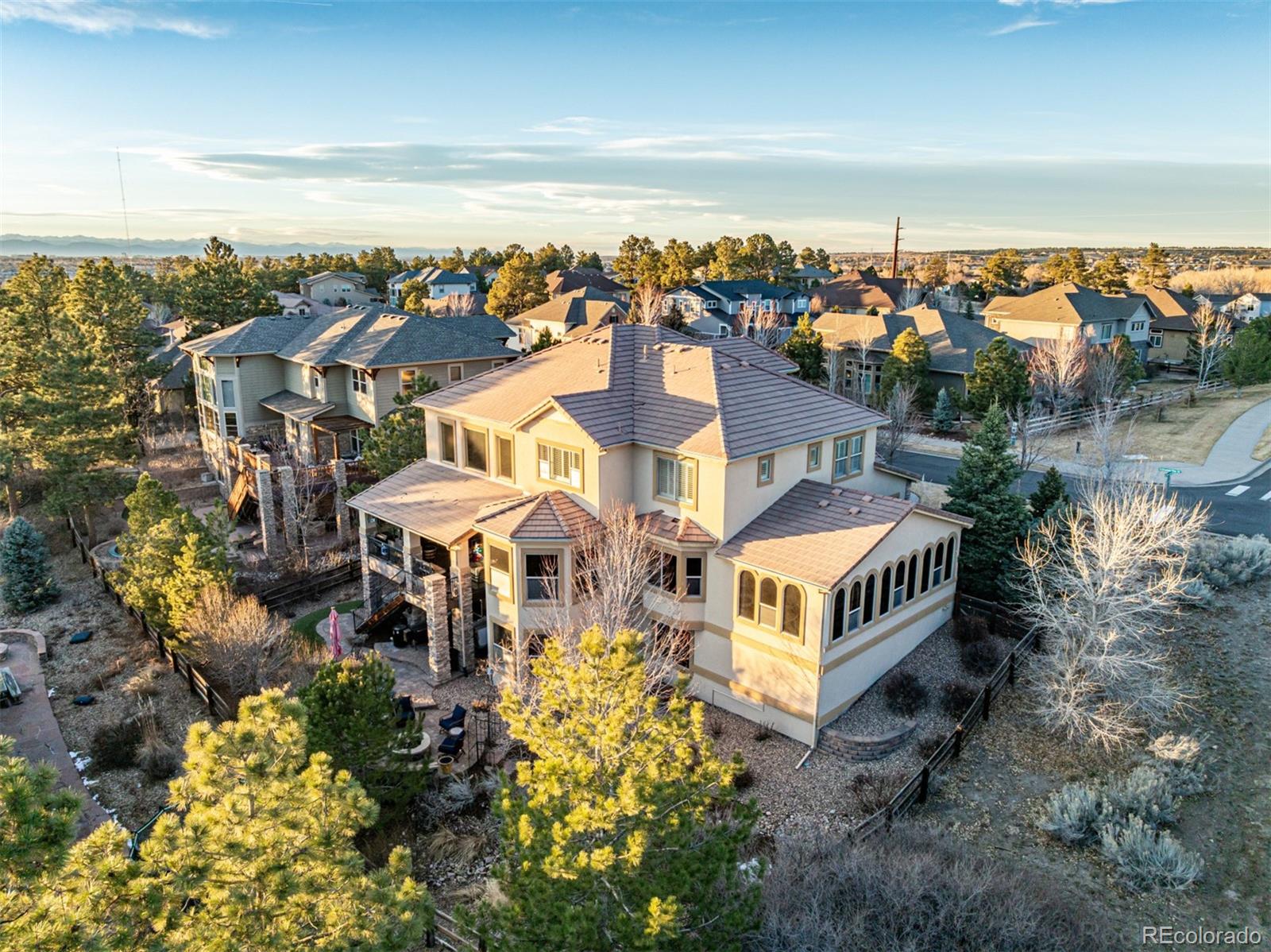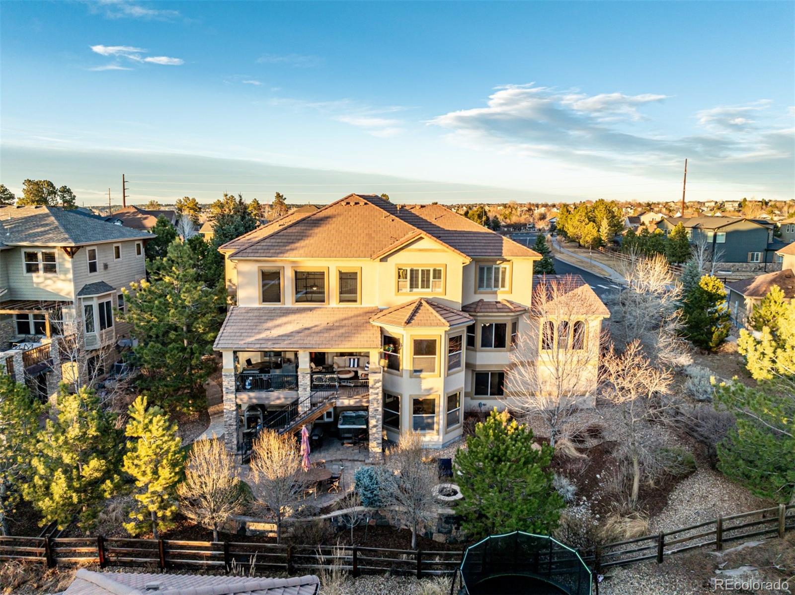 Toll Brothers Model home for the highly sought after Pine Bluffs Community. This home is absolutely amazing! Striking stone-accented faade & exceptional design throughout! An inviting entry welcomes you into a thoughtfully designed split floor plan featuring a carpeted living room, surround sound speakers in select rooms, plantation shutters on the right windows, a private den with French doors, & formal dining room w/tray ceiling & Roman pillars. Gourmet kitchen enjoys a large center breakfast bar island with custom granite countertops, a walk-in pantry, gorgeous cabinetry, stone backsplash, SS appliances, & a bright breakfast nook. A versatile bonus room w/wet bar, powder room, & family room centered around a charming fireplace completes the main level! The main retreat has a vaulted ceiling, its own wet bar, & a spa-like ensuite w/separate tub/shower, dual vanities, & walk-in closet. Every bedroom offers the comfort & privacy of its own bathroom! Downstairs, the walk-out basement expands the living space with incredible amenities, including a two-way fireplace, kitchenette, media room, sunny breakfast/poker room, bar and thermostatically controlled wine cellar. Plus, a well-equipped laundry room w/sink & cabinetry. Outside, discover a covered area off the main floor with million dollar views, a covered patio below, a cozy fire pit area, beautiful paver accents, & mature trees galore. Do not miss the 3-car garage for your vehicles! The pride of ownership and the Crown Jewel of Pine Bluffs. This highly desired neighborhood features dense, heavily treed topography literally minutes from all that Parker, Colorado has to offer. See it, love it, live it!