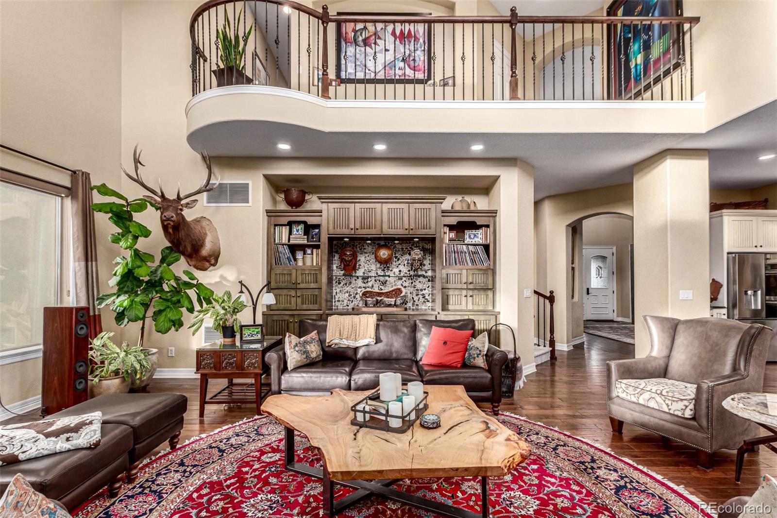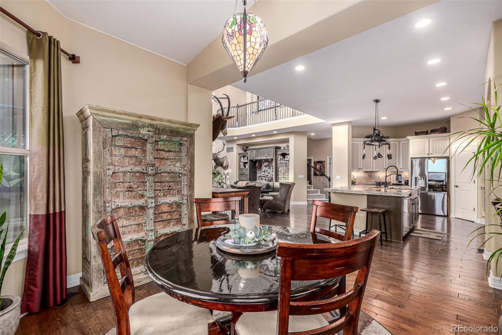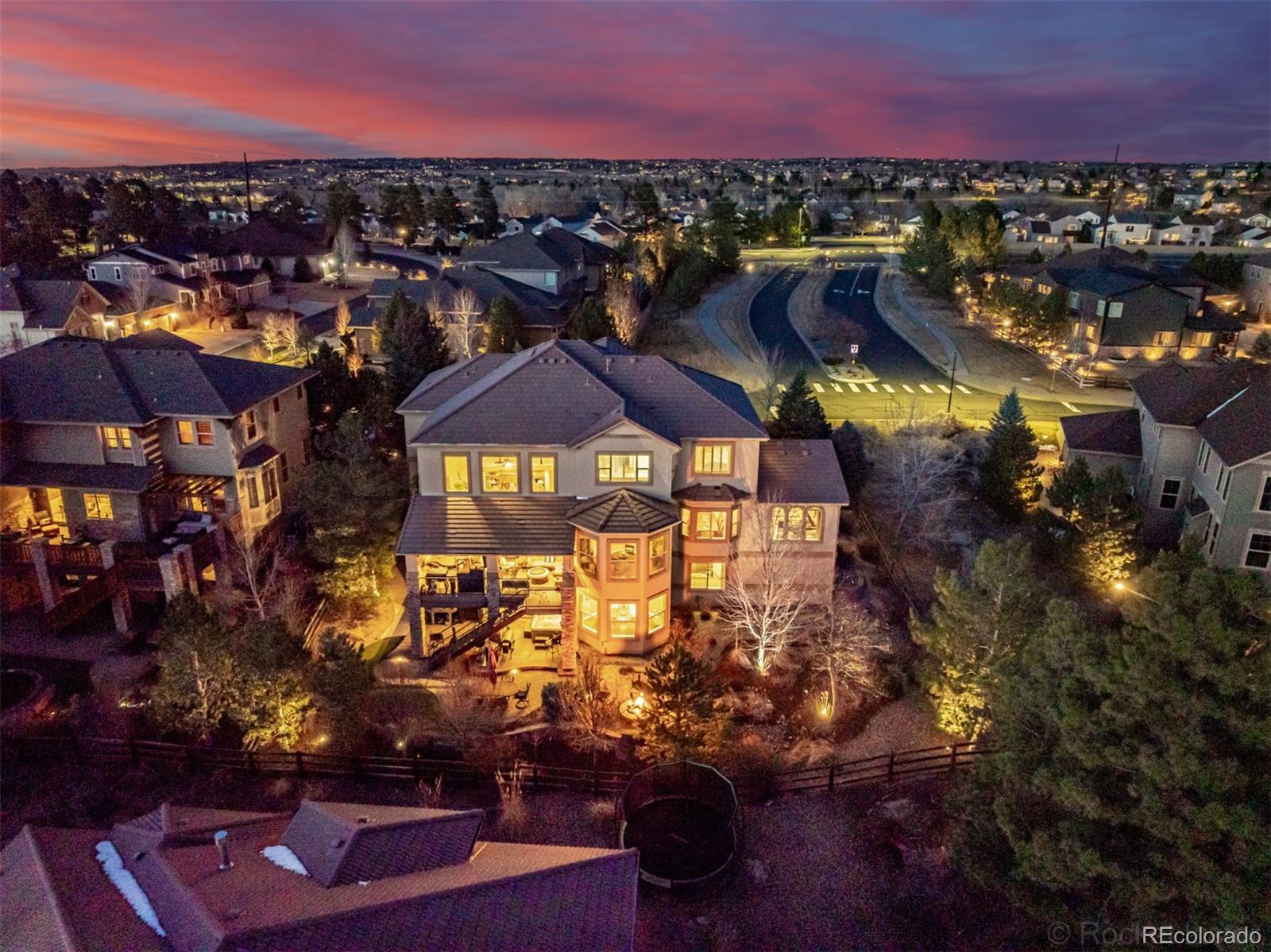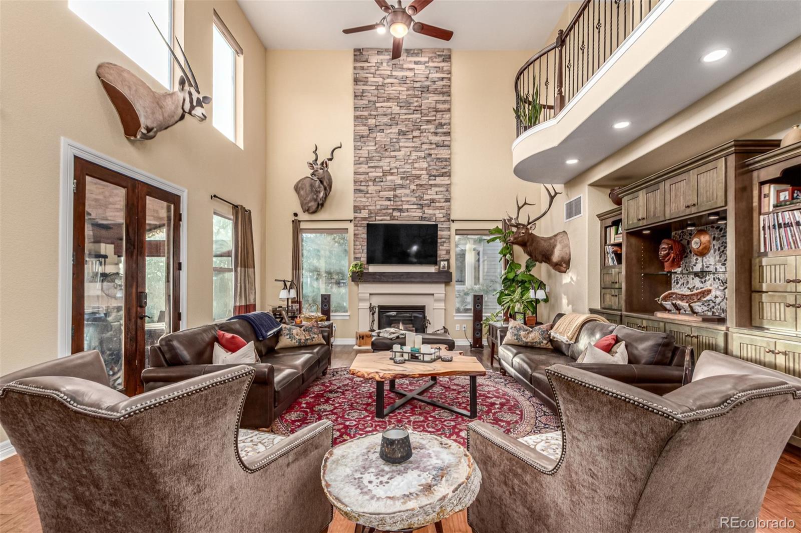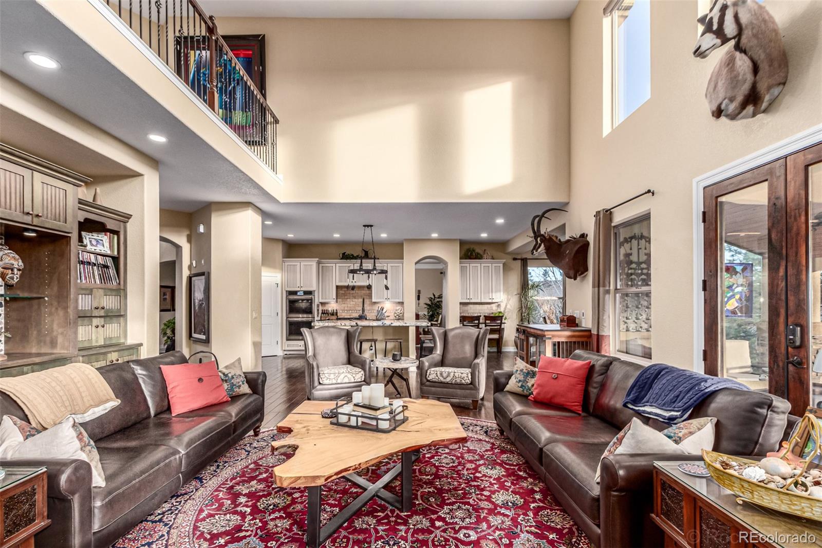 Toll Brothers Model home for the highly sought after Pine Bluffs Community. This home is absolutely amazing! Striking stone-accented faade & exceptional design throughout! An inviting entry welcomes you into a thoughtfully designed split floor plan featuring a carpeted living room, surround sound speakers in select rooms, plantation shutters on the right windows, a private den with French doors, & formal dining room w/tray ceiling & Roman pillars. Gourmet kitchen enjoys a large center breakfast bar island with custom granite countertops, a walk-in pantry, gorgeous cabinetry, stone backsplash, SS appliances, & a bright breakfast nook. A versatile bonus room w/wet bar, powder room, & family room centered around a charming fireplace completes the main level! The main retreat has a vaulted ceiling, its own wet bar, & a spa-like ensuite w/separate tub/shower, dual vanities, & walk-in closet. Every bedroom offers the comfort & privacy of its own bathroom! Downstairs, the walk-out basement expands the living space with incredible amenities, including a two-way fireplace, kitchenette, media room, sunny breakfast/poker room, bar and thermostatically controlled wine cellar. Plus, a well-equipped laundry room w/sink & cabinetry. Outside, discover a covered area off the main floor with million dollar views, a covered patio below, a cozy fire pit area, beautiful paver accents, & mature trees galore. Do not miss the 3-car garage for your vehicles! The pride of ownership and the Crown Jewel of Pine Bluffs. This highly desired neighborhood features dense, heavily treed topography literally minutes from all that Parker, Colorado has to offer. See it, love it, live it!