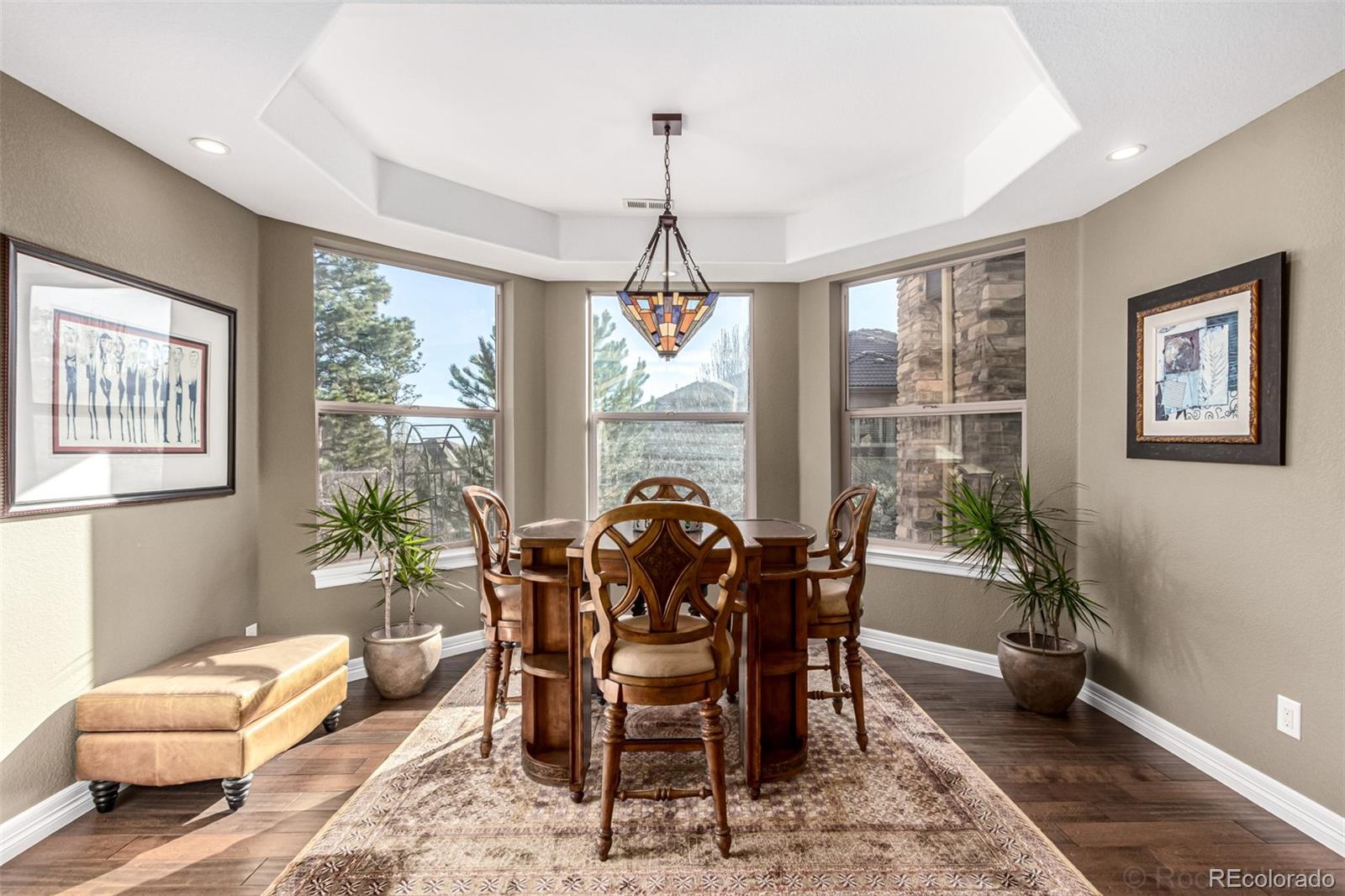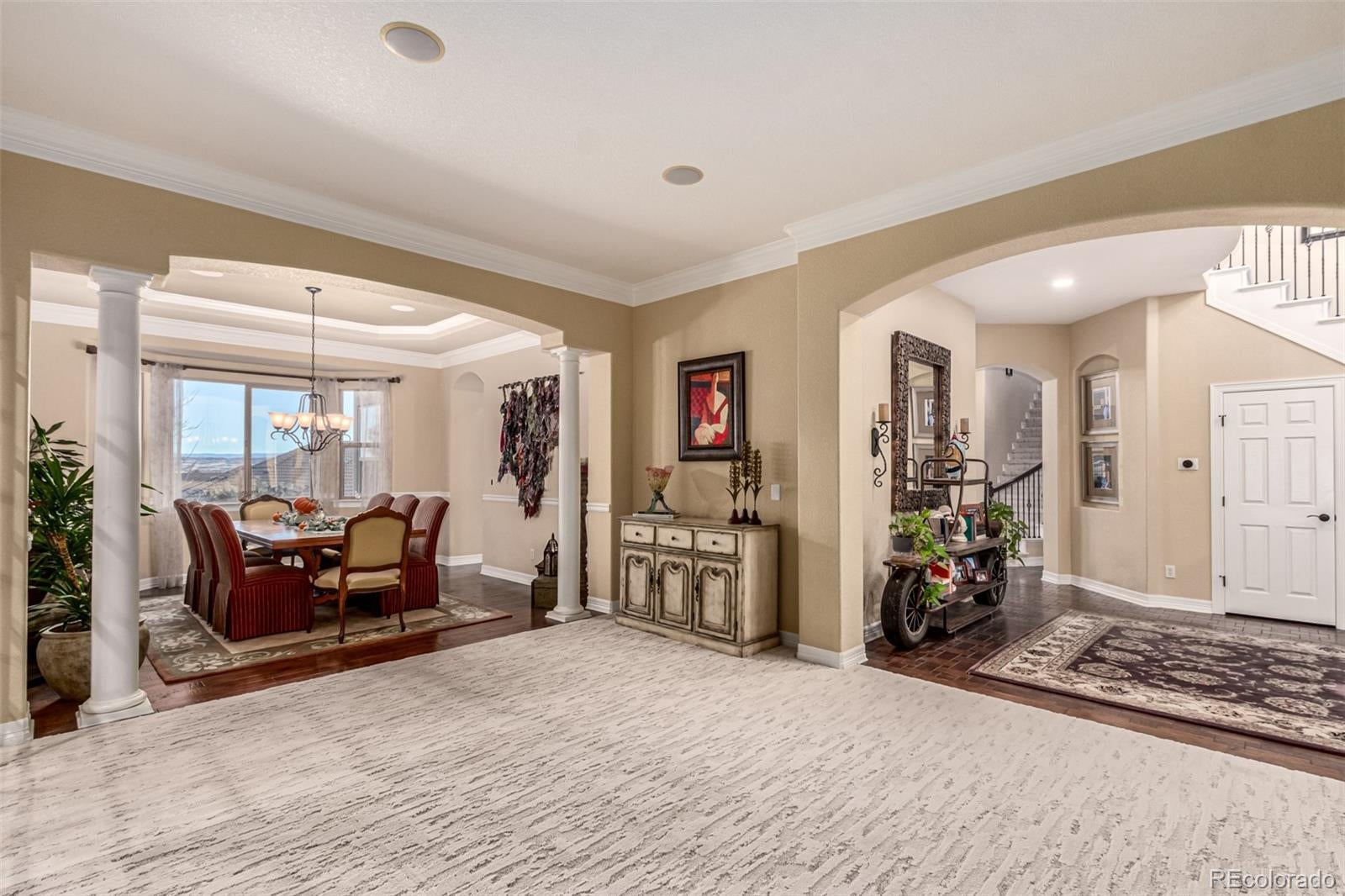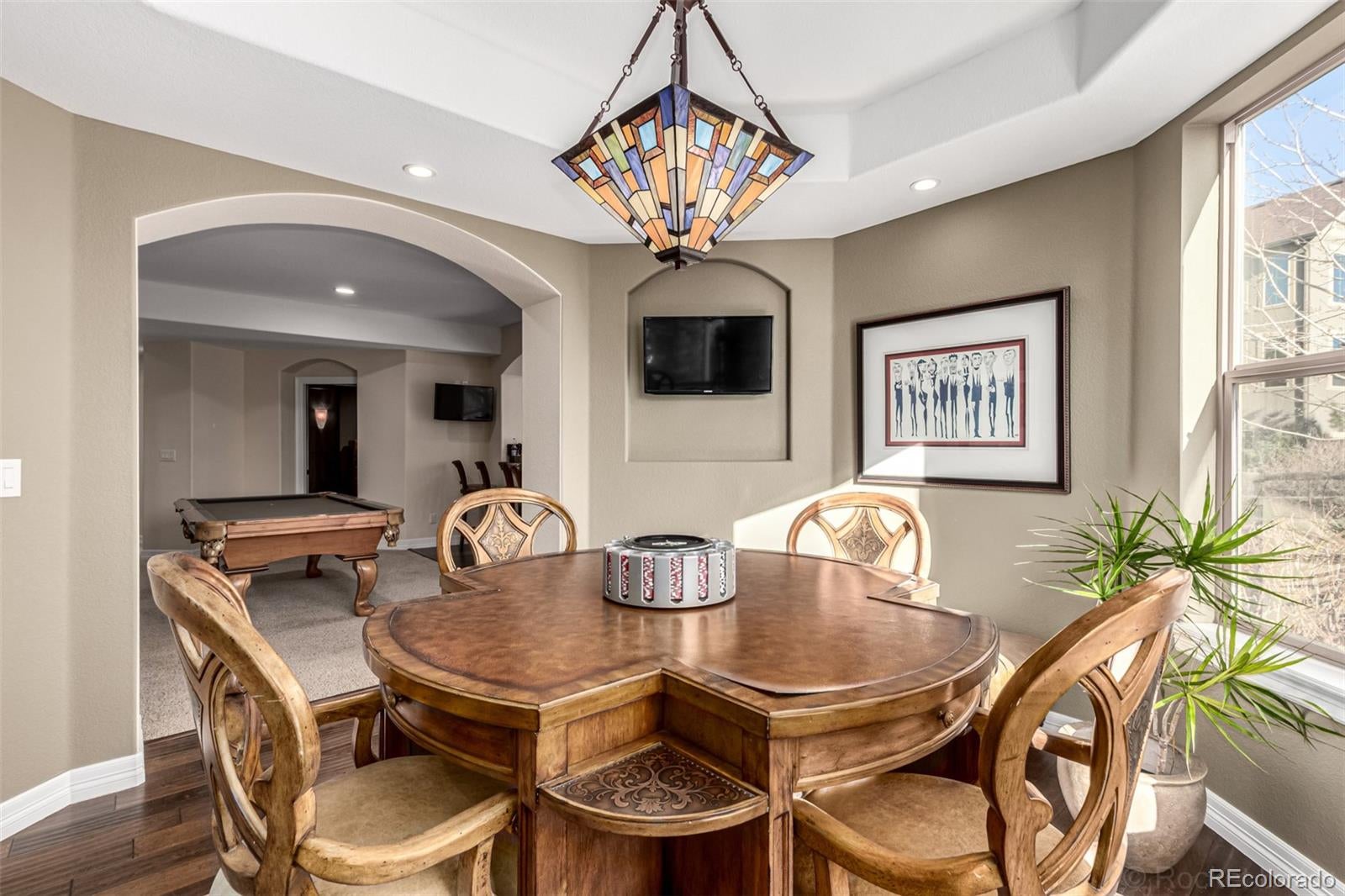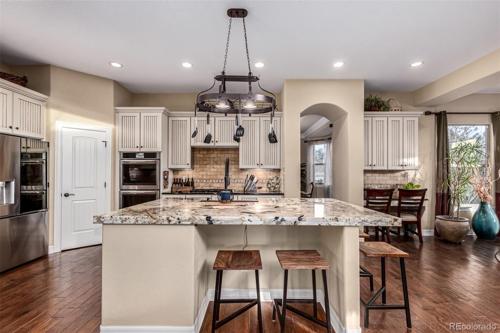 Toll Brothers Model home for the highly sought after Pine Bluffs Community. This home is absolutely amazing! Striking stone-accented faade & exceptional design throughout! An inviting entry welcomes you into a thoughtfully designed split floor plan featuring a carpeted living room, surround sound speakers in select rooms, plantation shutters on the right windows, a private den with French doors, & formal dining room w/tray ceiling & Roman pillars. Gourmet kitchen enjoys a large center breakfast bar island with custom granite countertops, a walk-in pantry, gorgeous cabinetry, stone backsplash, SS appliances, & a bright breakfast nook. A versatile bonus room w/wet bar, powder room, & family room centered around a charming fireplace completes the main level! The main retreat has a vaulted ceiling, its own wet bar, & a spa-like ensuite w/separate tub/shower, dual vanities, & walk-in closet. Every bedroom offers the comfort & privacy of its own bathroom! Downstairs, the walk-out basement expands the living space with incredible amenities, including a two-way fireplace, kitchenette, media room, sunny breakfast/poker room, bar and thermostatically controlled wine cellar. Plus, a well-equipped laundry room w/sink & cabinetry. Outside, discover a covered area off the main floor with million dollar views, a covered patio below, a cozy fire pit area, beautiful paver accents, & mature trees galore. Do not miss the 3-car garage for your vehicles! The pride of ownership and the Crown Jewel of Pine Bluffs. This highly desired neighborhood features dense, heavily treed topography literally minutes from all that Parker, Colorado has to offer. See it, love it, live it!