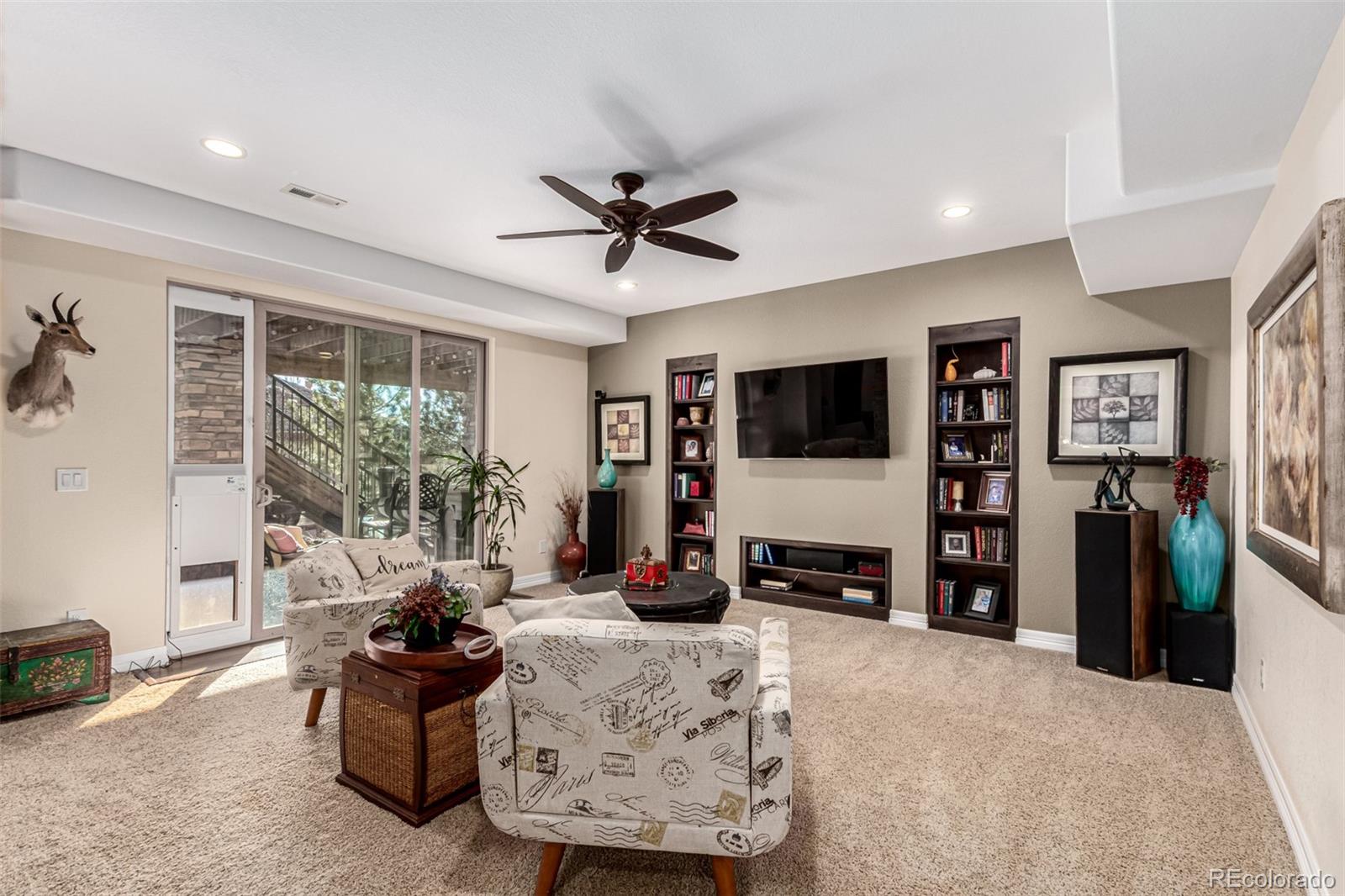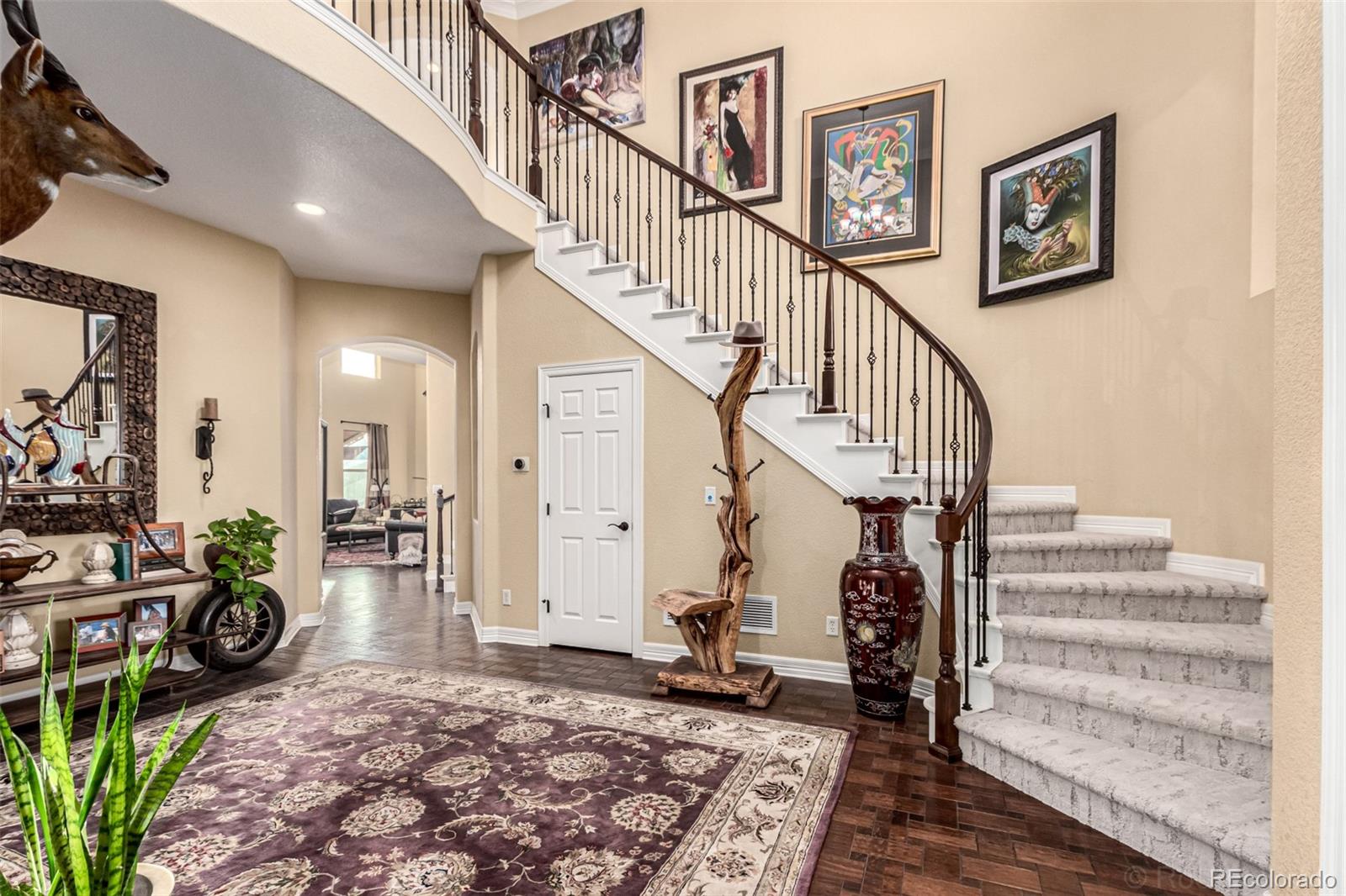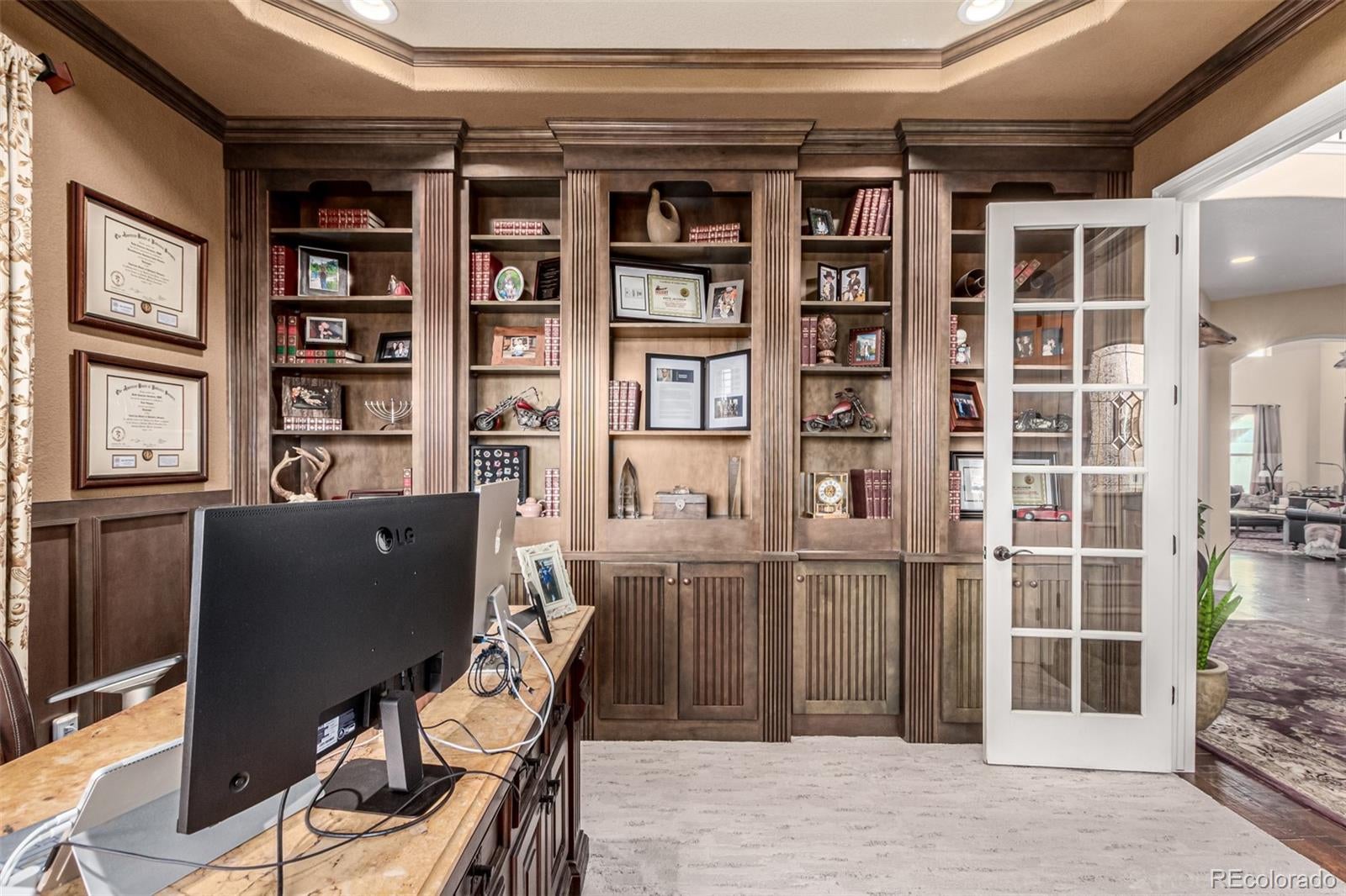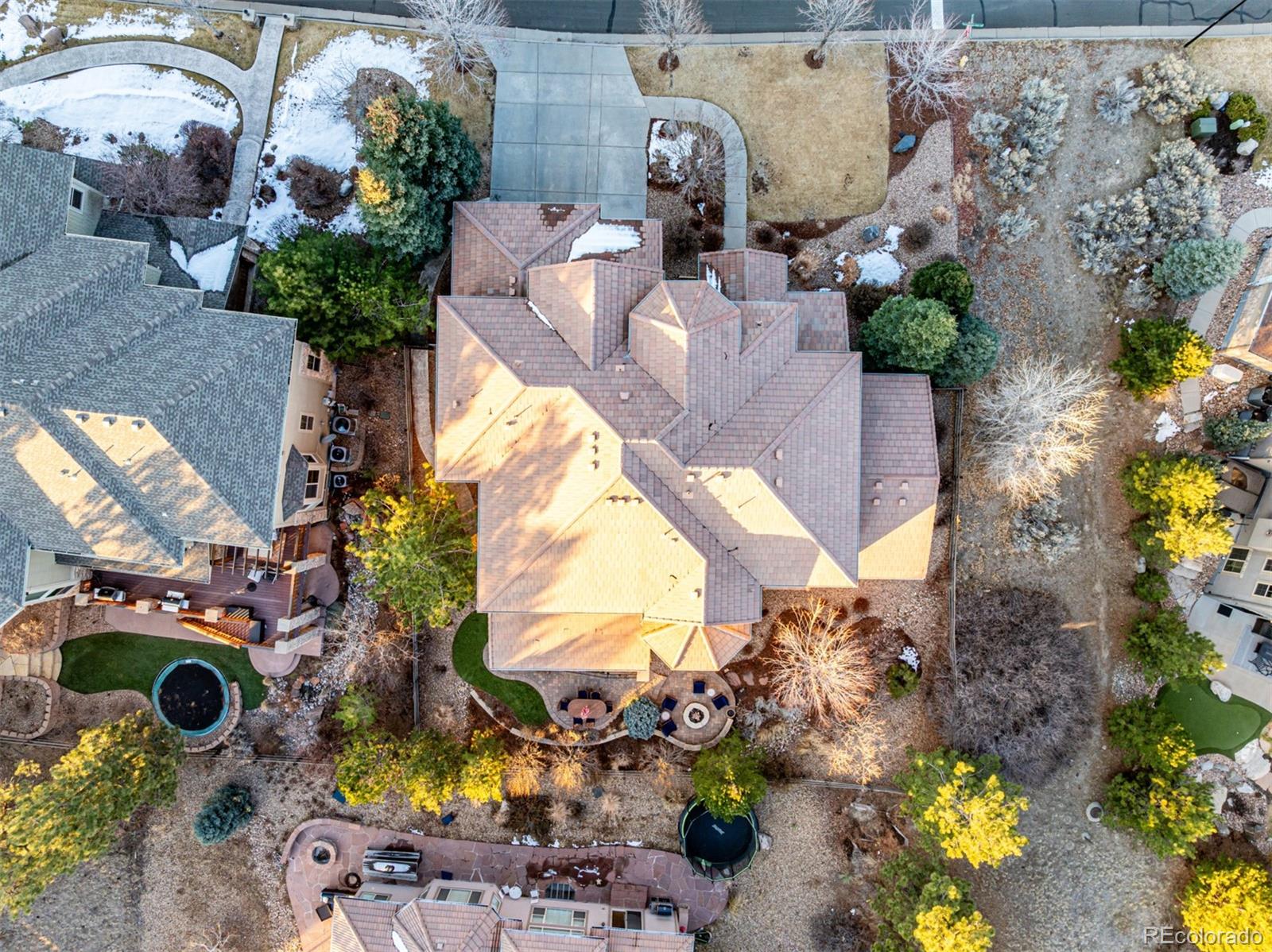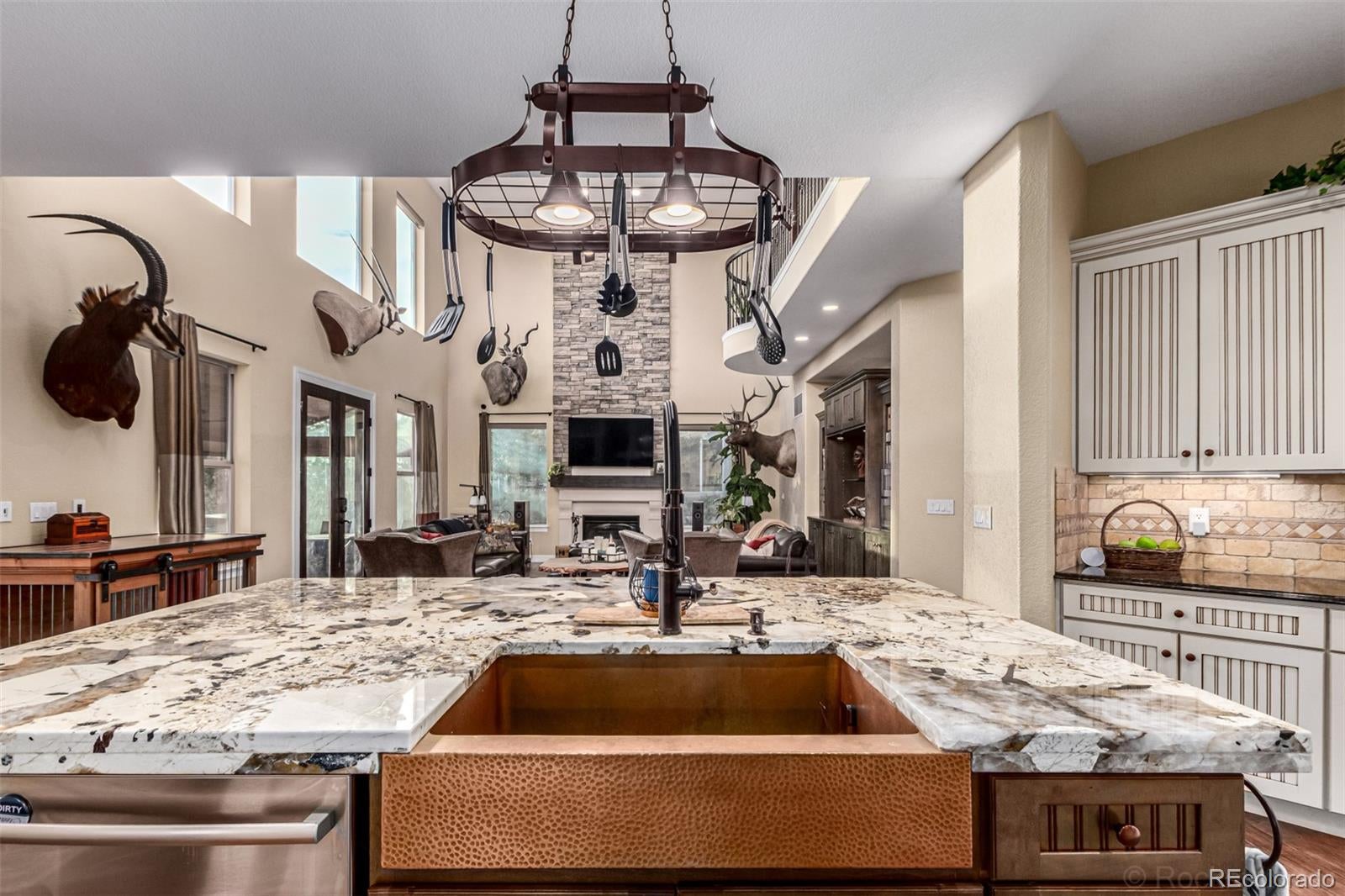 Toll Brothers Model home for the highly sought after Pine Bluffs Community. This home is absolutely amazing! Striking stone-accented faade & exceptional design throughout! An inviting entry welcomes you into a thoughtfully designed split floor plan featuring a carpeted living room, surround sound speakers in select rooms, plantation shutters on the right windows, a private den with French doors, & formal dining room w/tray ceiling & Roman pillars. Gourmet kitchen enjoys a large center breakfast bar island with custom granite countertops, a walk-in pantry, gorgeous cabinetry, stone backsplash, SS appliances, & a bright breakfast nook. A versatile bonus room w/wet bar, powder room, & family room centered around a charming fireplace completes the main level! The main retreat has a vaulted ceiling, its own wet bar, & a spa-like ensuite w/separate tub/shower, dual vanities, & walk-in closet. Every bedroom offers the comfort & privacy of its own bathroom! Downstairs, the walk-out basement expands the living space with incredible amenities, including a two-way fireplace, kitchenette, media room, sunny breakfast/poker room, bar and thermostatically controlled wine cellar. Plus, a well-equipped laundry room w/sink & cabinetry. Outside, discover a covered area off the main floor with million dollar views, a covered patio below, a cozy fire pit area, beautiful paver accents, & mature trees galore. Do not miss the 3-car garage for your vehicles! The pride of ownership and the Crown Jewel of Pine Bluffs. This highly desired neighborhood features dense, heavily treed topography literally minutes from all that Parker, Colorado has to offer. See it, love it, live it!