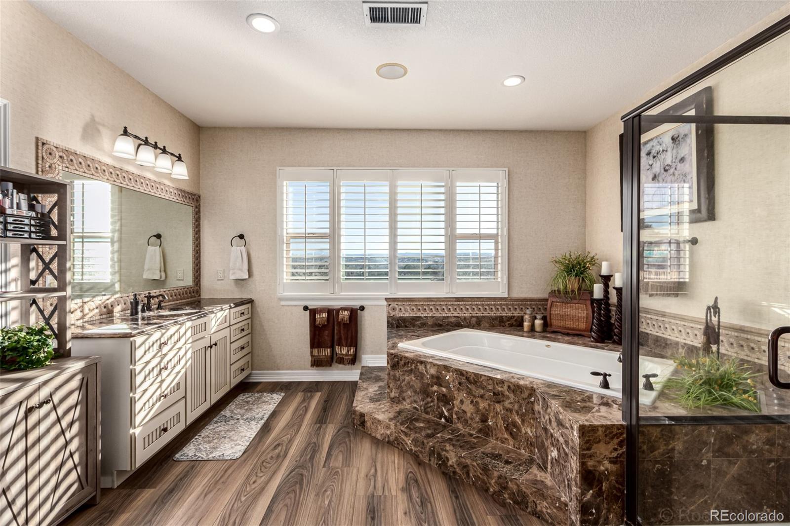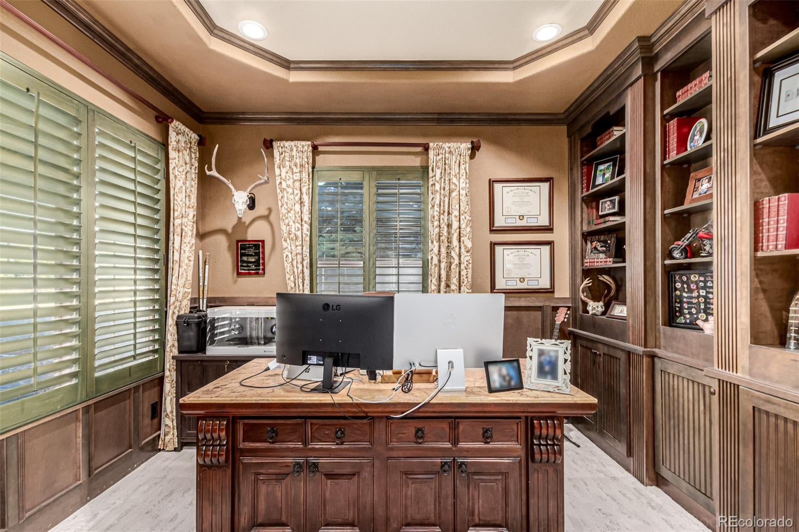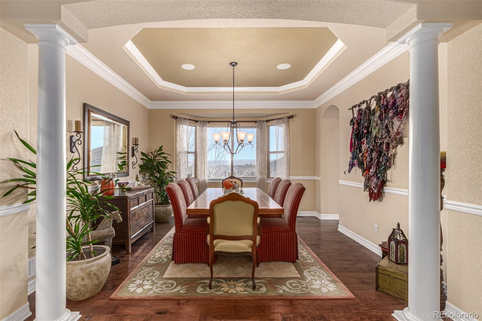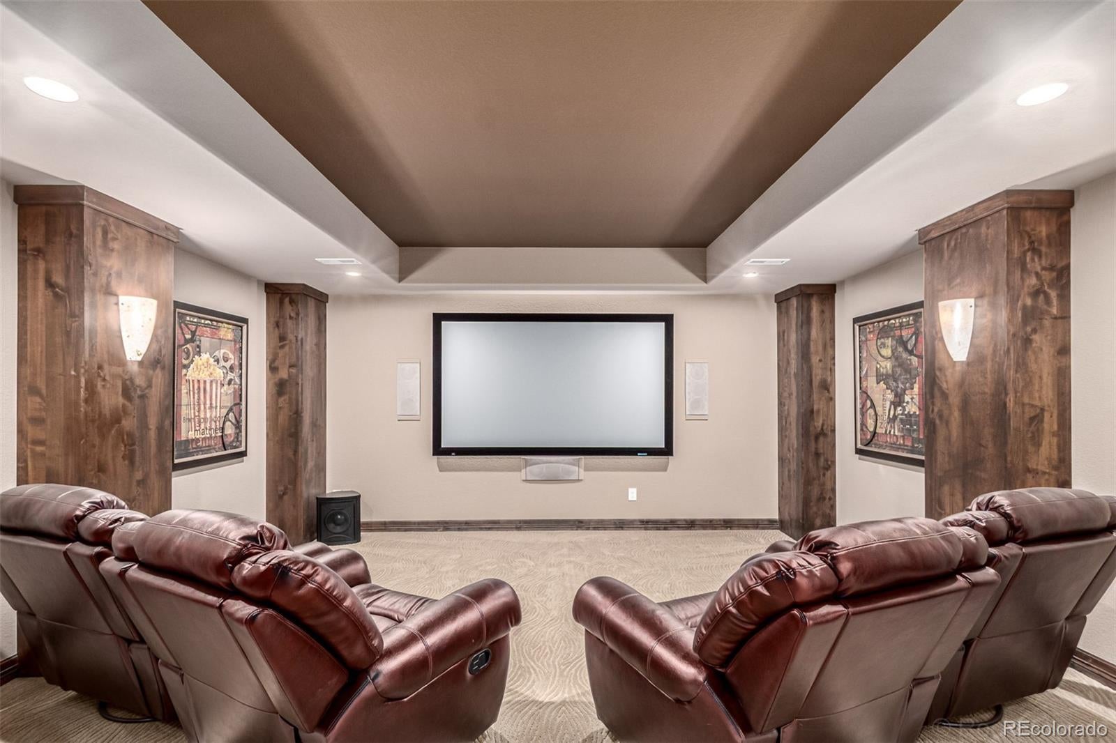 Toll Brothers Model home for the highly sought after Pine Bluffs Community. This home is absolutely amazing! Striking stone-accented faade & exceptional design throughout! An inviting entry welcomes you into a thoughtfully designed split floor plan featuring a carpeted living room, surround sound speakers in select rooms, plantation shutters on the right windows, a private den with French doors, & formal dining room w/tray ceiling & Roman pillars. Gourmet kitchen enjoys a large center breakfast bar island with custom granite countertops, a walk-in pantry, gorgeous cabinetry, stone backsplash, SS appliances, & a bright breakfast nook. A versatile bonus room w/wet bar, powder room, & family room centered around a charming fireplace completes the main level! The main retreat has a vaulted ceiling, its own wet bar, & a spa-like ensuite w/separate tub/shower, dual vanities, & walk-in closet. Every bedroom offers the comfort & privacy of its own bathroom! Downstairs, the walk-out basement expands the living space with incredible amenities, including a two-way fireplace, kitchenette, media room, sunny breakfast/poker room, bar and thermostatically controlled wine cellar. Plus, a well-equipped laundry room w/sink & cabinetry. Outside, discover a covered area off the main floor with million dollar views, a covered patio below, a cozy fire pit area, beautiful paver accents, & mature trees galore. Do not miss the 3-car garage for your vehicles! The pride of ownership and the Crown Jewel of Pine Bluffs. This highly desired neighborhood features dense, heavily treed topography literally minutes from all that Parker, Colorado has to offer. See it, love it, live it!