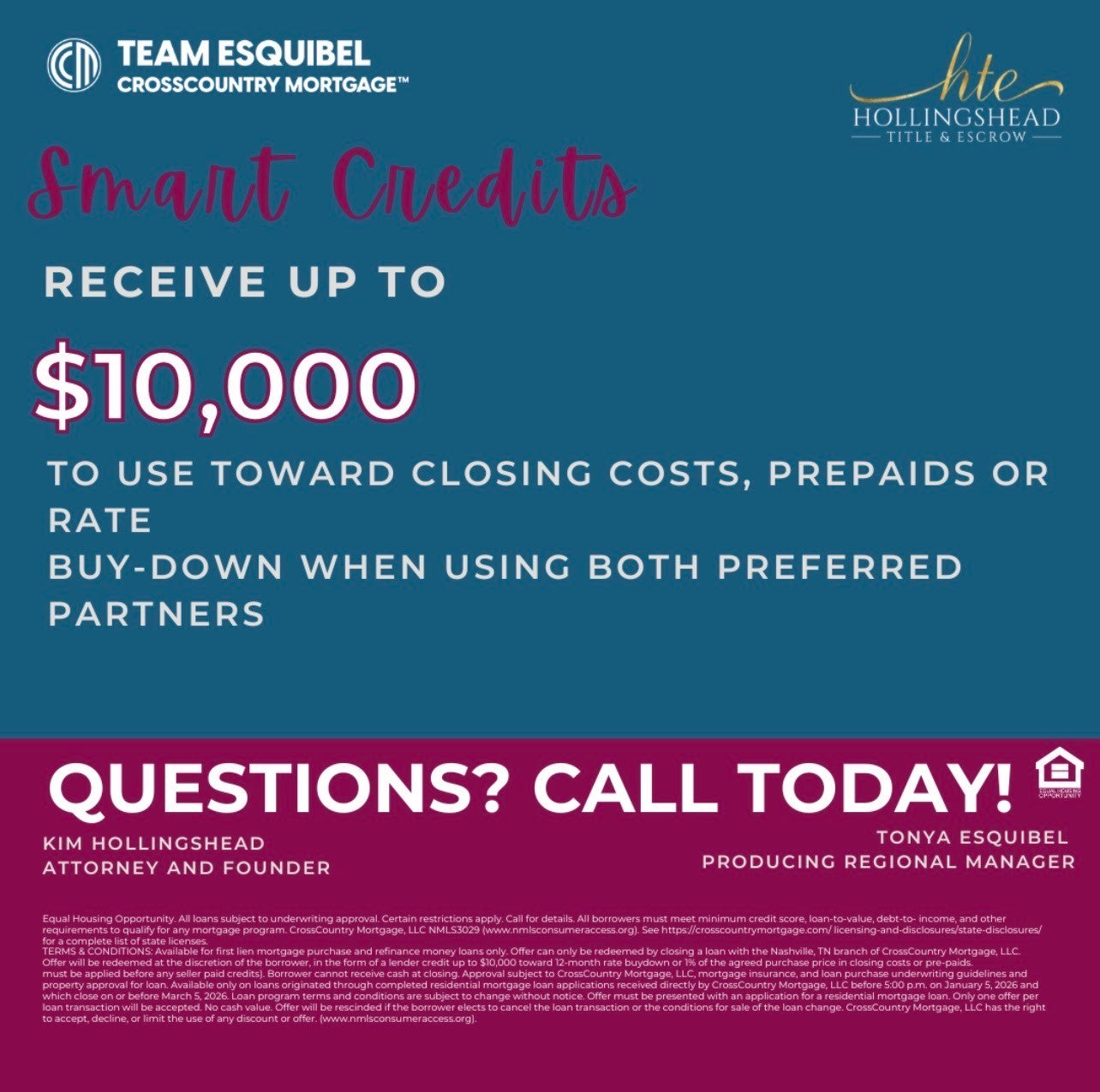 ***Qualified buyers may receive up to 10,000 in lender credit with the Tonya Esquibel Team at CrossCountry Mortgage and 250 off the closing fee with Hollingshead Title & Escrow when they use both Seller Preferred vendor partners. Credit may be used toward closing costs and/or rate buy-down. Amount based on loan amount, credit profile, loan program, and occupancy. Terms apply.