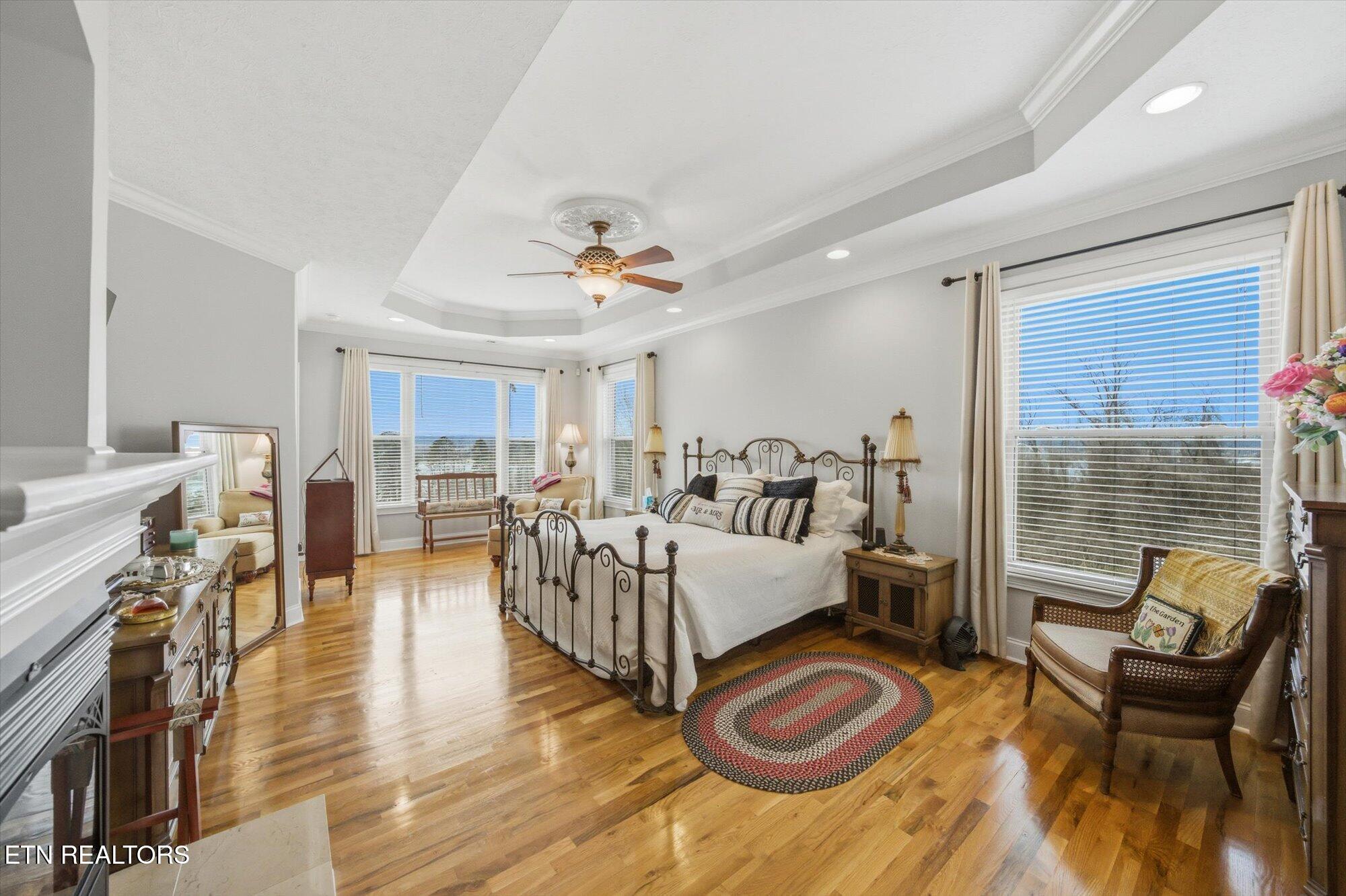 Enjoy the mountain & main channel lake views from almost every window of this all brick 6719 Sq.Ft. basement ranch home featuring 4 main level bedrooms- each with private tiled baths plus 2 basement bedrooms w/ large full bath plus 3 extra half baths through-out the home. Solid hardwood floors through most of the main level, 9 ft ceilings heavily trimmed with crown molding and exquisite millwork and 6 trey ceilings, granite tops in kitchen and all baths and wet areas! The new elevator makes transitioning between the main and basement rooms a breeze! Additional improvements galore including newer 3 pane windows providing greater insulation & sound proofing, 2-& 5-year young hvac systems, tile trimmed circular driveway, epoxy floored garage, leaf filter gutter system & remodeled front porch with luxury tiles! Basement waterproofing and sump pump plus many cosmetic updates through-out the home! Community dock w/slips avail for purchase when available. Enter into this grand home into the expansive view of the gleaming hardwood leading into the 19x13 formal living room and 18x10 flex room all adorned with 2 trey ceilings, recessed lighting and exquisite millwork! To the left of the foyer is the 17x16 hwd formal dining room richly appointed with wainscoting, crown, chair rail, dramatic trey ceiling and recessed lighting! Pass through the arched doorway into the gourmet hwd kitchen measuring 26x15 with tons of granite counterspace, large center island with prep sink, Butlers area, 42-inch crowned maple cabs, travertine tile backsplash, drop lighting, crown molding plus full stainless appliance package stays including gas range/oven, microwave, dishwasher and refrigerator! The kitchen has open views to the 15x13 hwd breakfast room with glorious views and adorned with yet another trey ceiling, recessed lights, wonderful millwork and crown. Kitchen also has open view to the 19x17 hwd family room center pieced by a majestic gas log fireplace surrounded by built-in bookcases, recessed lighting and dramatic trey ceiling. Enjoy the tranquility and wonderful views of the 20x10 all seasons room off the breakfast room with insulated floors, surrounded by sliding windows and has its own hvac plus entry to the second-floor grilling deck with natural gas shunt. The north wing of the home harbors the massive main level 25x15 master bedroom with hwds, trey ceiling, crown molding, and its own electric fireplace for those romantic nights! Adjacent to the Master is the huge spa quality 15x14 tiled master bath with his and hers separate vanities, make-up area, tiled walk-in shower and relaxing whirlpool tub. Separate his & her walk-in closets with custom shelving! The south wing of the home has 3 main level bedrooms measuring 16x12, 13x13, 15x11 all with gleaming flooring and private tile floored full baths! Home office measuring 21x12 in the front of the home with large closets, and its own half bath, elevator to the basement plus additional exit door to the front circular driveway (perfect for legal tax code home business office entry). This magnificent home as 2 laundry rooms! One on the main and one in the basement. Follow the stairway by the laundry room down to the almost 2600 sq.ft. of finished walk-out basement to the lower deck! You will be awe stuck by the expansiveness of the 35x26 rec room which has pillared division between the huge theater area and playroom area. This wonderful entertainment area includes a large kitchenette area for parties. Downstair you also have 2 large bedroom measuring 18x13 & 17x13 with nearby 12x8 tiled bath with newer walk-in shower! To complete the mother-in-law area, you also have another laundry room plus large craft room, storage room and separate exercise room with elevator and the weight equipment stays! Heated and cooled 14x14 workshop off the epoxy floored garage.