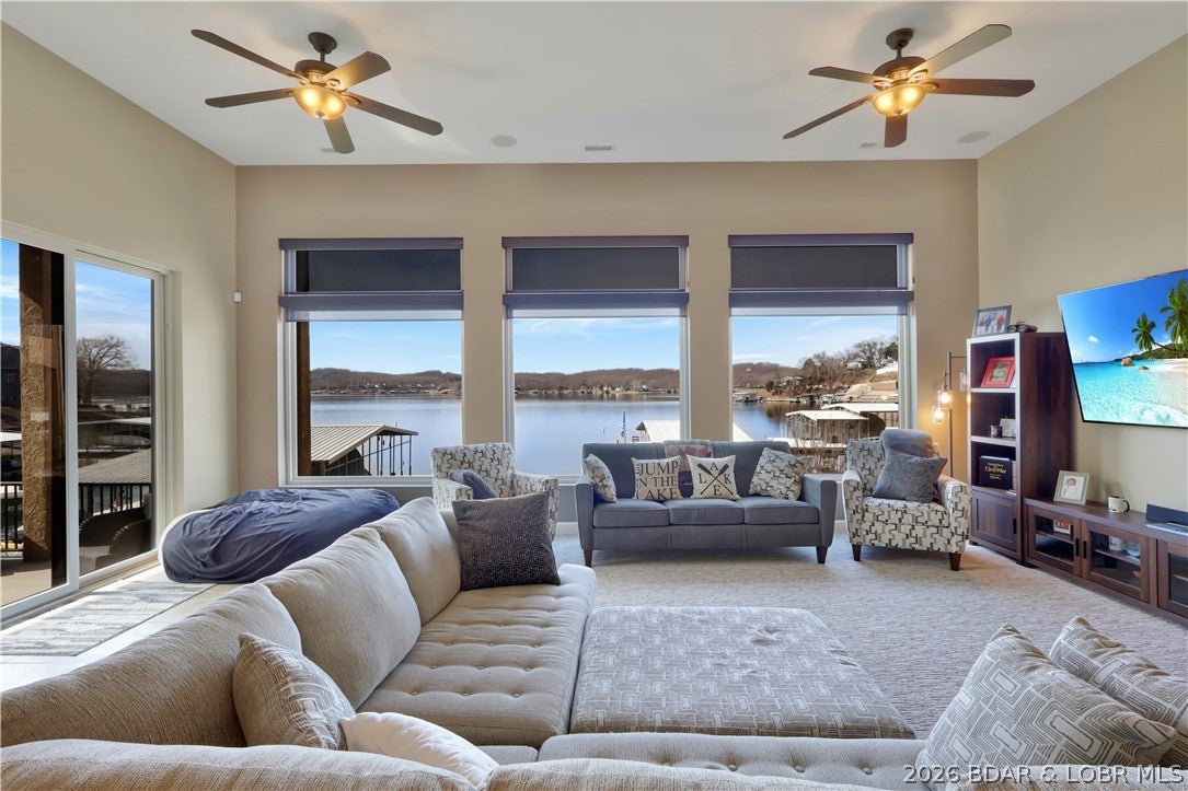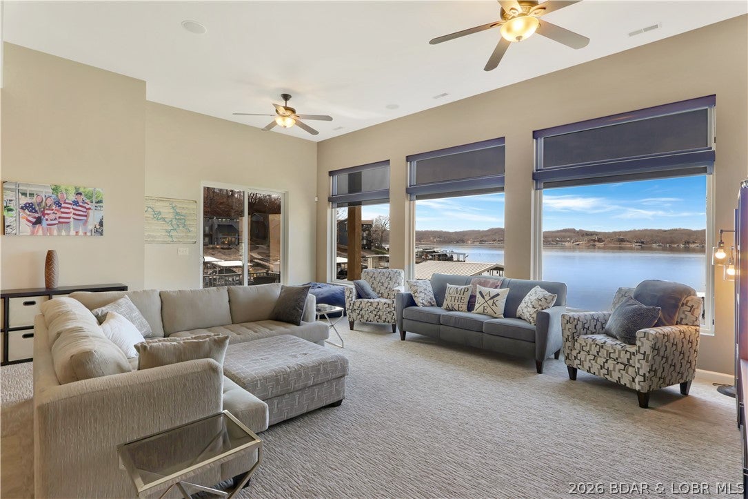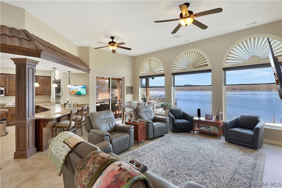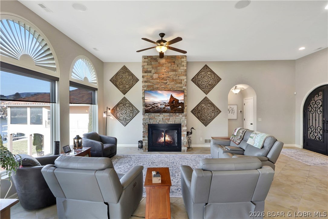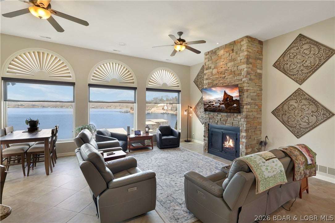 Welcome to 1323 Castle Ct at the 17 Mile Marker here at Lake of the Ozarks This waterfront retreat offers 100 feet of shoreline, deep water, a coveted cove setting & main channel views. Fully renovated from top to bottom, this home is designed for sunsets, lake days & relaxation. A stunning floor-to-ceiling fireplace, open-concept kitchen & dining area w/inviting bar area that flow seamlessly toward the water. A spiral staircase leads to loft overlooking the main living area, perfect for morning coffee, lake views, or golden-hour light. Bedroom levels offer private, serene retreats, including a stunning primary suite with a spa-inspired lakeside bathroom. Addtnl guest suites & spacious bunk-style room for hosting. The lower entertainment level opens directly outdoors, steps from your private dock & effortless waterfront living. A rare opportunity awaits: seller is offering a 75,000 furnishings allowance & chance to collaborate with an interior designer to complete the homes furnishings. A curated look book is available, with selections fully customizable. More than a home this is a lifestyle of sunsets, boating & entertaining, Schedule your showing today.