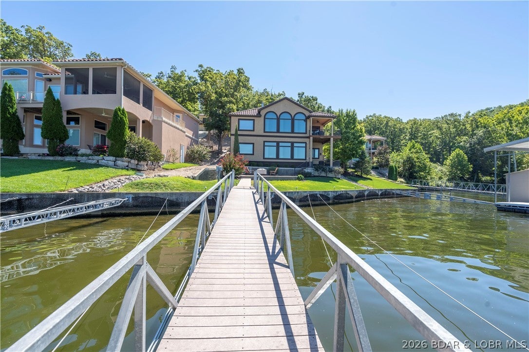 This stunning 5 bedroom, 4.5 bath home is the epitome of luxury Lakefront living with its prime location, breathtaking views, & exquisite finishes located here at Lake of the Ozarks. This gated community located on the westside offers luxury, privacy, views,& a private park like drive into your new Lake home. As you enter the home, your greeted with a wall of windows open living, kitchen dining area that has been set up masterfully for entertaining. Master suite is located just off the main room with soaring ceilings & luxurious bath suite. Tag the fun meter as you enter the lower level where you will find another wall of windows to take in those Lake views. 4 bedrooms, one a private suite, two sharing a bath in the middle and the fourth located down a hall. On this level you will also find a large finished storage room perfect for outdoor toys, cushions, etc. All rooms have been tastefully decorated relaxation & rest. This home is turnkey with virtually no maintenance. Get ready to relax this Summer in this ultimate Lake of the Ozarks luxury pad. Call to schedule your private viewing today.